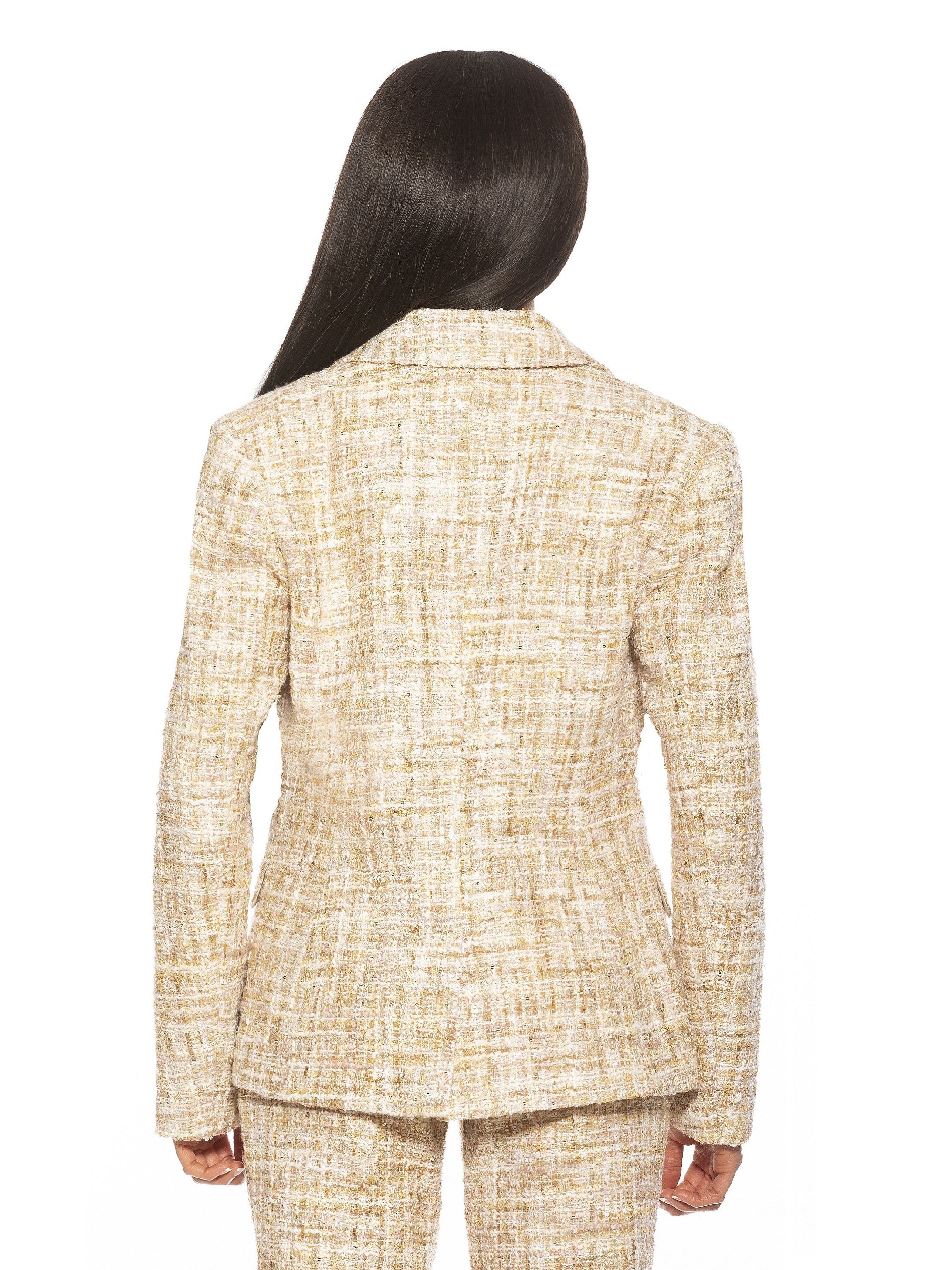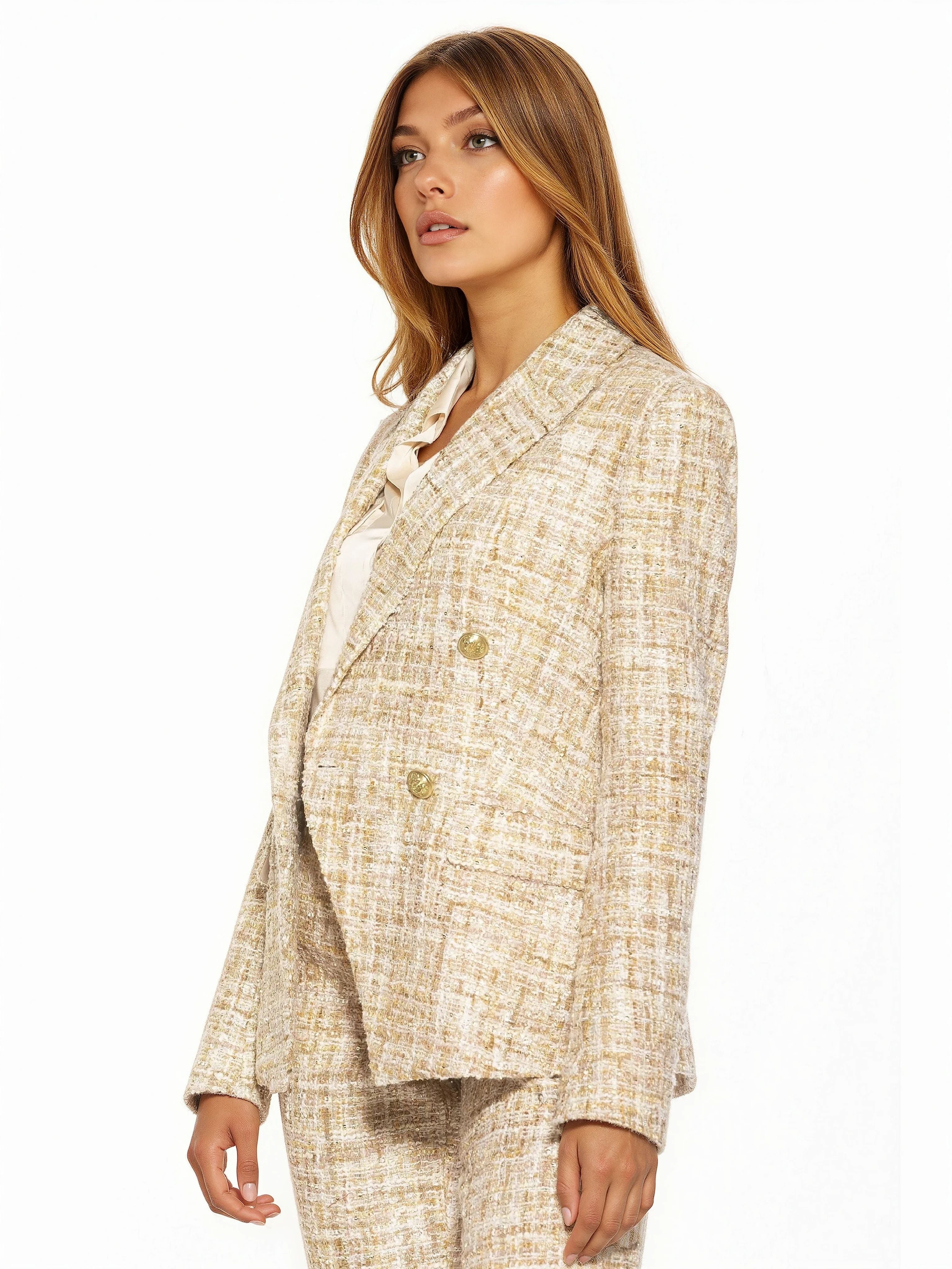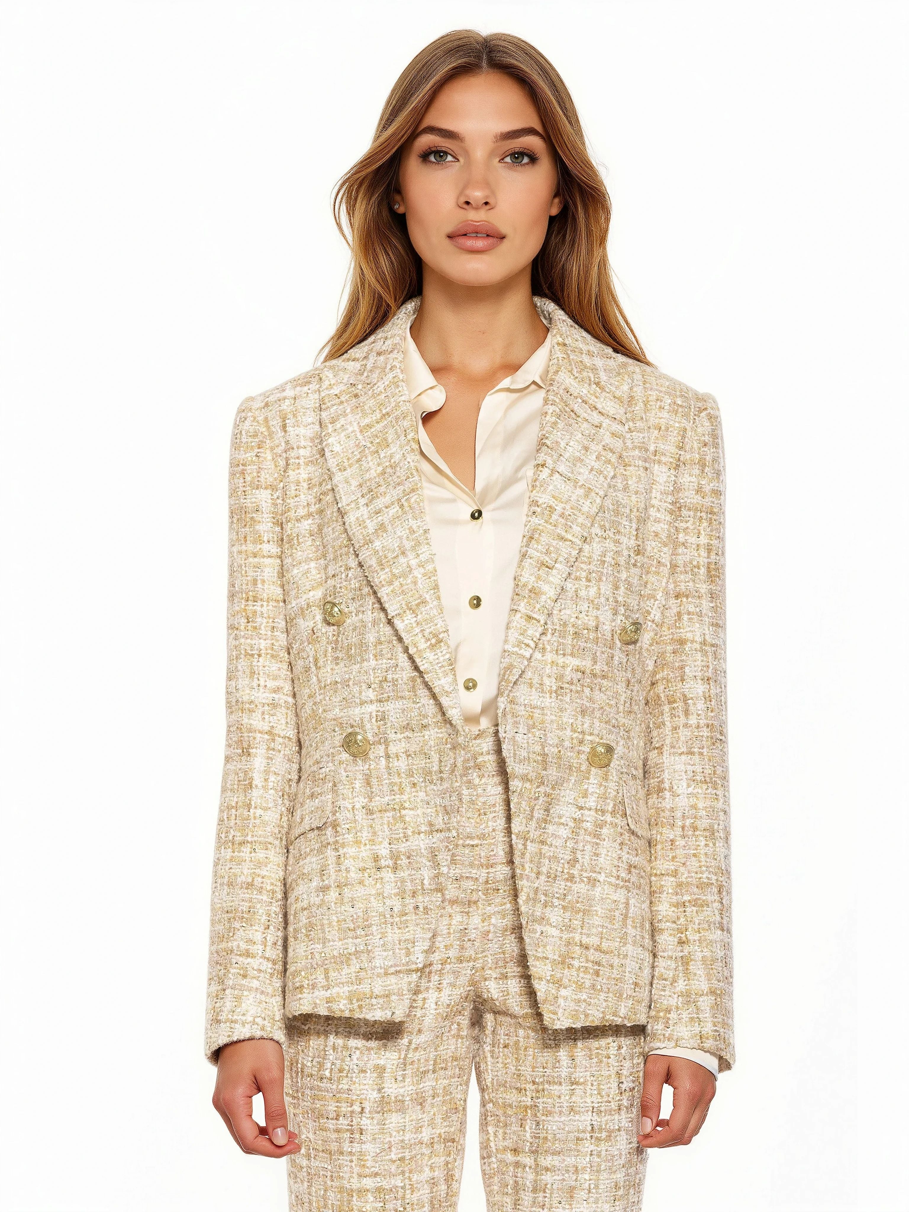 This Classic Blazer features a fitted cut with peaked lapels, long sleeves, and gold buttons. The luxurious tweed fabric elevates the look, while the double-breasted button closure provides a secure and flattering fit. A perfect piece for professional chic attire.