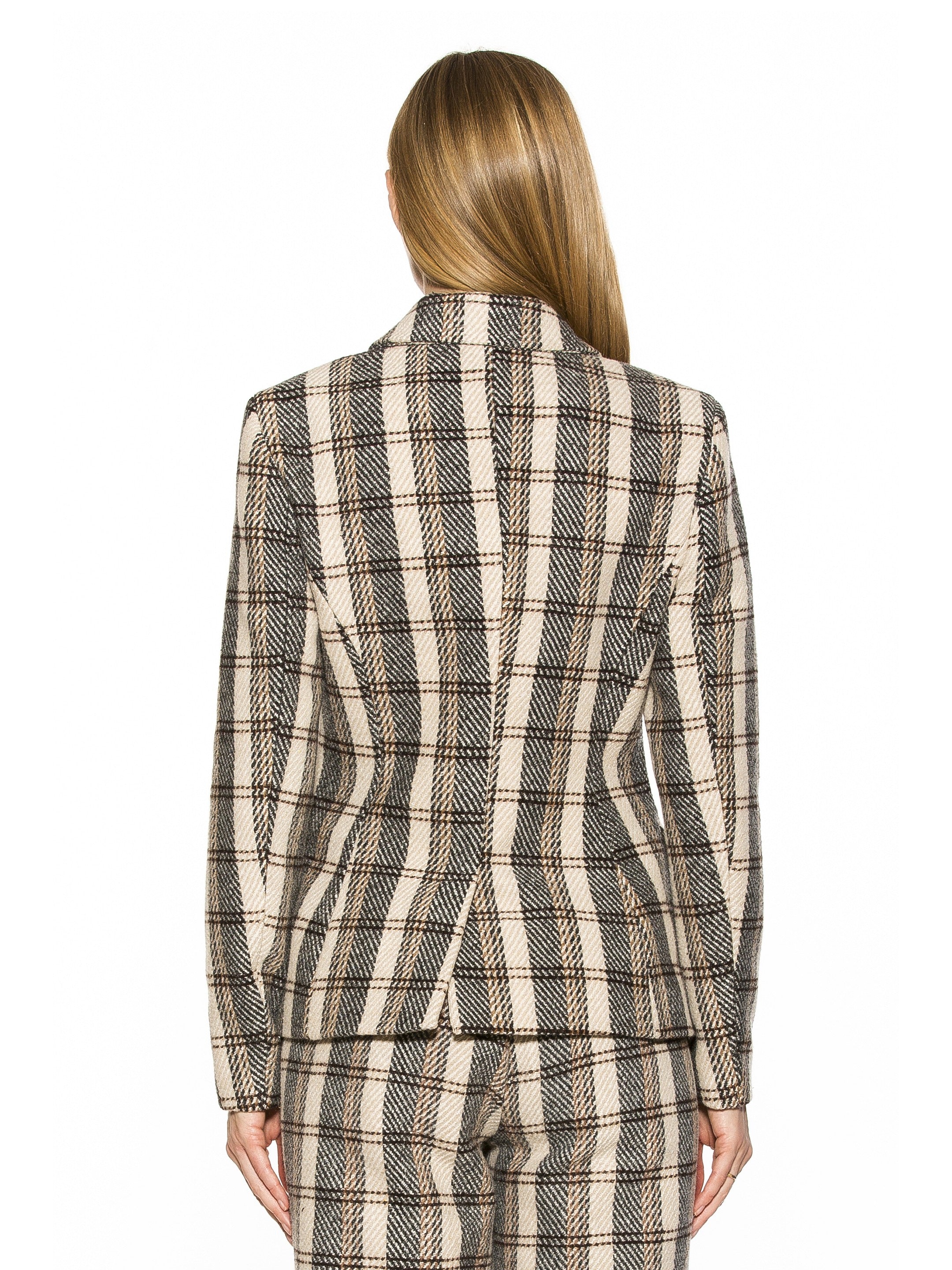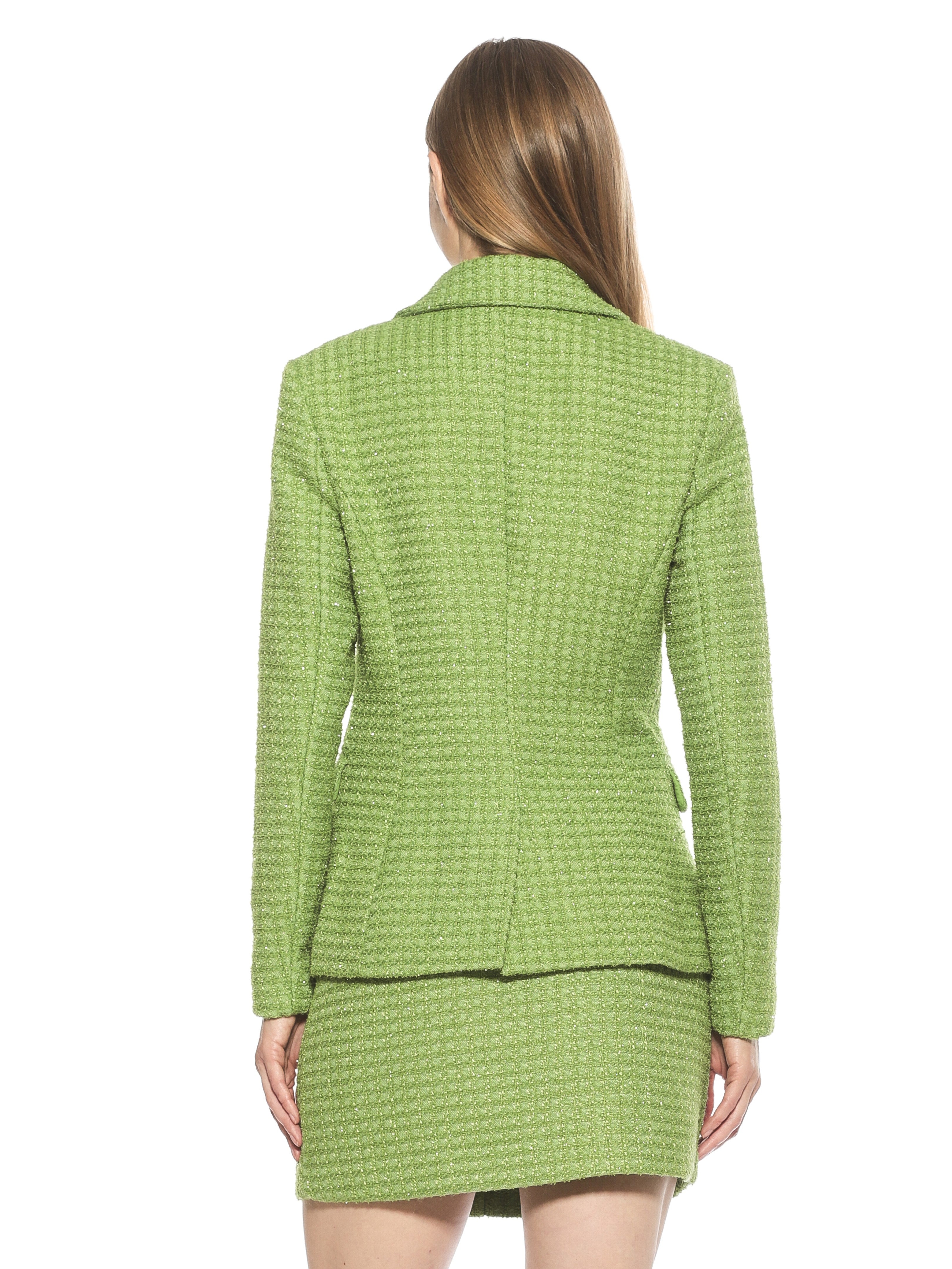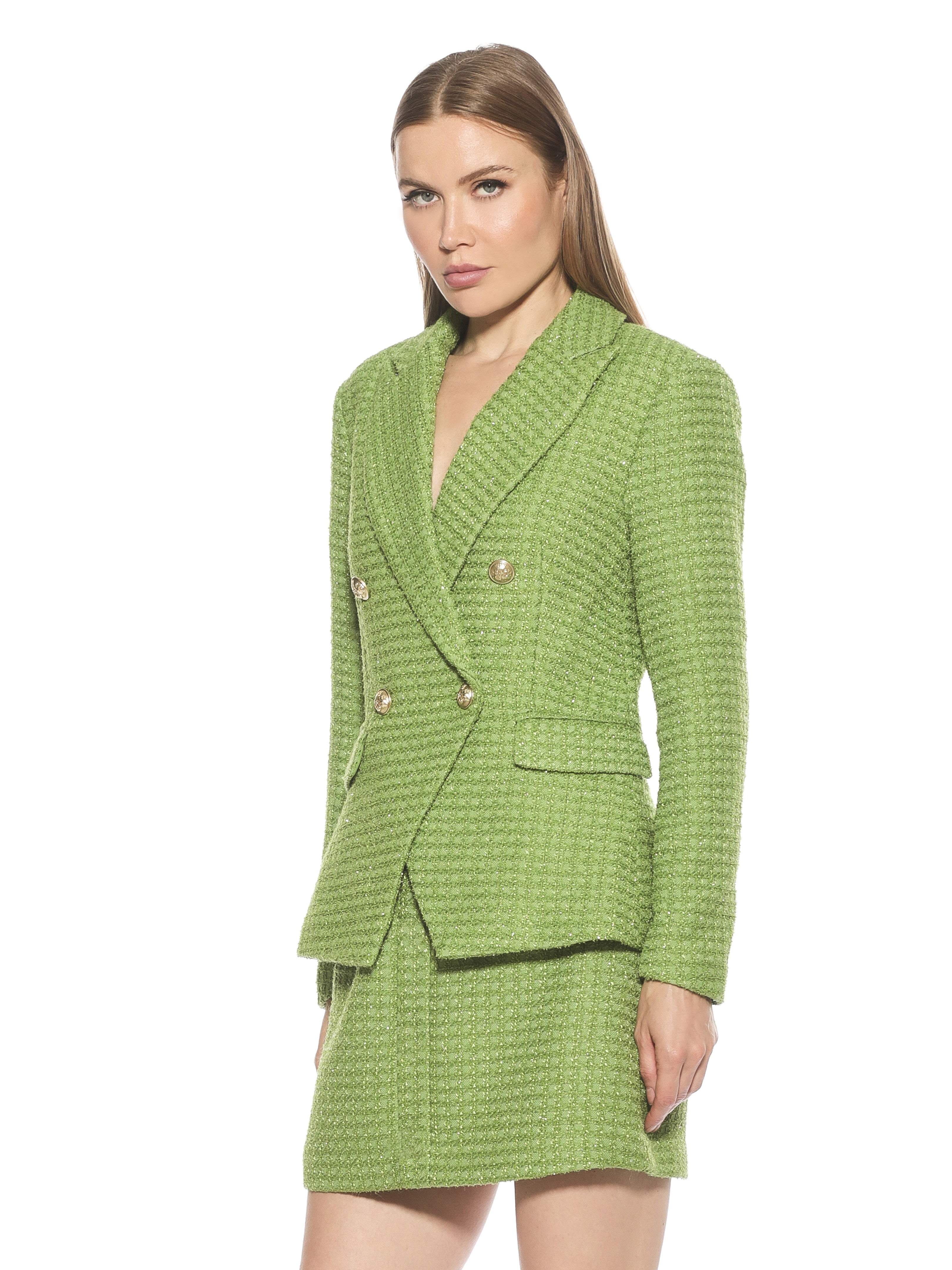 This Classic Blazer features a fitted cut with peaked lapels, long sleeves, and gold buttons. The luxurious tweed fabric elevates the look, while the double-breasted button closure provides a secure and flattering fit. A perfect piece for professional chic attire.