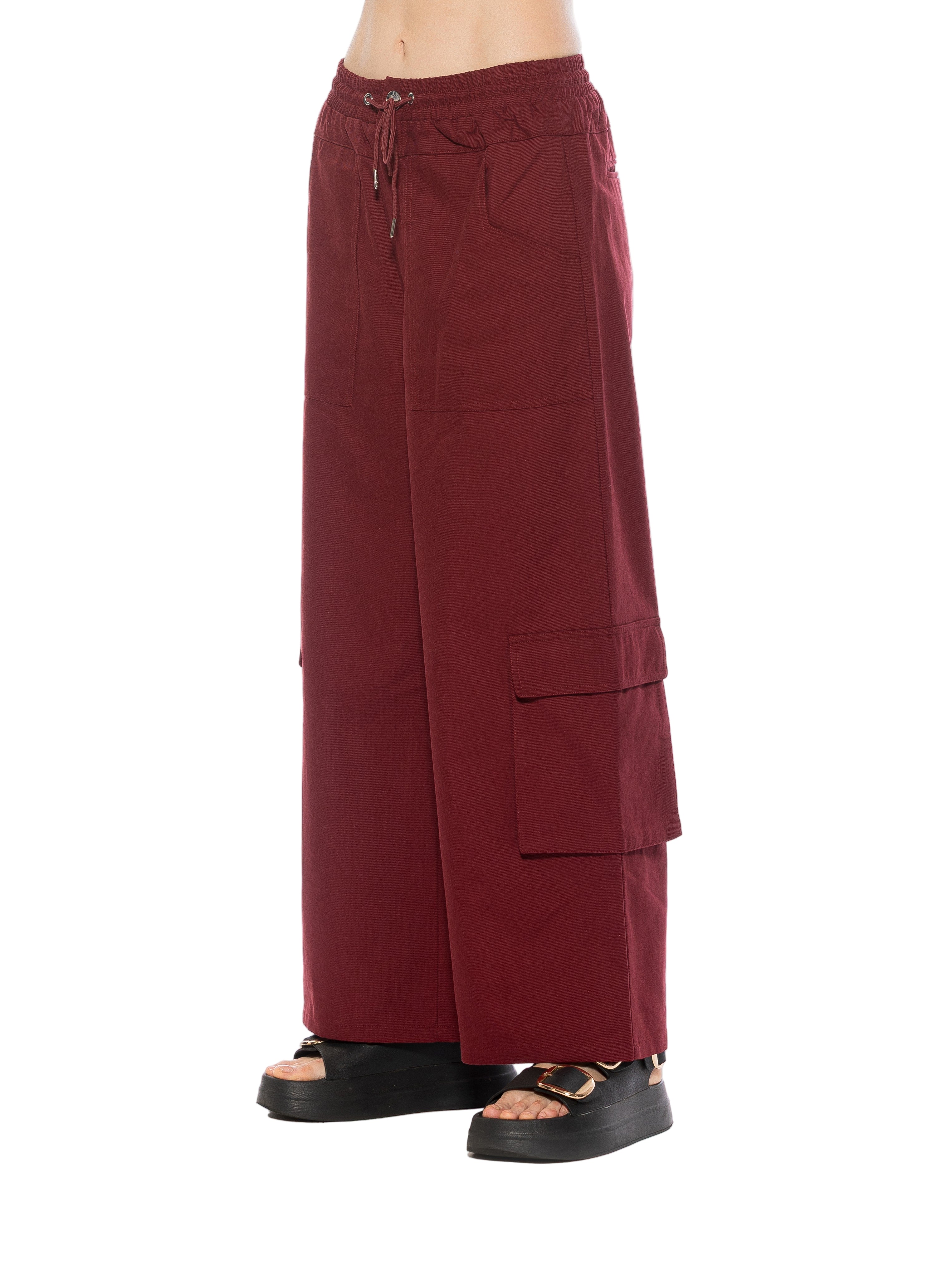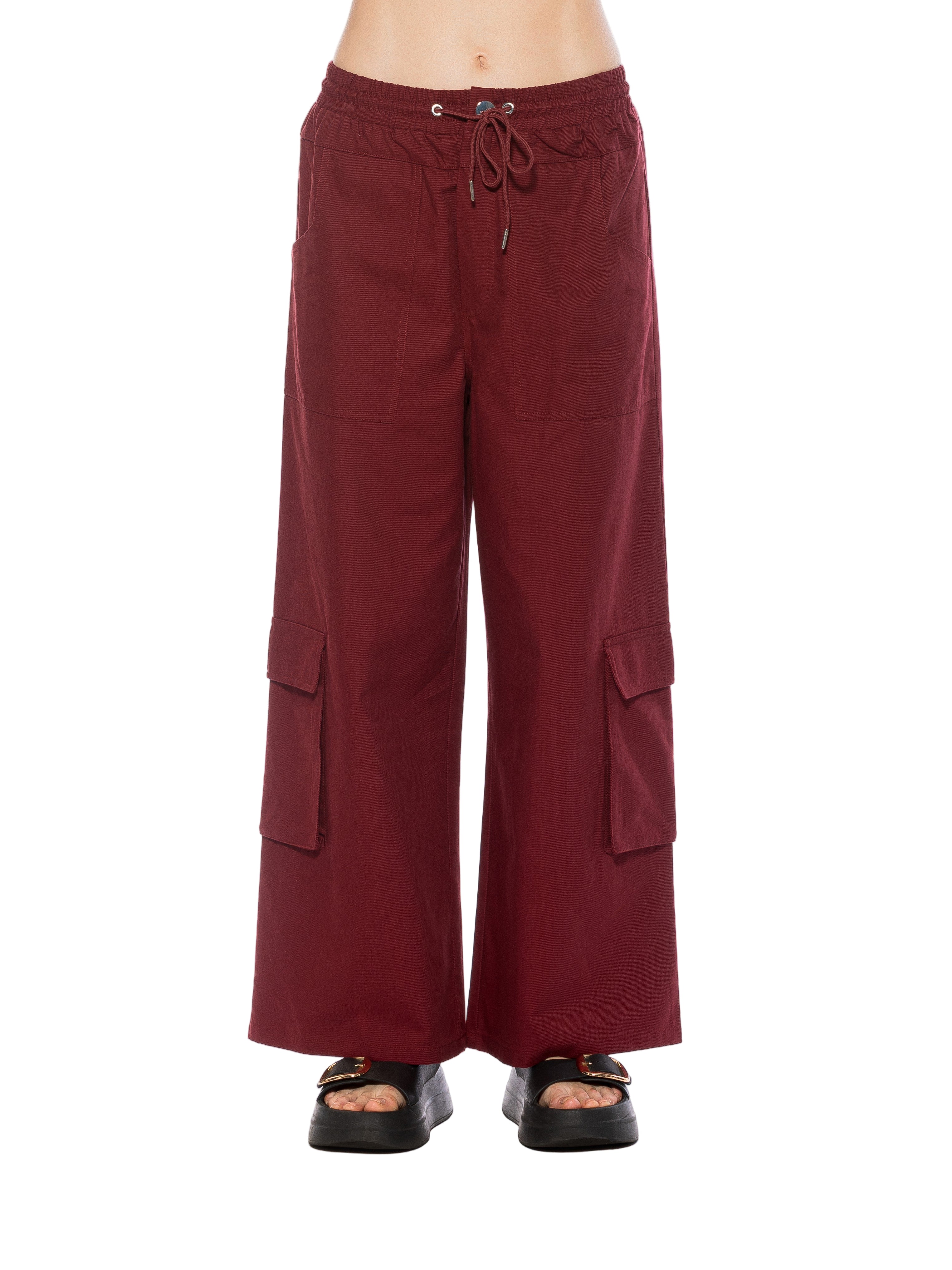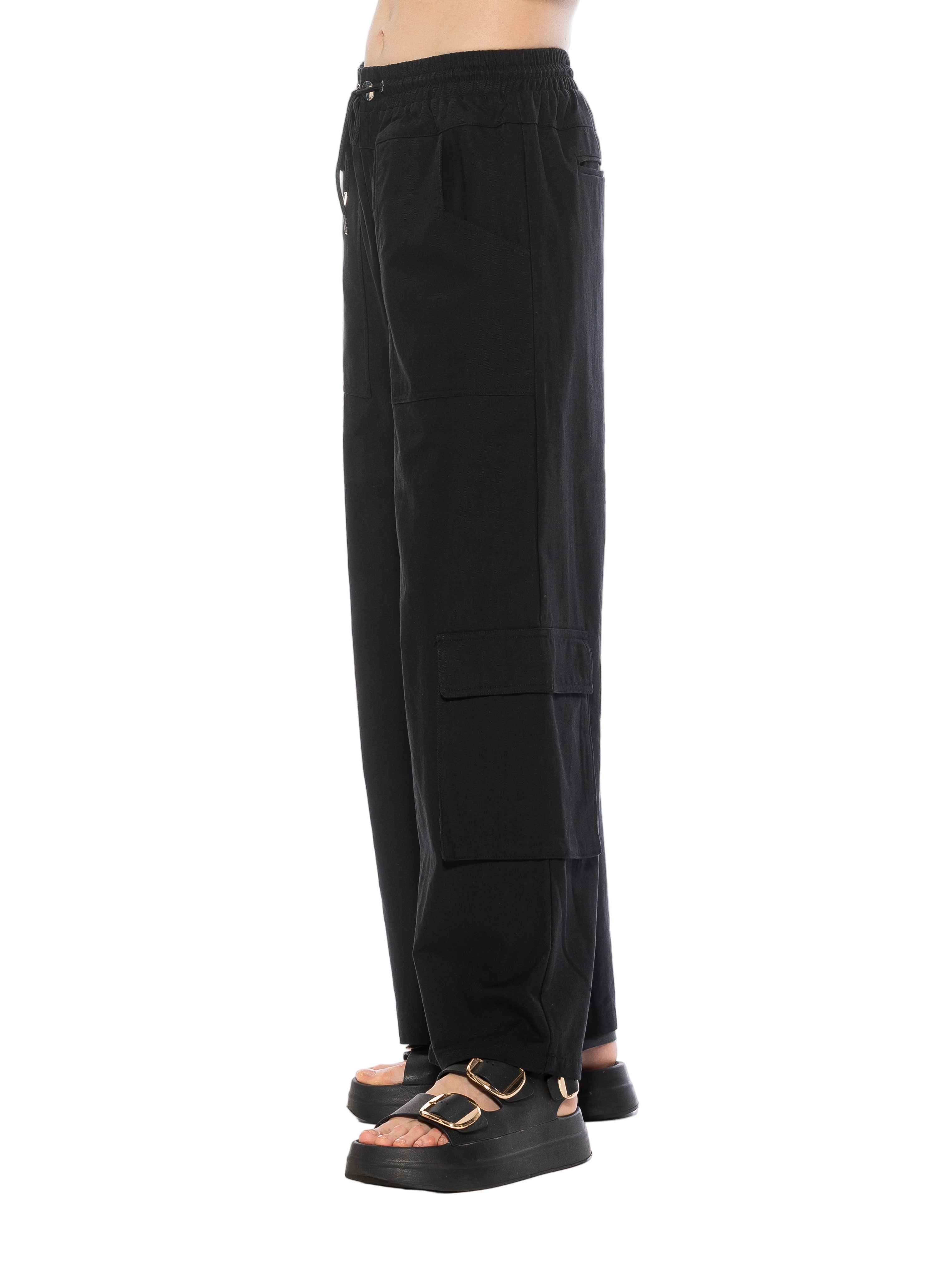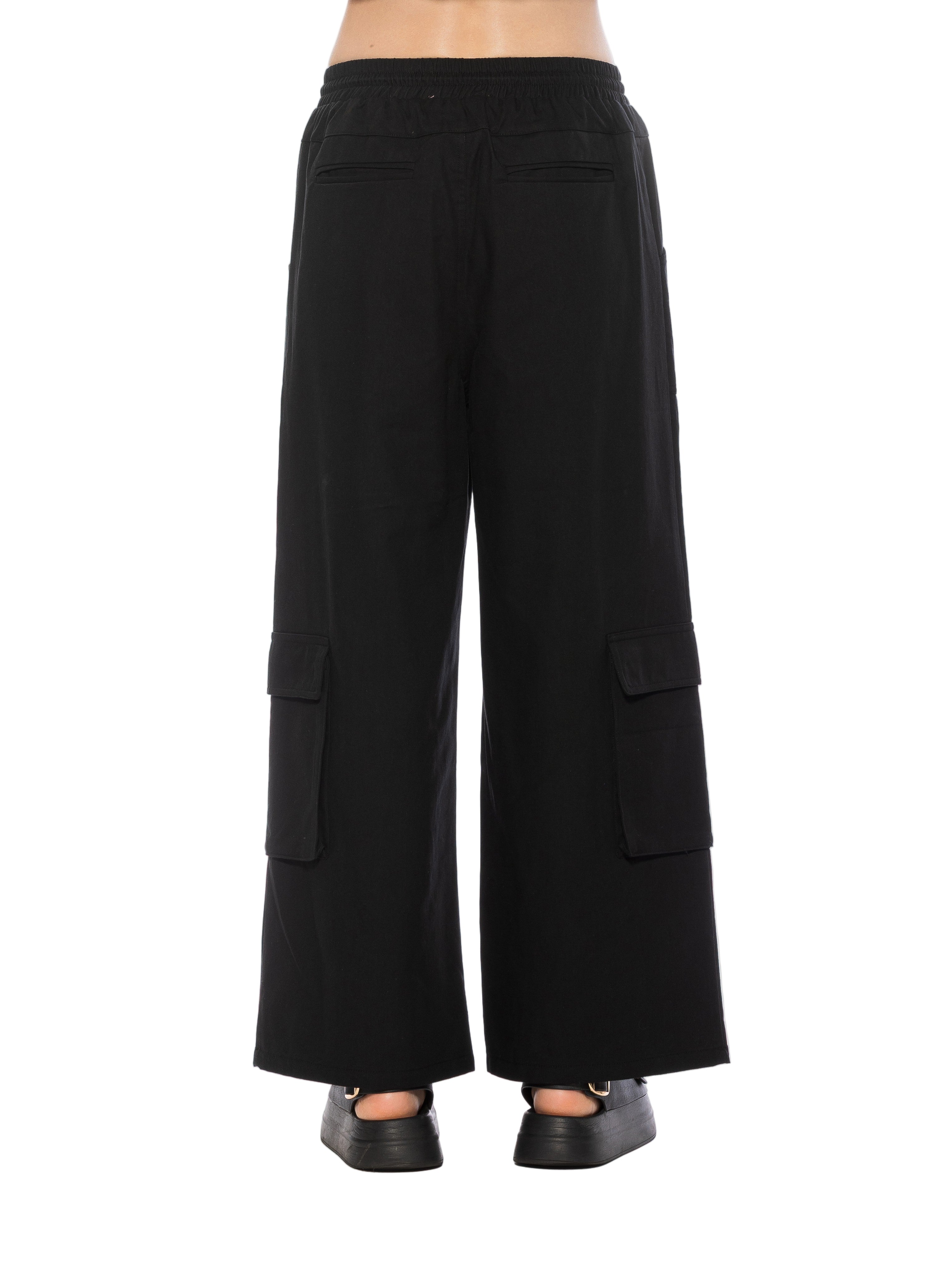 • Wide-leg cut with utility cargo pockets at sides and welt pockets at back