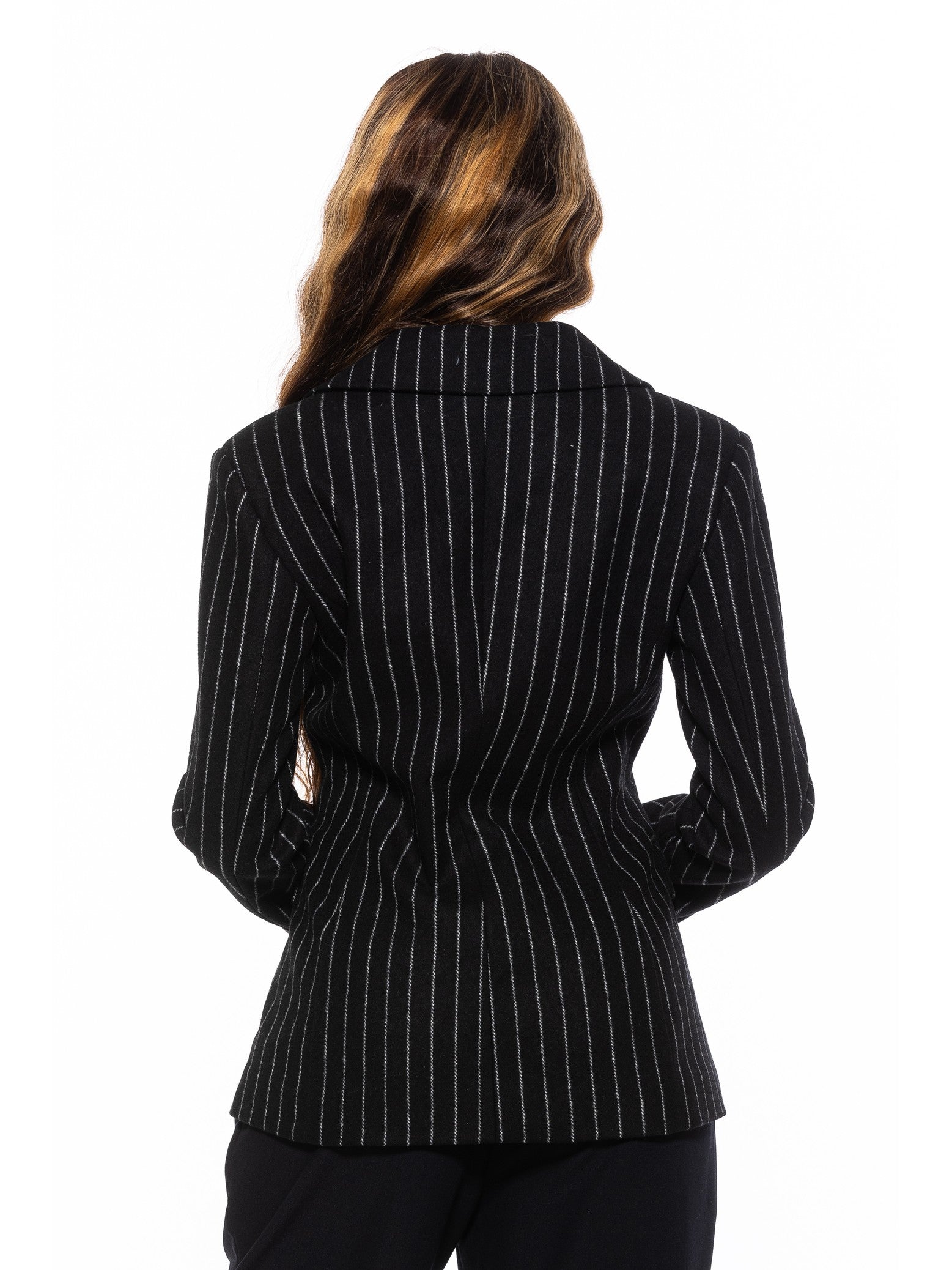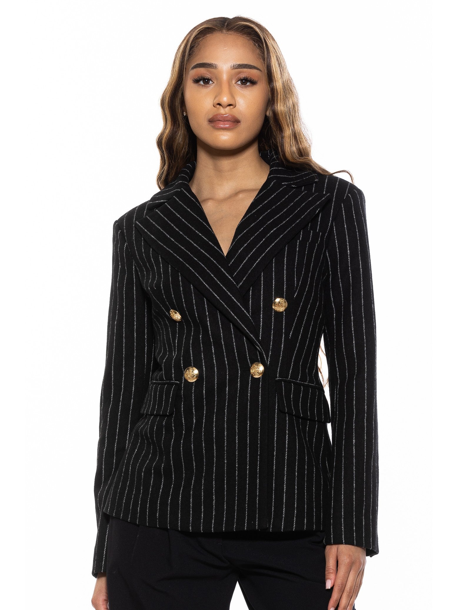 The Stripe Blazer exudes sophistication with its gold buttons and double breasted design. Elevate any outfit with this luxurious piece, a must-have for the fashion-forward individual. Command attention and make a statement with this exclusive blazer.