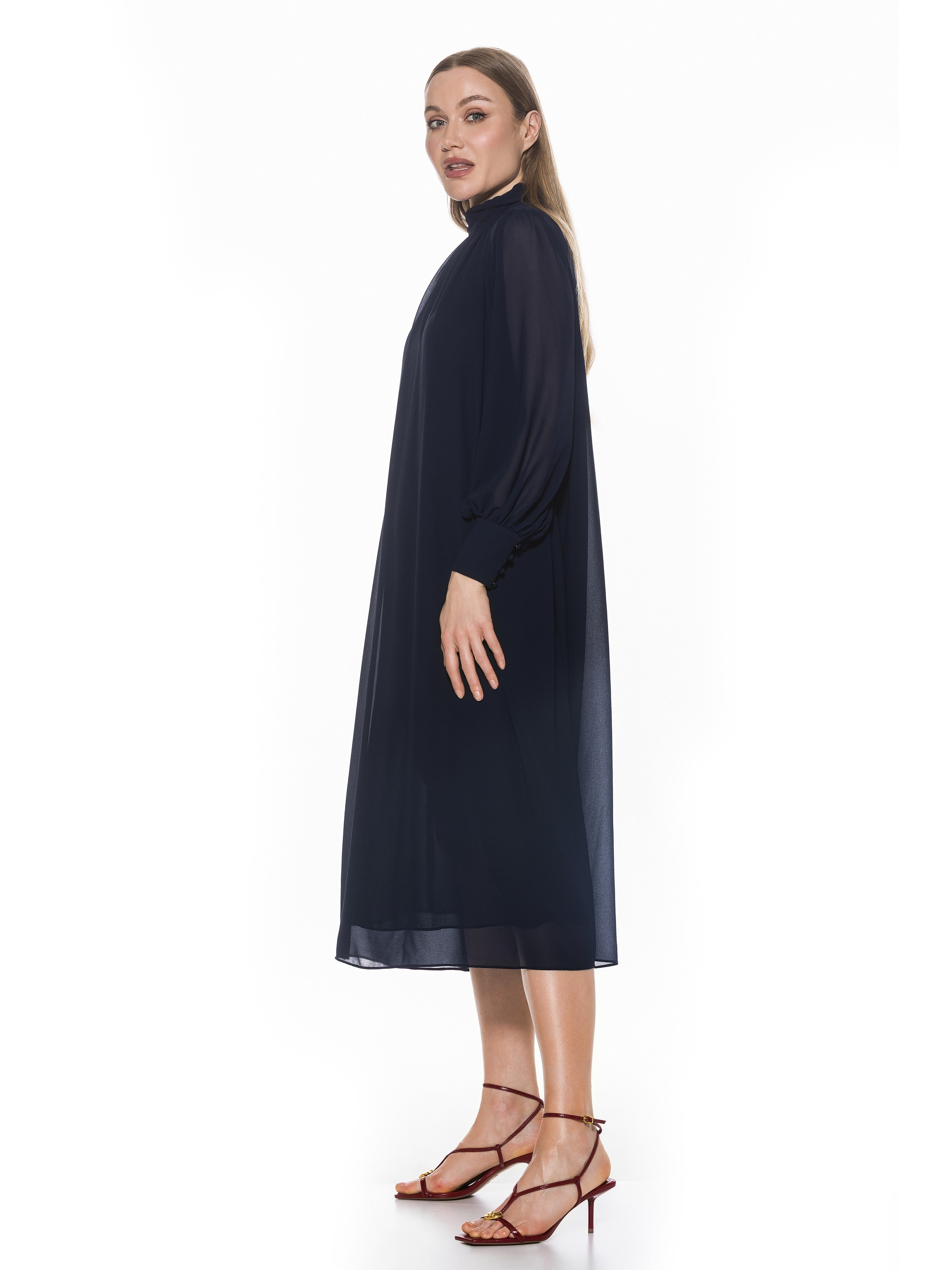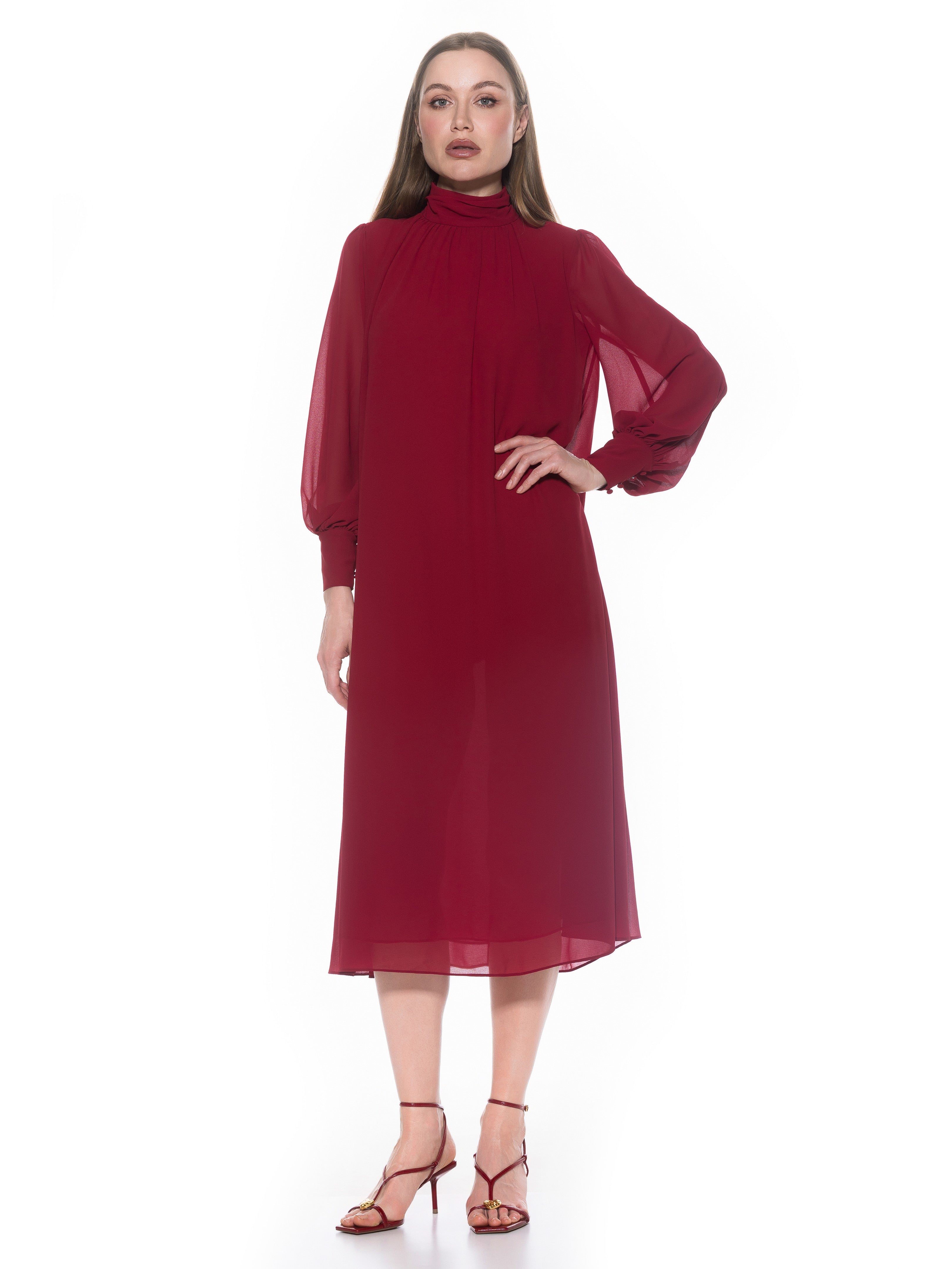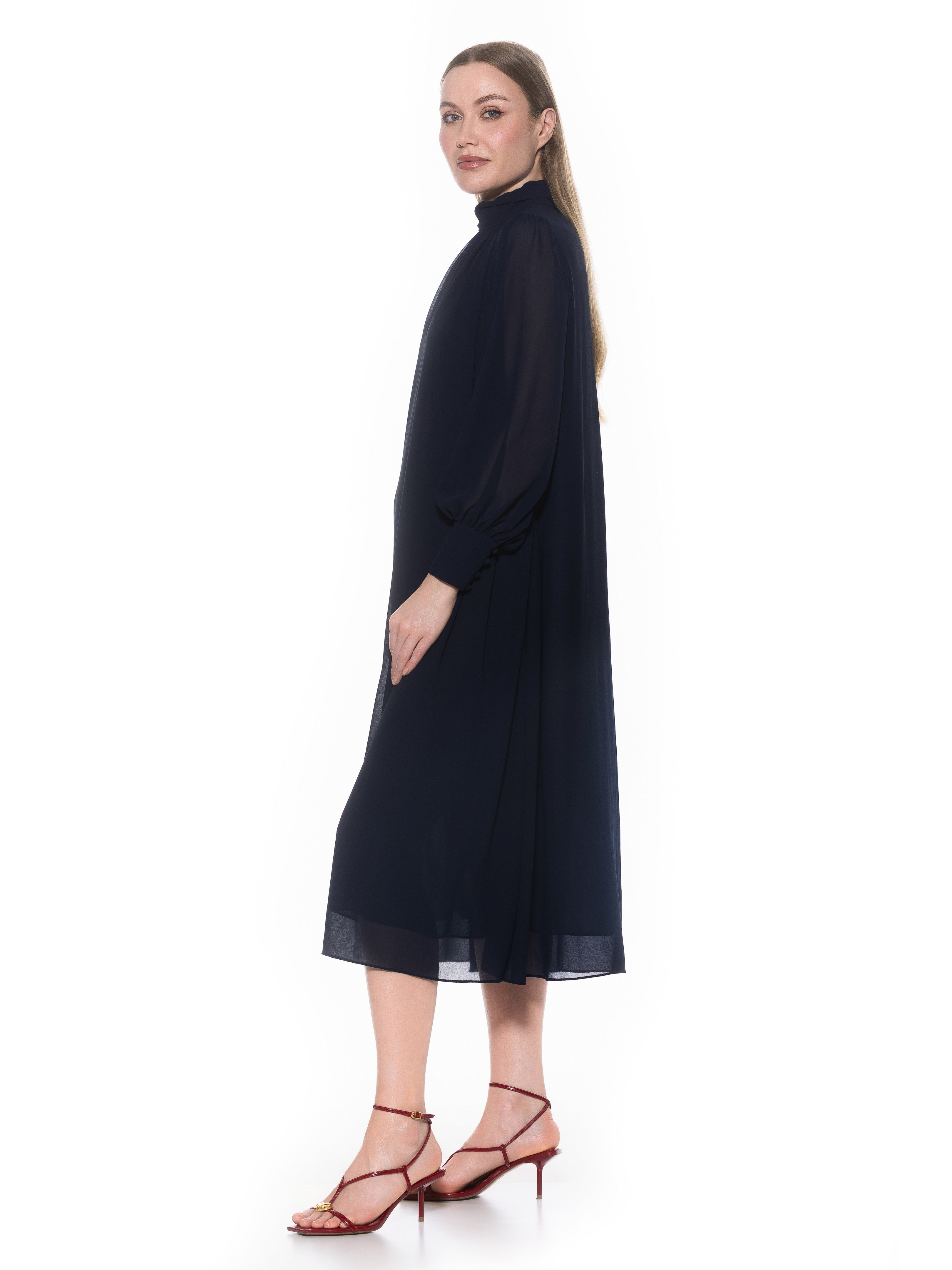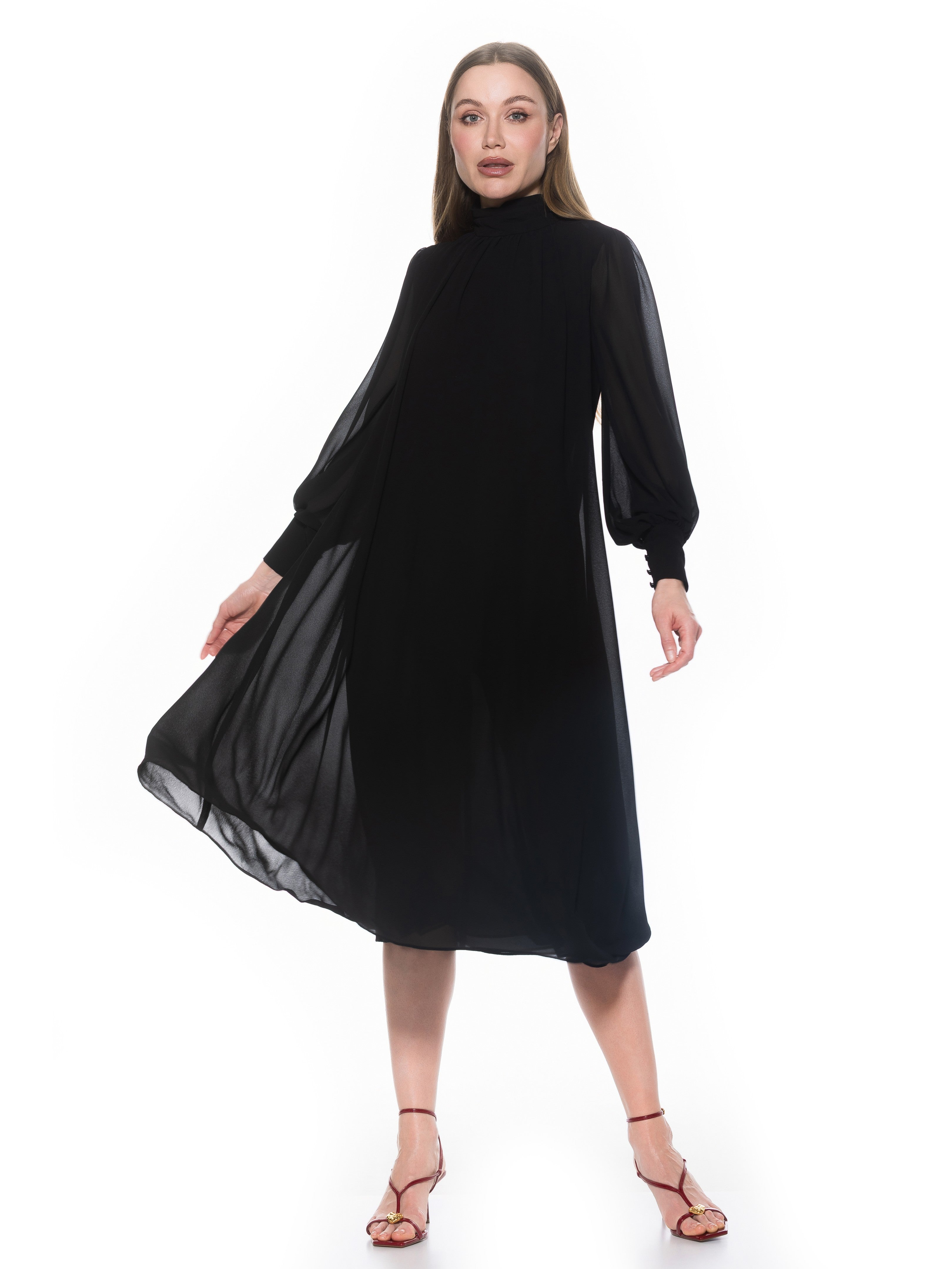 The Kehlani Mock neck Chiffon Dress With Blouson Sleeves Is A Must Have For Your Closet. This Dress Features Delicate Chiffon Fabric, Flowy Body, Mock neck, And Blouson Sleeves. This Item Runs Large.