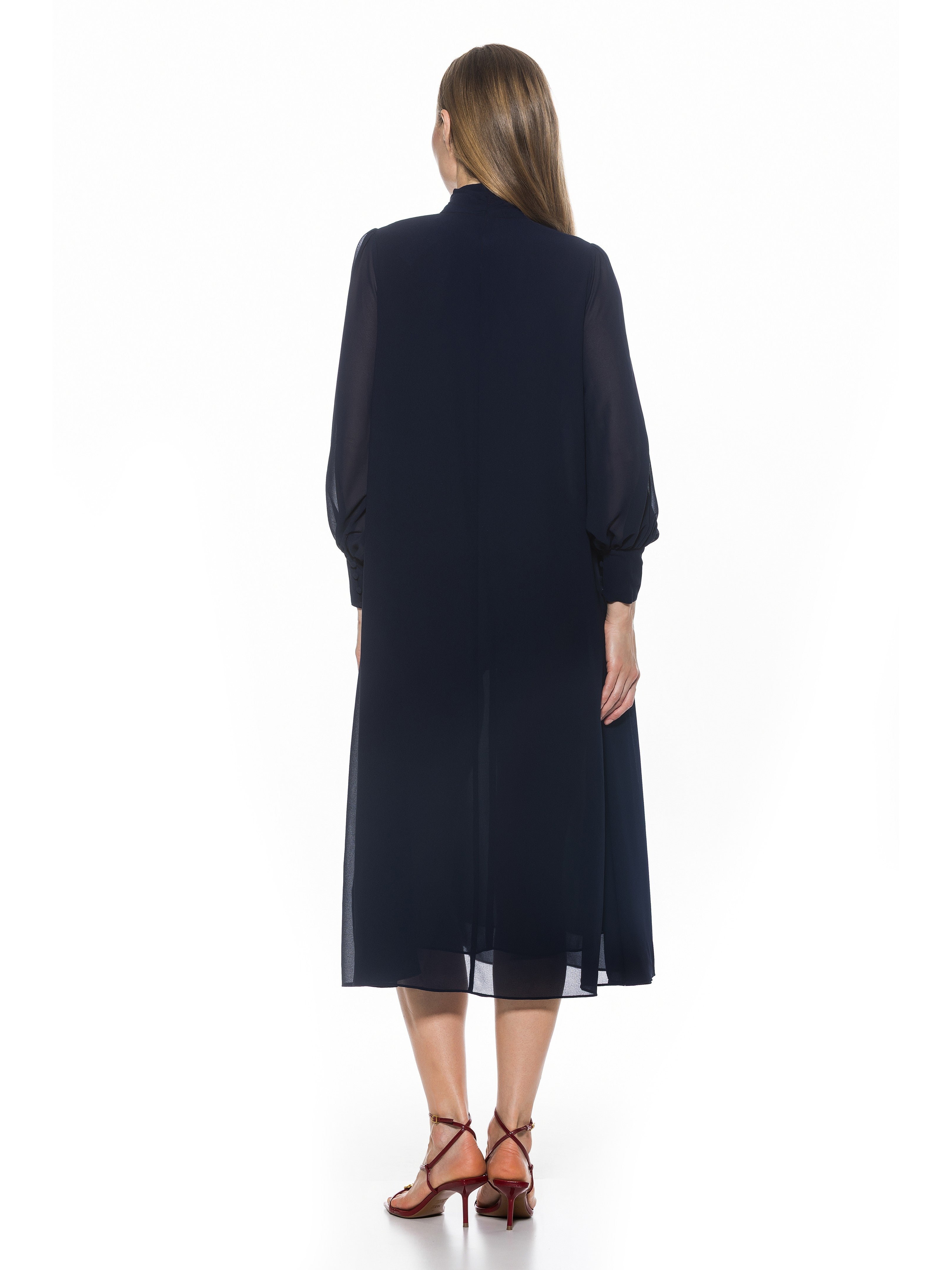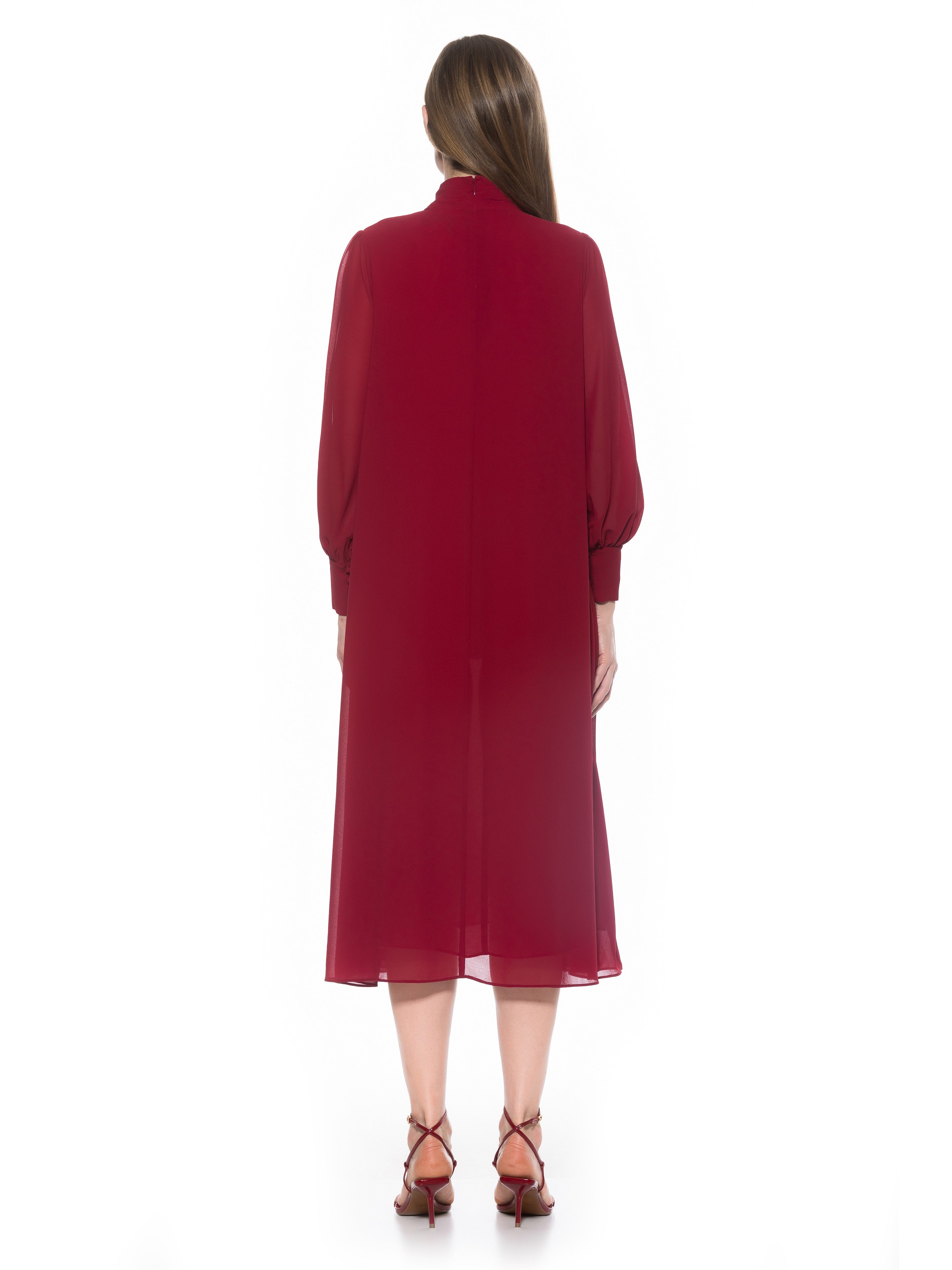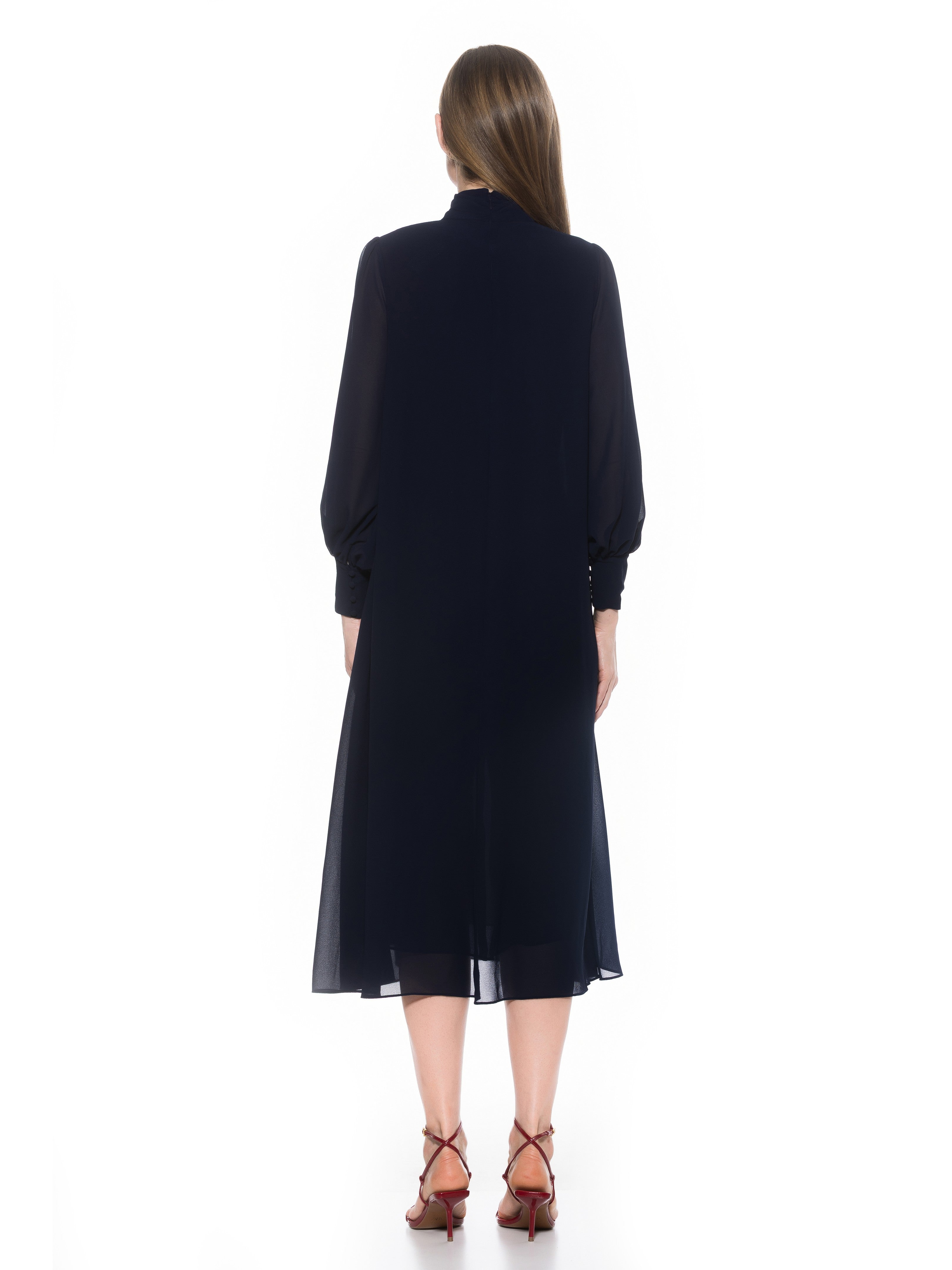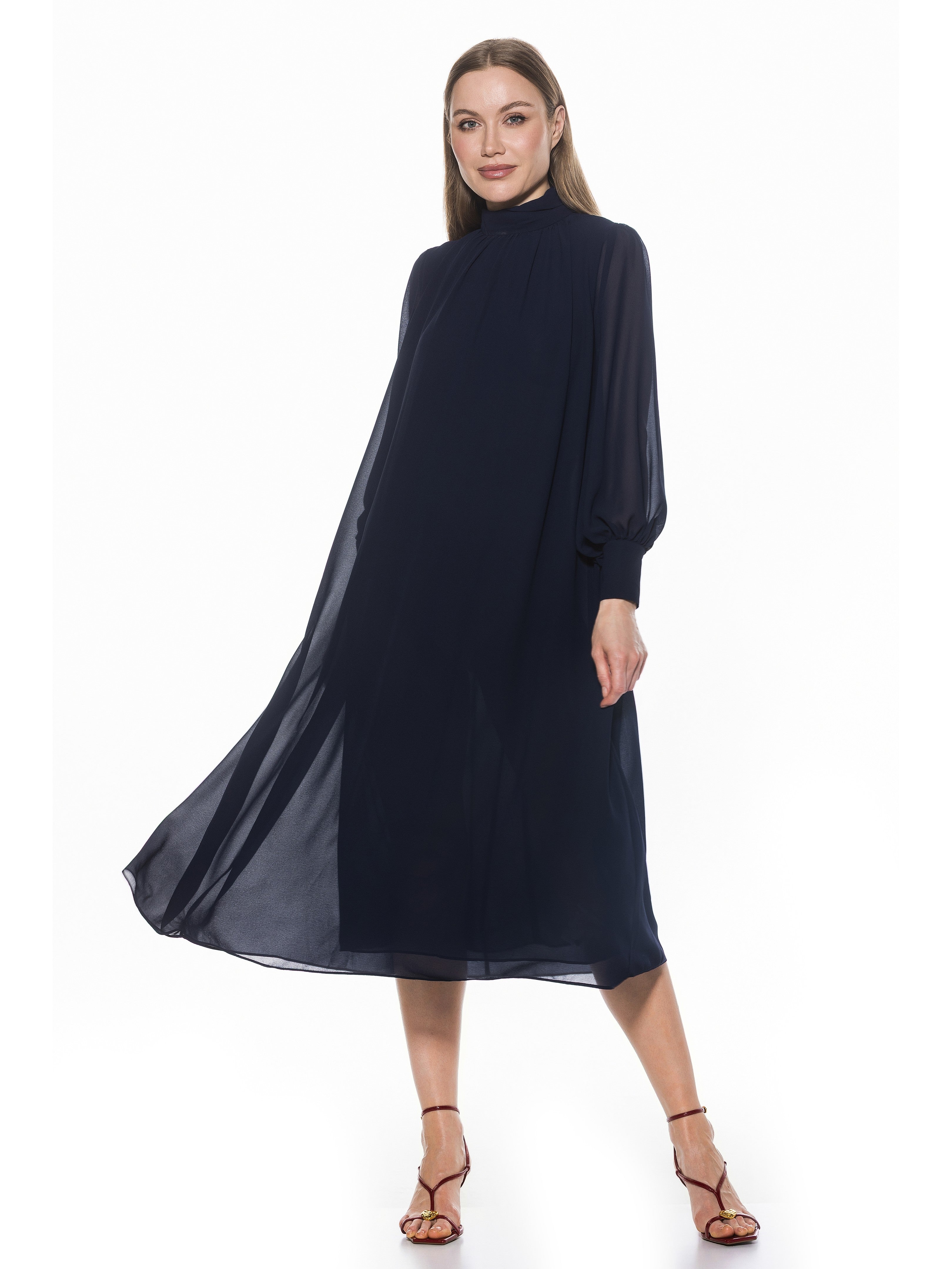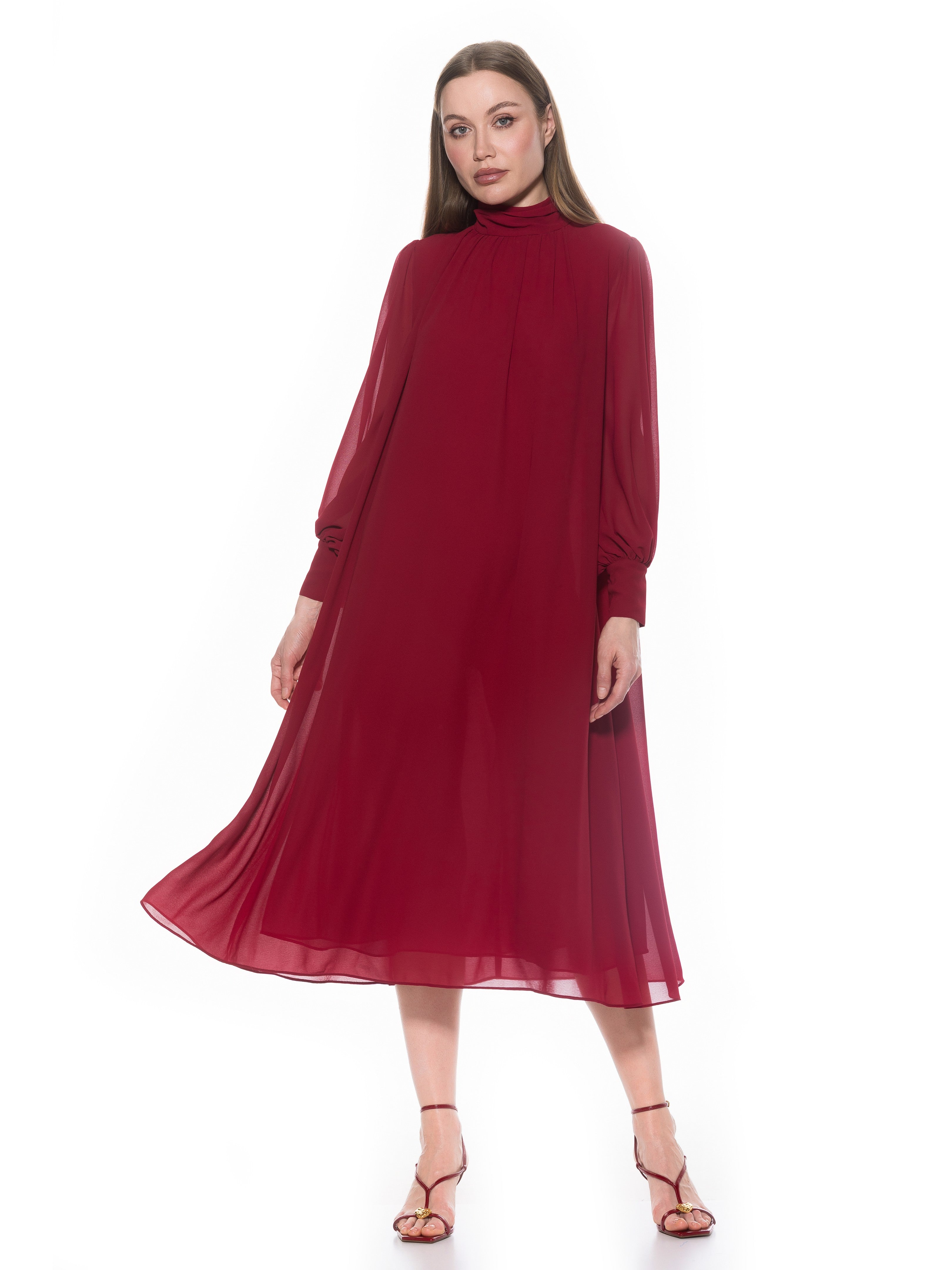 The Kehlani Mock neck Chiffon Dress With Blouson Sleeves Is A Must Have For Your Closet. This Dress Features Delicate Chiffon Fabric, Flowy Body, Mock neck, And Blouson Sleeves. This Item Runs Large.