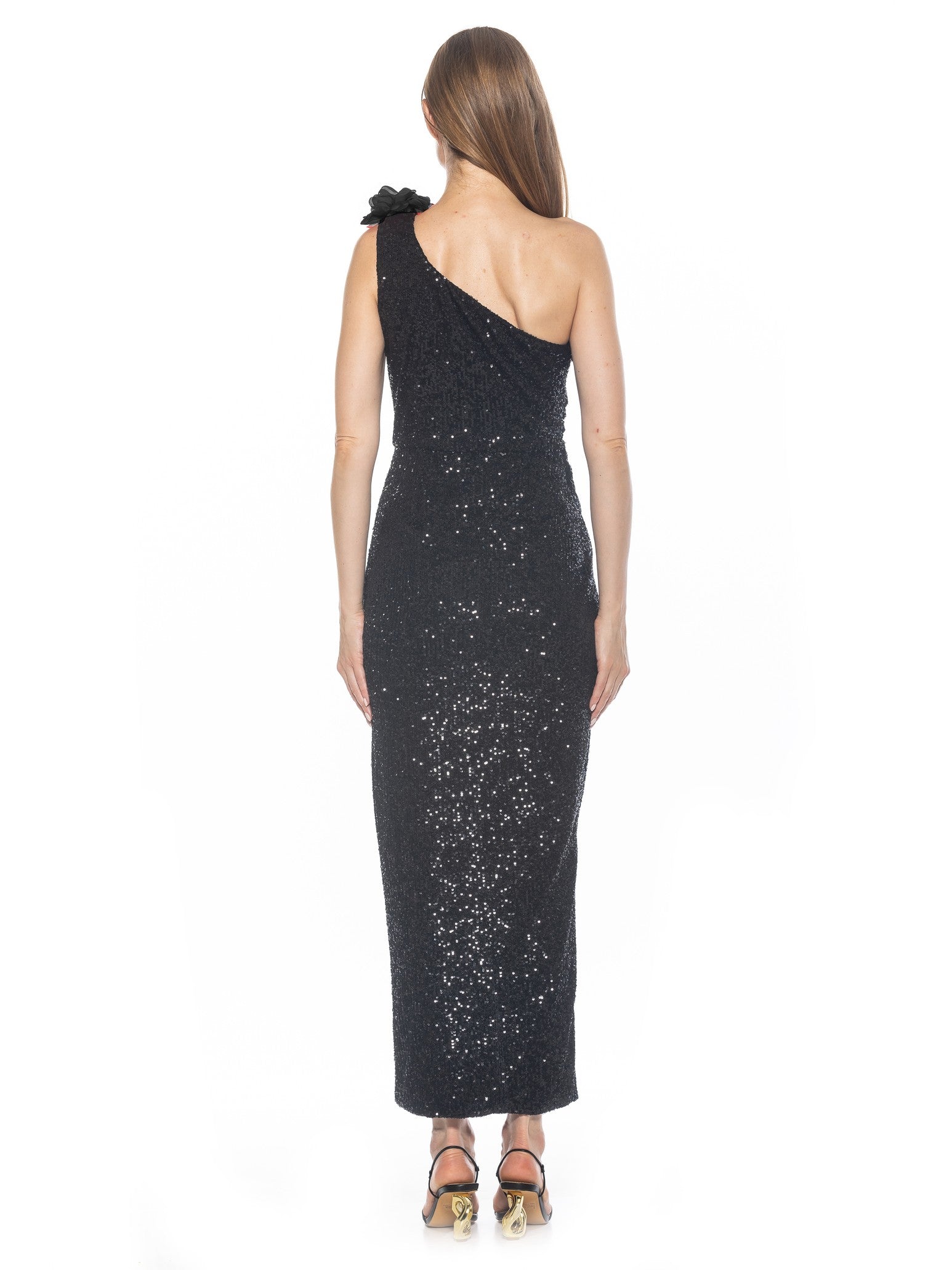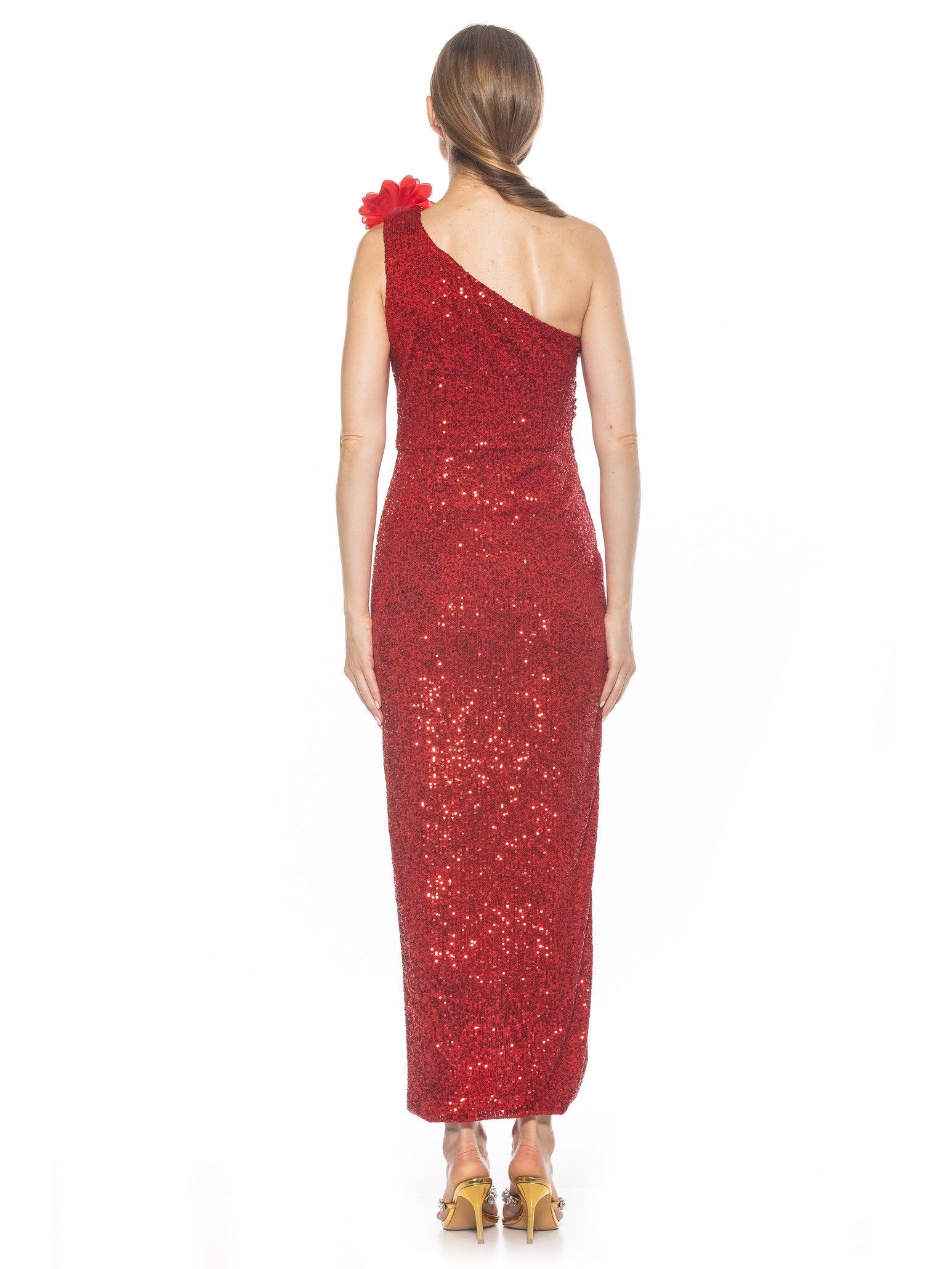Indulge in luxurious elegance with Alessi Dress. The draping and sequin material exude sophistication while the high slit adds a touch of allure. A delicate flower on the shoulder completes this exclusive piece, perfect for your next glamorous event.