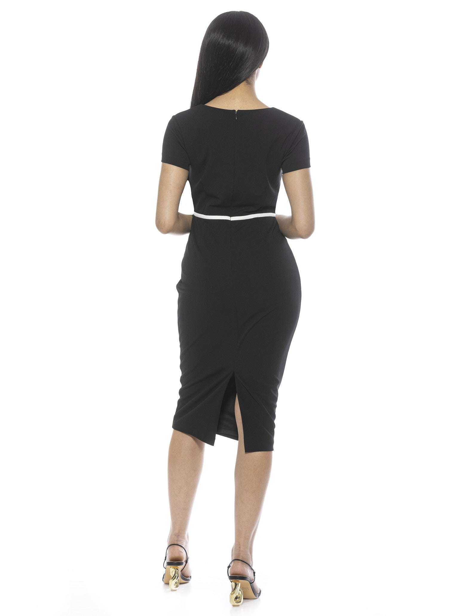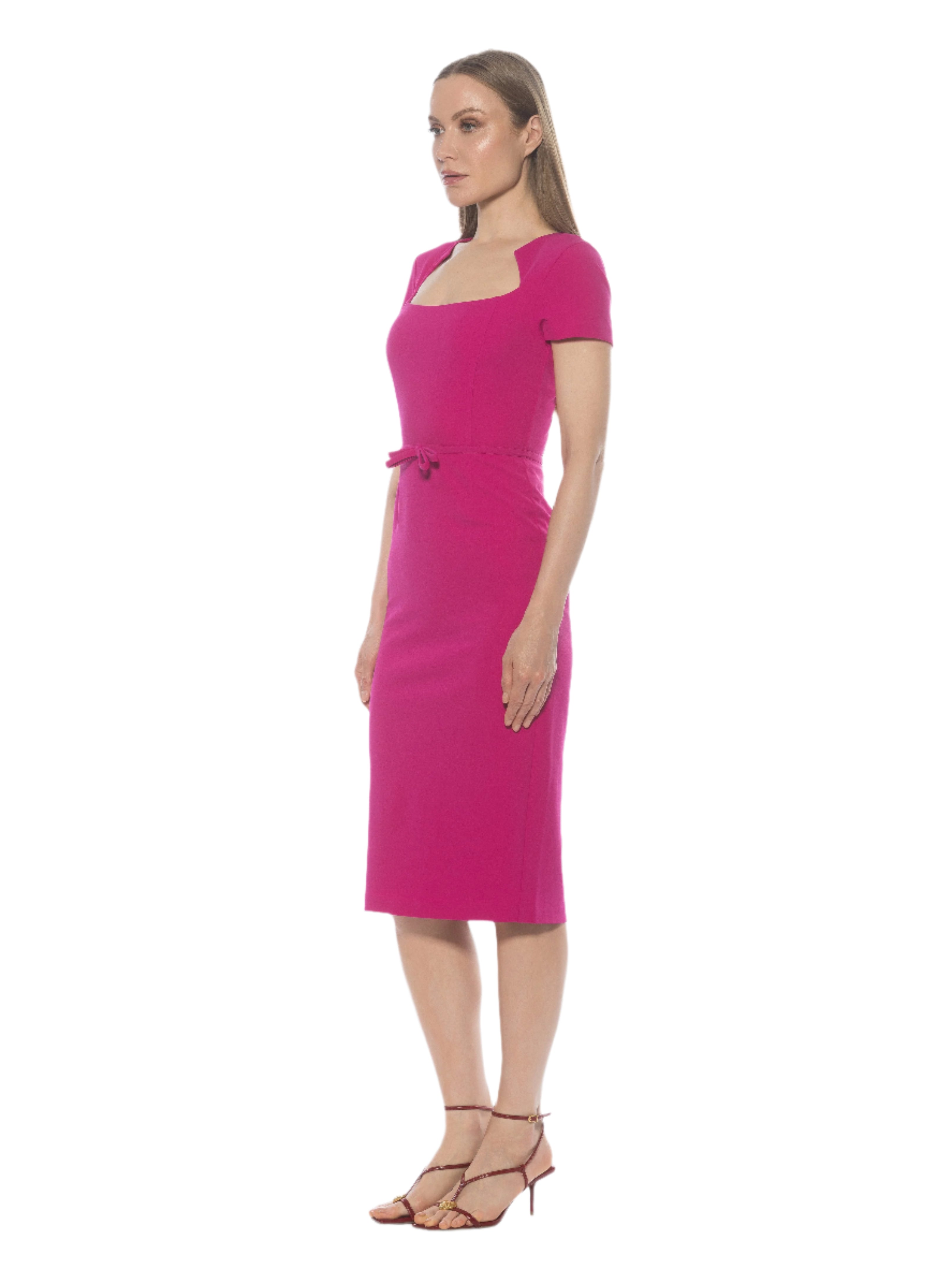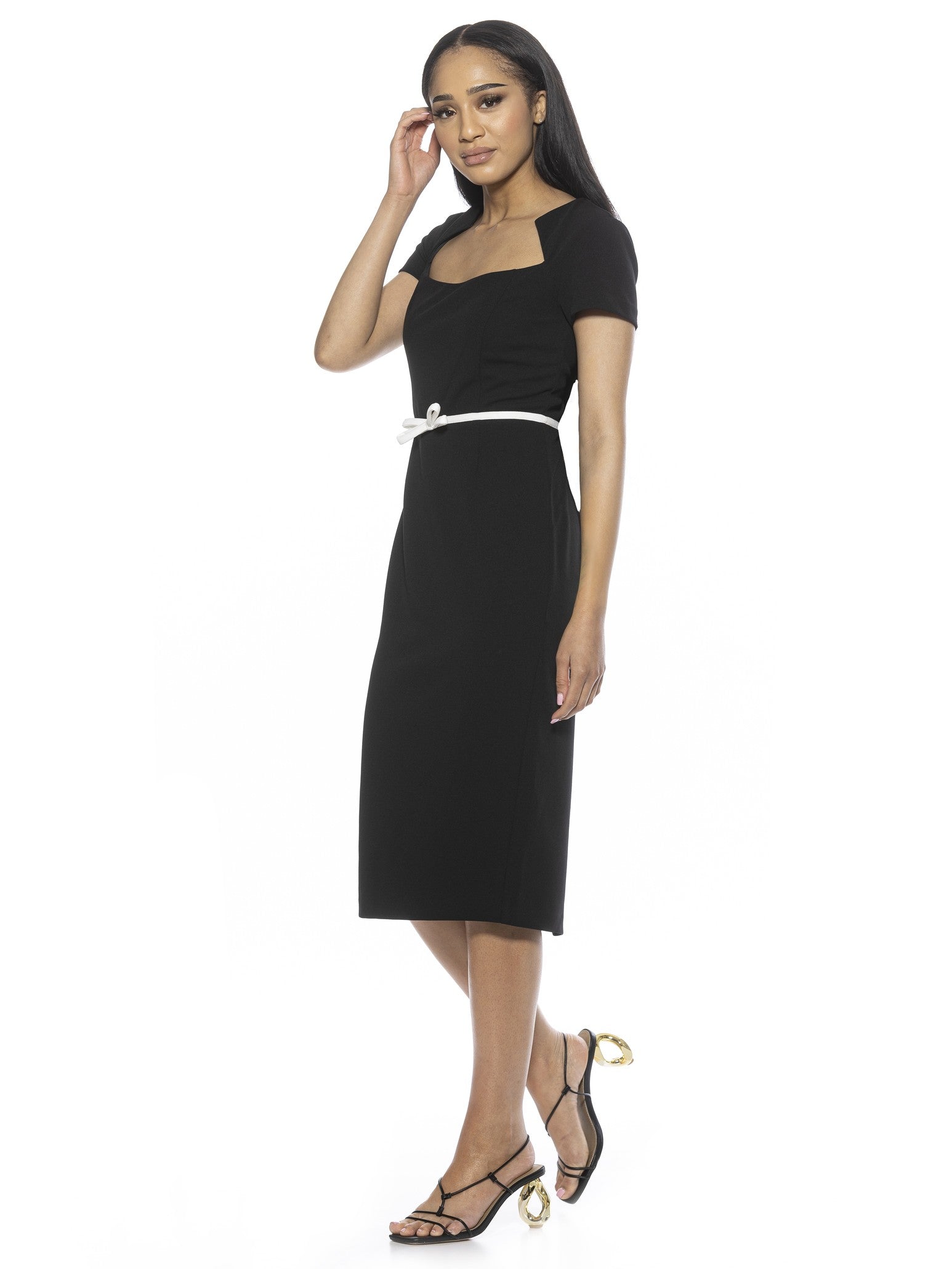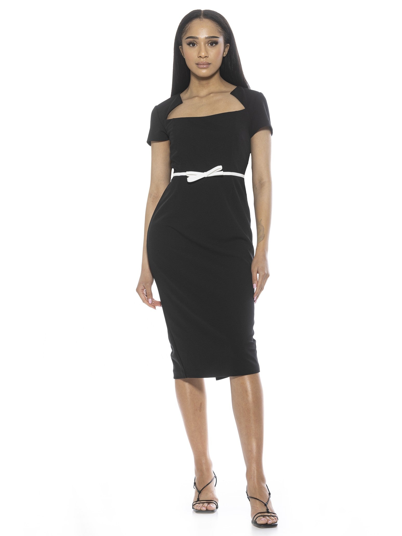 The Alma Short Sleeve Portrait Scoop Neck Midi Sheath Dress Is A Must Have For Your Wardrobe. This Dress Features Portrait Neckline, Short Sleeves, Front Bow At Waist, And Midi Length Skirt. This Dress Fits True To Size.