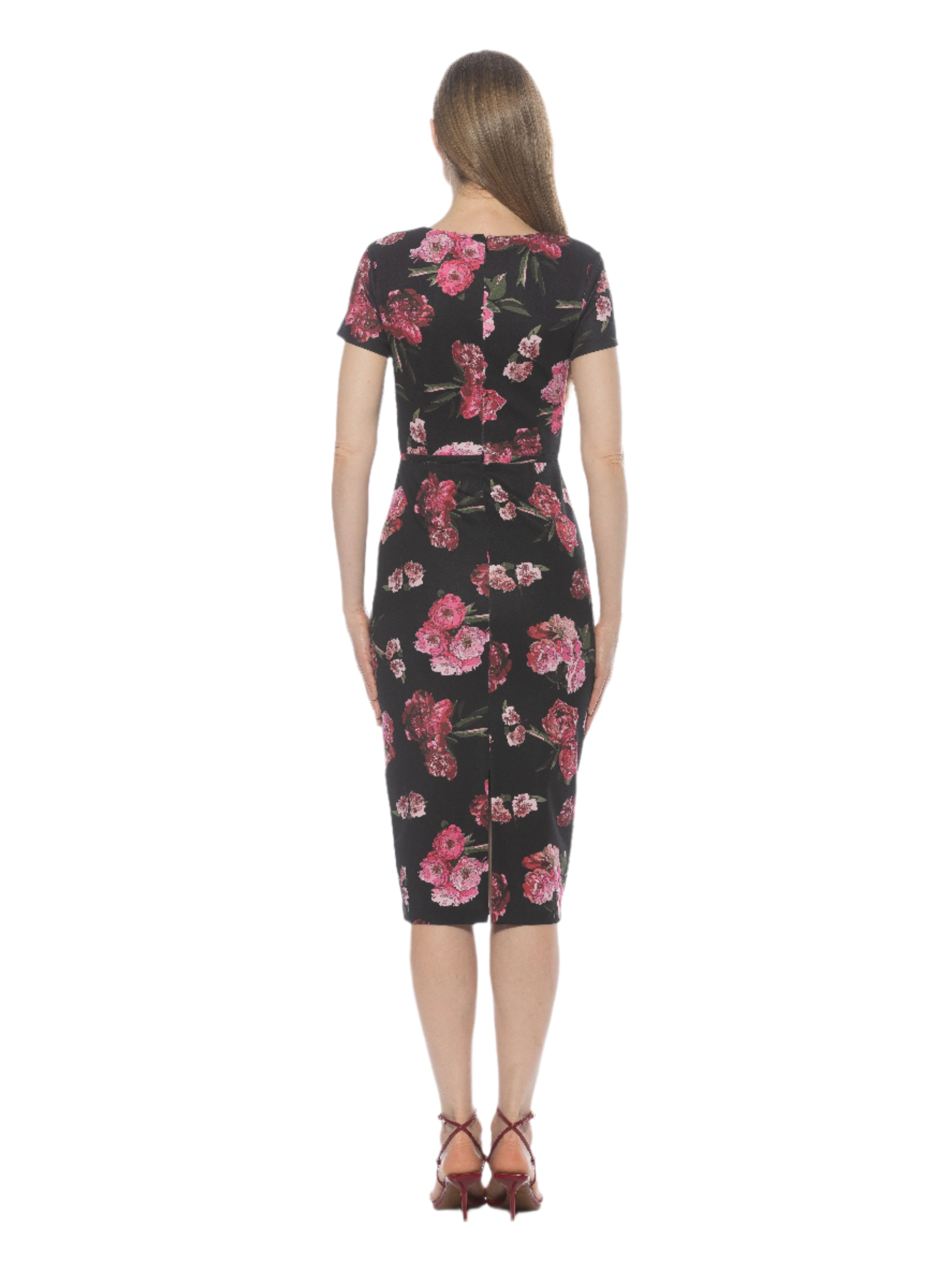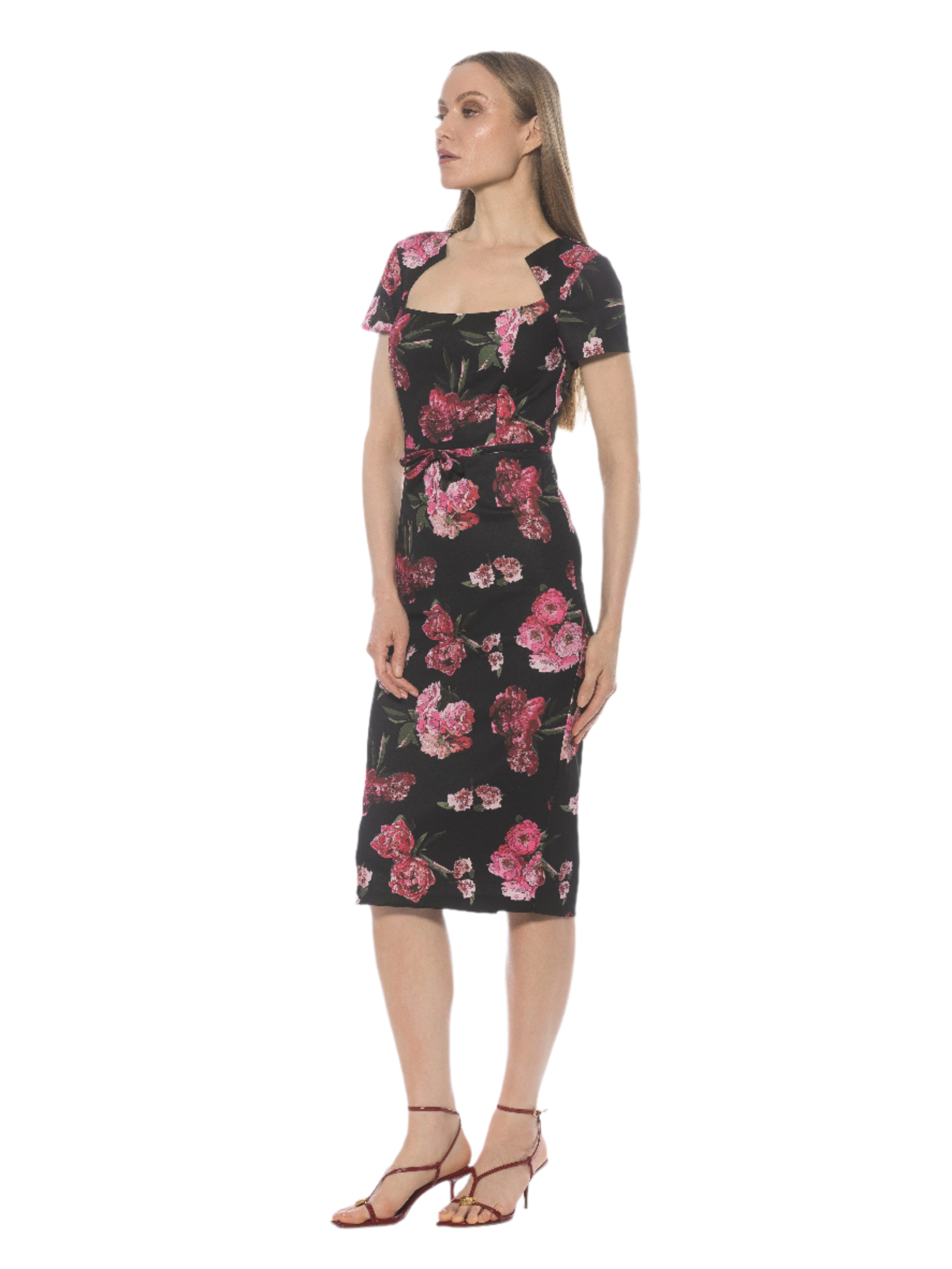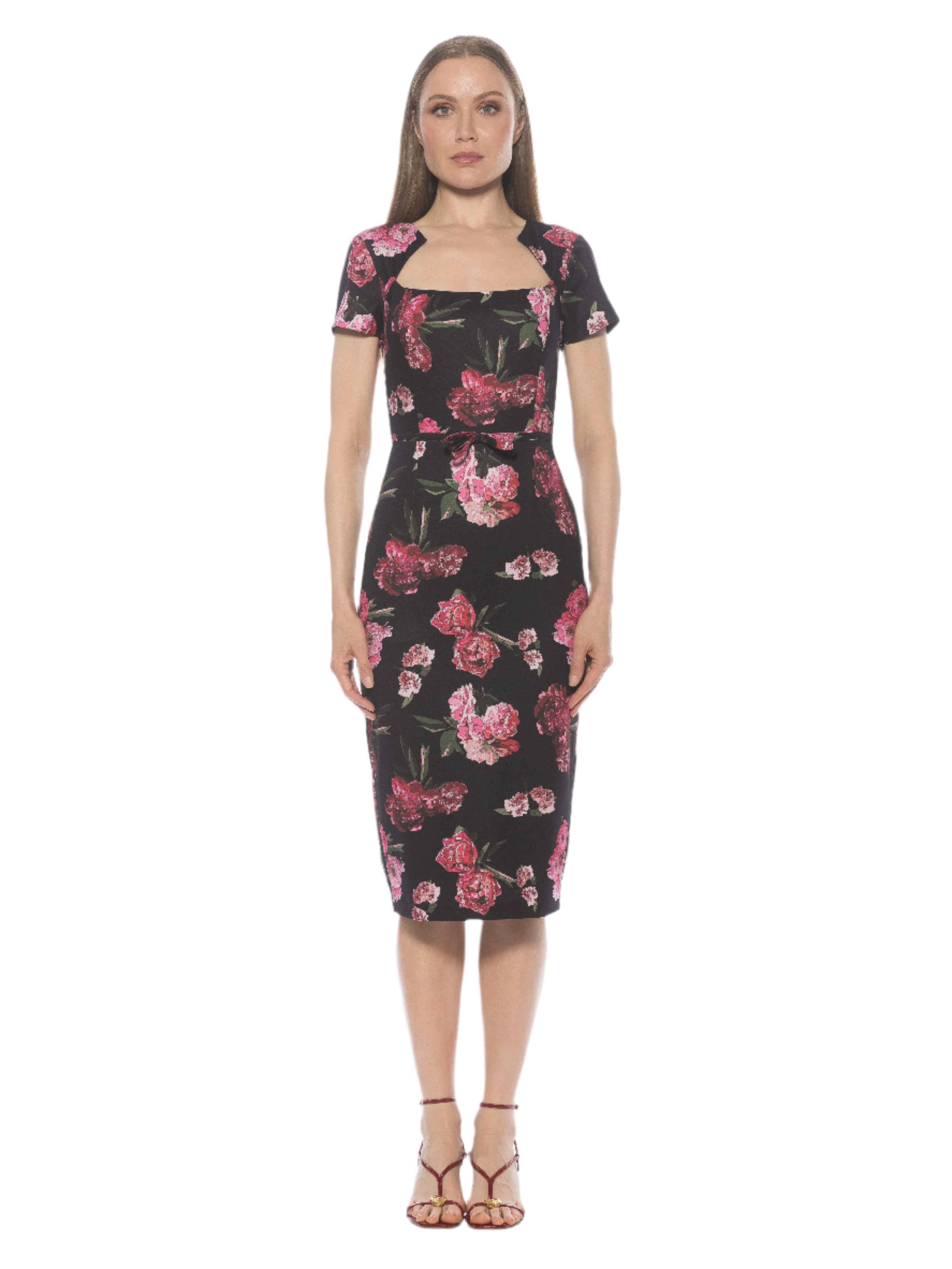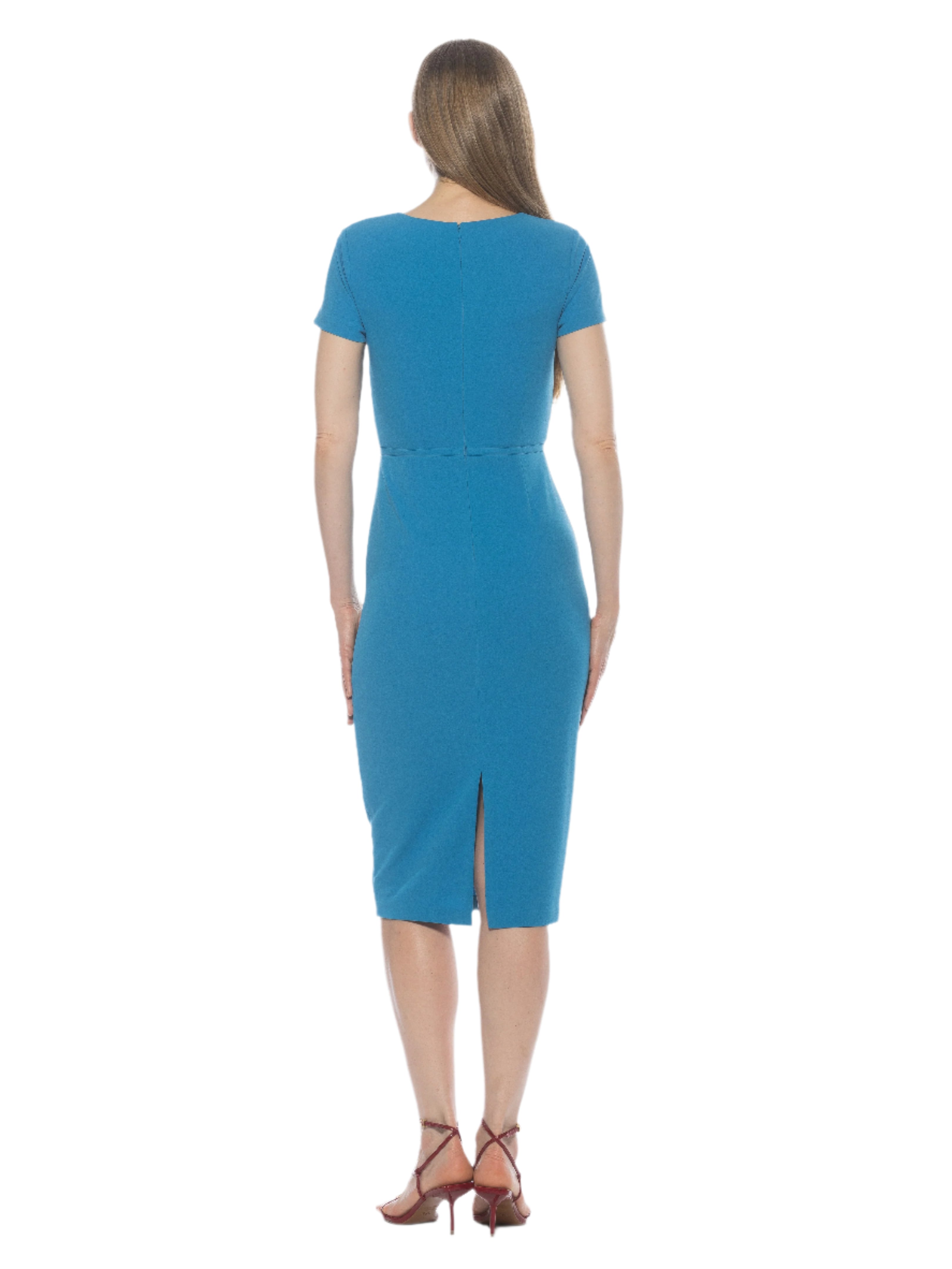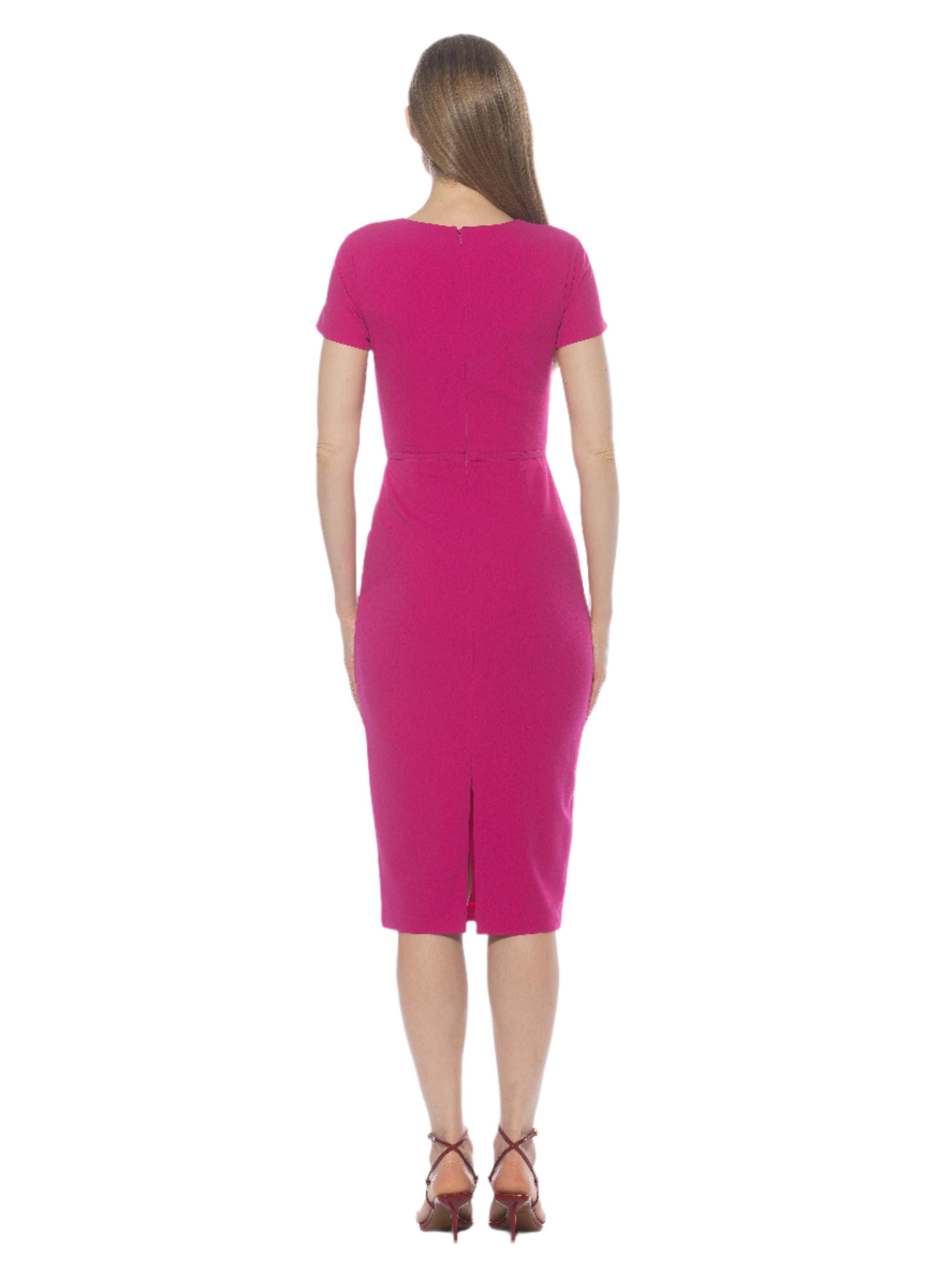 The Alma Short Sleeve Portrait Scoop Neck Midi Sheath Dress Is A Must Have For Your Wardrobe. This Dress Features Portrait Neckline, Short Sleeves, Front Bow At Waist, And Midi Length Skirt. This Dress Fits True To Size.
