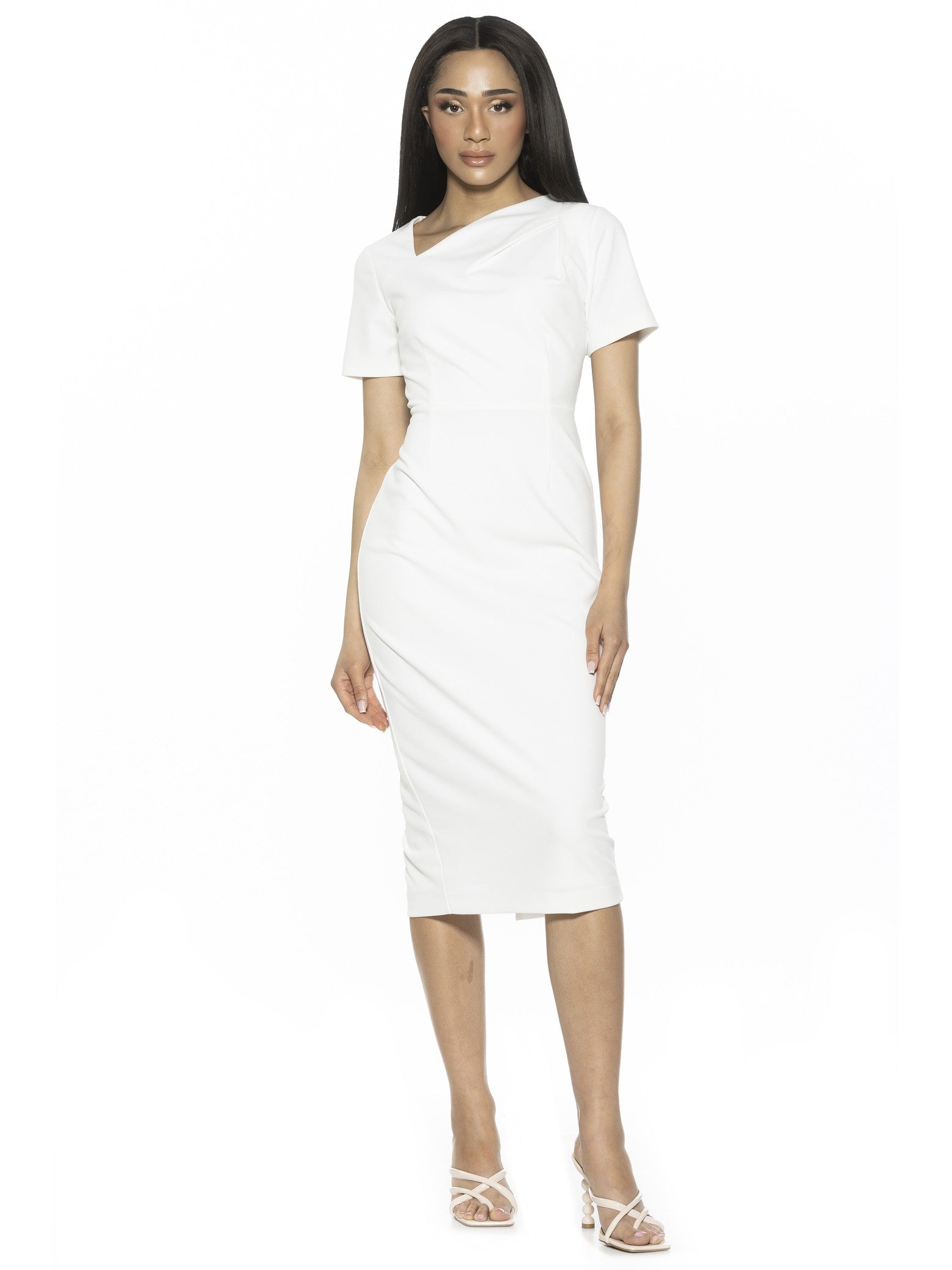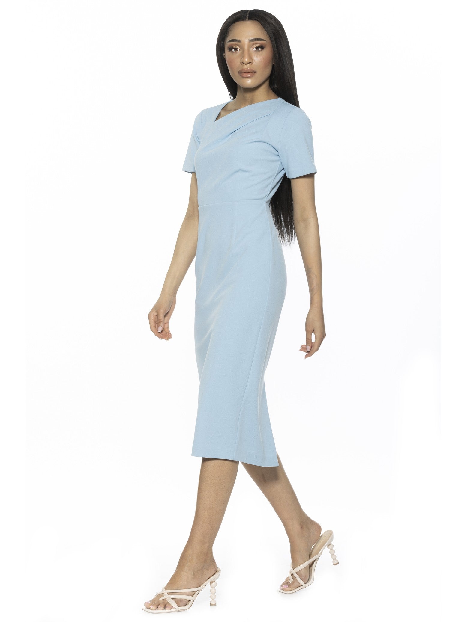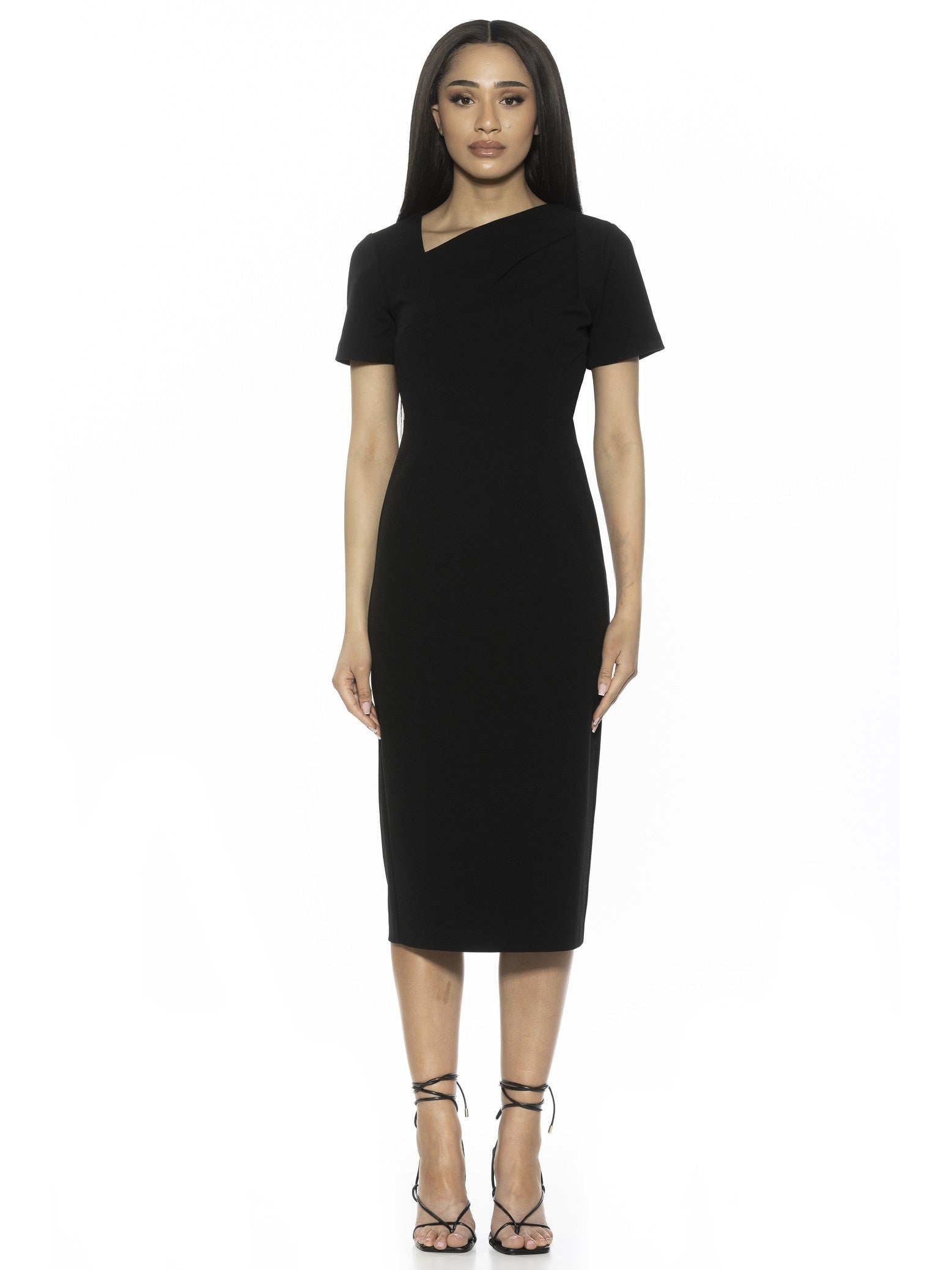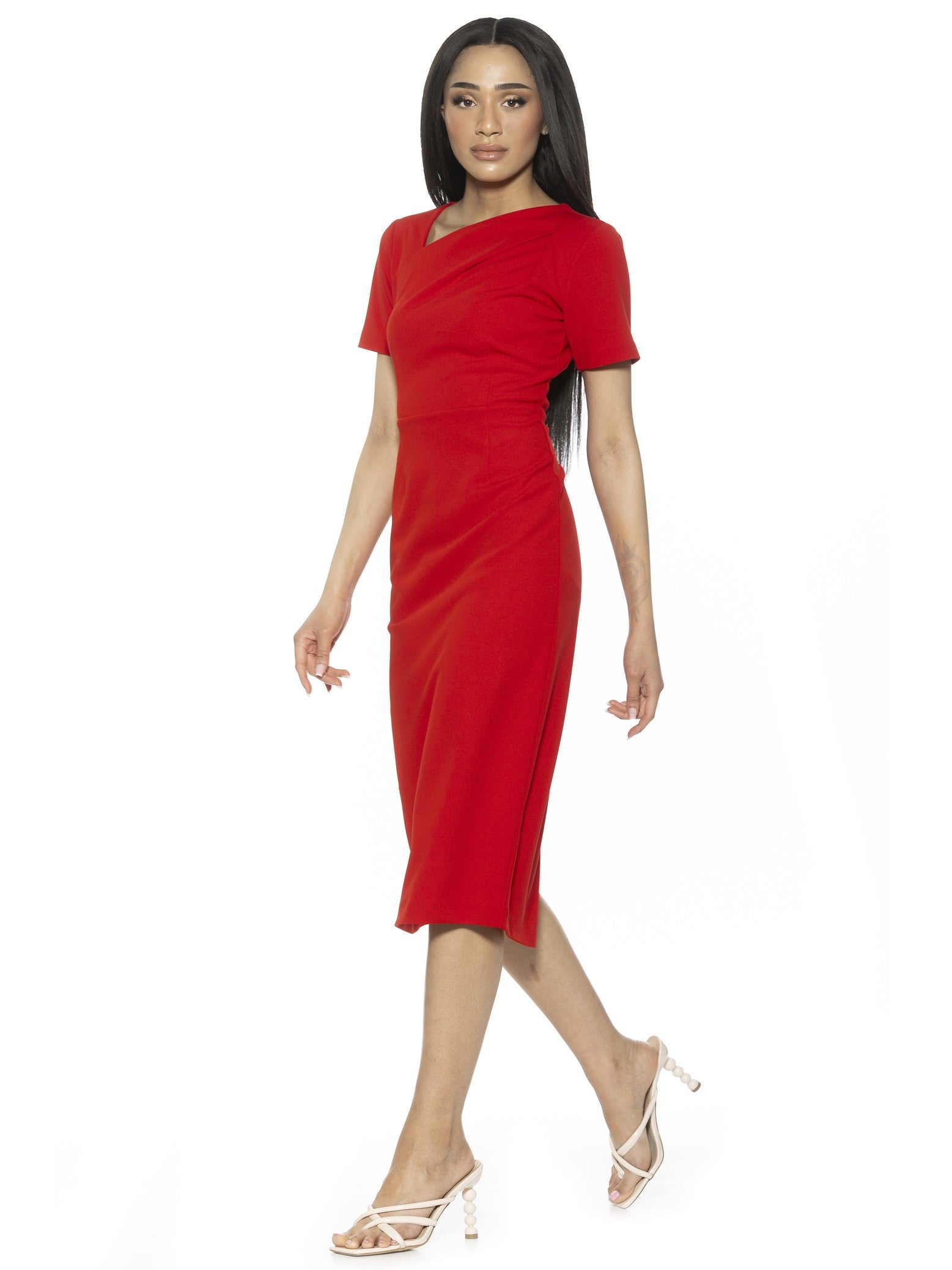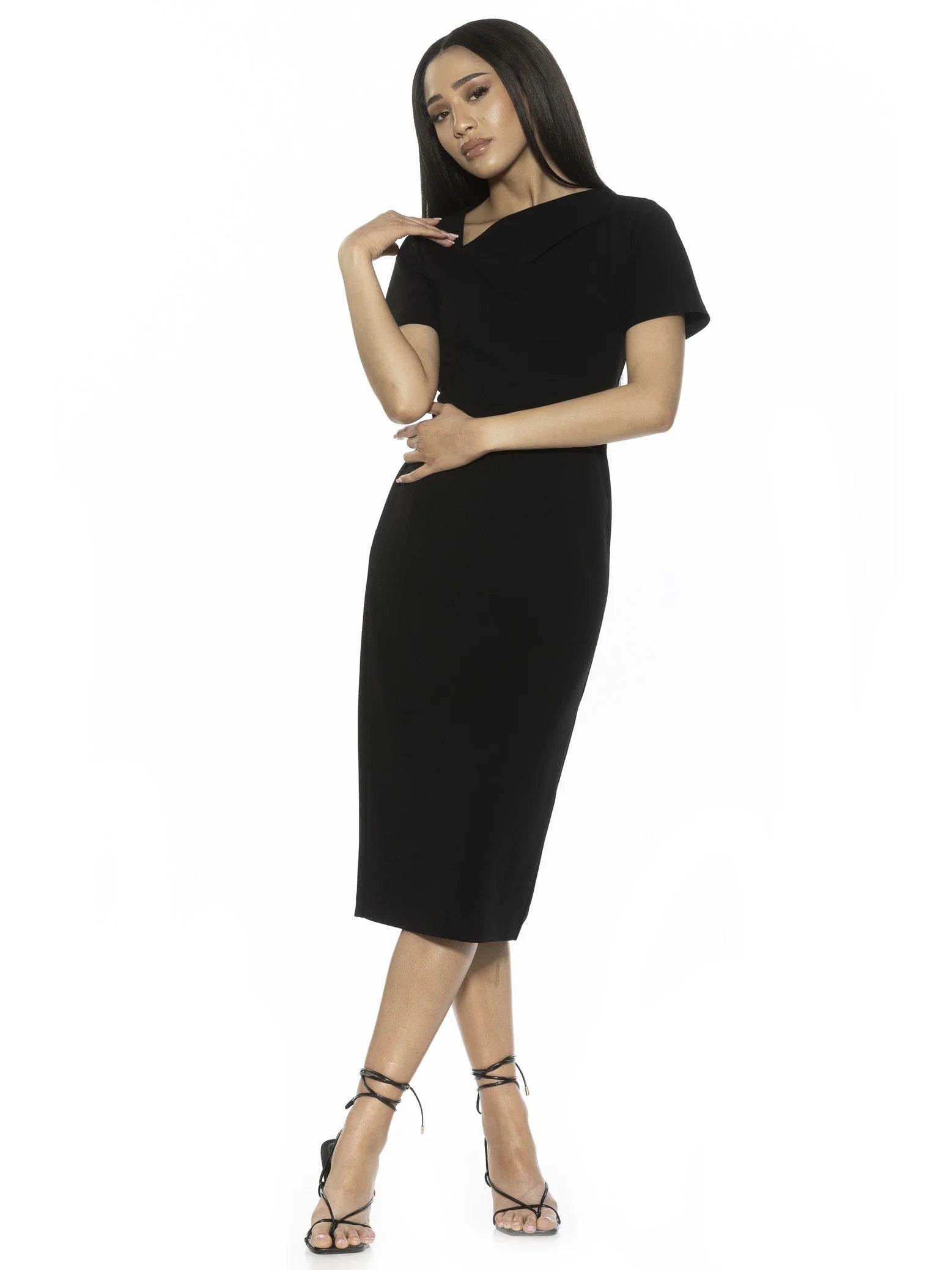 Indulge in elegance with the Angelica Dress. Boasting an asymmetrical neckline and short sleeves, this midi dress exudes sophistication and flair. Perfect for any occasion, it's a must-have for any wardrobe.