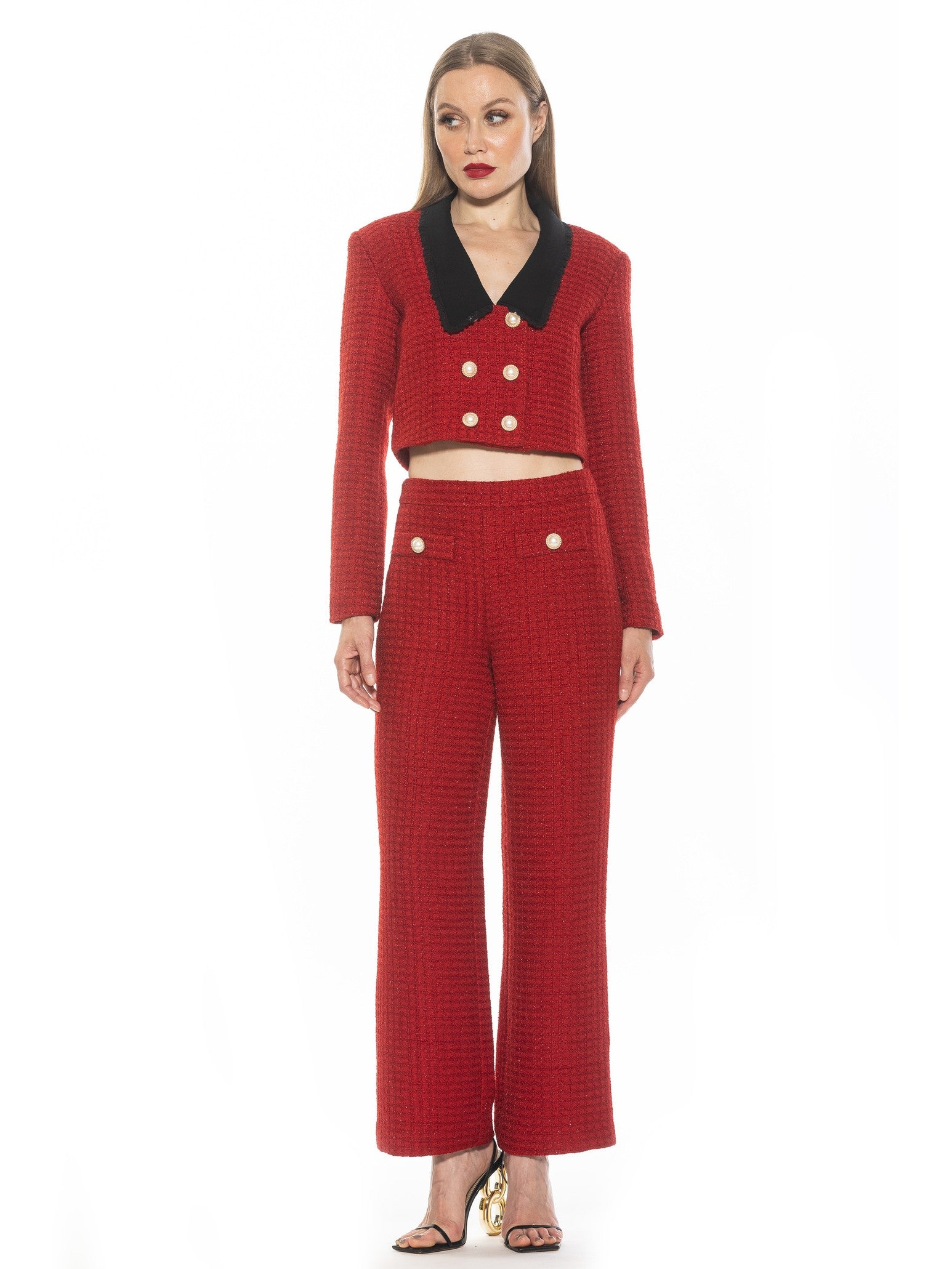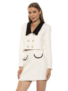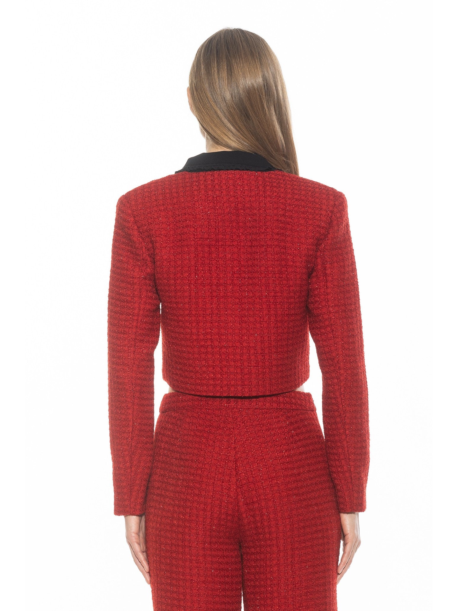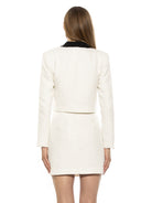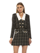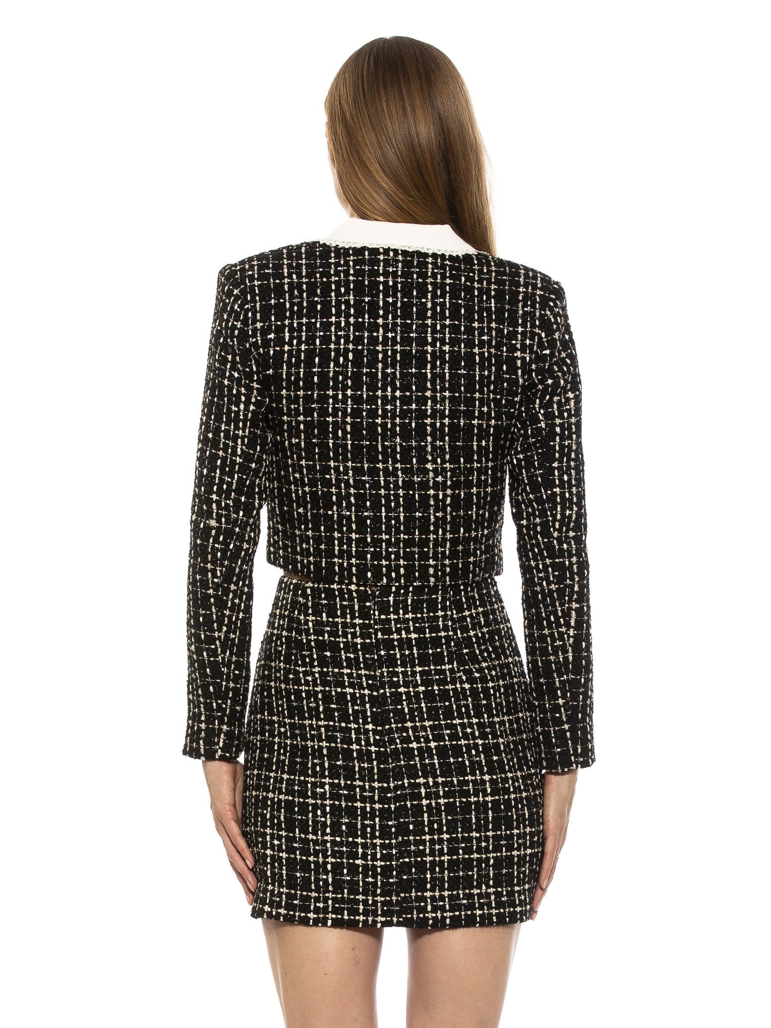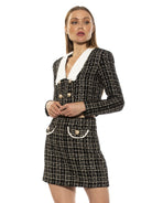 Introducing the Aurelia Jacket – a timeless piece crafted with luxury and sophistication in mind. Made with a premium tweed material, this cropped jacket is detailed with pearl buttons and a contrast collar, adding an effortless chic to your look. Slip into elegance and make a stylish statement.