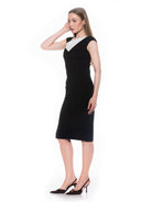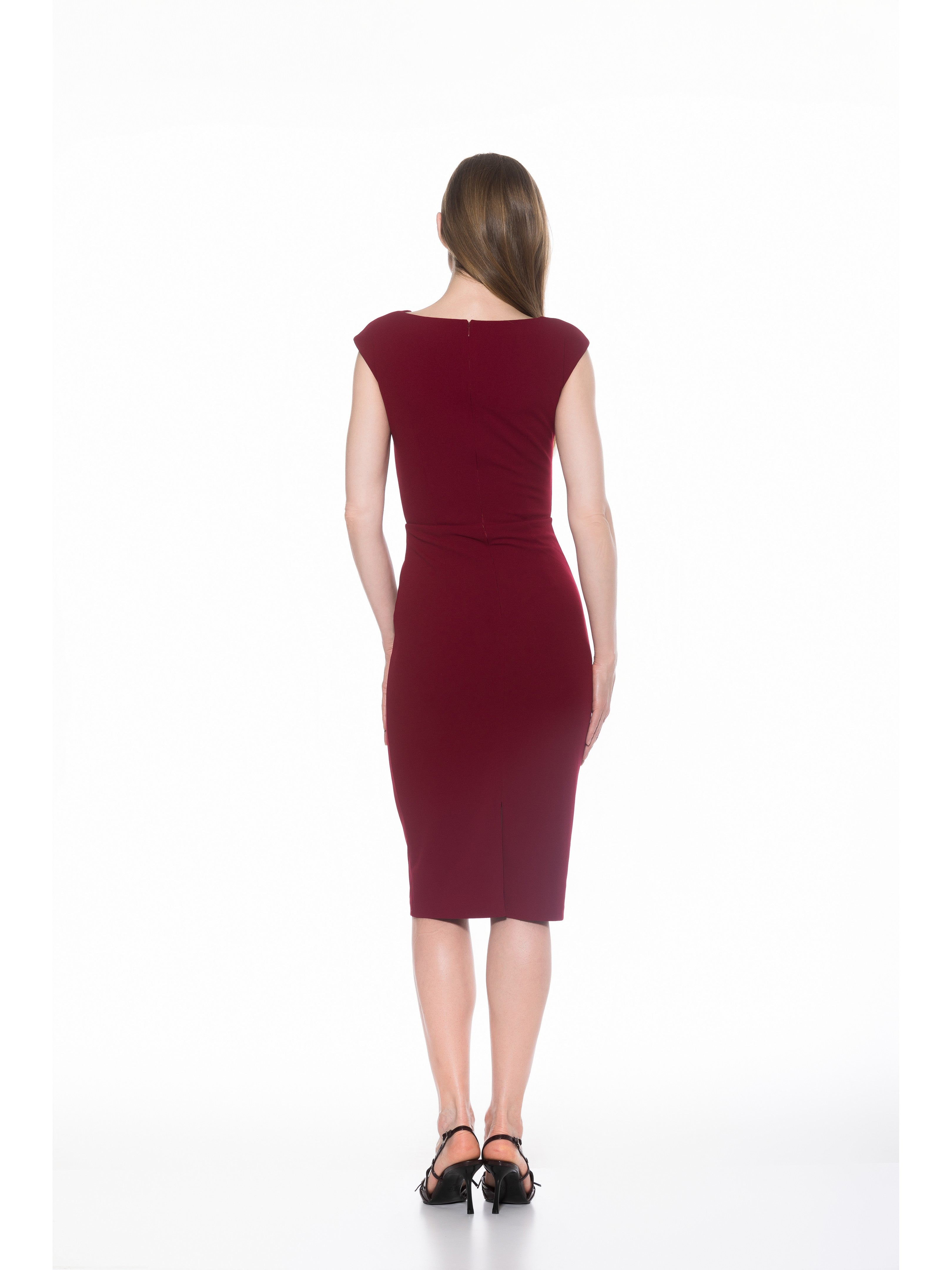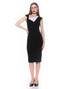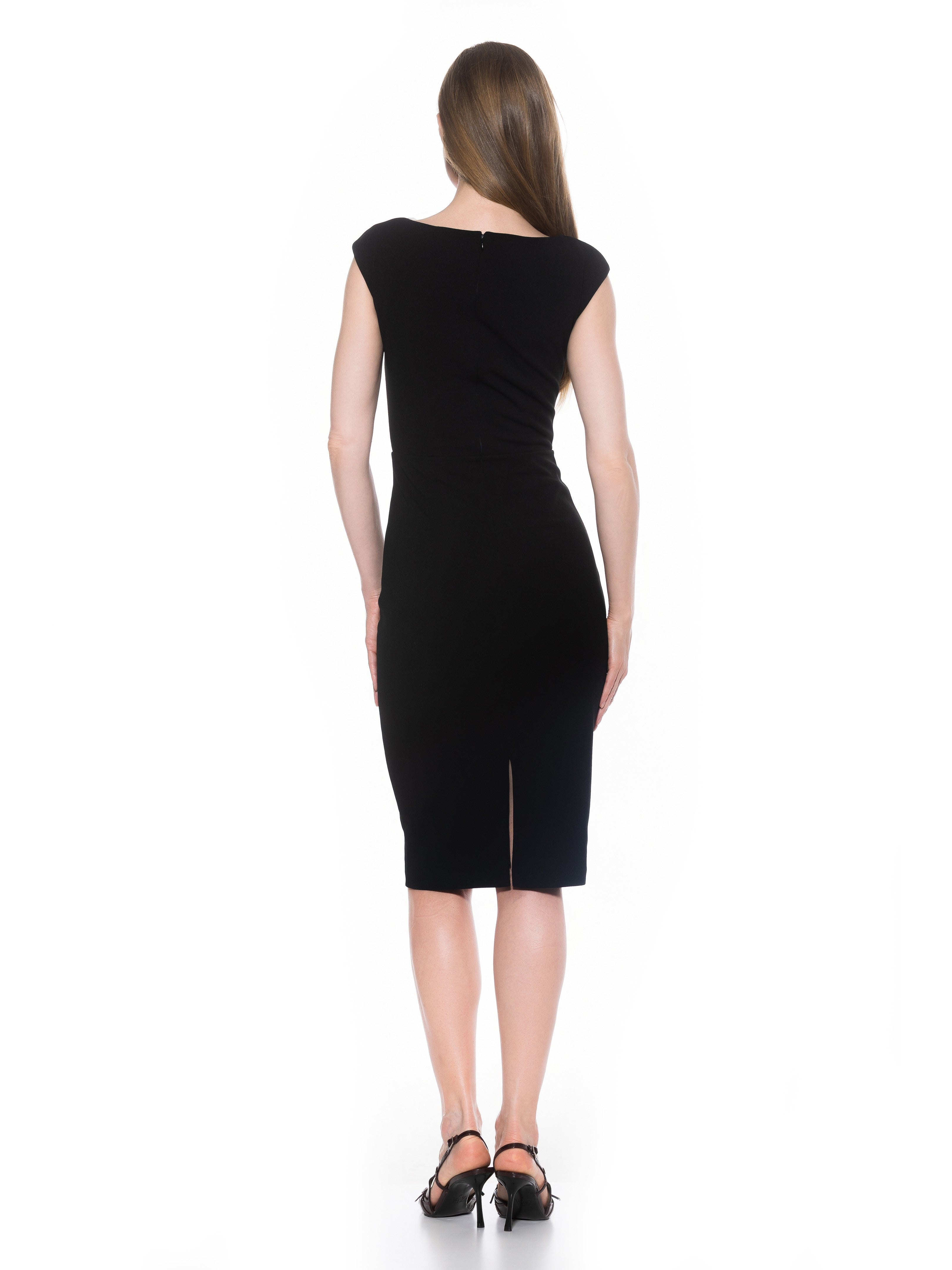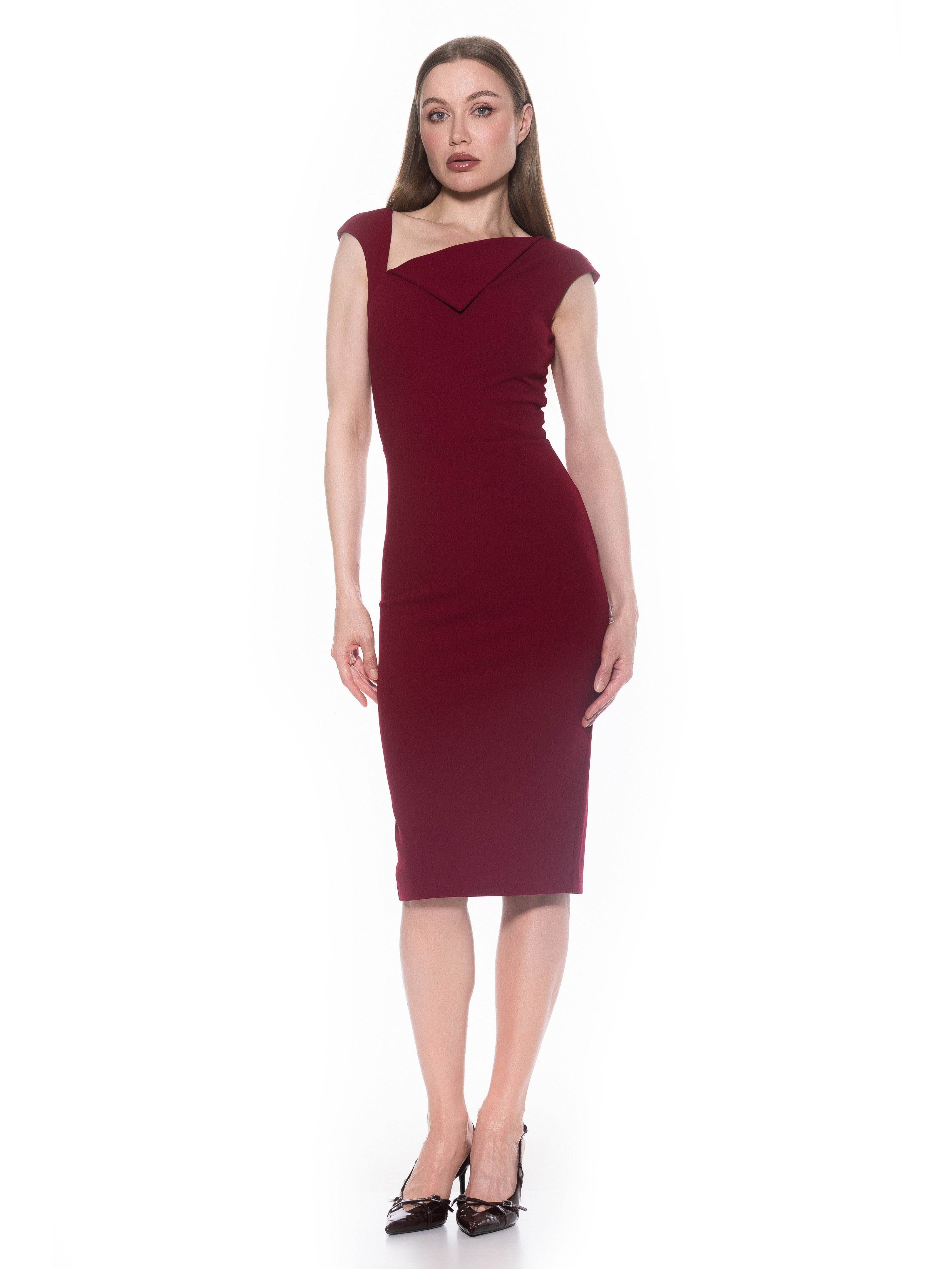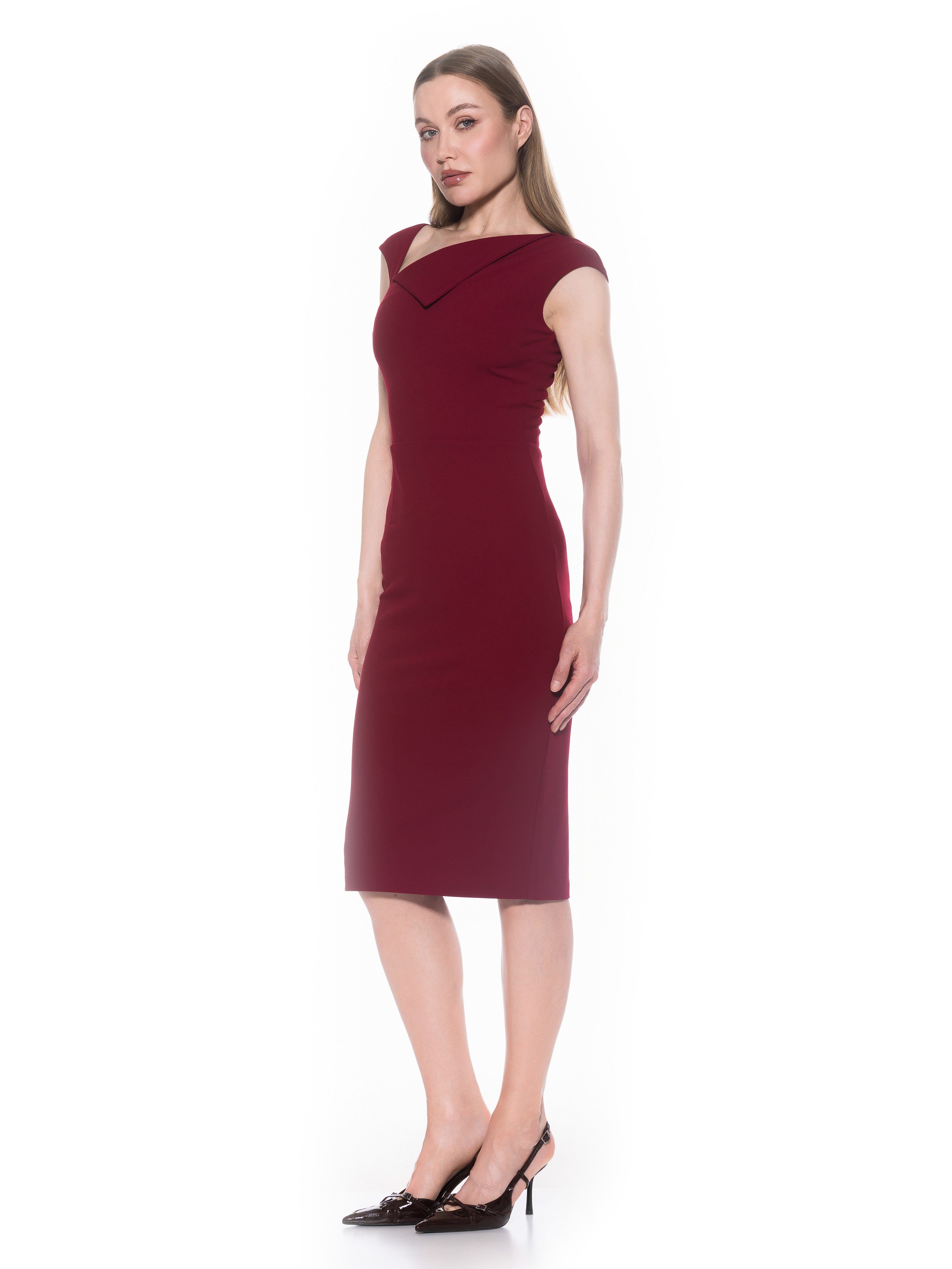 The Destiny Midi Sheath Dress With Asymmetric Neckline Is A Must Have For Your Wardrobe. This Dress Features Asymmetric Neckline, Short Sleeves, And Fitted Sheath Body. This Dress Fits True To Size.