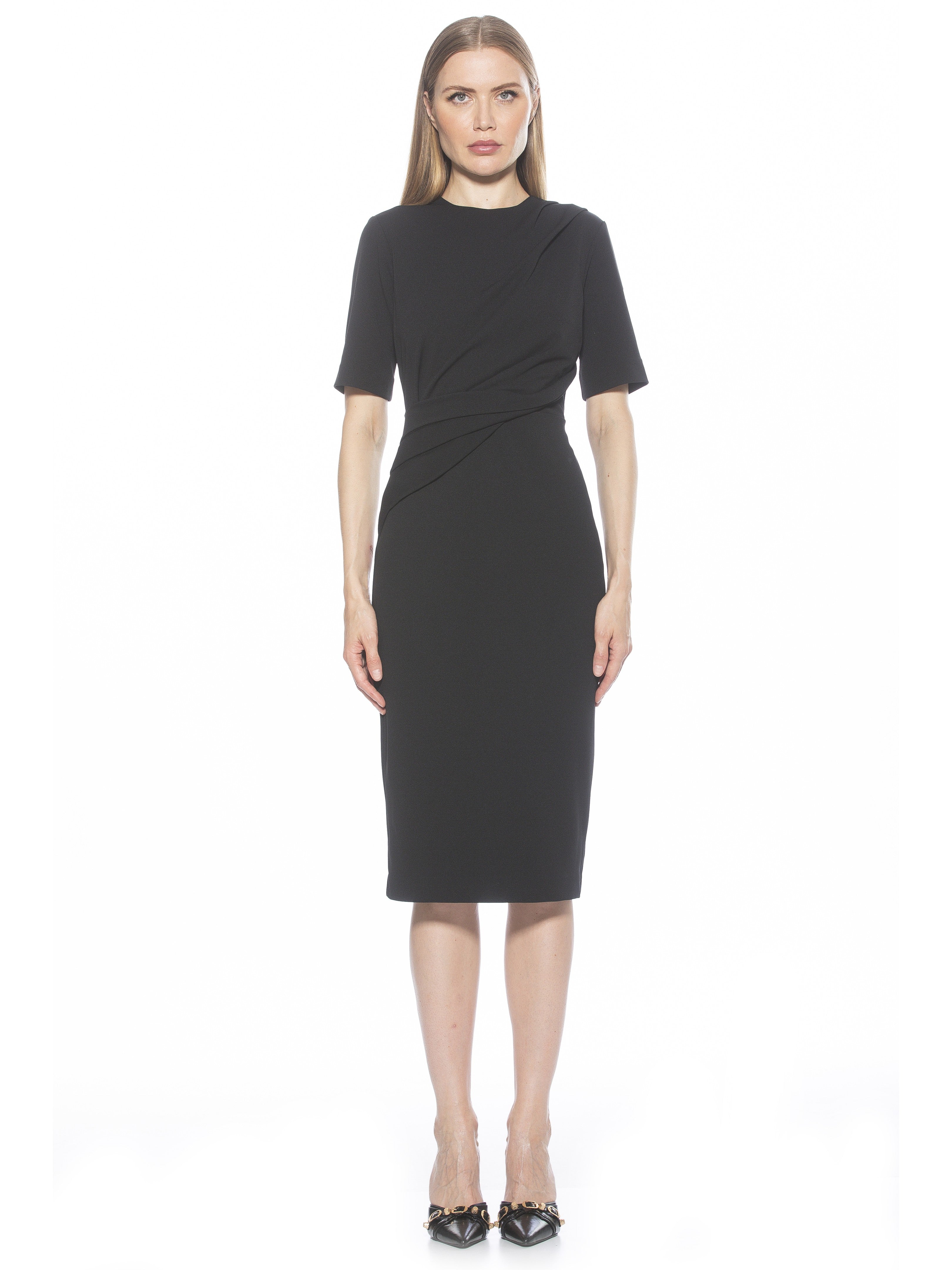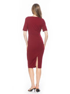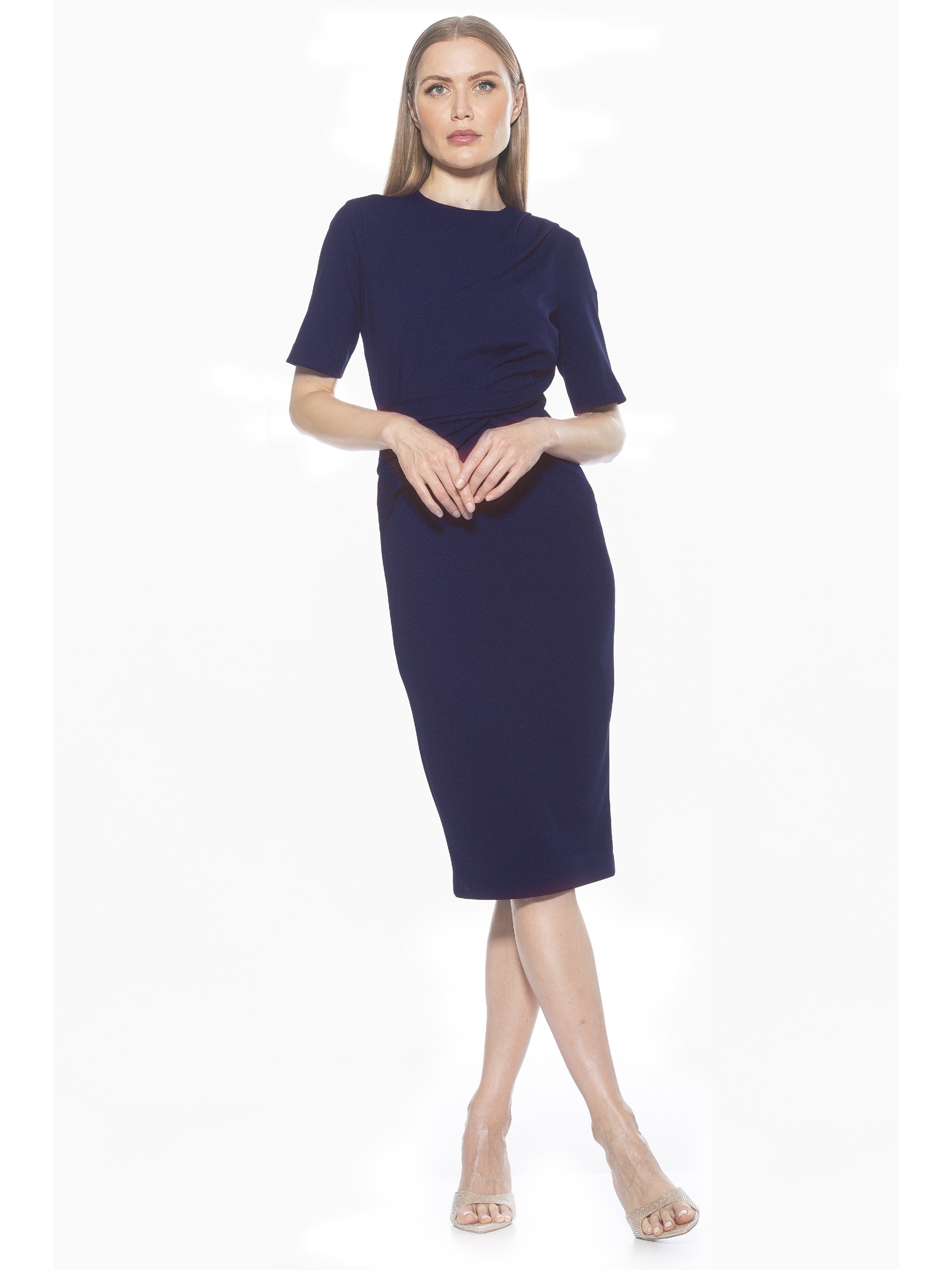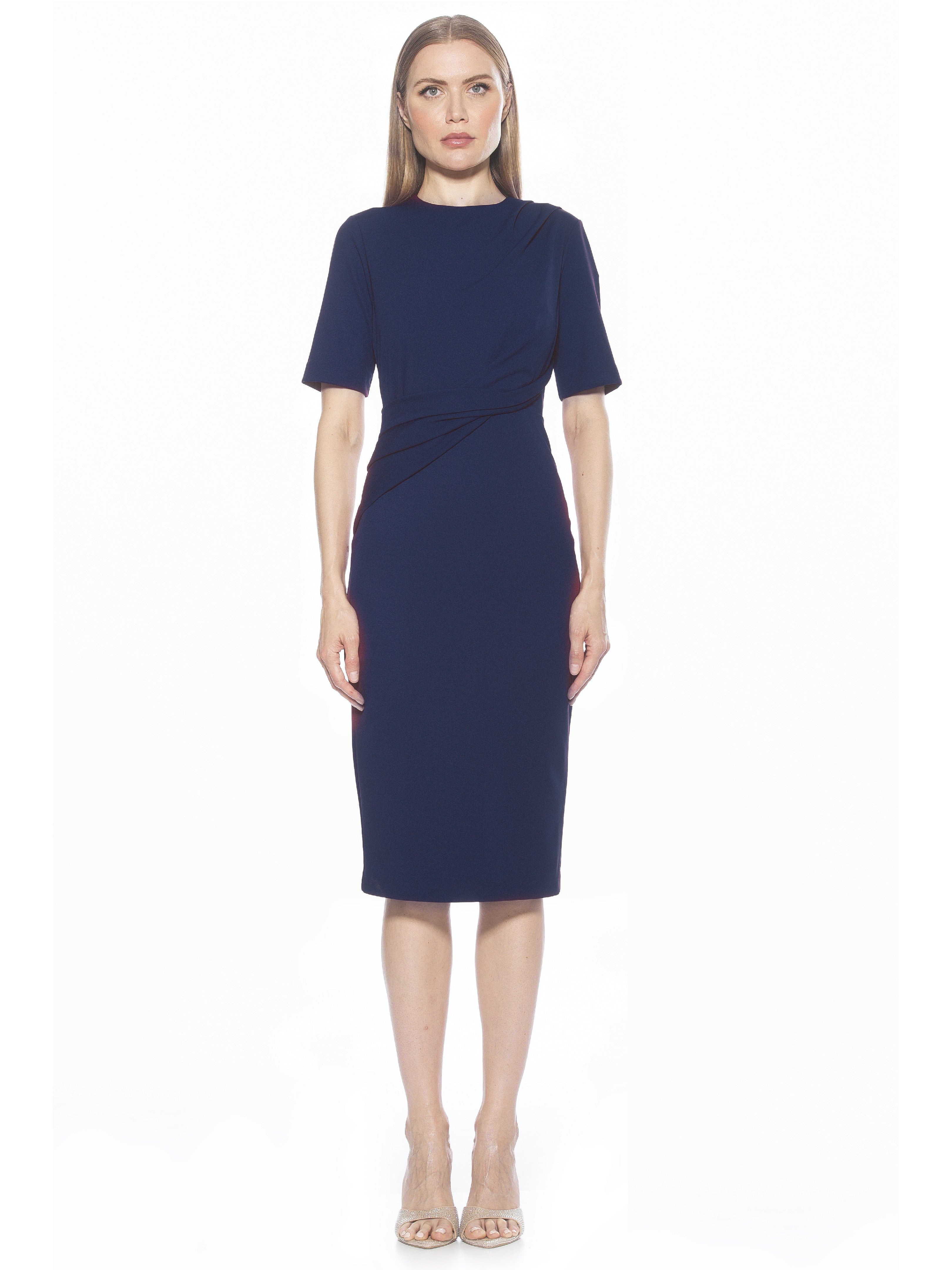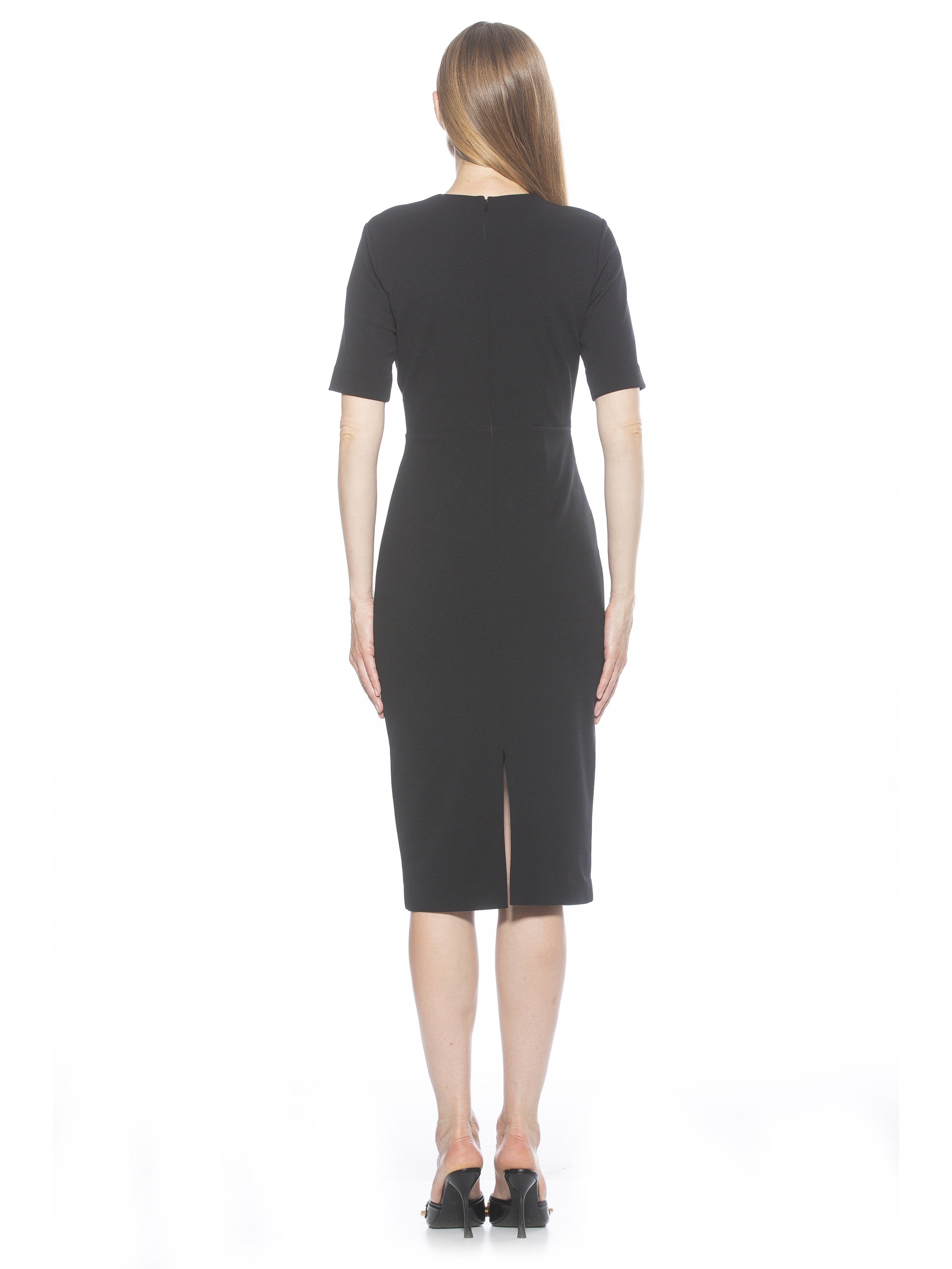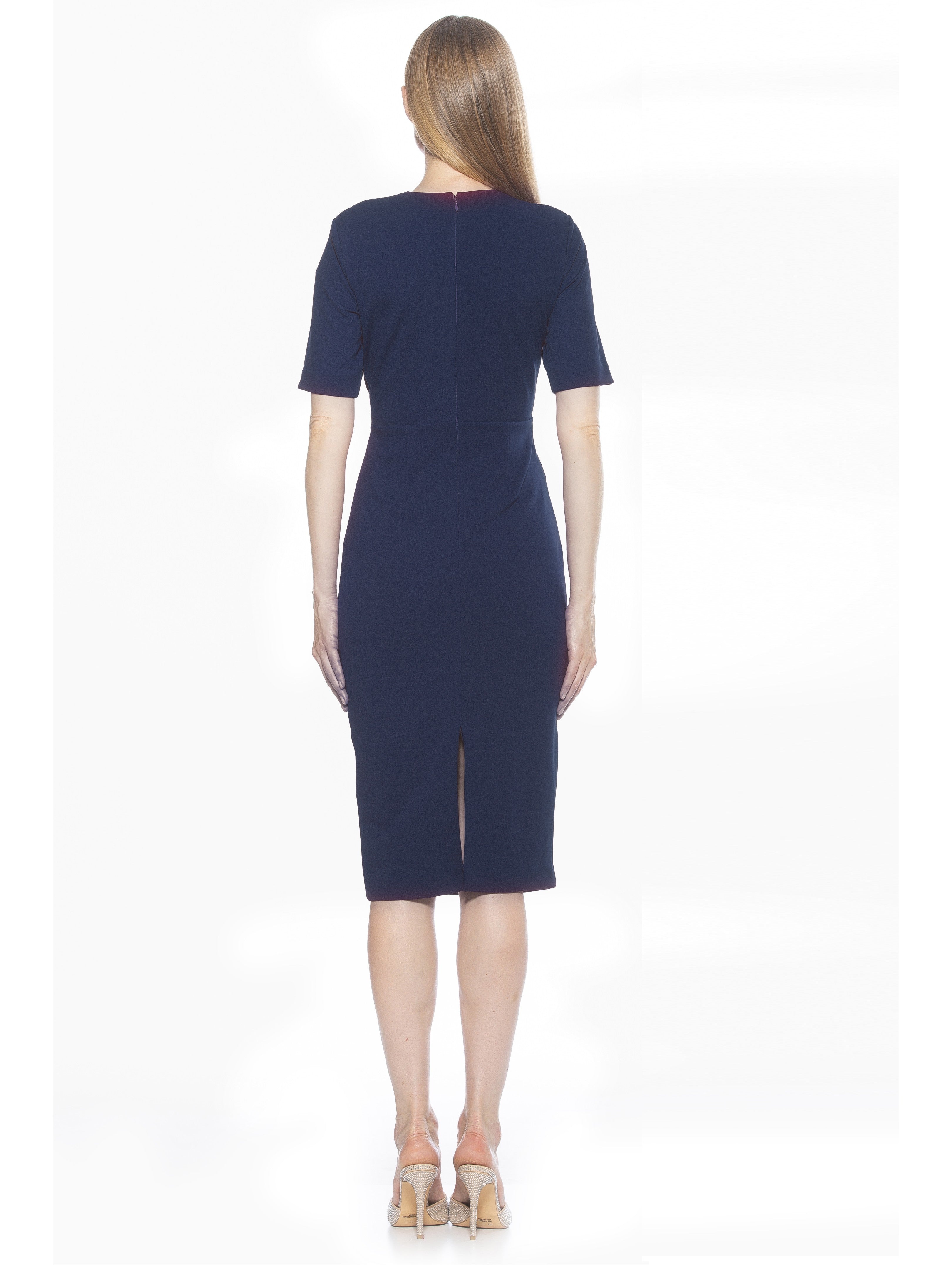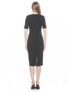 Introducing the Harper Dress, a sophisticated, knee-length cocktail dress. This tasteful garment combines a classic crew neck look with sleek short sleeves, providing the perfect workwear dress.