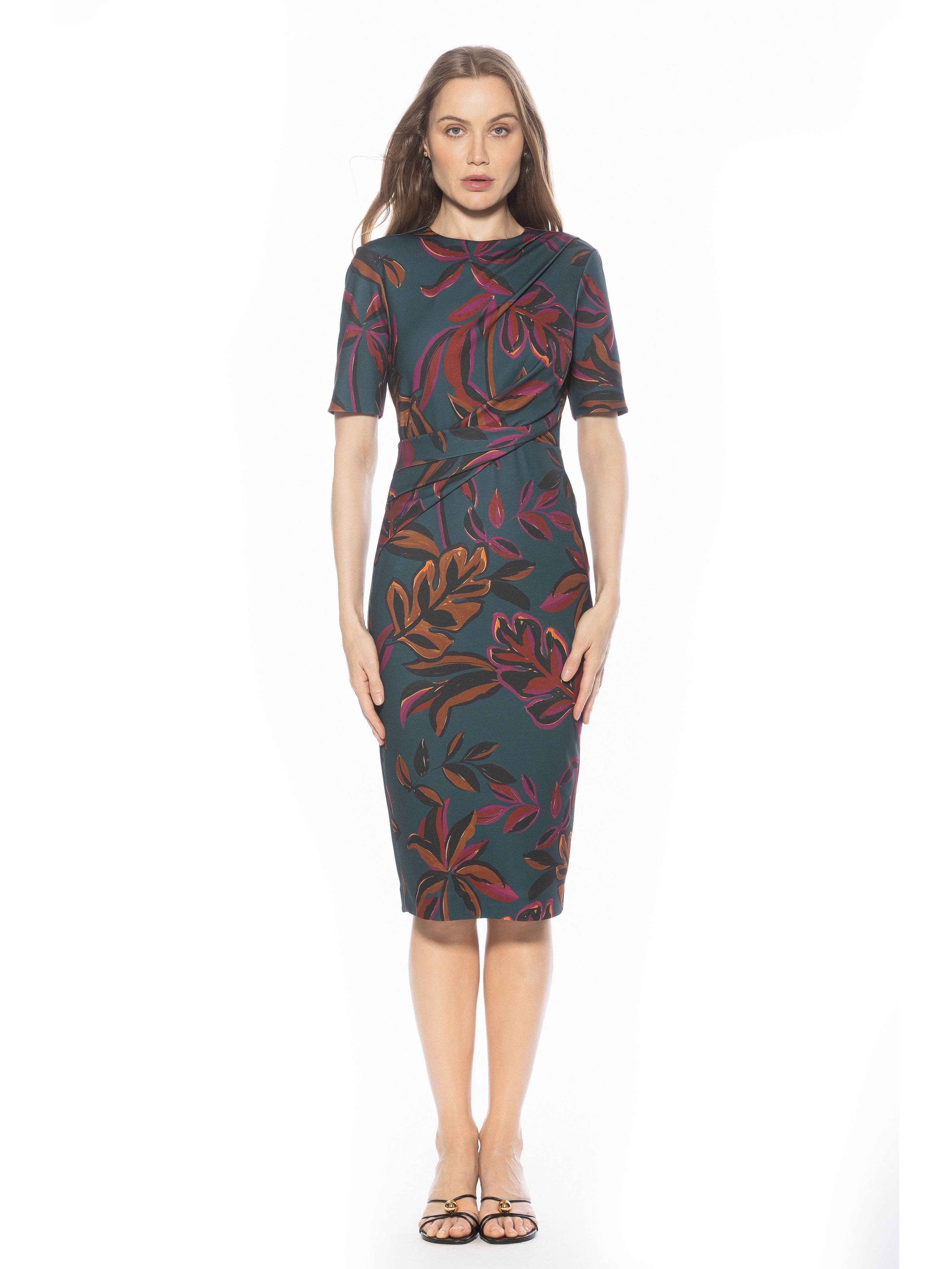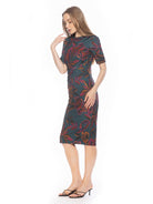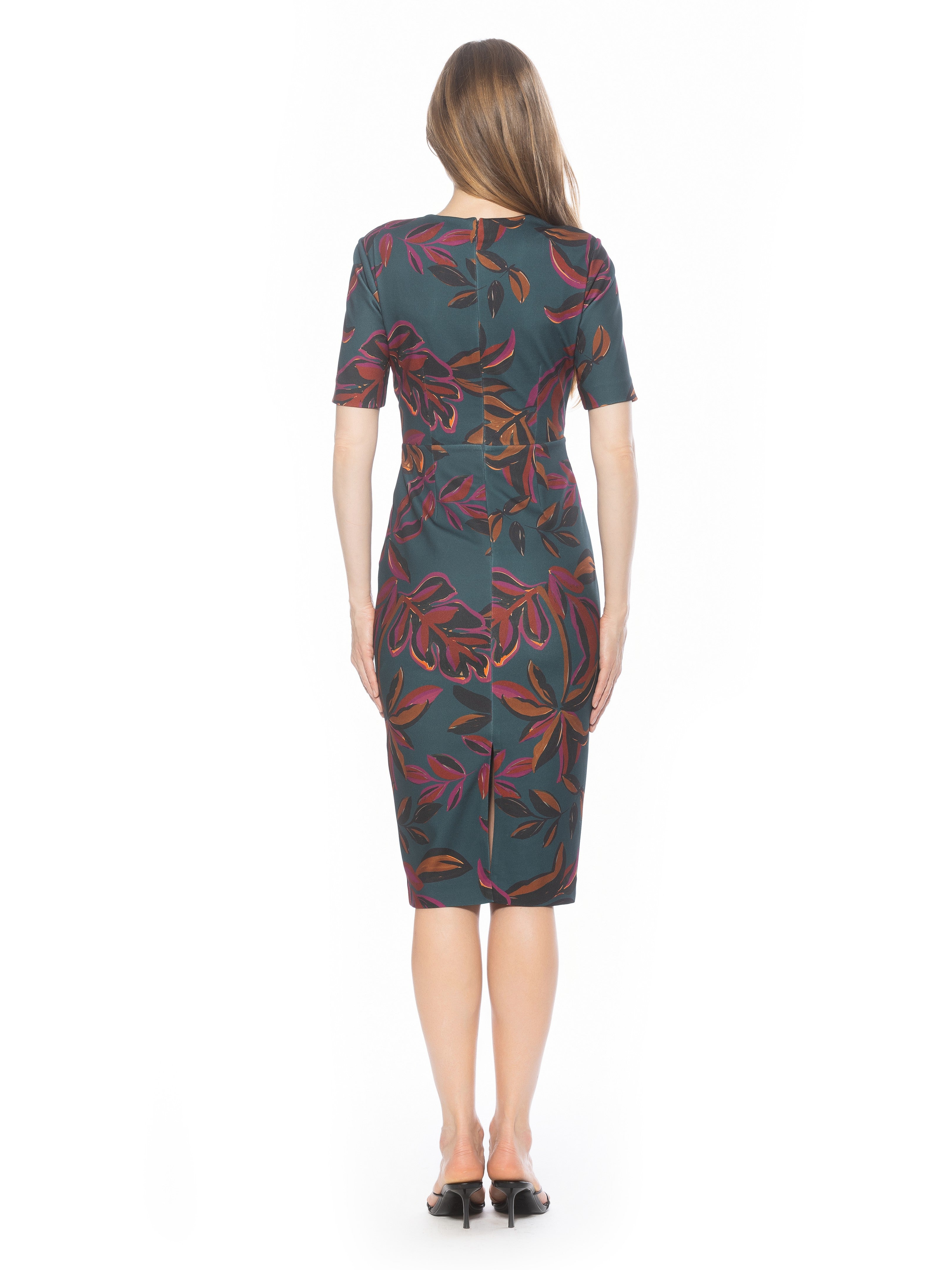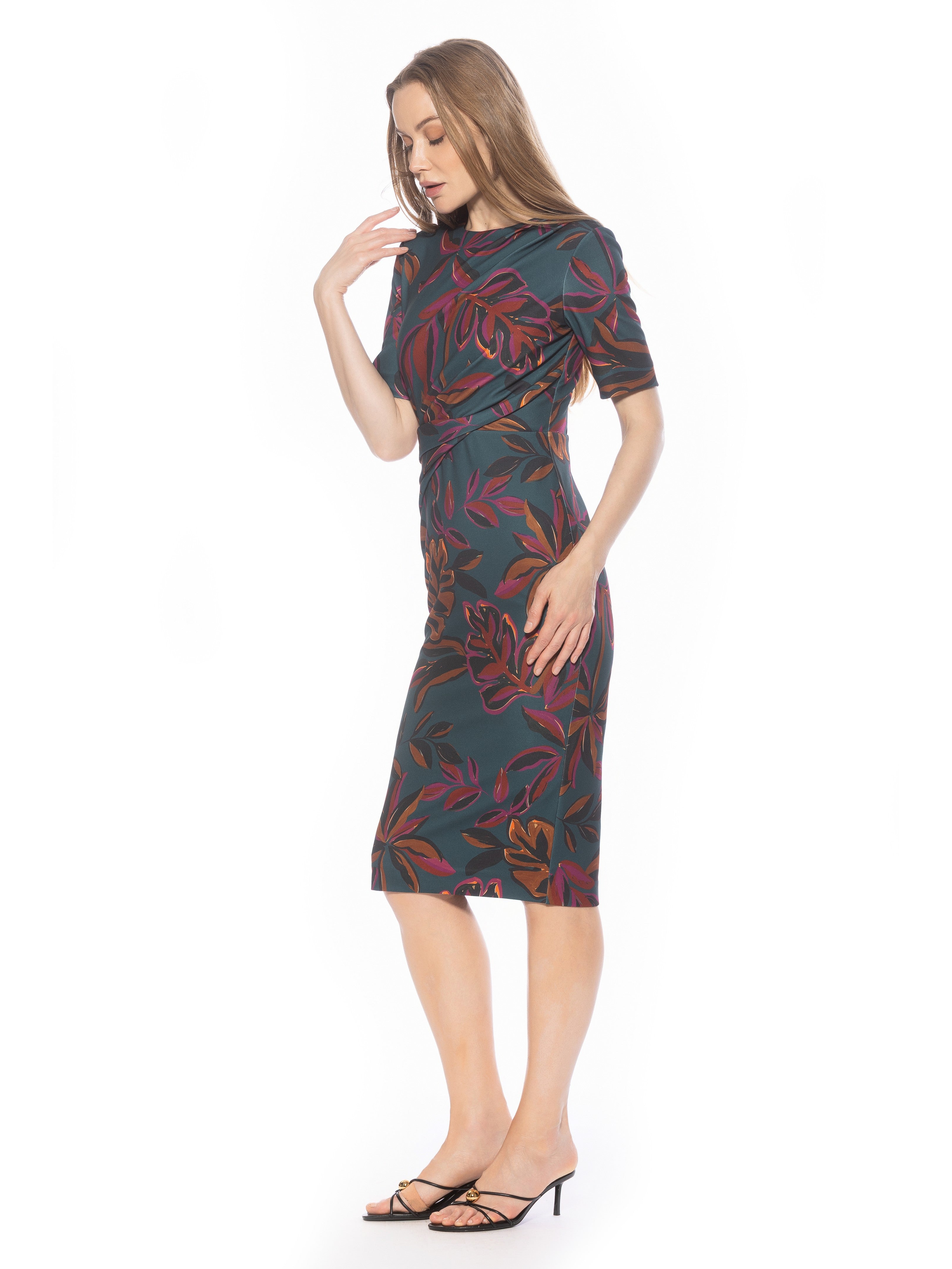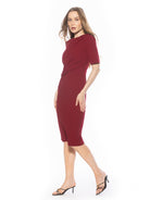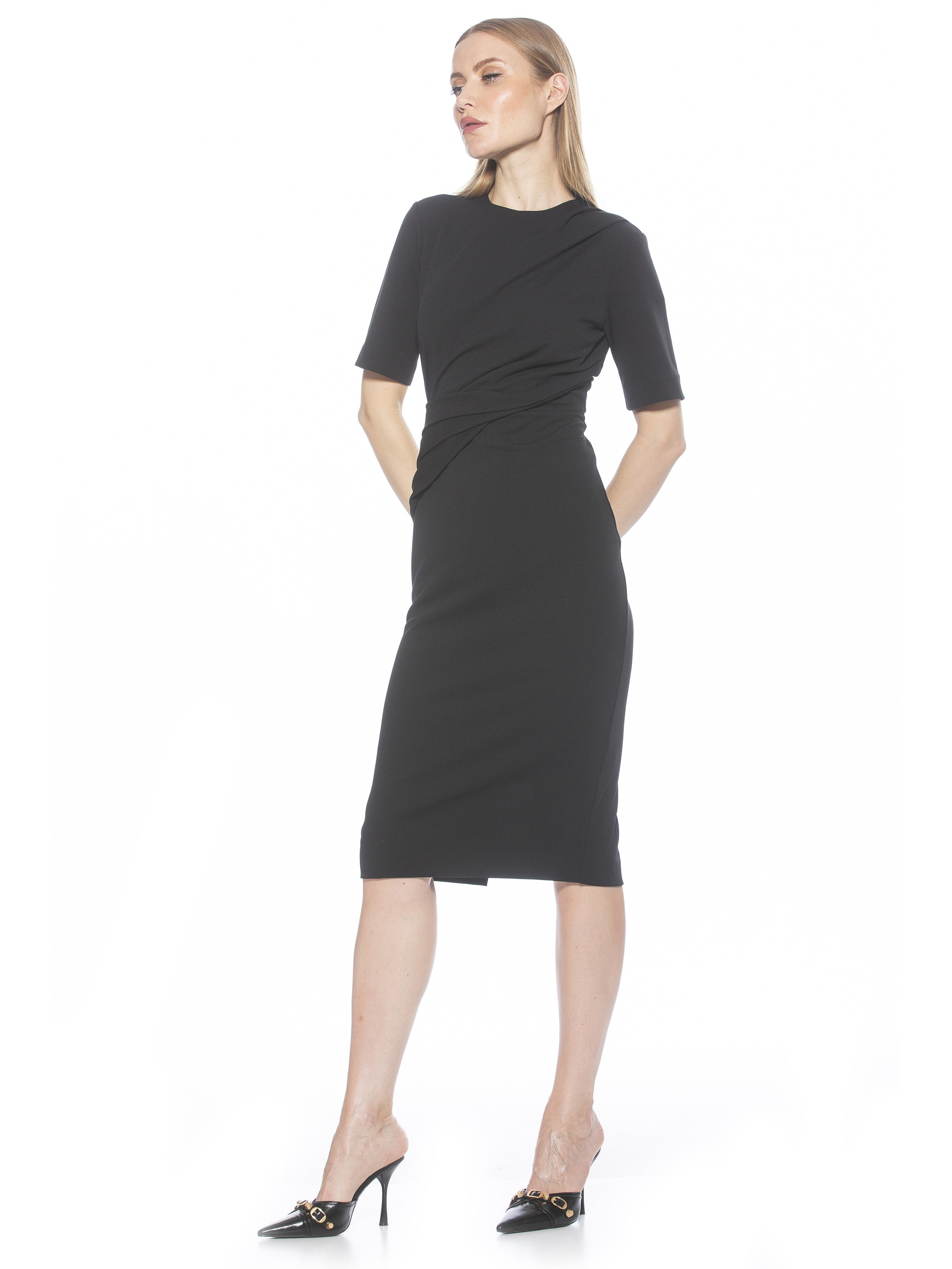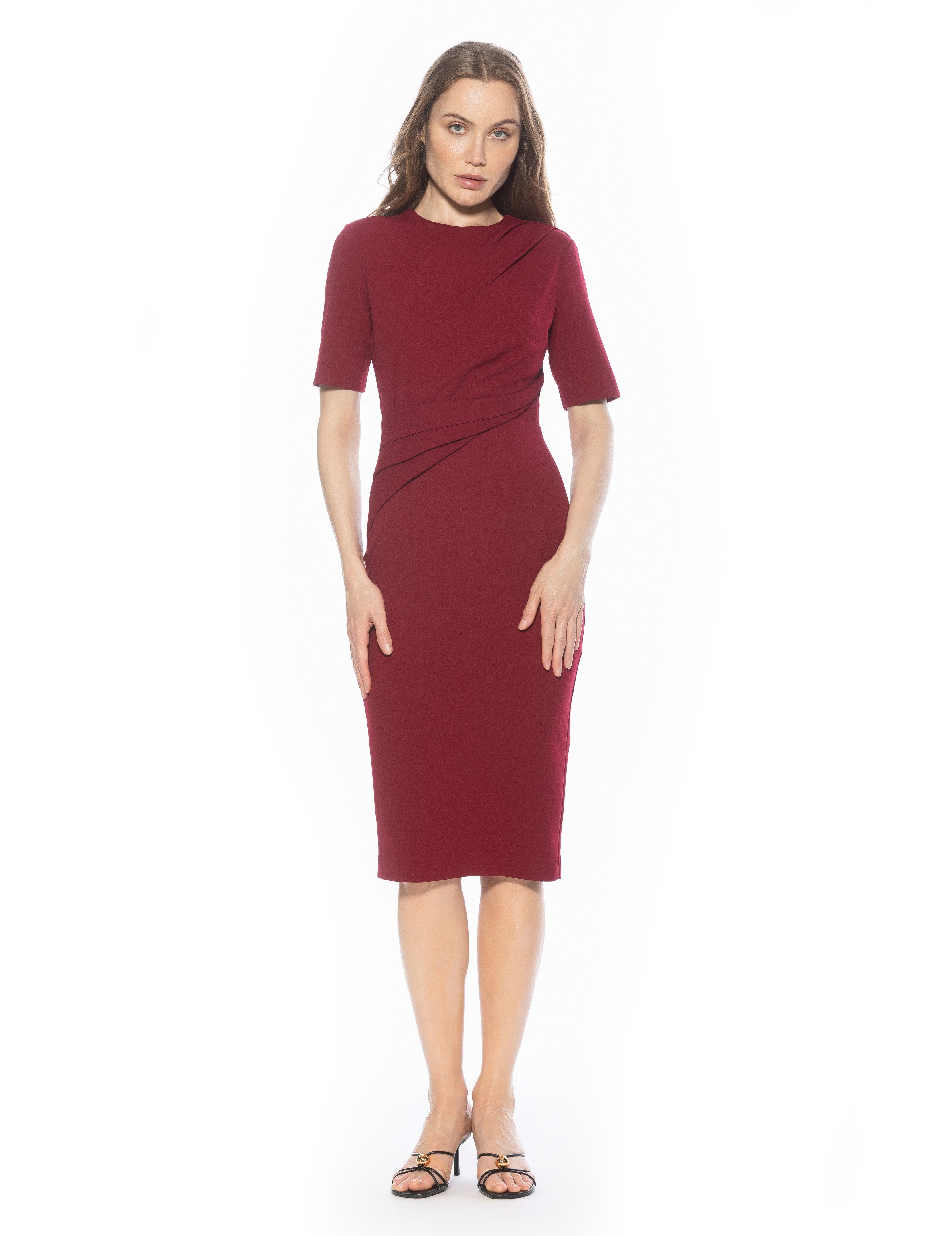 Introducing the Harper Dress, a sophisticated, knee-length cocktail dress. This tasteful garment combines a classic crew neck look with sleek short sleeves, providing the perfect workwear dress.