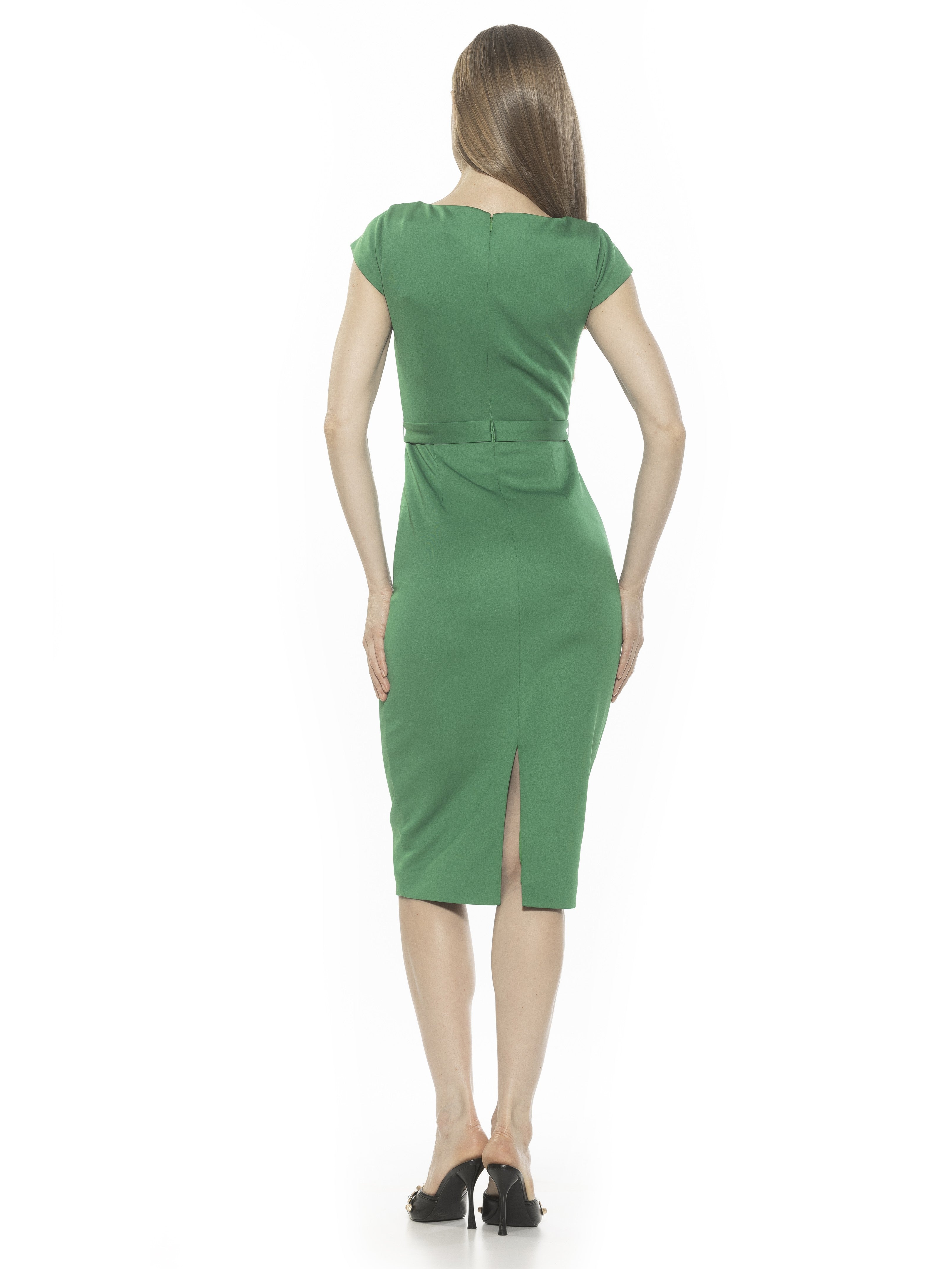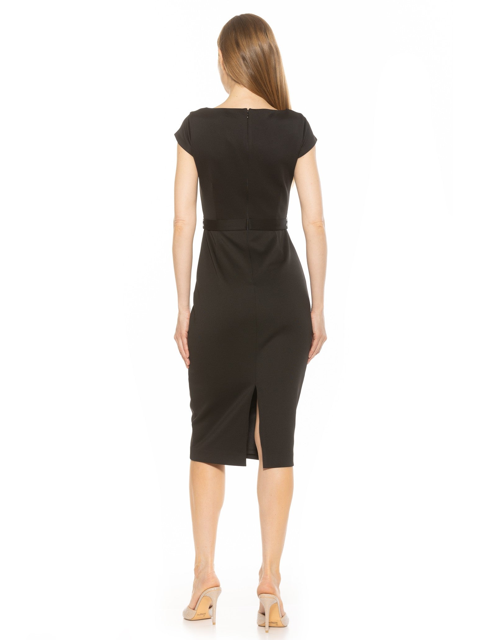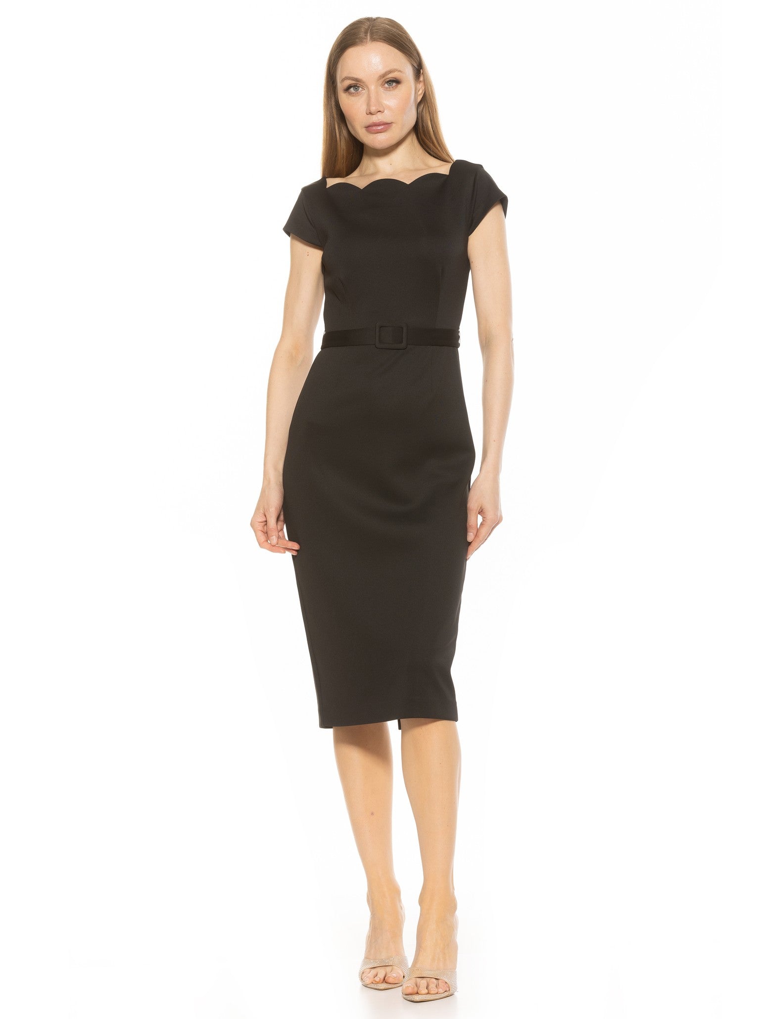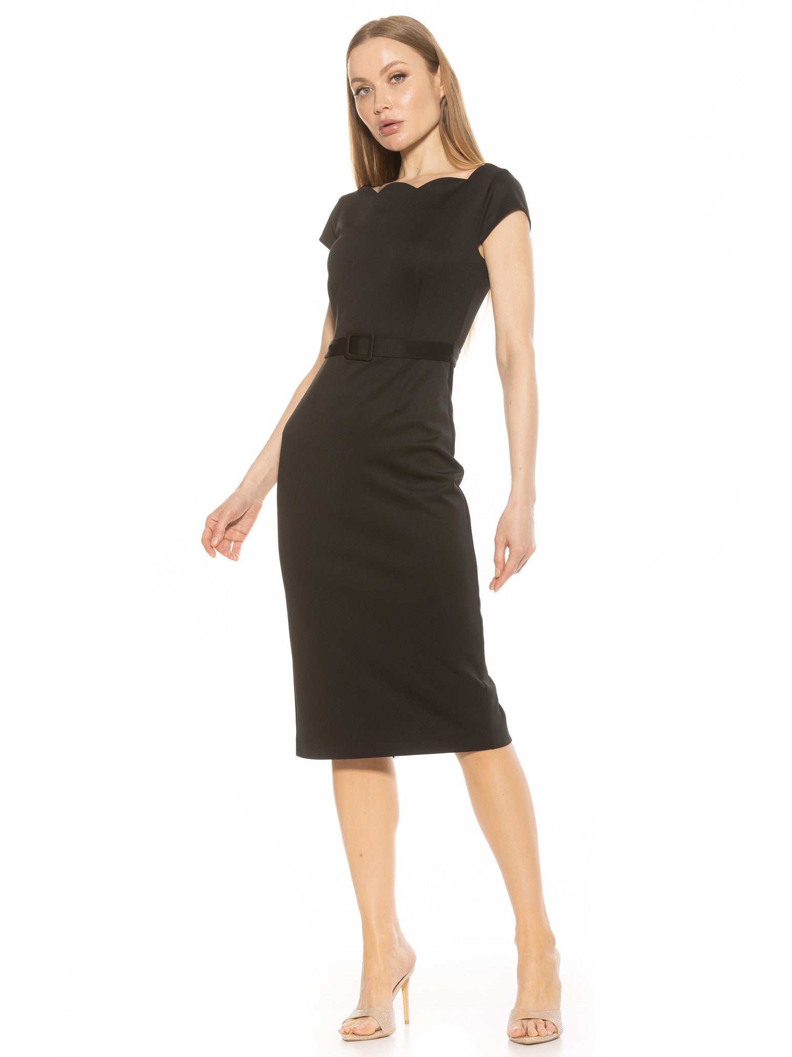 Indulge in the luxurious elegance of the Lavinia Dress. This sophisticated cocktail dress boasts a delicate boat scalloped neckline for a touch of femininity. The front belt cinches your waist, creating a flattering silhouette, while the cap sleeves add a tasteful touch. Elevate your style and make a statement with this exclusive piece.