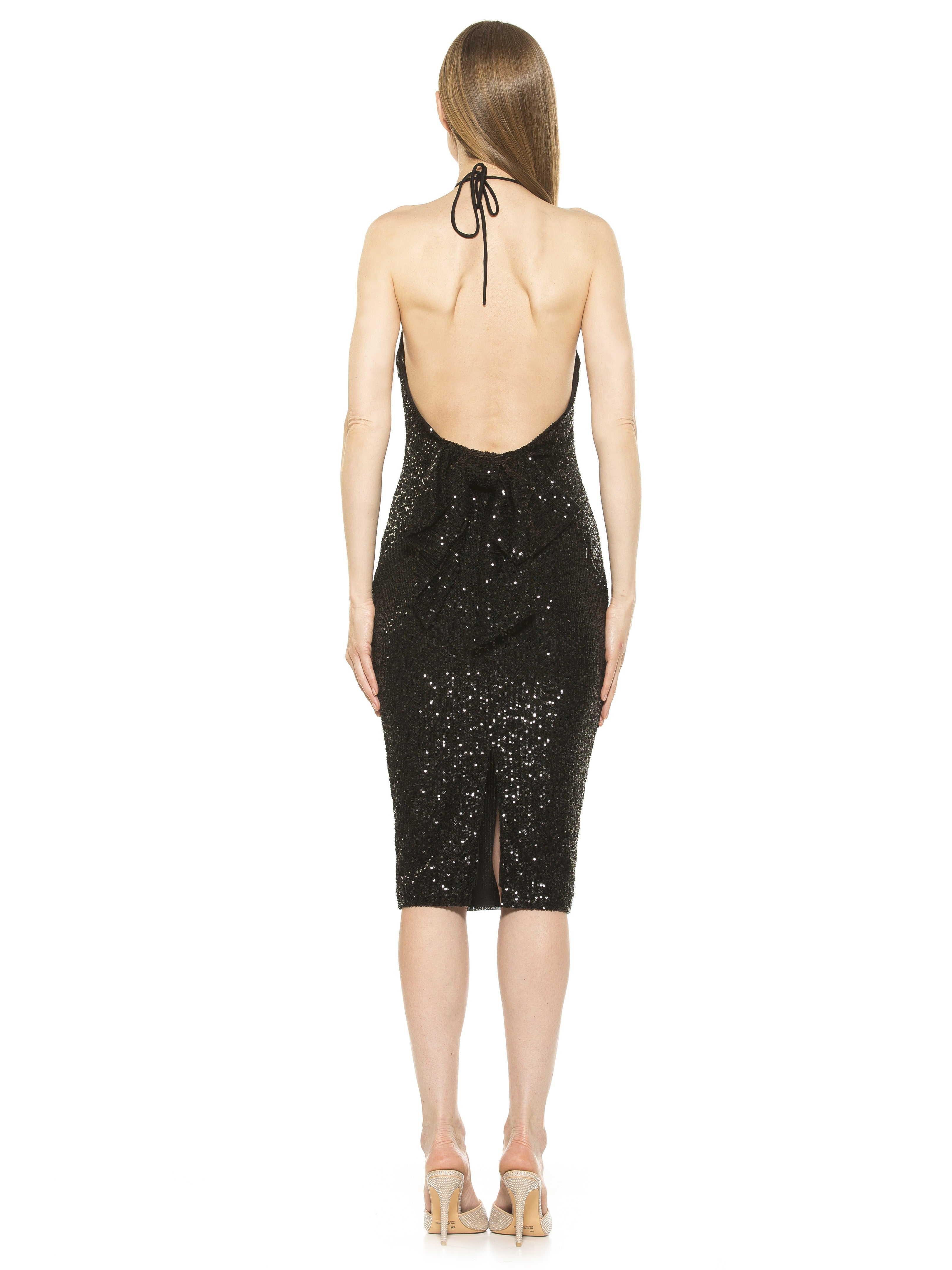 Experience the grandeur of the Letitia Dress, graced with a halter neckline, bow on the back, and dazzling sequin accents. Its luxurious design is made complete with a backless fit, creating a truly exclusive aesthetic. Choose this statement piece for an unforgettable look.