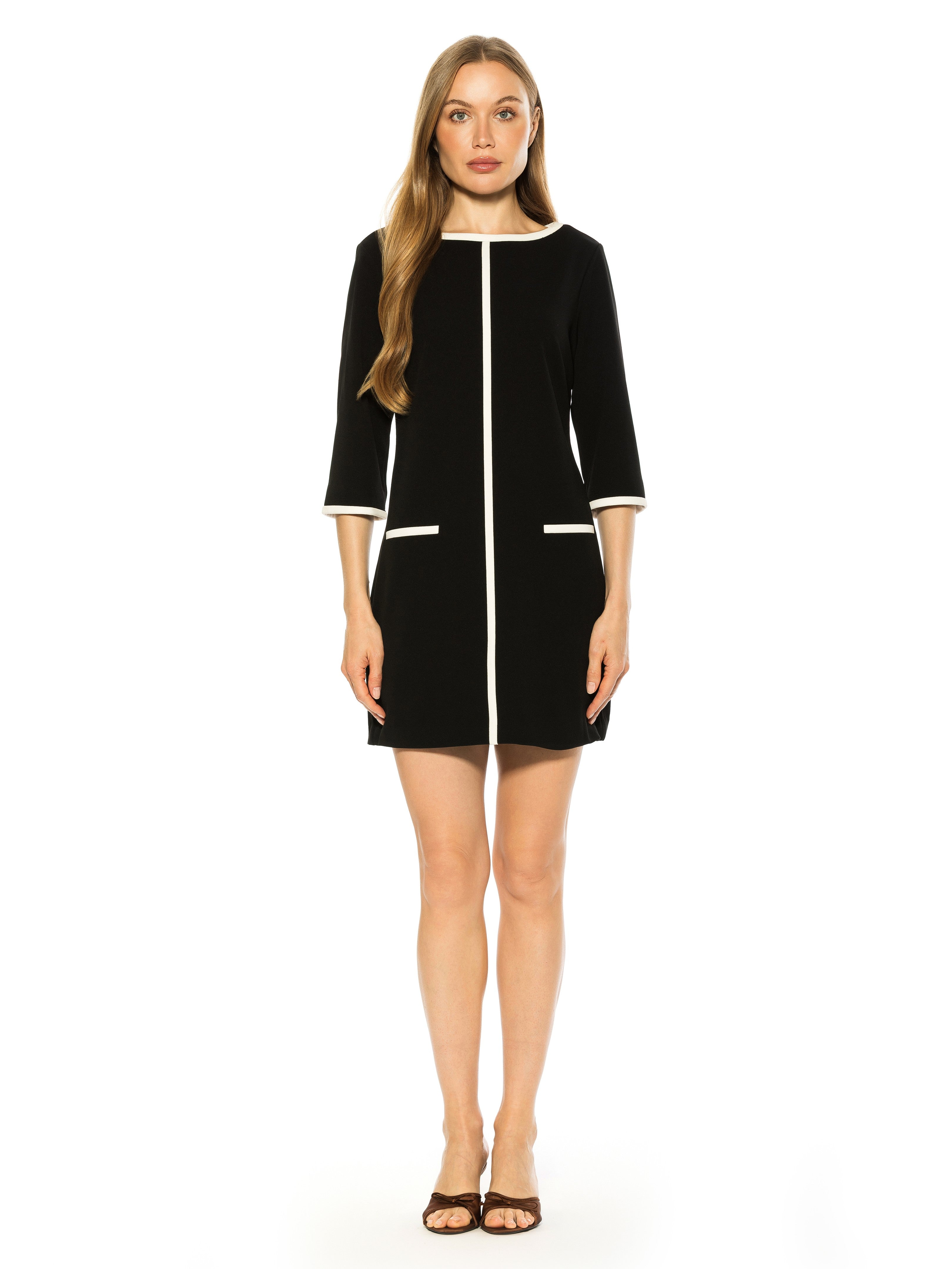 The Liora Boatneck Shift Dress With 3/4” Sleeves Is A Must Have For Your Closet. This Dress Features Boatneck Neckline, 3/4" Sleeves, Shift Body, And Contrast Piping Detail. This Dress Fits True To Size.
