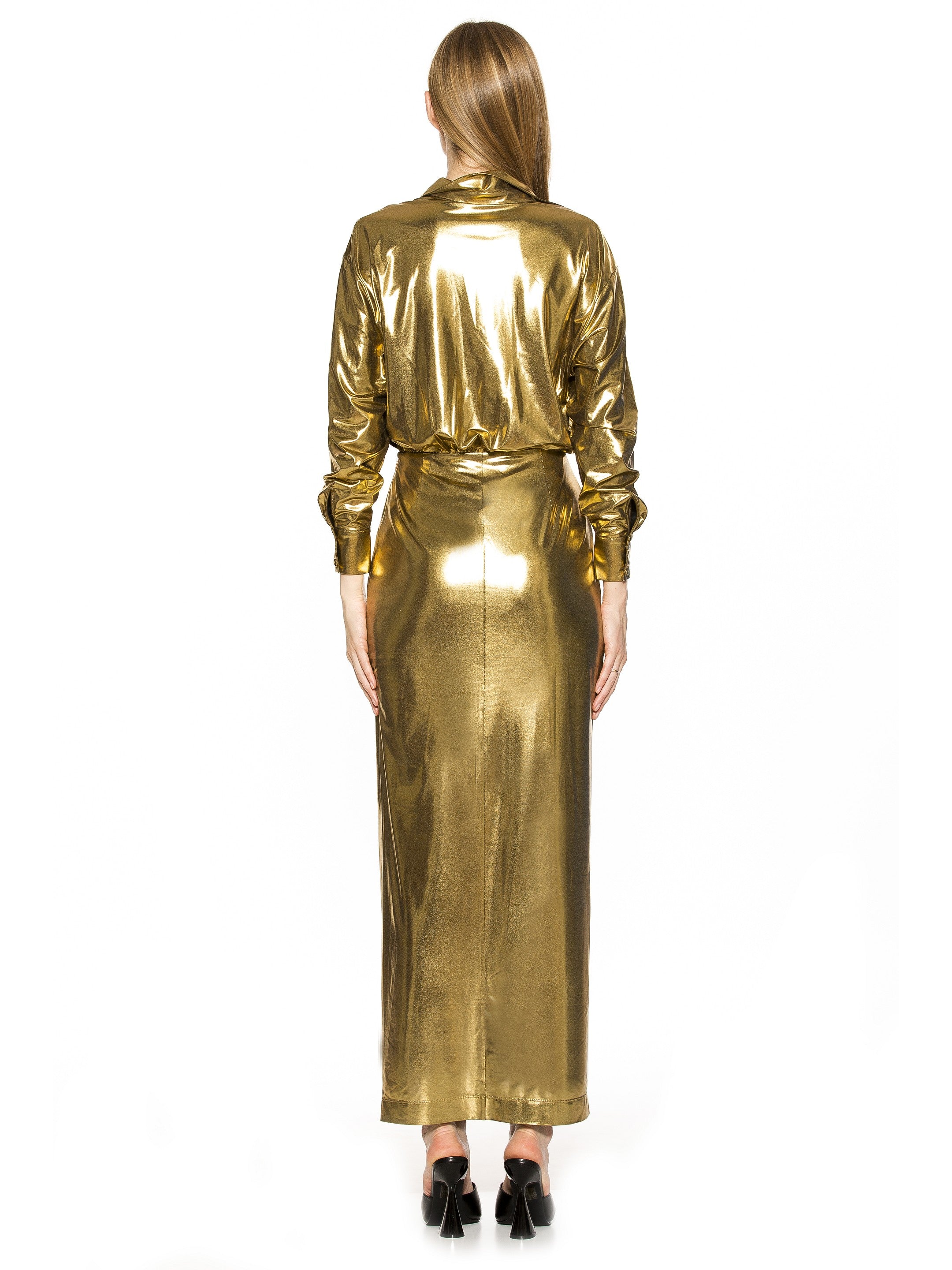 The Rae long sleeve button down maxi dress is a must have piece for your wardrobe. This style features front button down detail, maxi sheath skirt with side slit and luxe high shine gold fabric