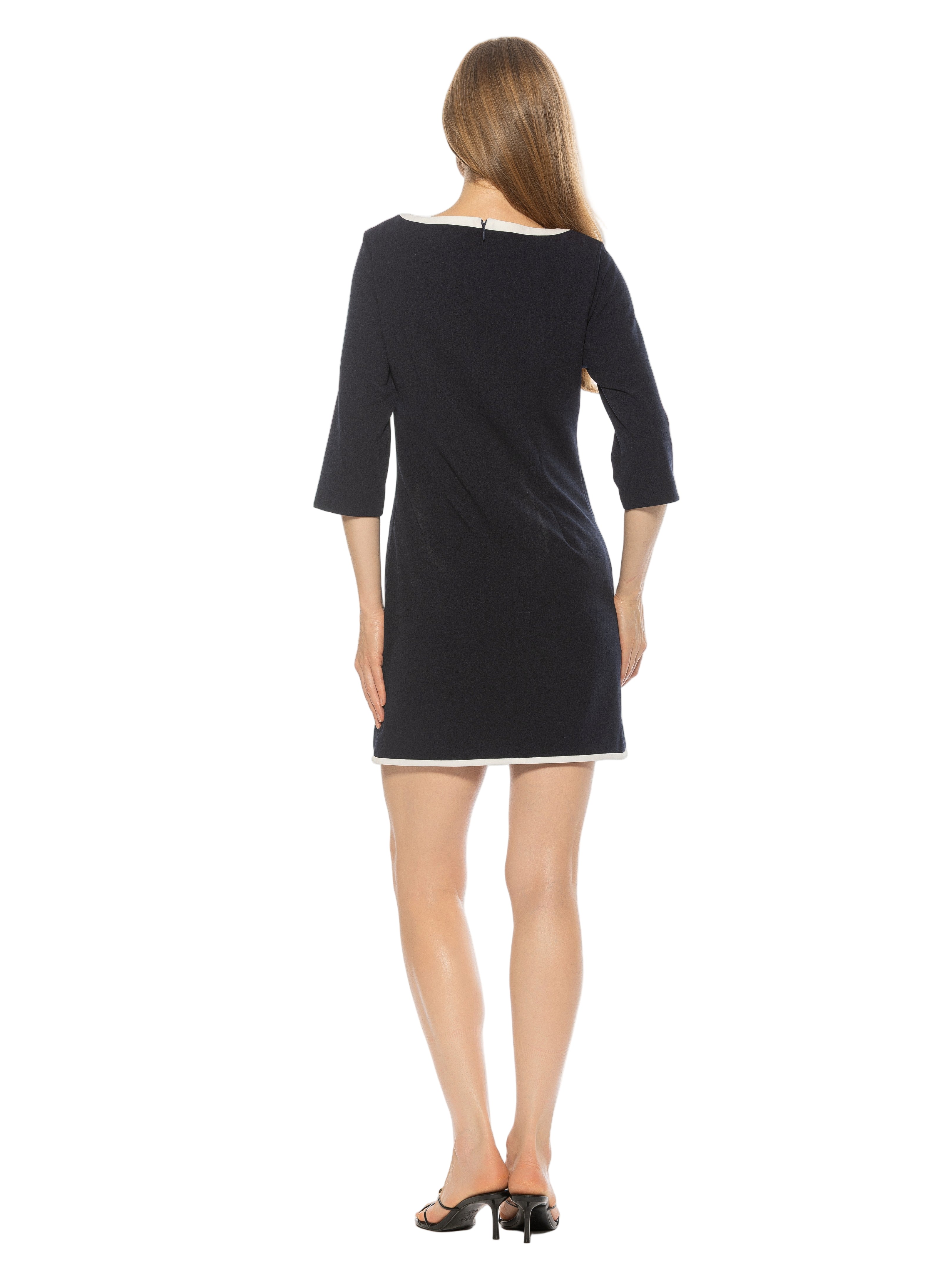 The River Boatneck Shift Dress With Contrast Piping Is A Must Have Piece For You. This Dress Features Luxe Fabric, 3/4" Sleeve, Shift Body, And Contrast Detailing. This Dress Fits True To Size.