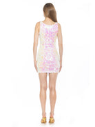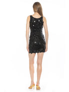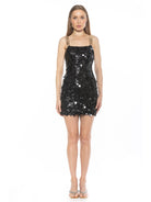 Introducing the Sabrina Mini Sequin Dress with Chain Detail. This elegant dress features a square neckline and delicate chain strap details, perfect for any special occasion. Made with high-quality sequin material, this mini dress will make you shine like a star. Upgrade your wardrobe with this luxurious piece.