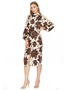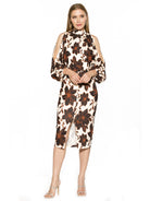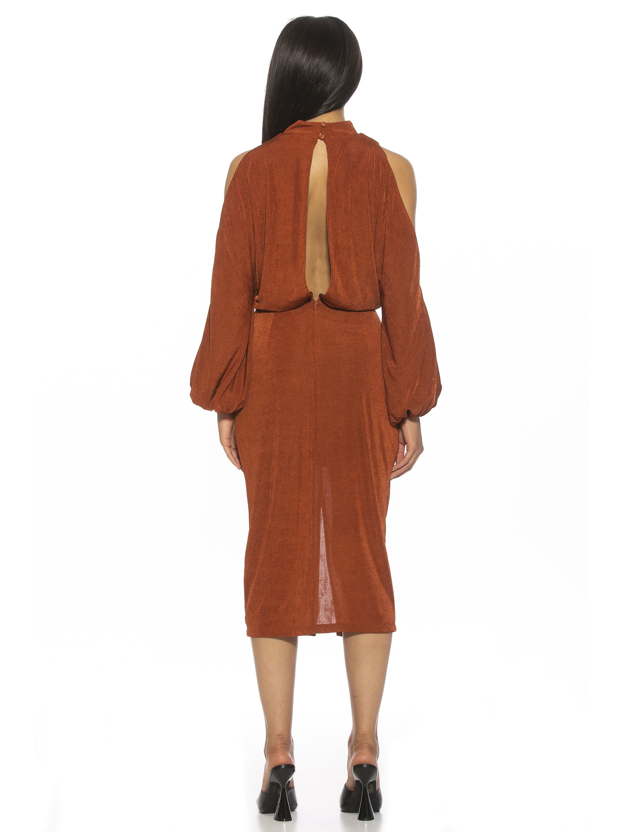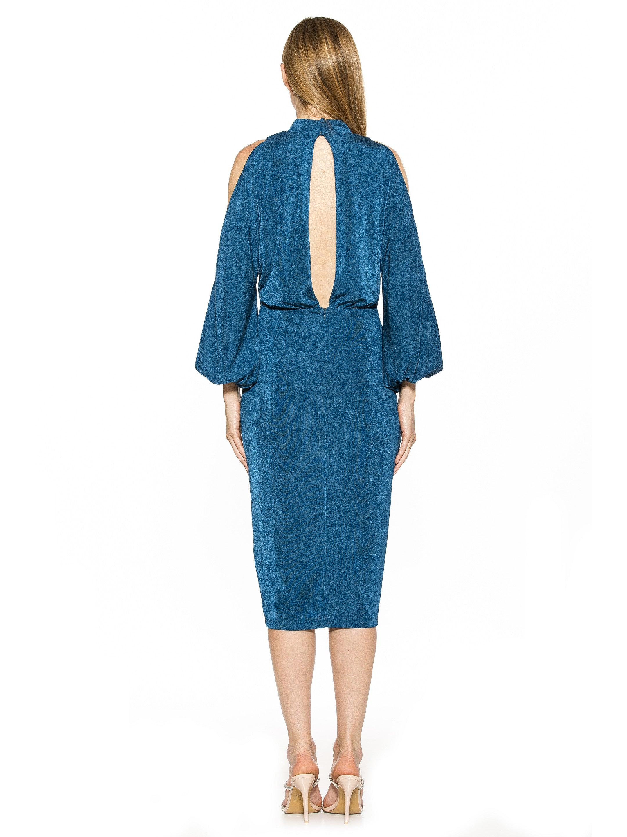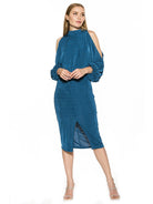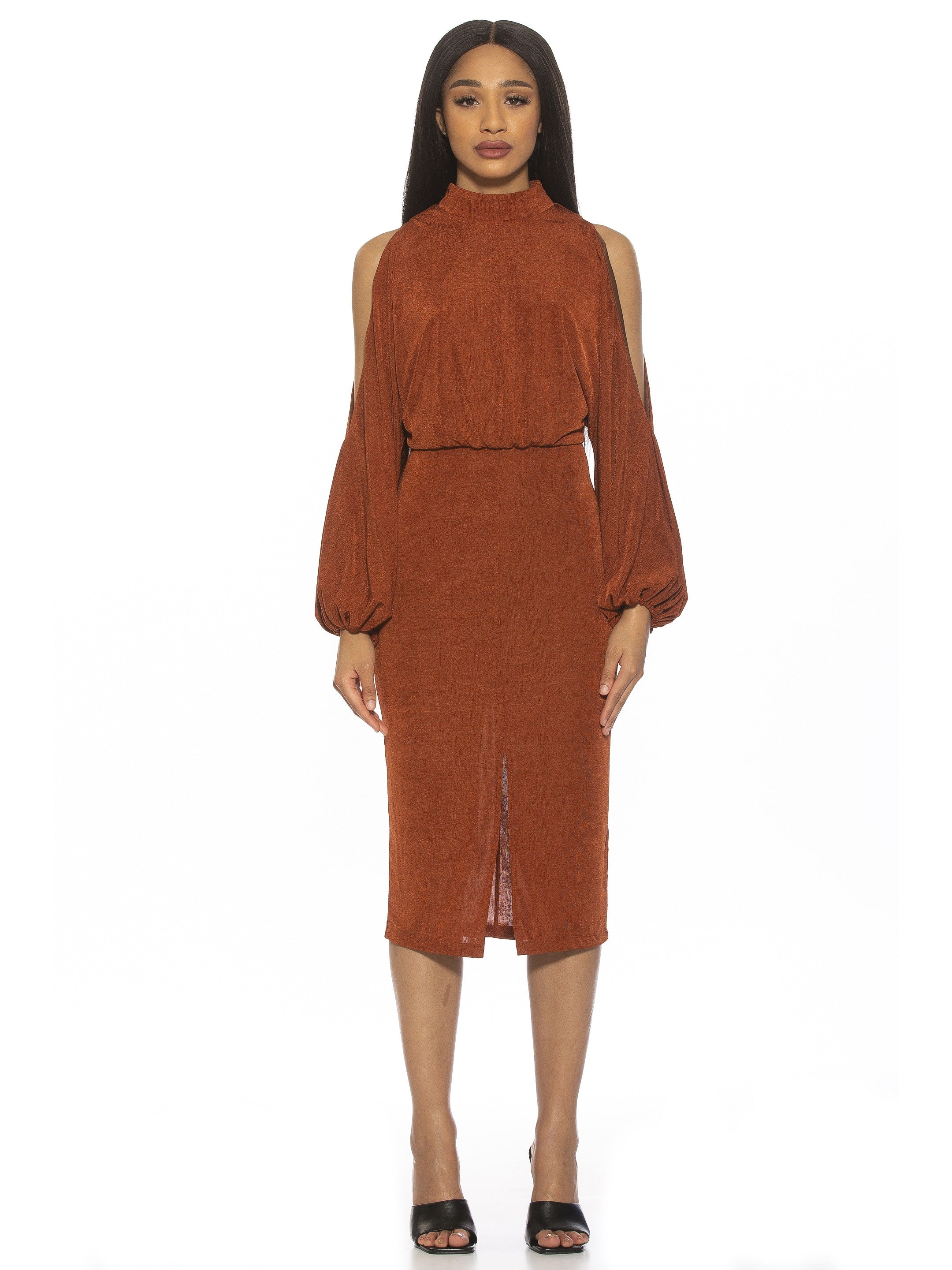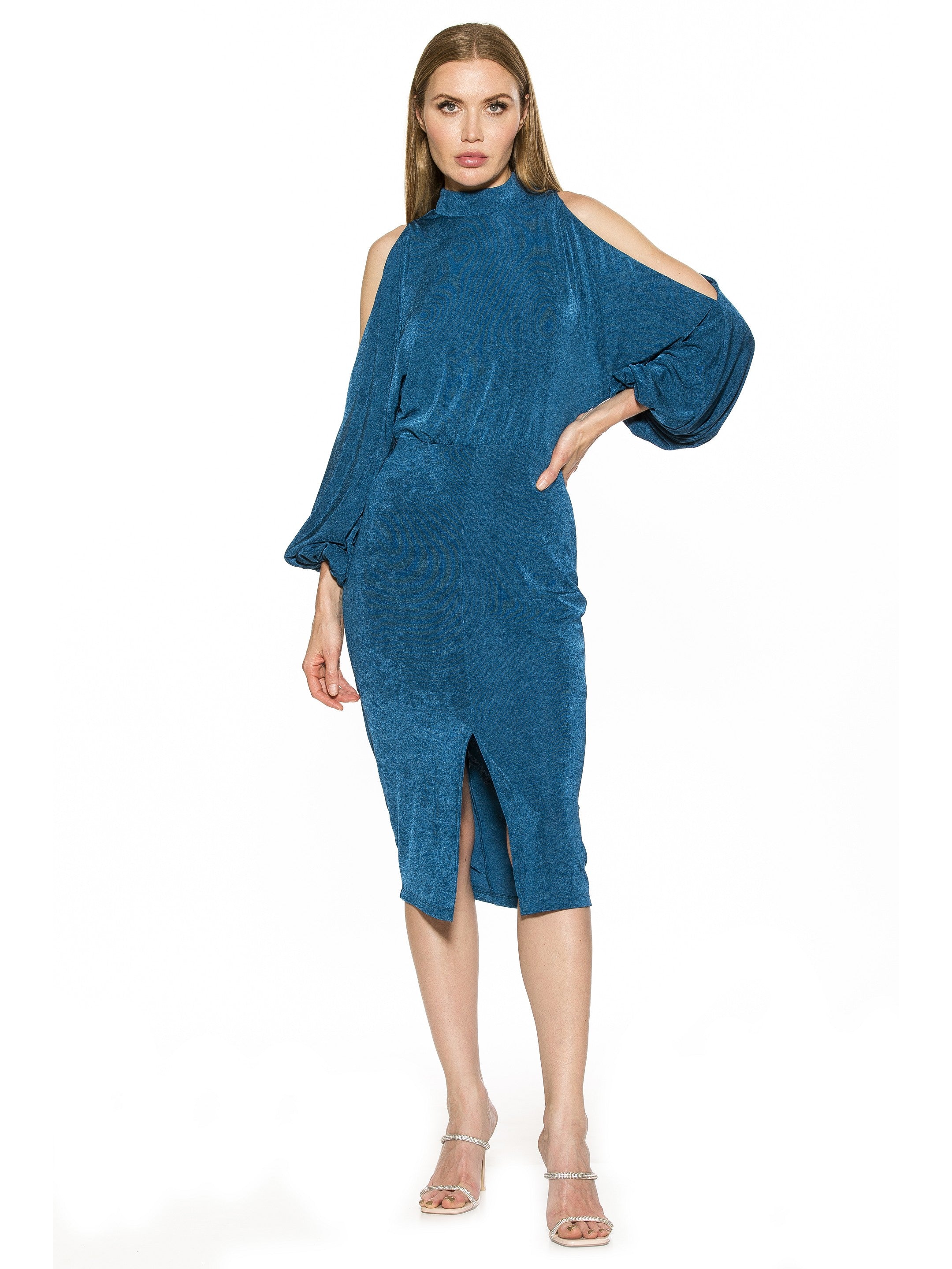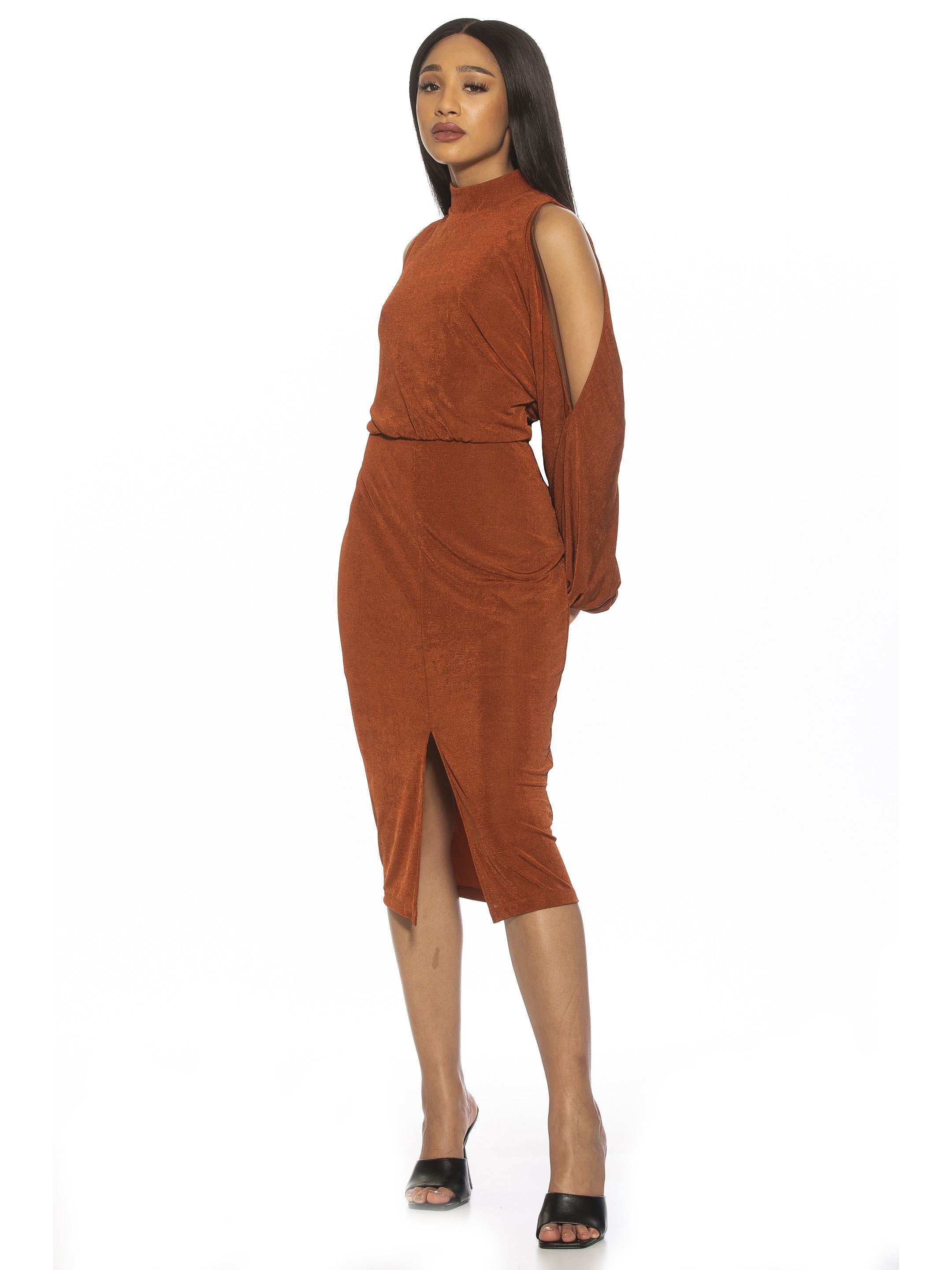 The Sem mock neck cold shoulder midi dress is a must have modern piece for your wardrobe. This style features mock neck, open cold shoulder detail, luxe slinky fabric, and fitted midi skirt with front slit.