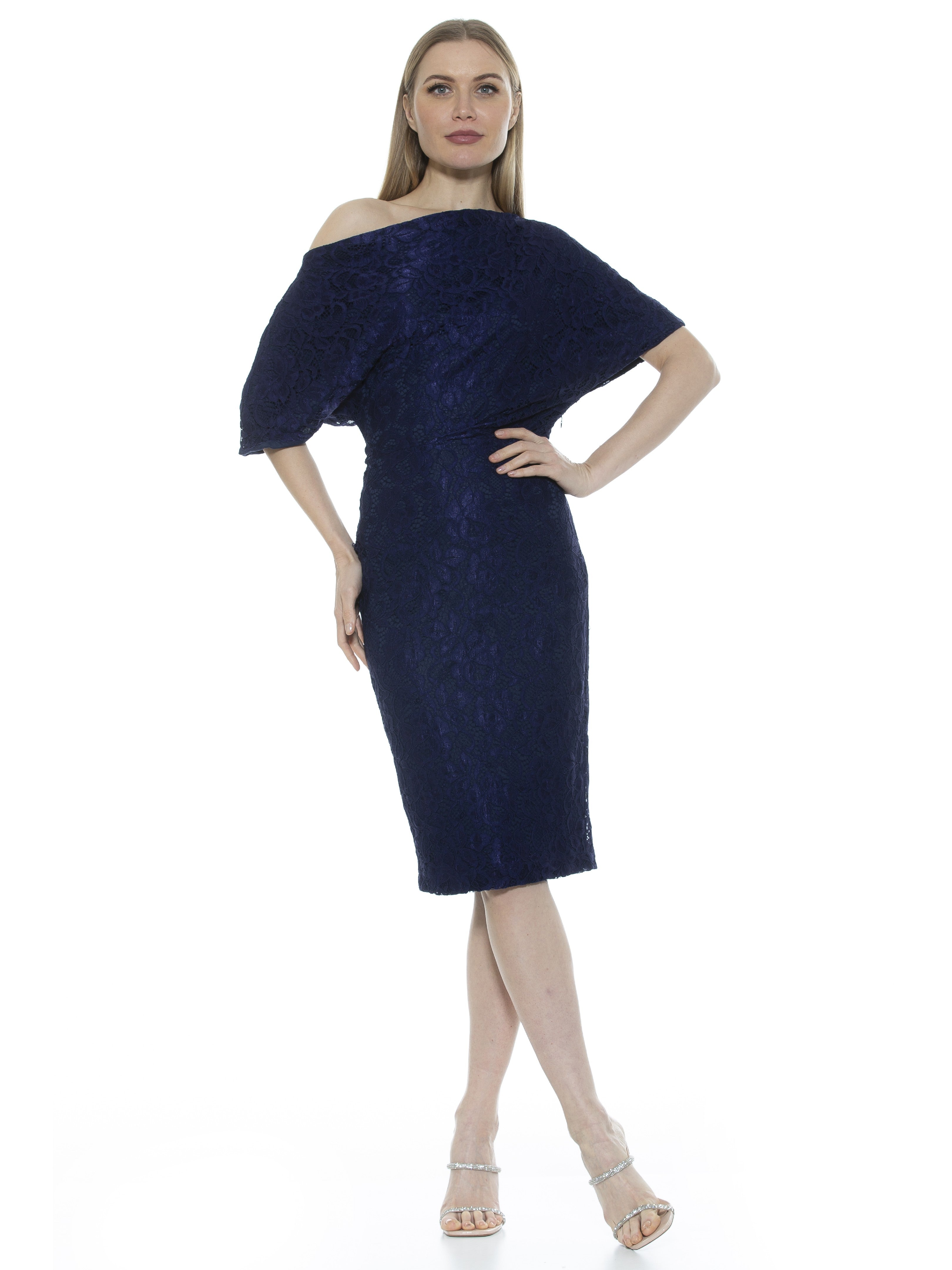 The Tayla dress is sure to make an impression with its sophisticated elegance. Crafted from luxurious lace material, this off-the-shoulder, cocktail-length design features short sleeves which provide just the right level of coverage for a statement look.