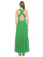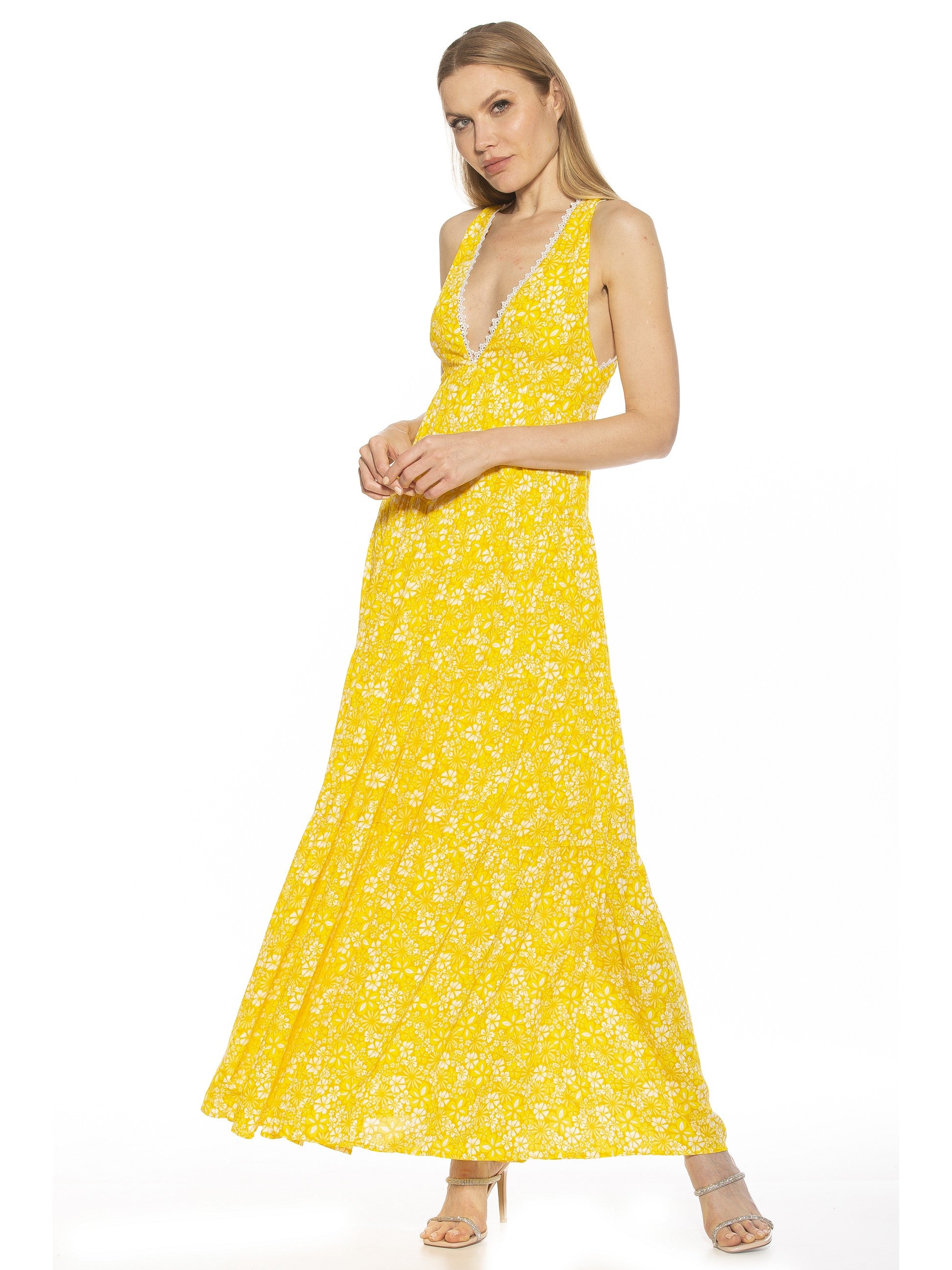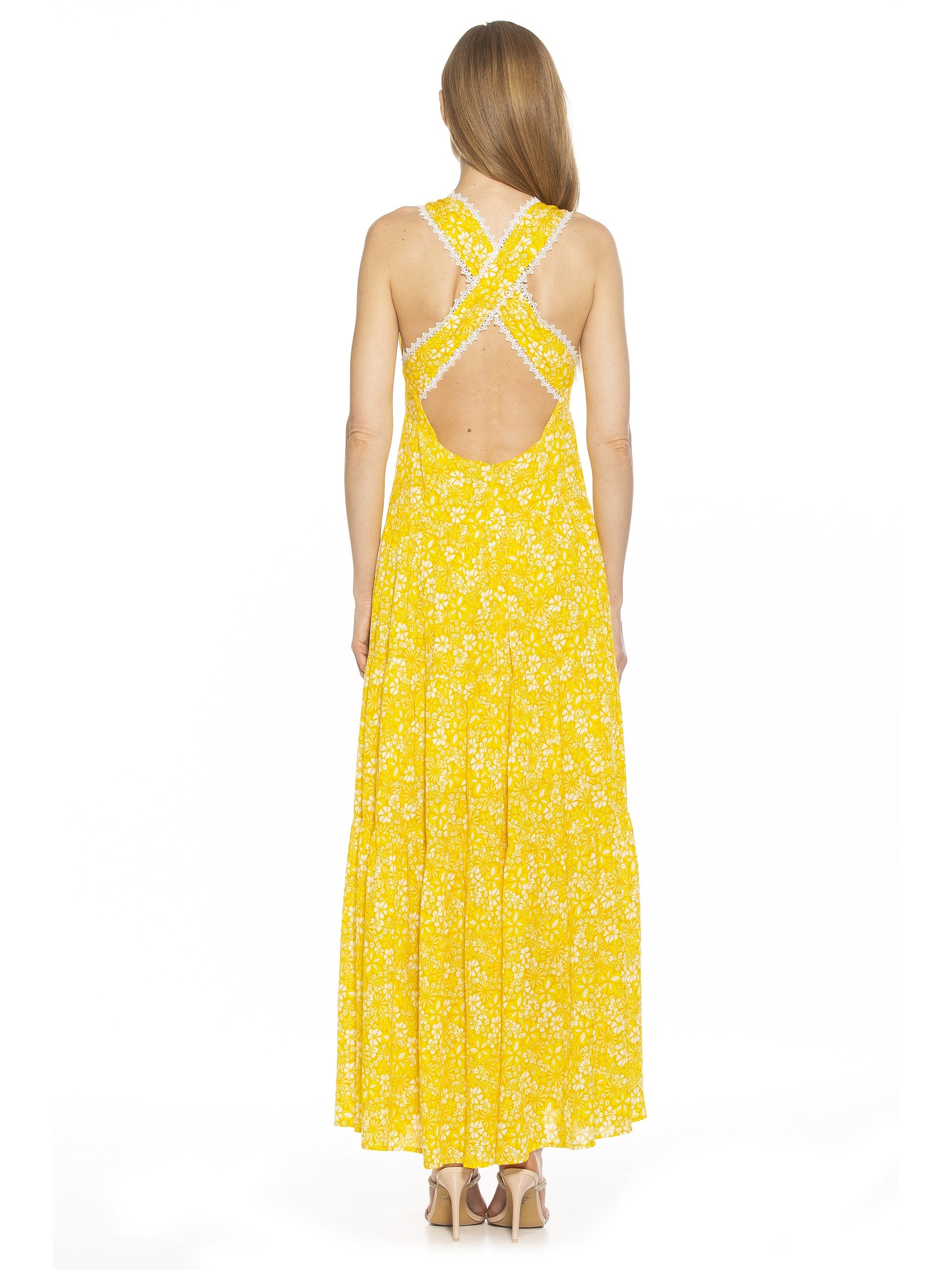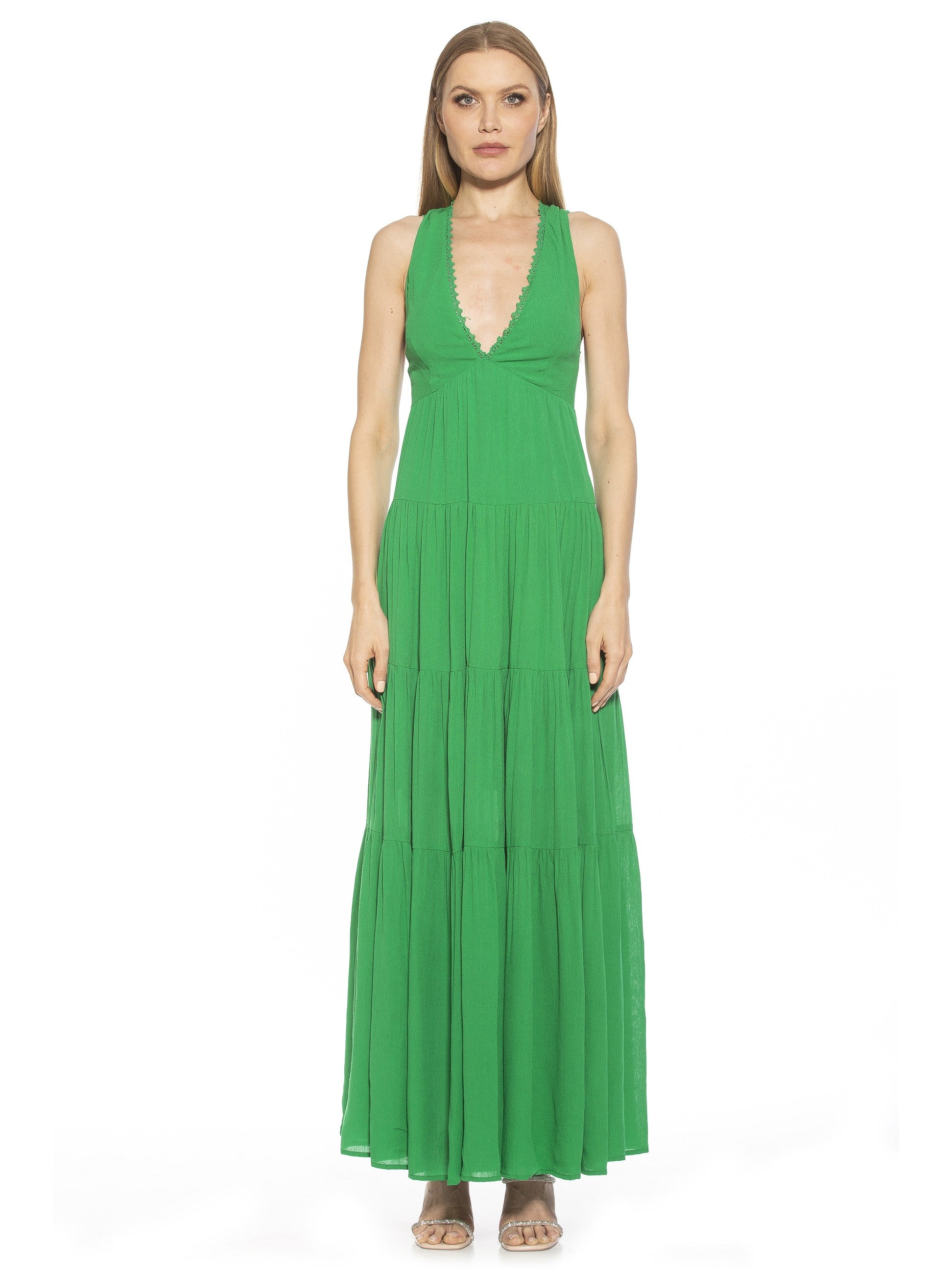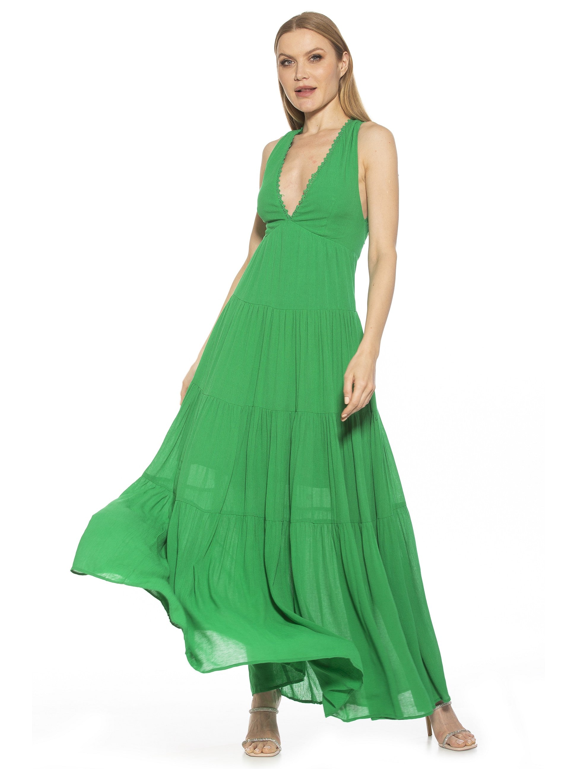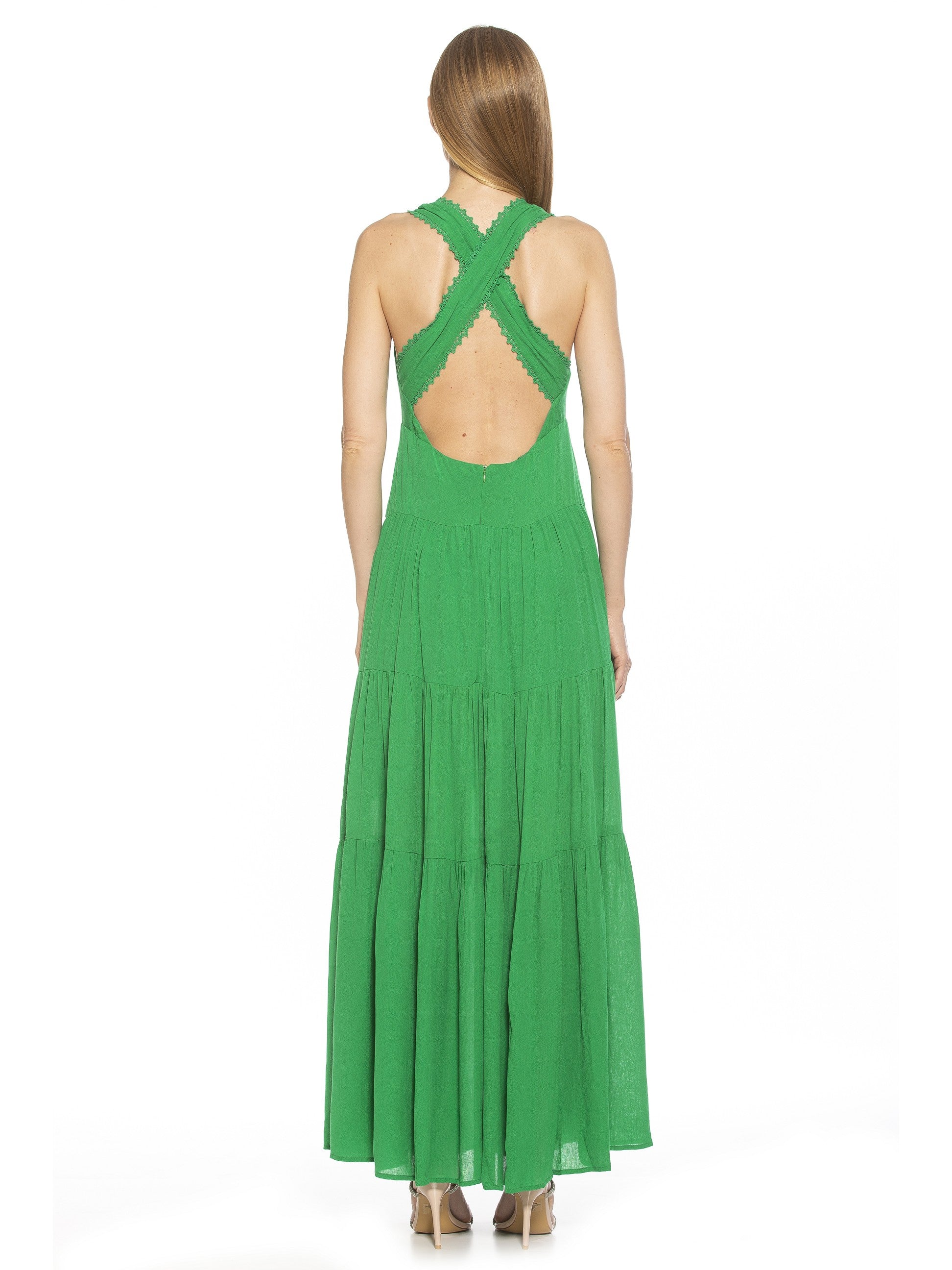 The Tezzi v neck tiered maxi dress with lace detailing is a must have piece for your wardrobe. This dress features v neck front bodice with lace trim detail, sleeveless, criss-cross back with lace and tiered maxi skirt . This dress fits true to size.
