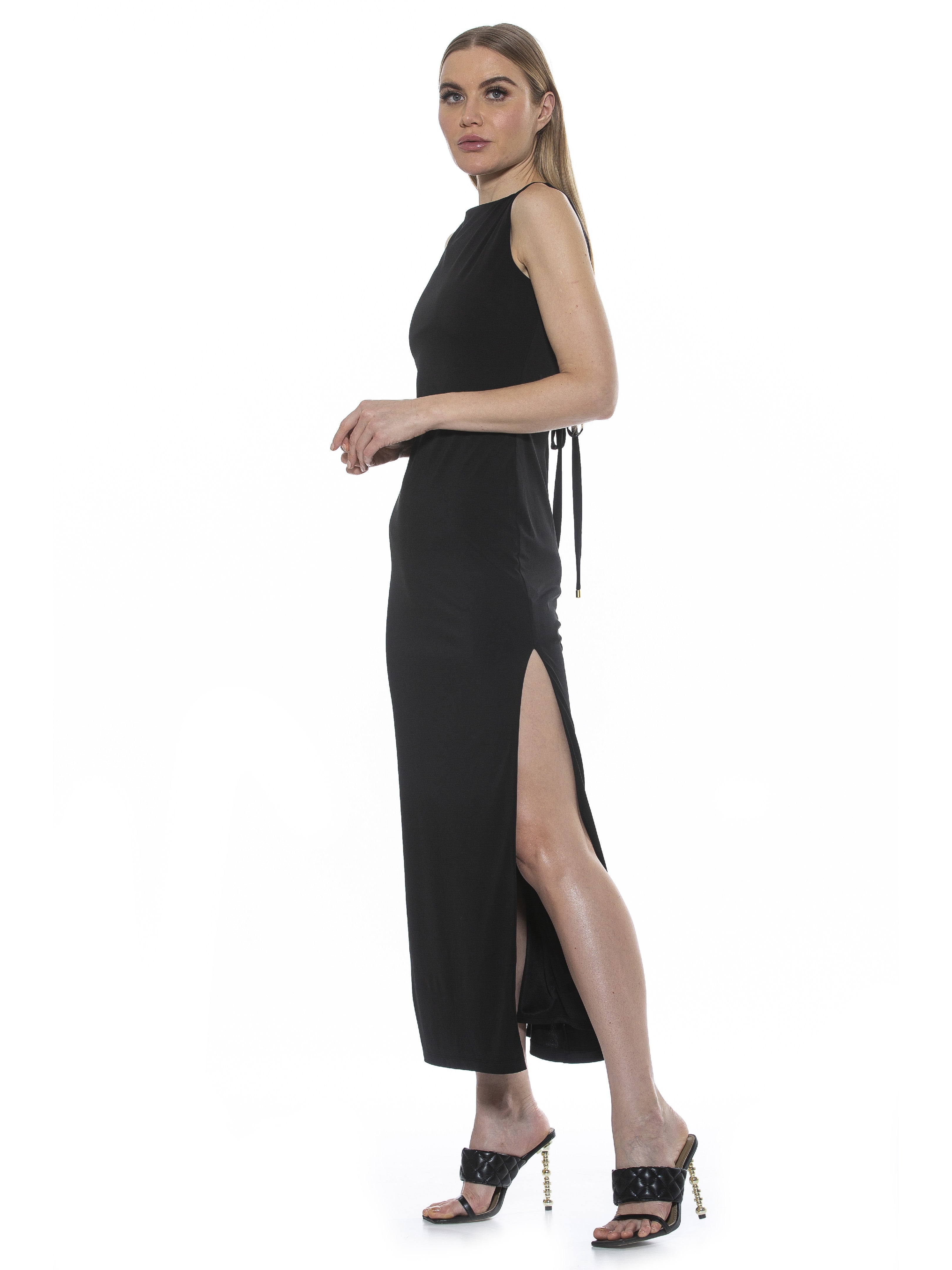 Sleeves are cancelled. The Violet is a sleeveless, maxi dress with a high boat neckline, and an open back with a tie detail.