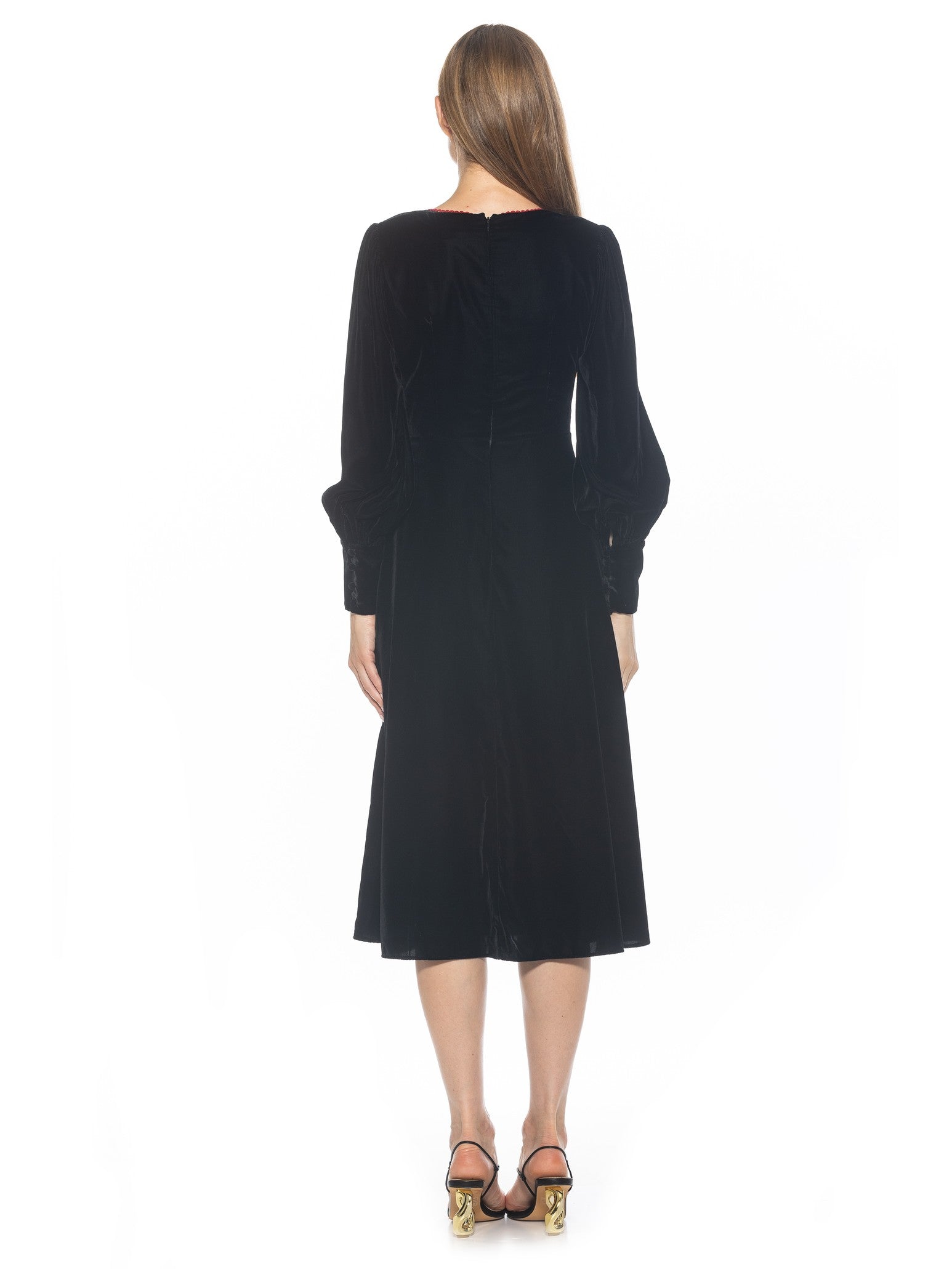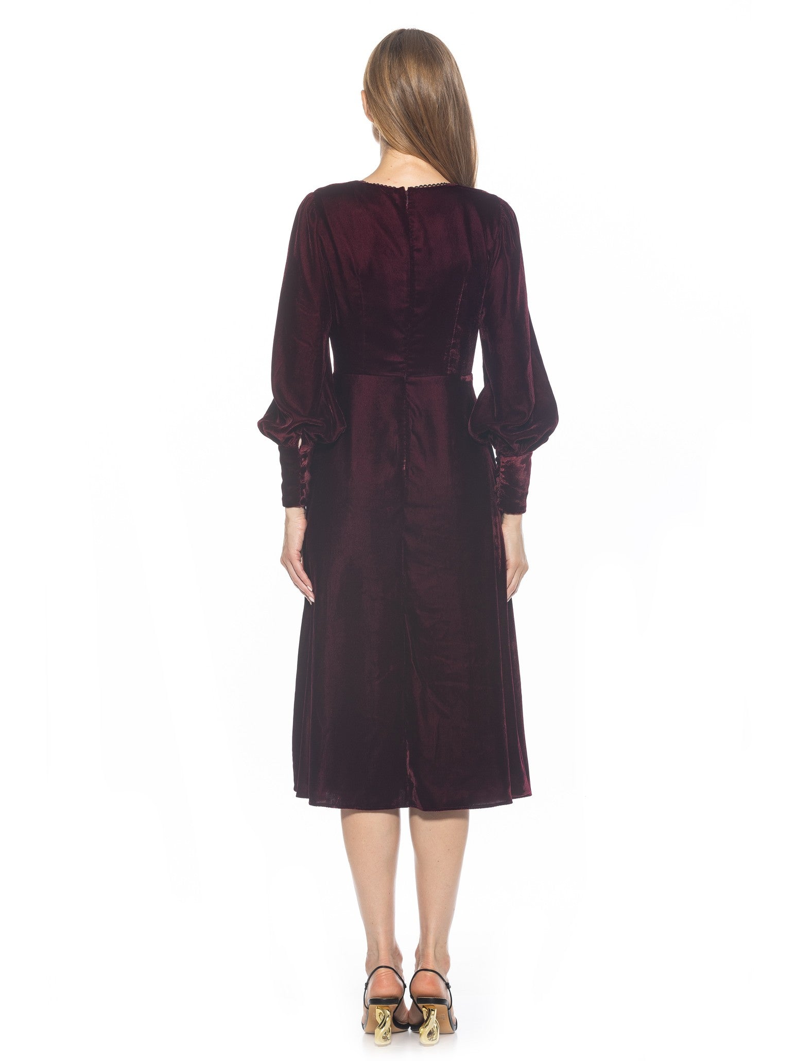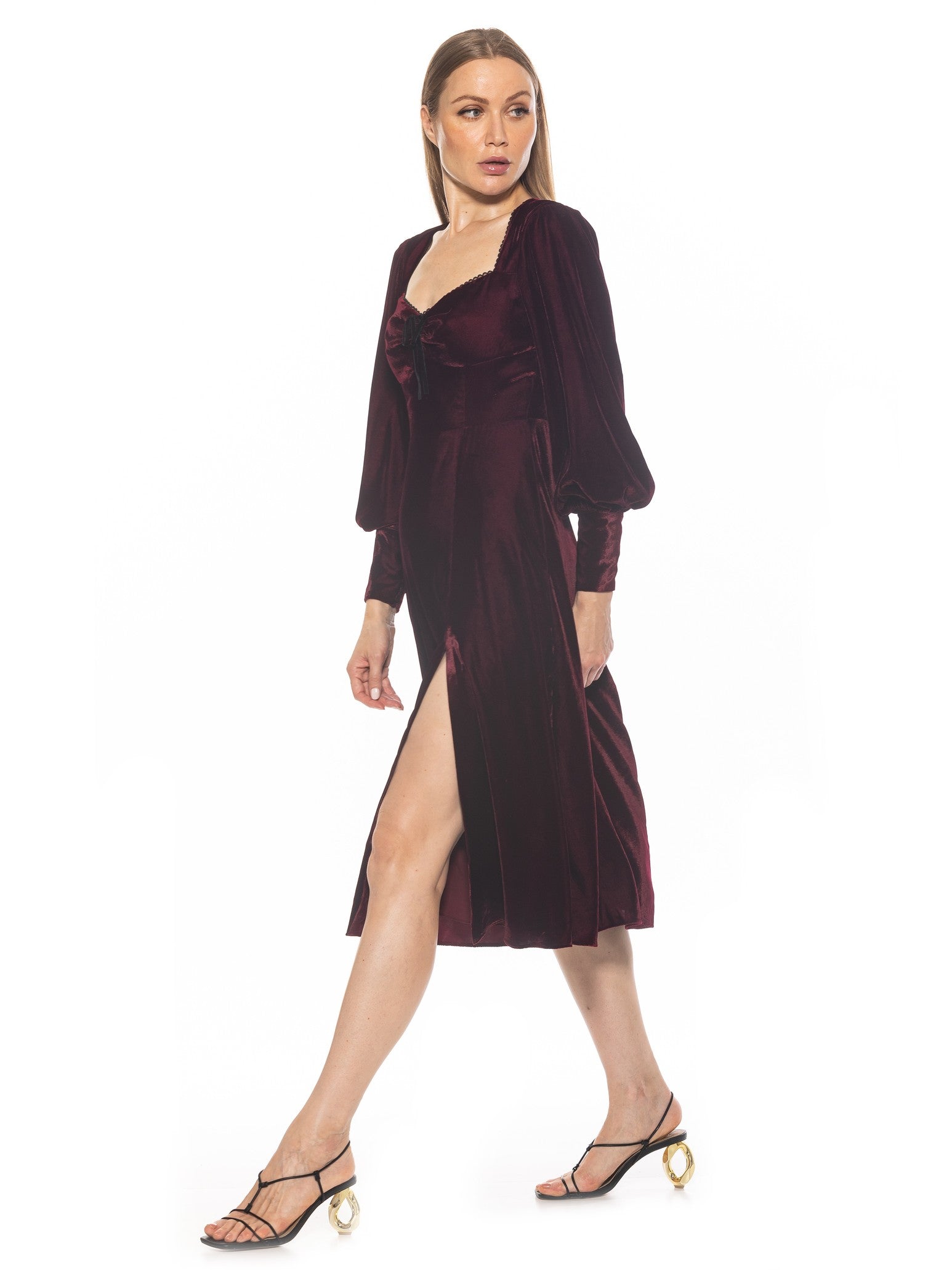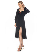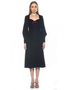 Indulge in opulence with the Willa Dress. The delicate bow on the sweetheart neckline exudes femininity while the long bubble sleeves add a touch of drama. The fit and flare silhouette creates a flattering silhouette, making this midi dress an essential addition to your wardrobe.