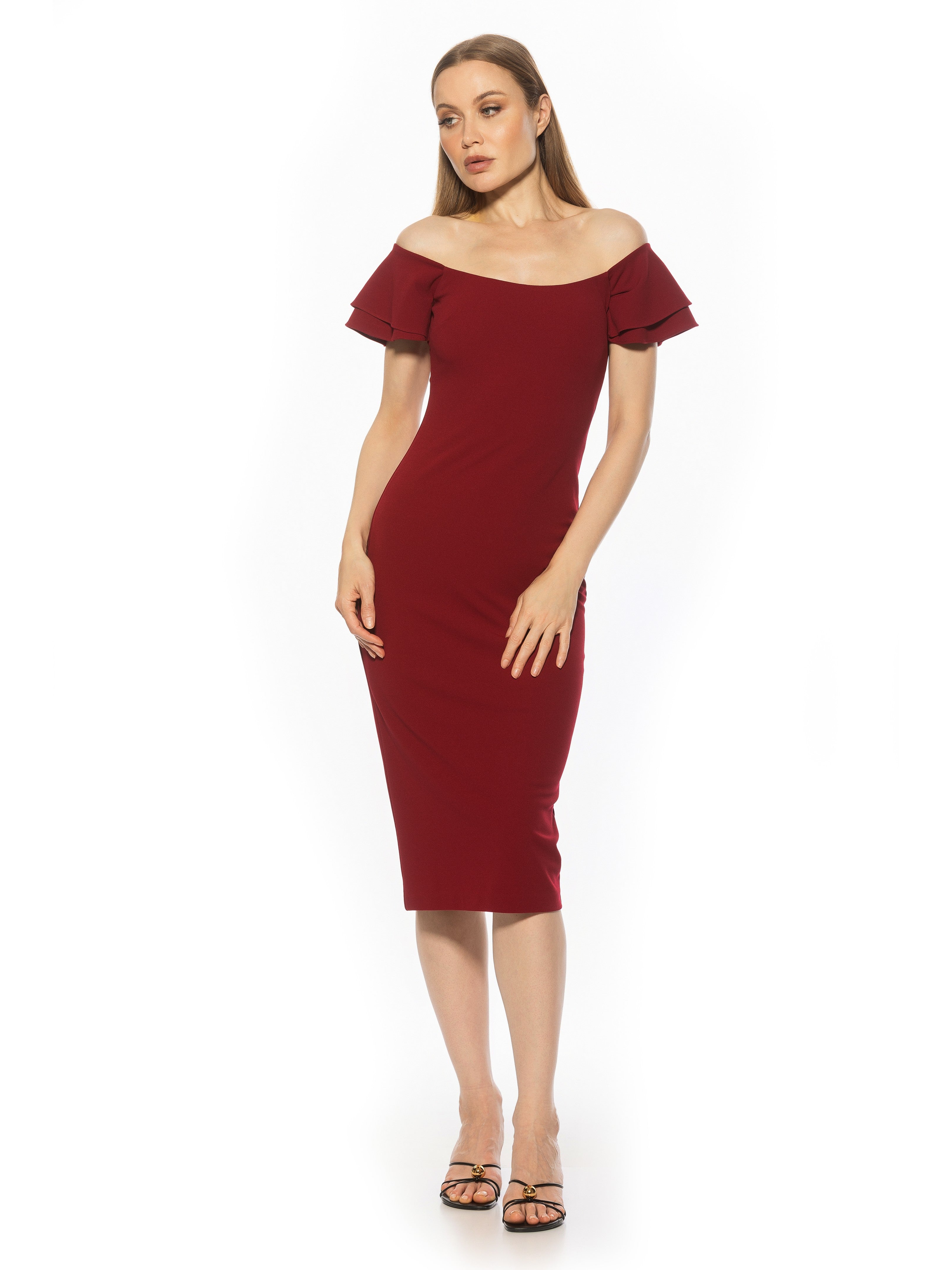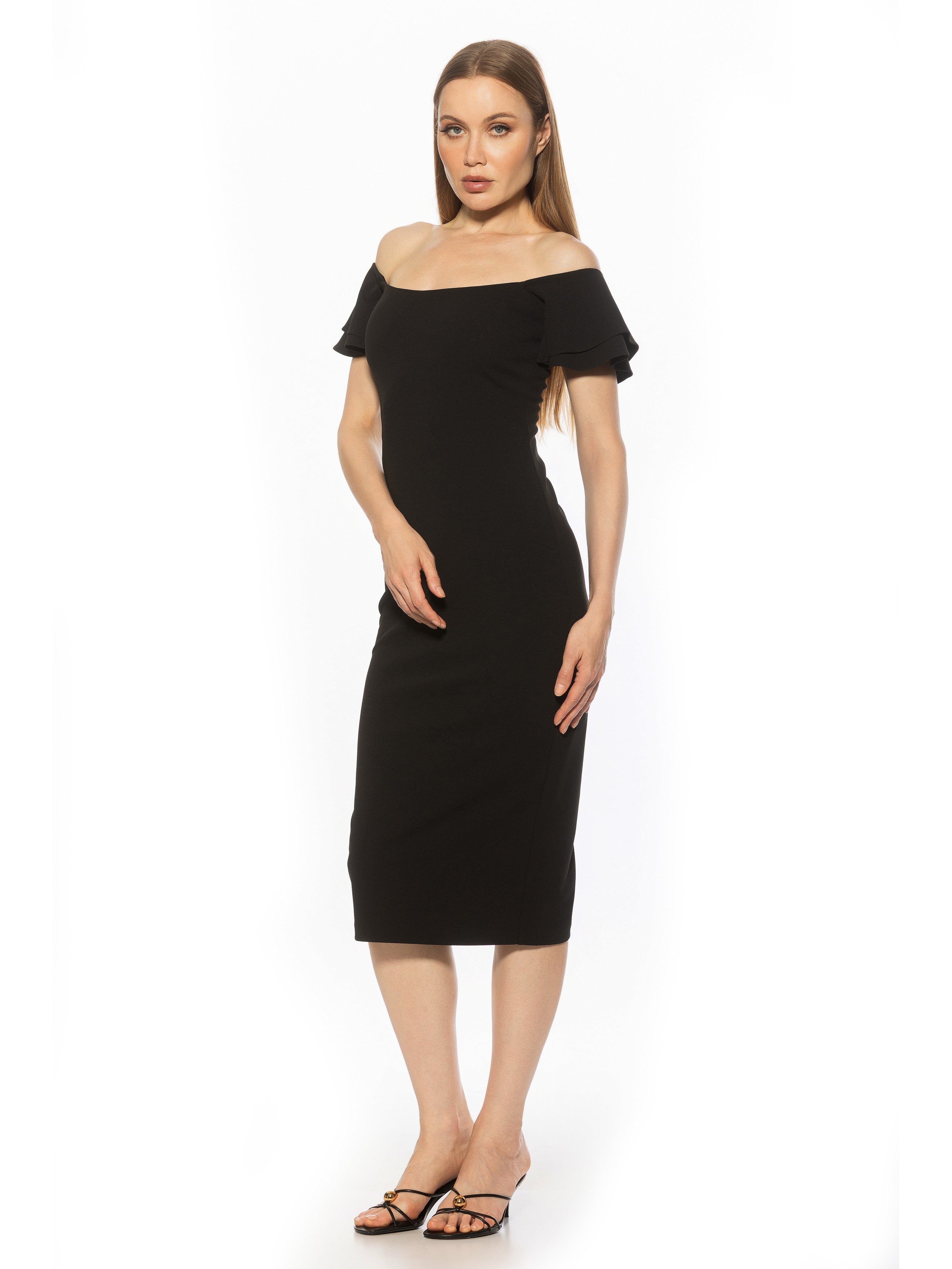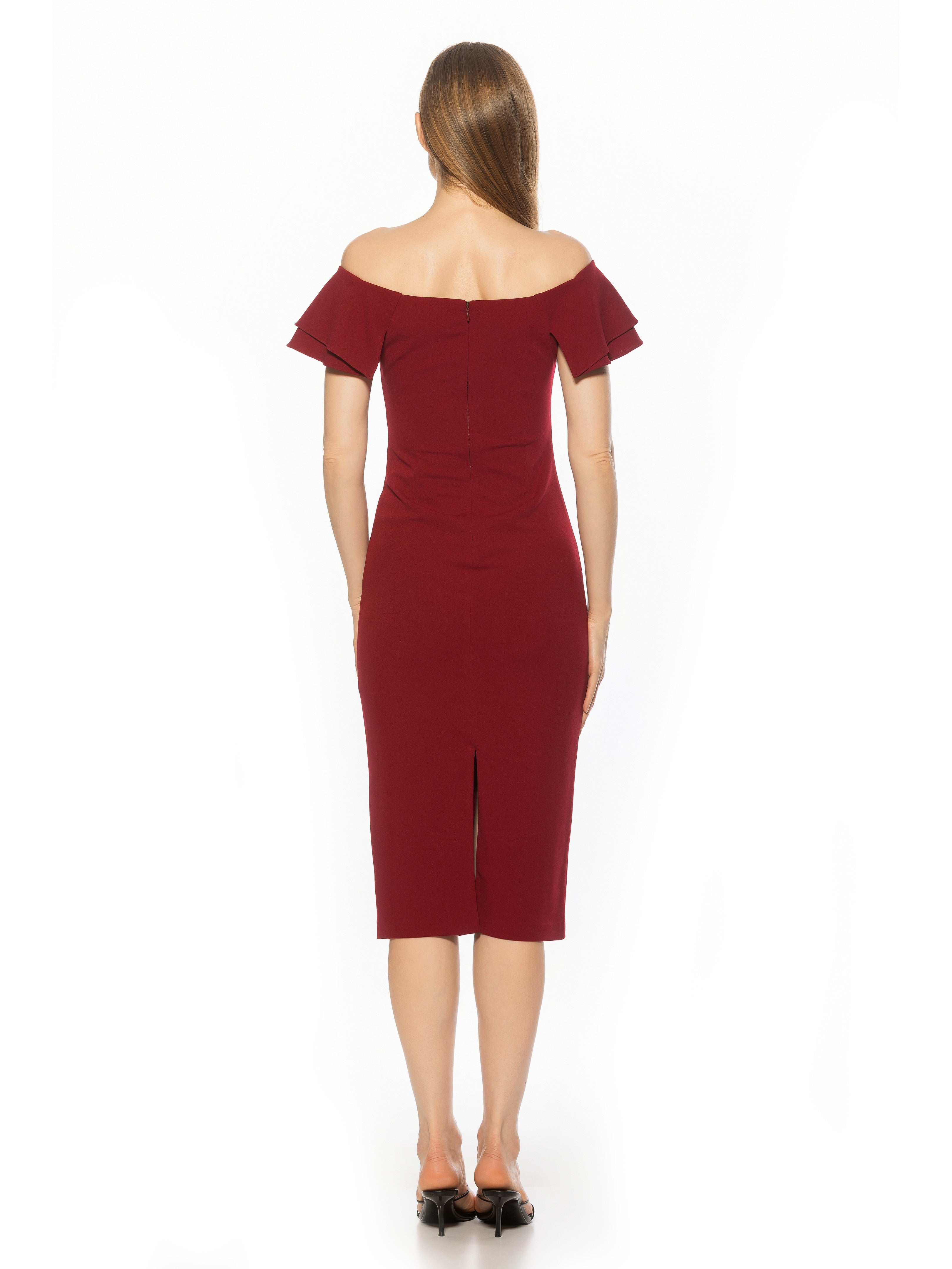 The Winston Flutter Sleeve Sheath Dress Is A Must Have For Your Wardrobe. This Dress Features Off The Shoulder Detail, Flutter Sleeve, And Fitted Midi Sheath Body. This Dress Fits True To Size.