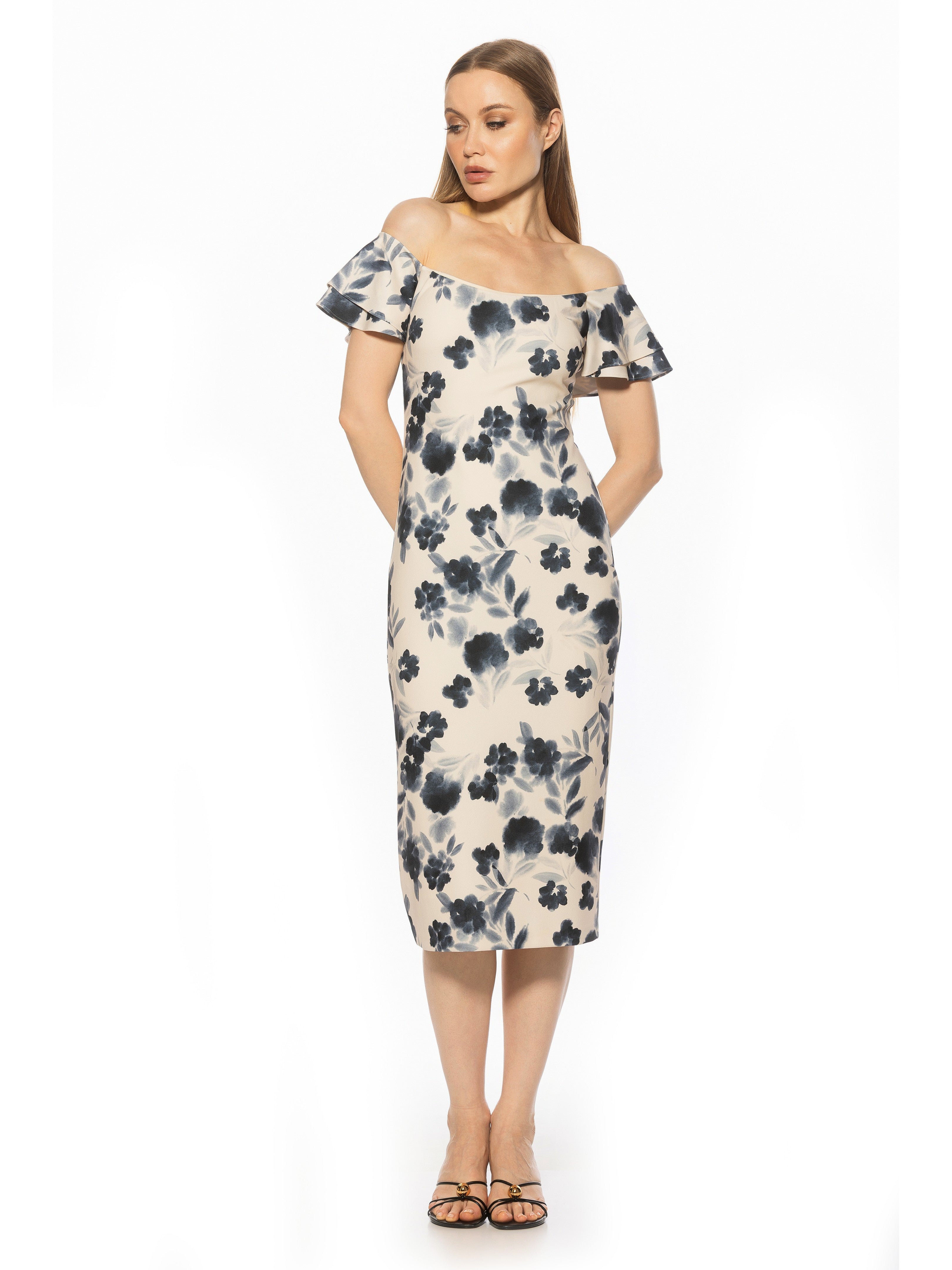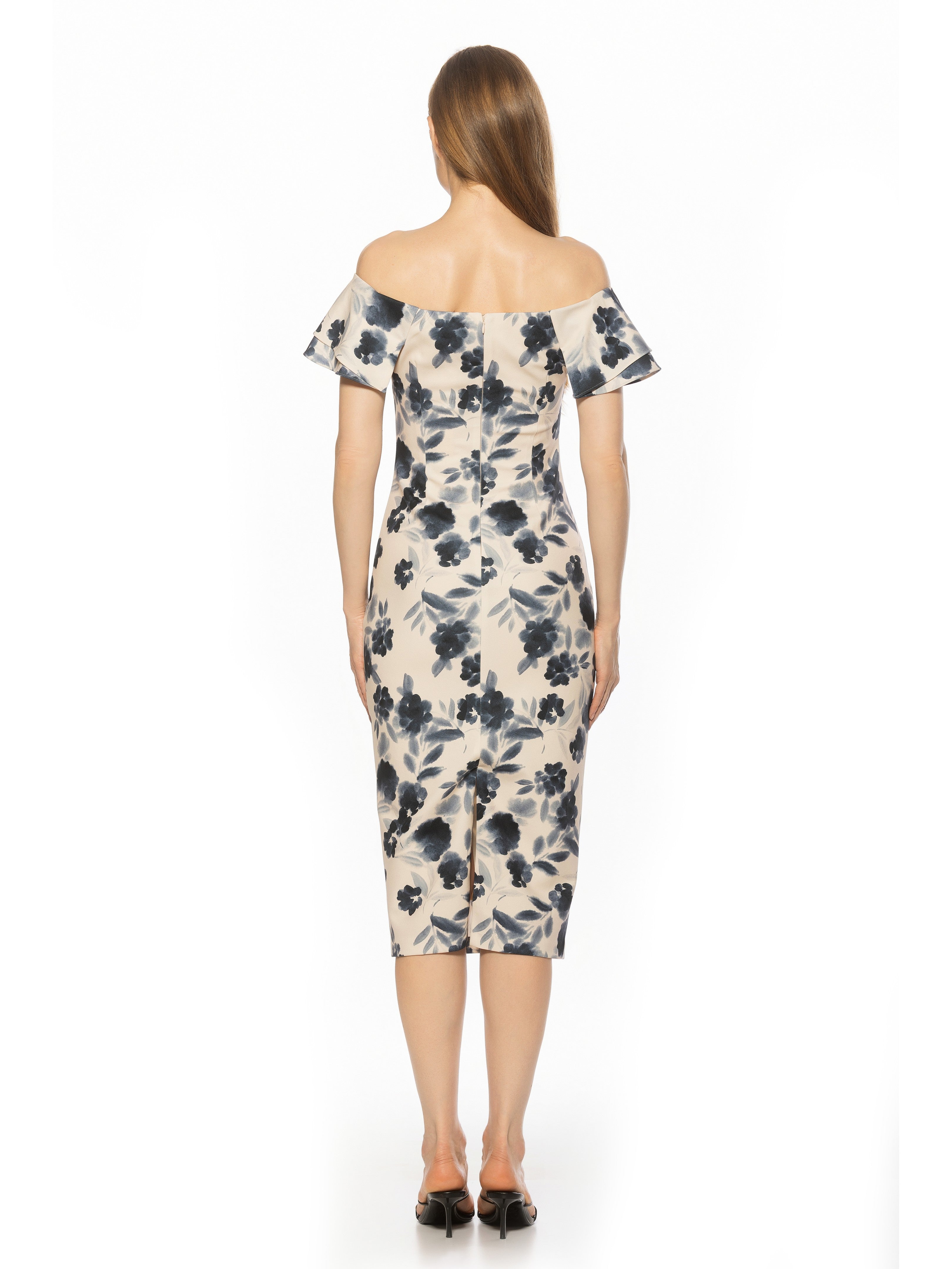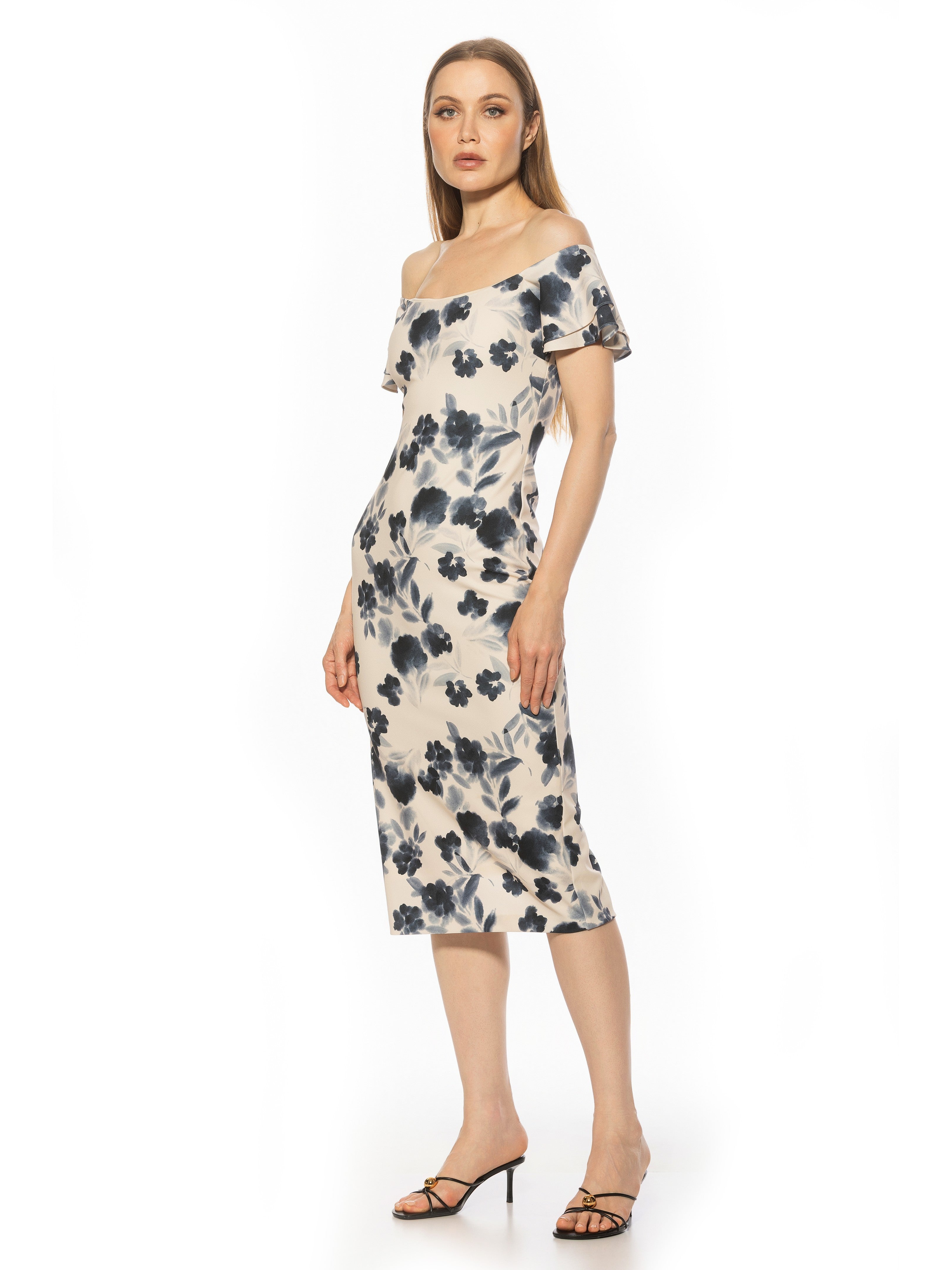 The Winston Flutter Sleeve Sheath Dress Is A Must Have For Your Wardrobe. This Dress Features Off The Shoulder Detail, Flutter Sleeve, And Fitted Midi Sheath Body. This Dress Fits True To Size.