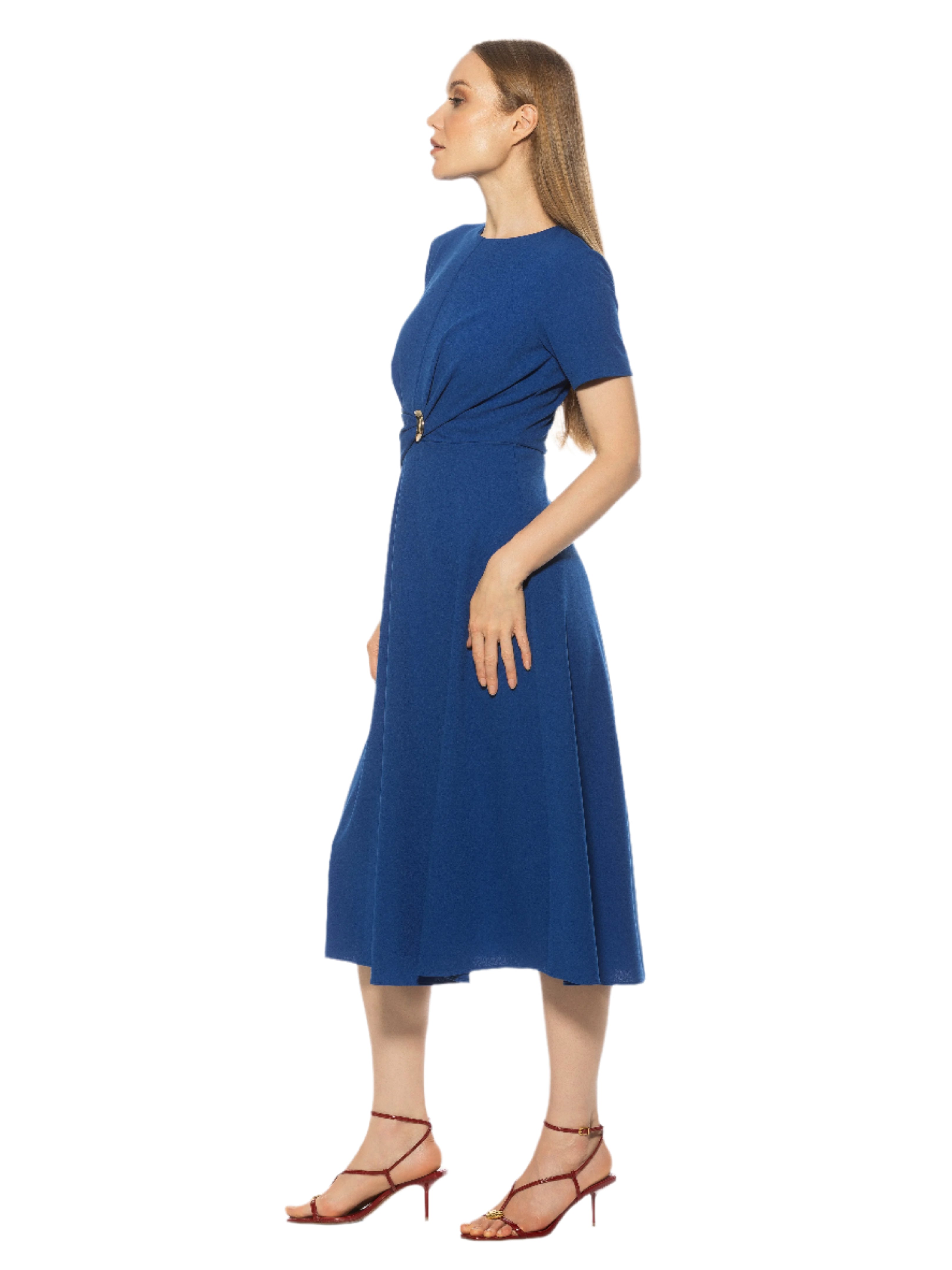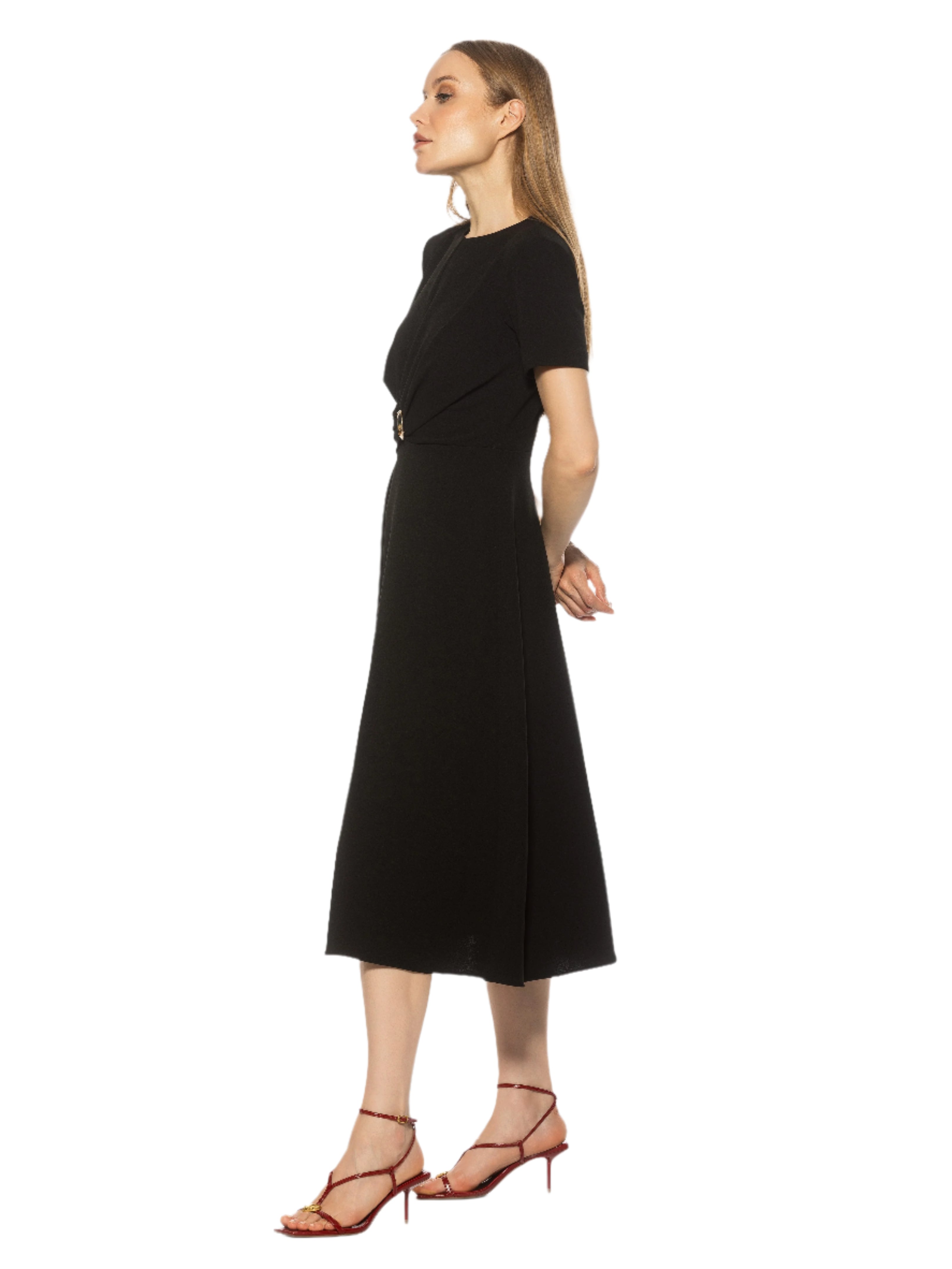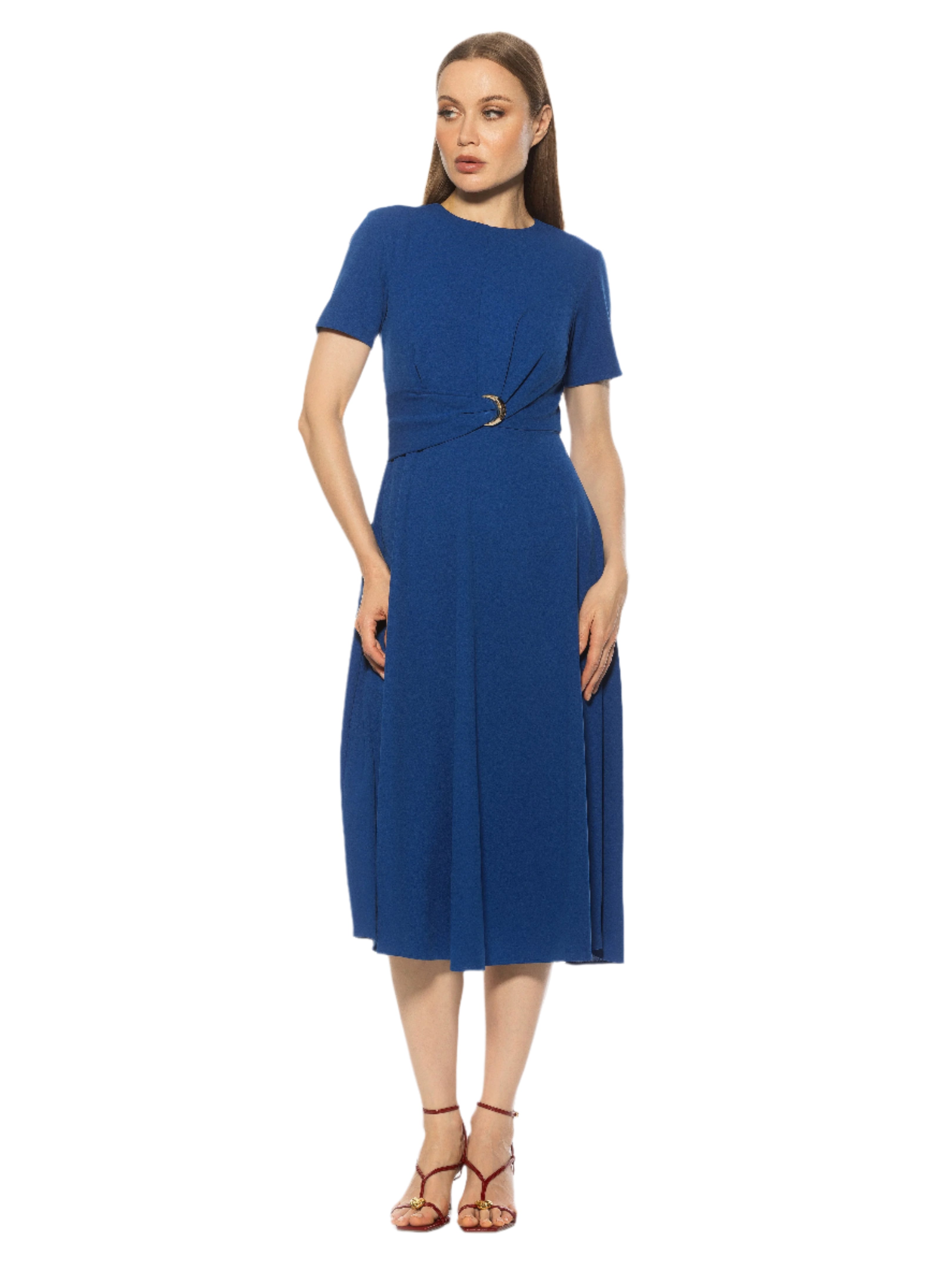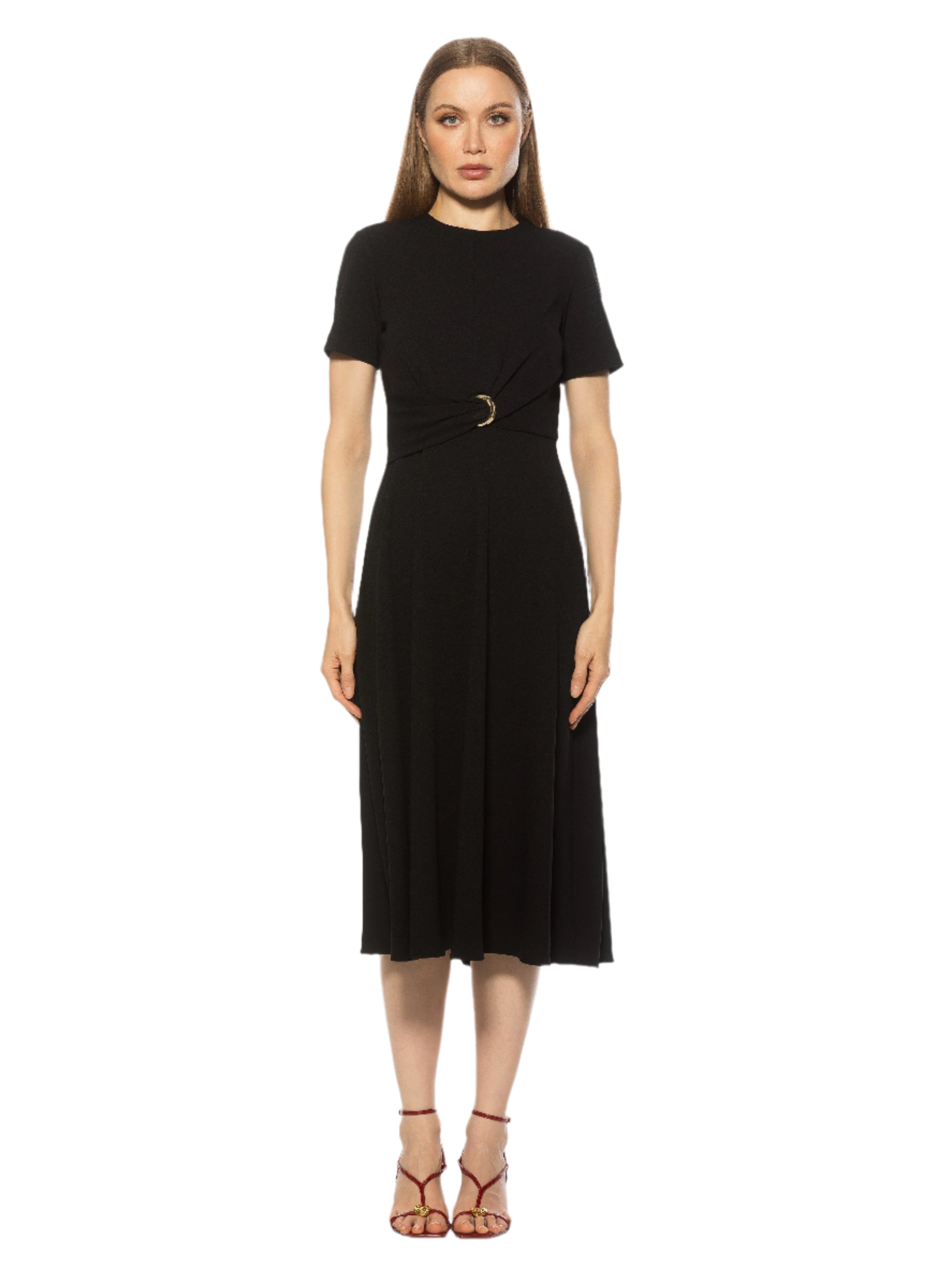 The Xi Crewneck Fit And Flare Dress Is A Must Have For Your Closet. This Dress Features Short Sleeves, Crewneck Neckline, Flared Midi Skirt And Front Gold Detail. This Dress Fits True To Size.