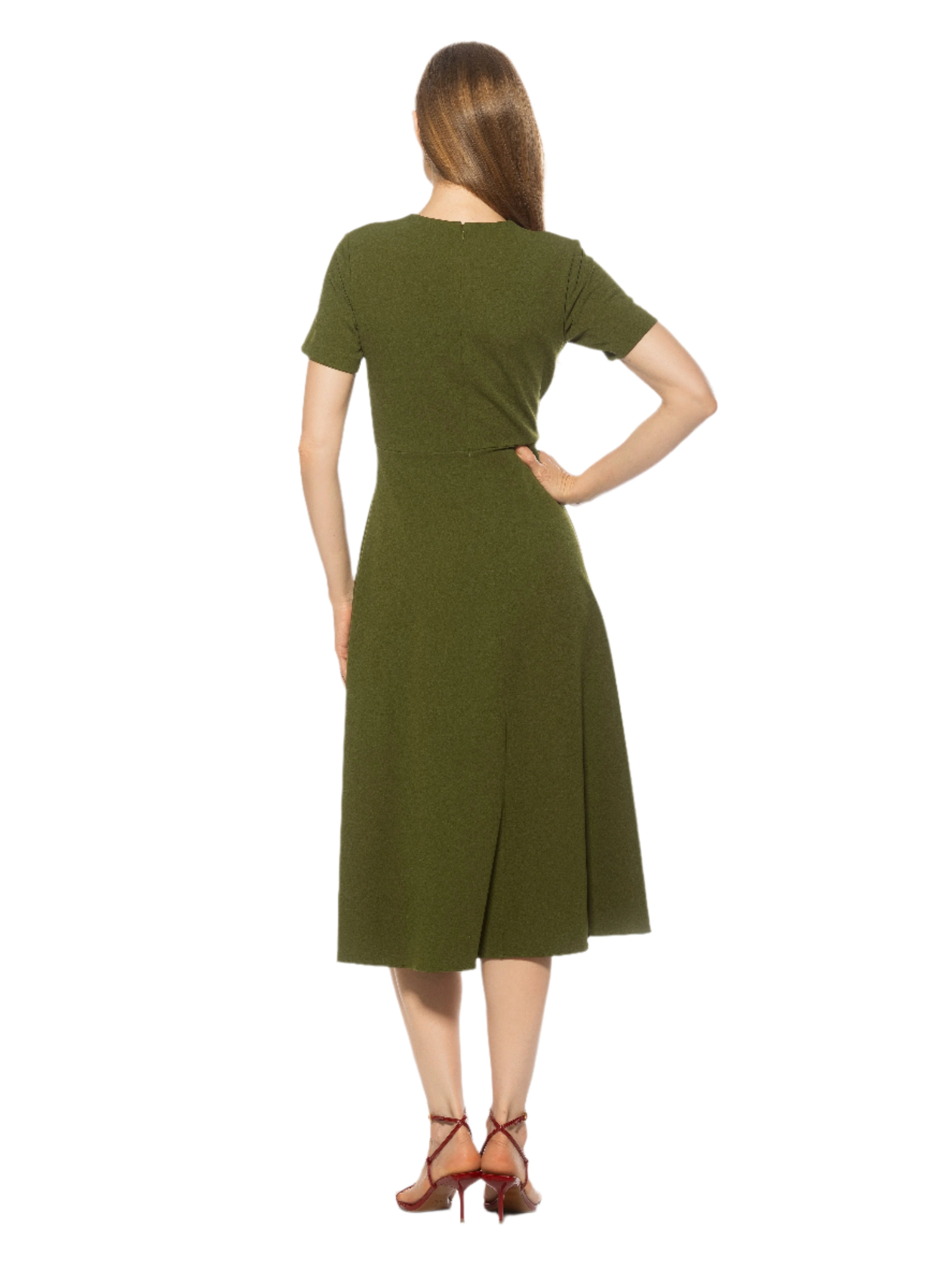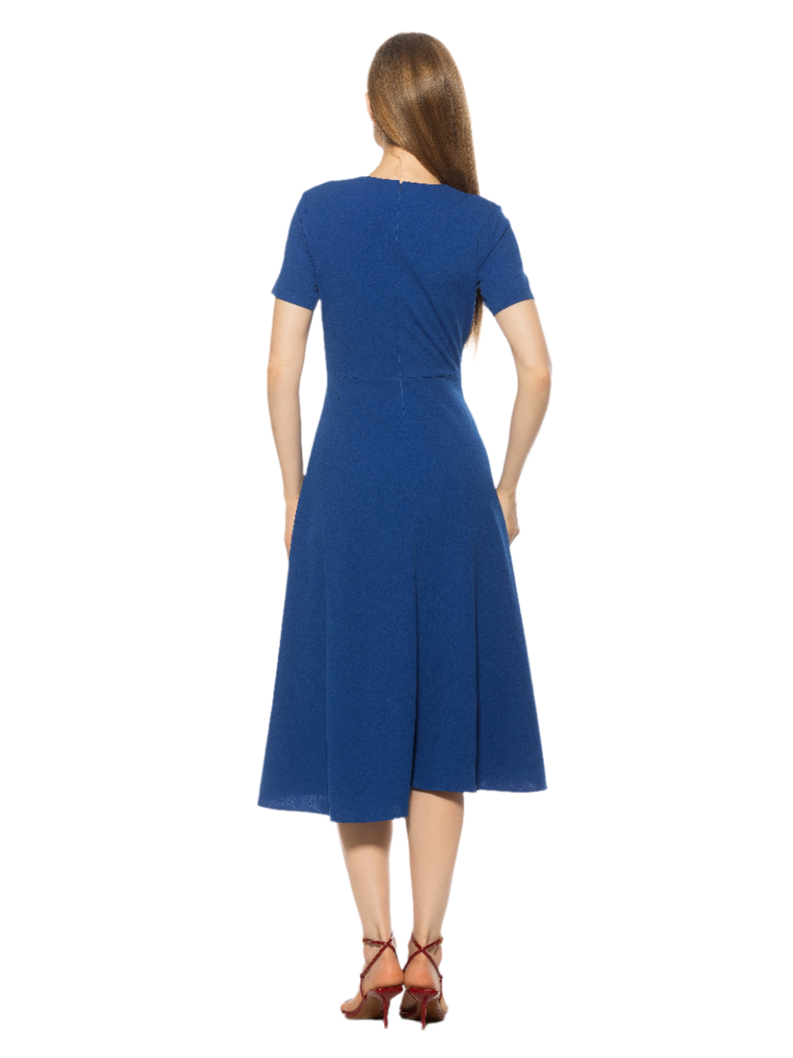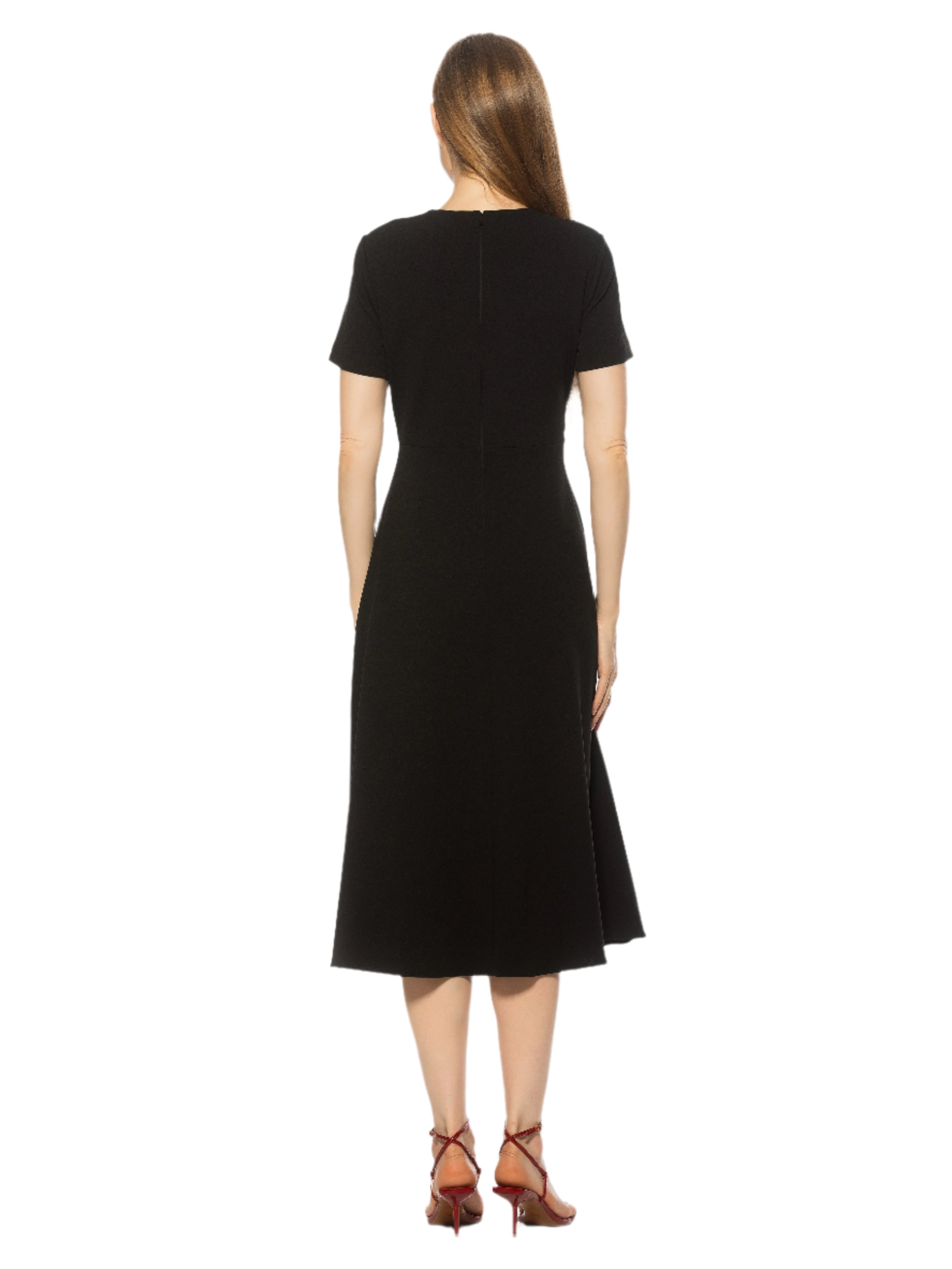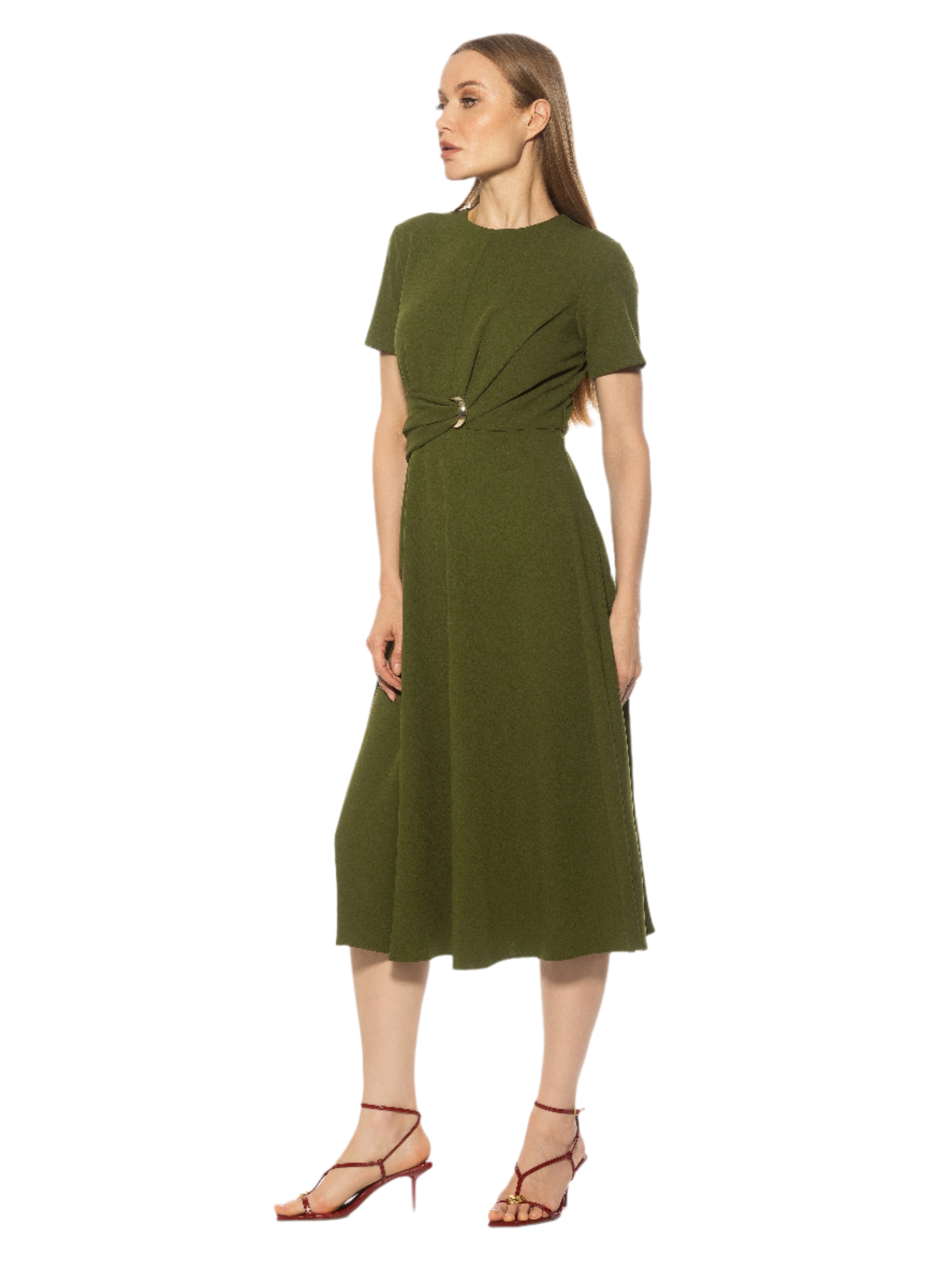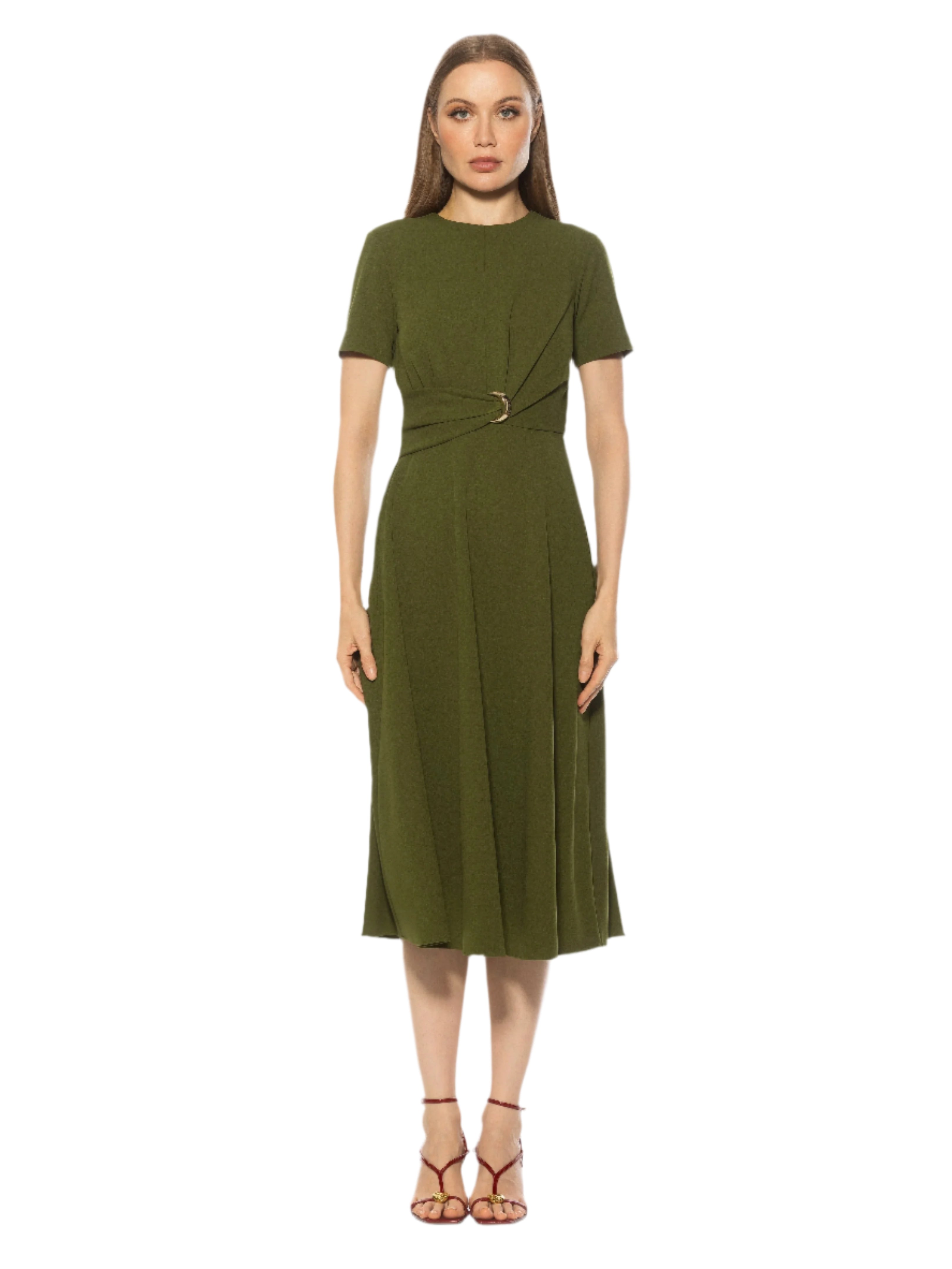The Xi Crewneck Fit And Flare Dress Is A Must Have For Your Closet. This Dress Features Short Sleeves, Crewneck Neckline, Flared Midi Skirt And Front Gold Detail. This Dress Fits True To Size.