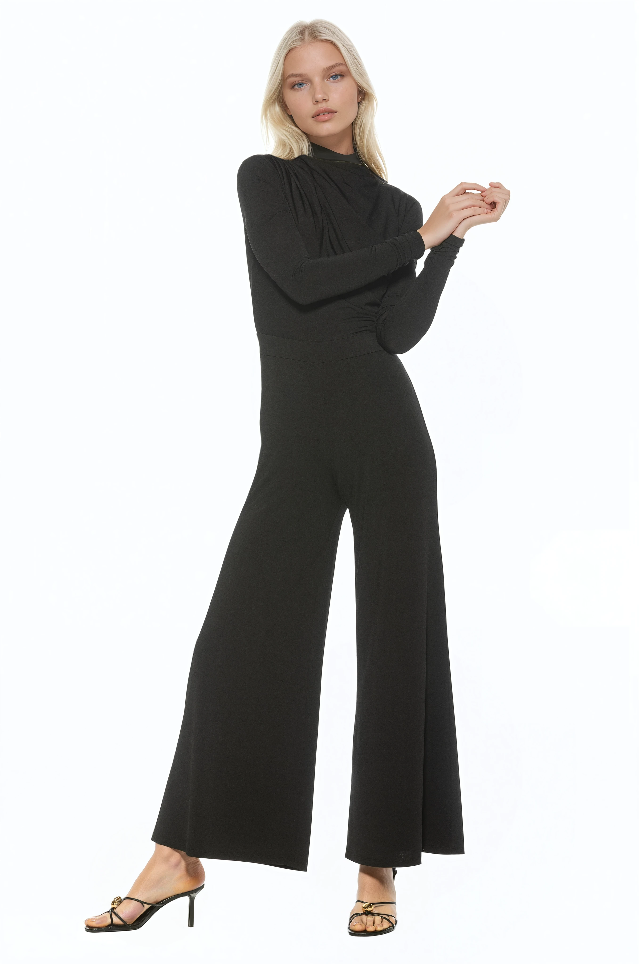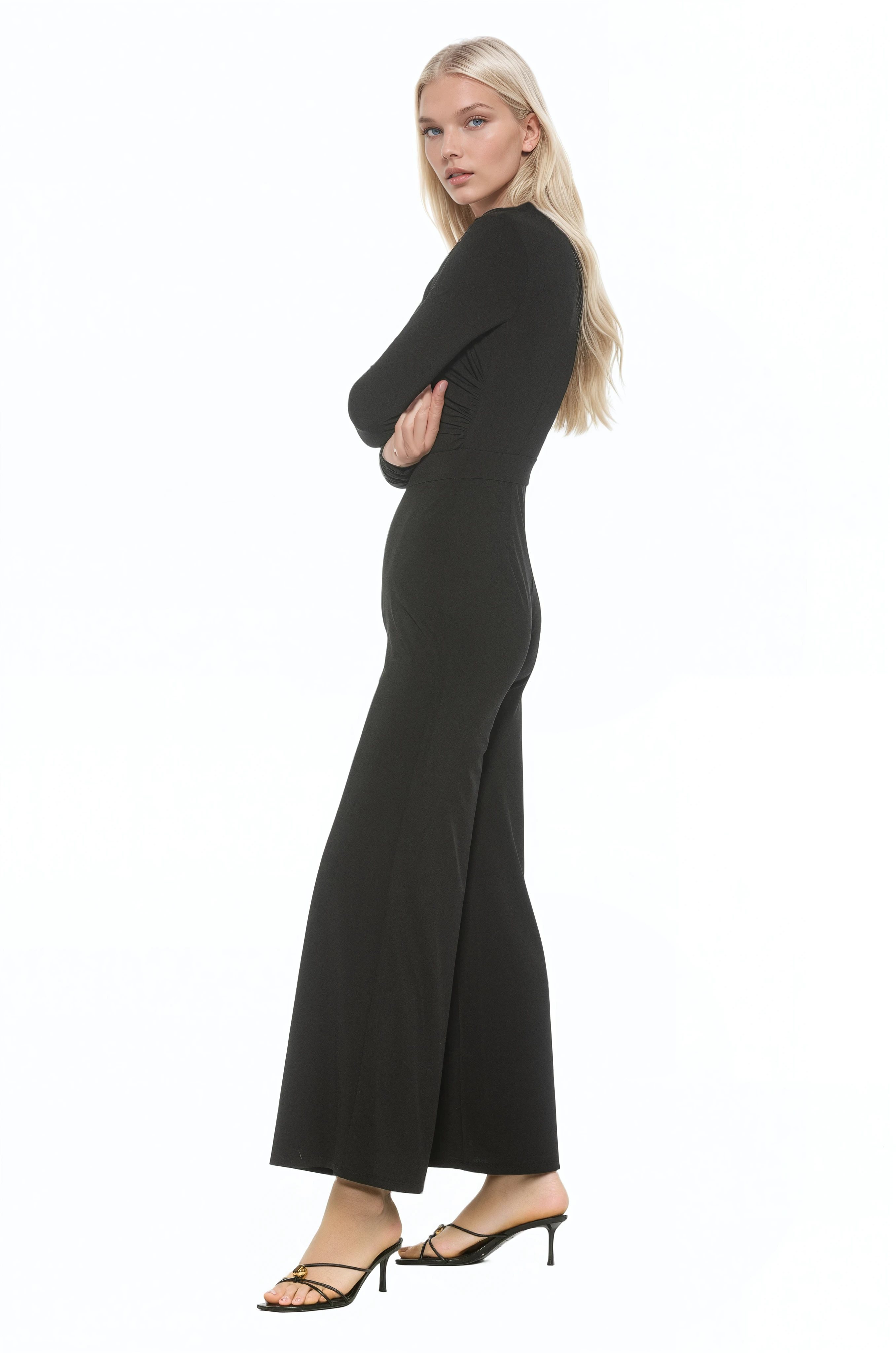Sleek, modern, and effortlessly elegant, the Yael Long Sleeve Ruched Top Jumpsuit is designed to flatter with clean lines and soft draping. Crafted from a smooth stretch jersey, this full-length jumpsuit features a beautifully ruched bodice that creates dimension and a sculpted silhouette, balanced by streamlined wide legs. The long sleeves and subtle draping lend an elevated, minimalist feel, while full lining ensures comfort and coverage. Finished with a center-back invisible zipper and hook-and-eye closure for a clean, polished look.