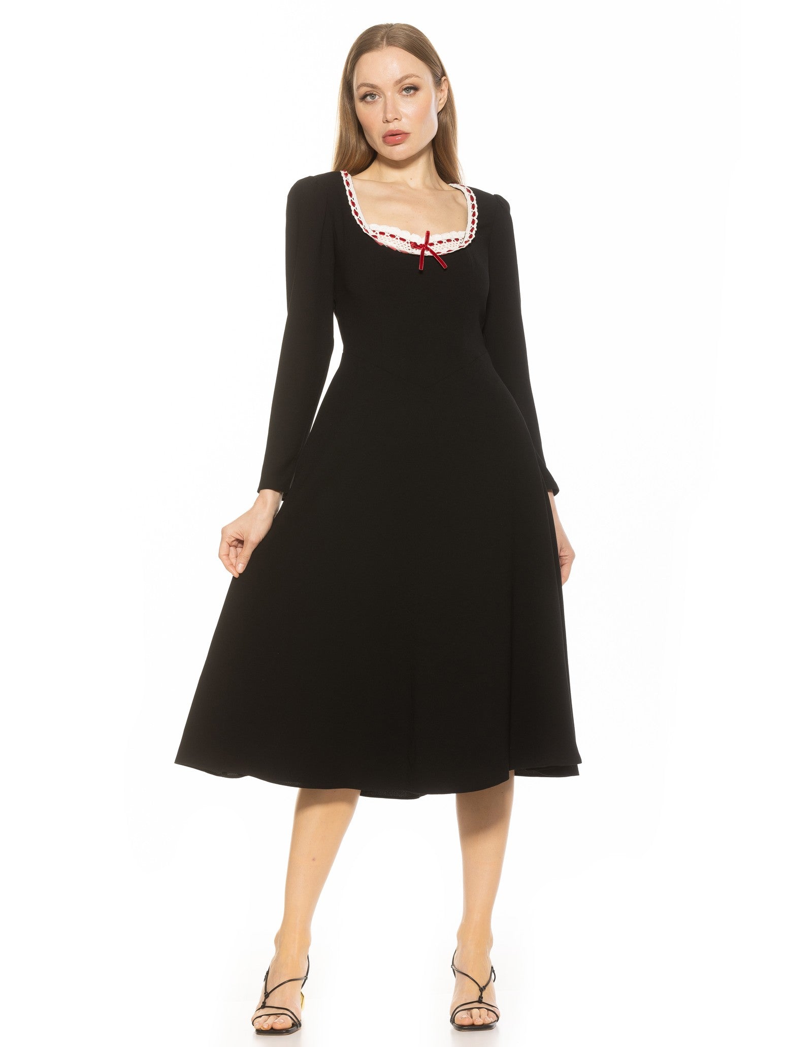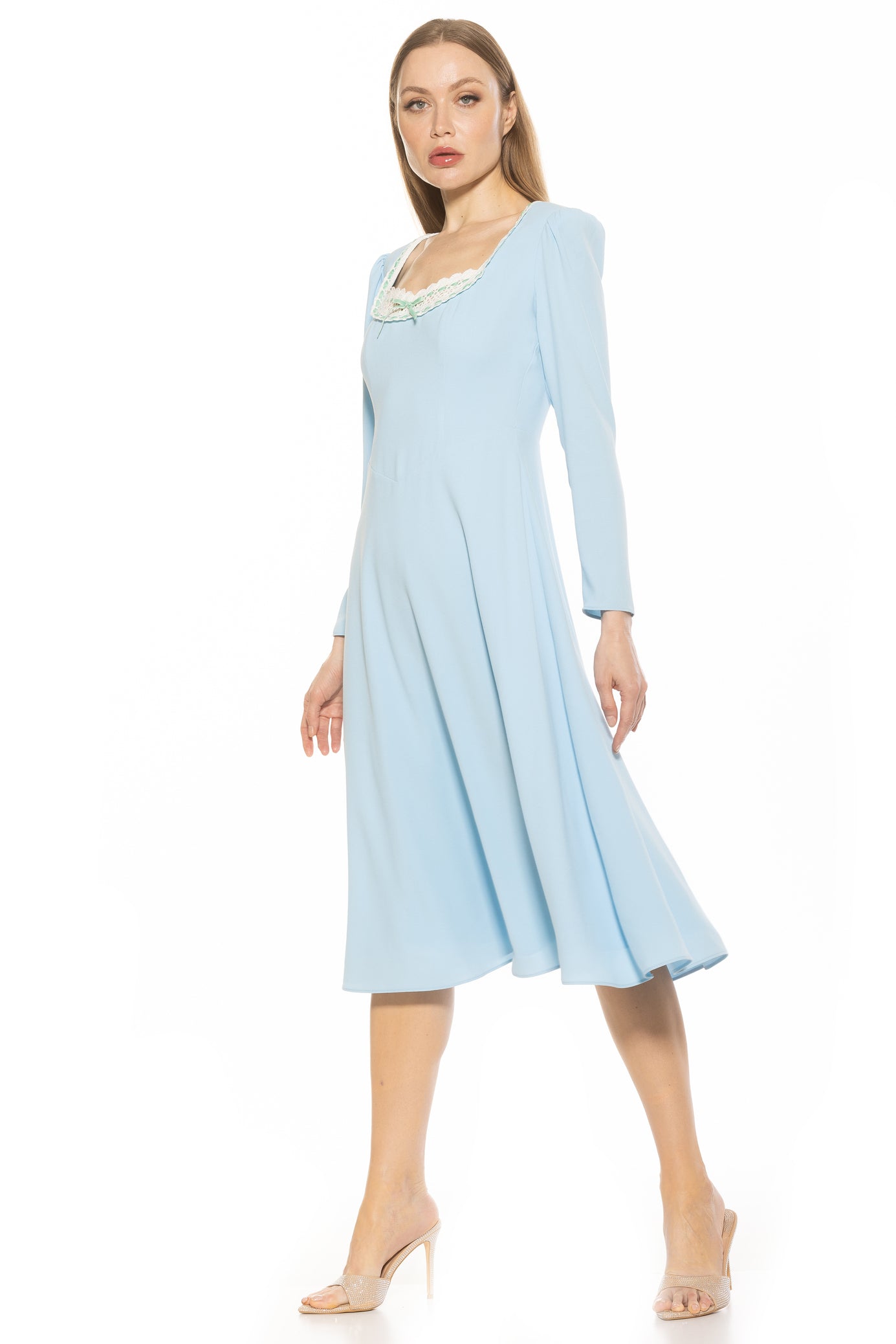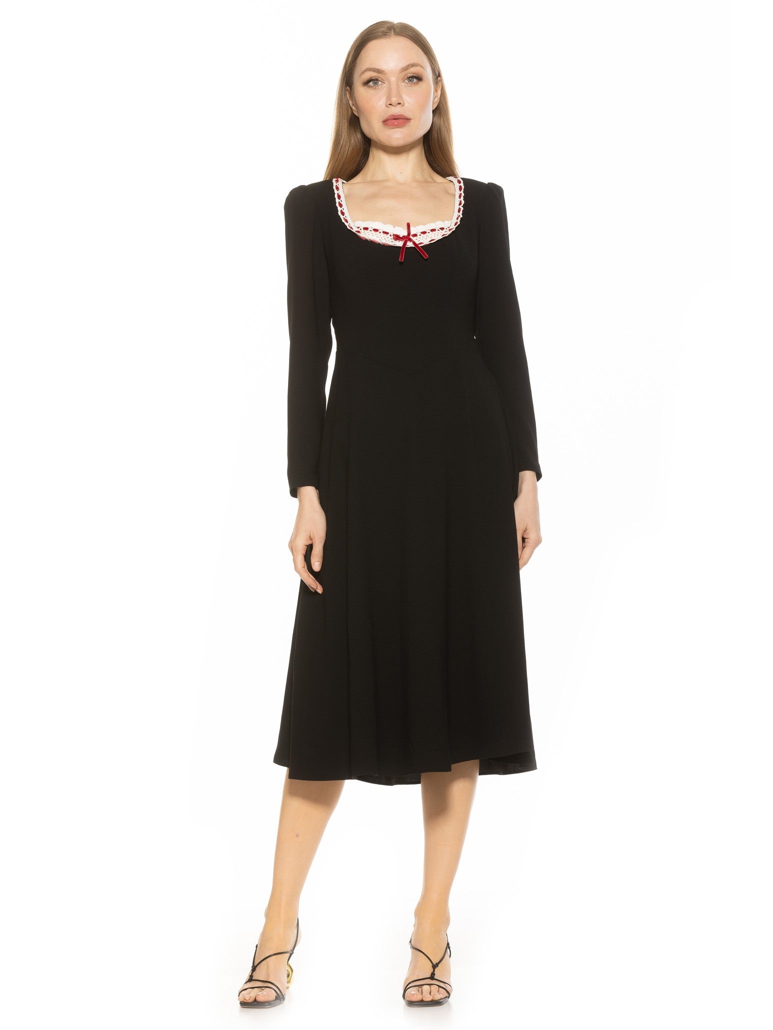 Indulge in luxury with our Zenaida Dress. This gorgeous midi dress features long sleeves and intricate lace detailing, elevating any occasion. The fitted bodice flatters your figure and flows into a flared midi skirt. With a true-to-size fit, this dress is perfect for making a statement.