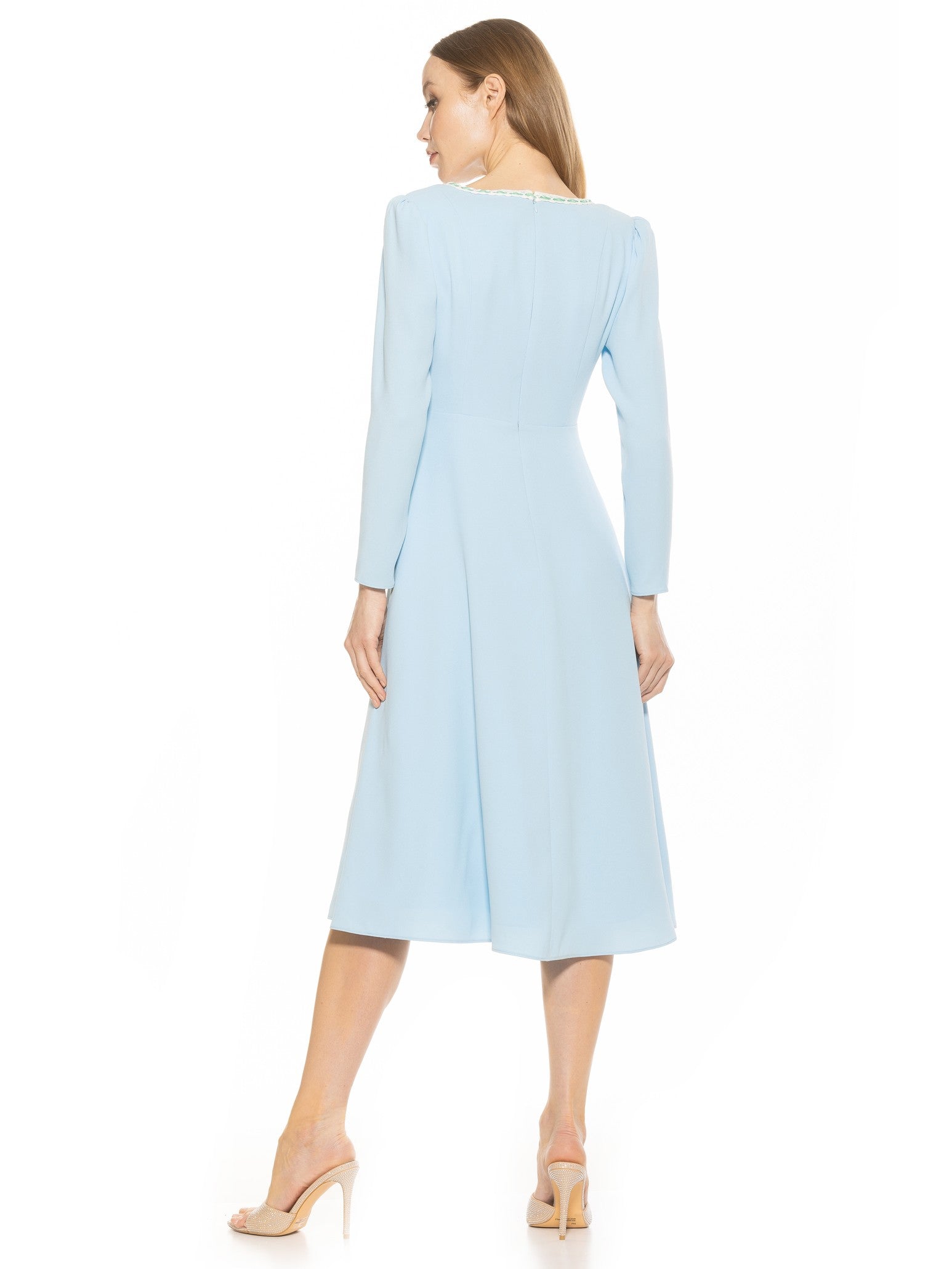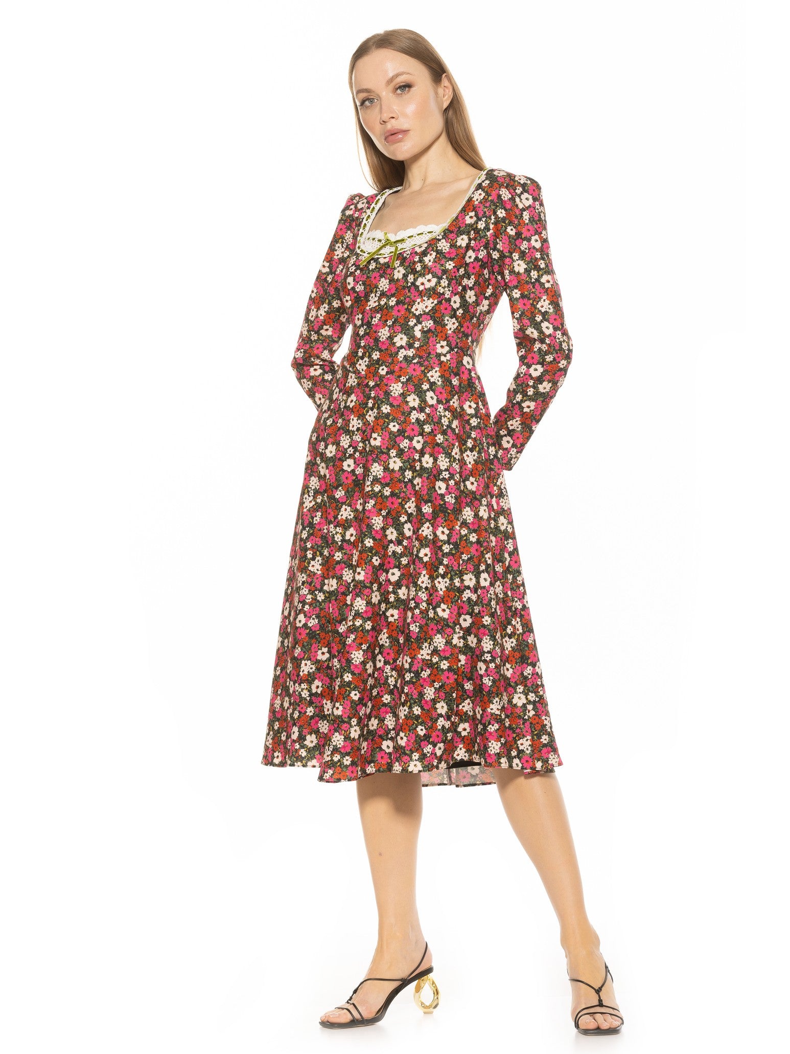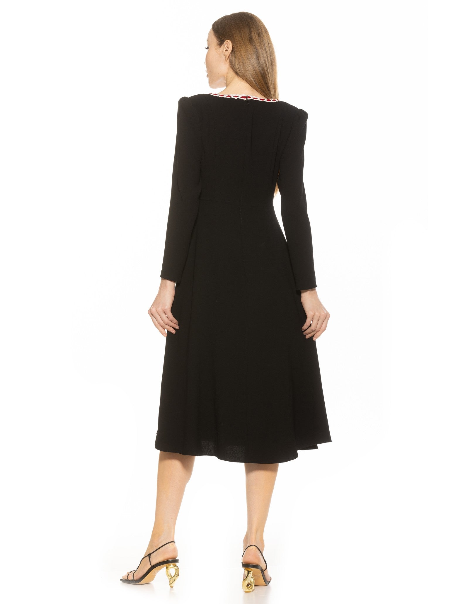 Indulge in luxury with our Zenaida Dress. This gorgeous midi dress features long sleeves and intricate lace detailing, elevating any occasion. The fitted bodice flatters your figure and flows into a flared midi skirt. With a true-to-size fit, this dress is perfect for making a statement.