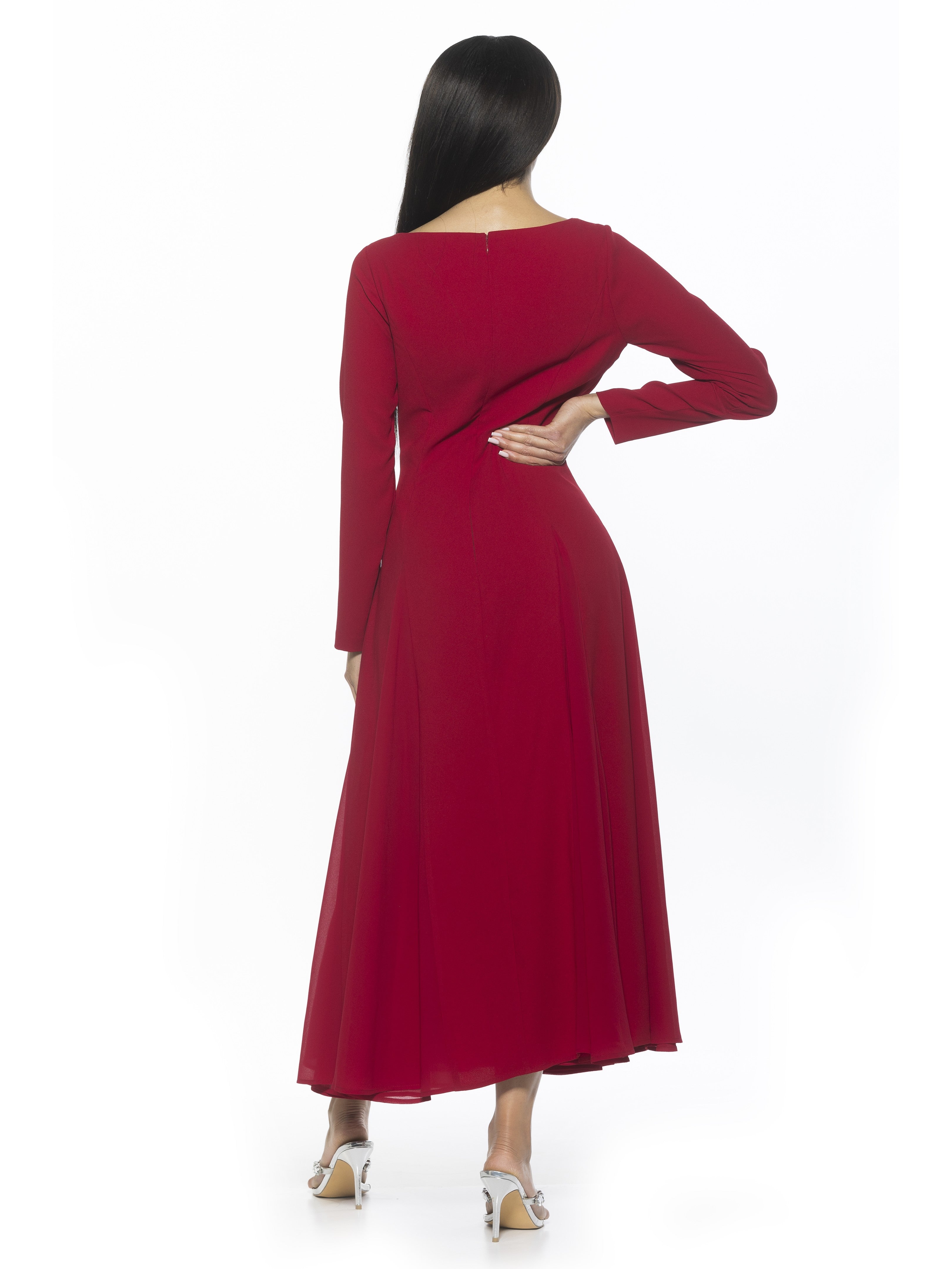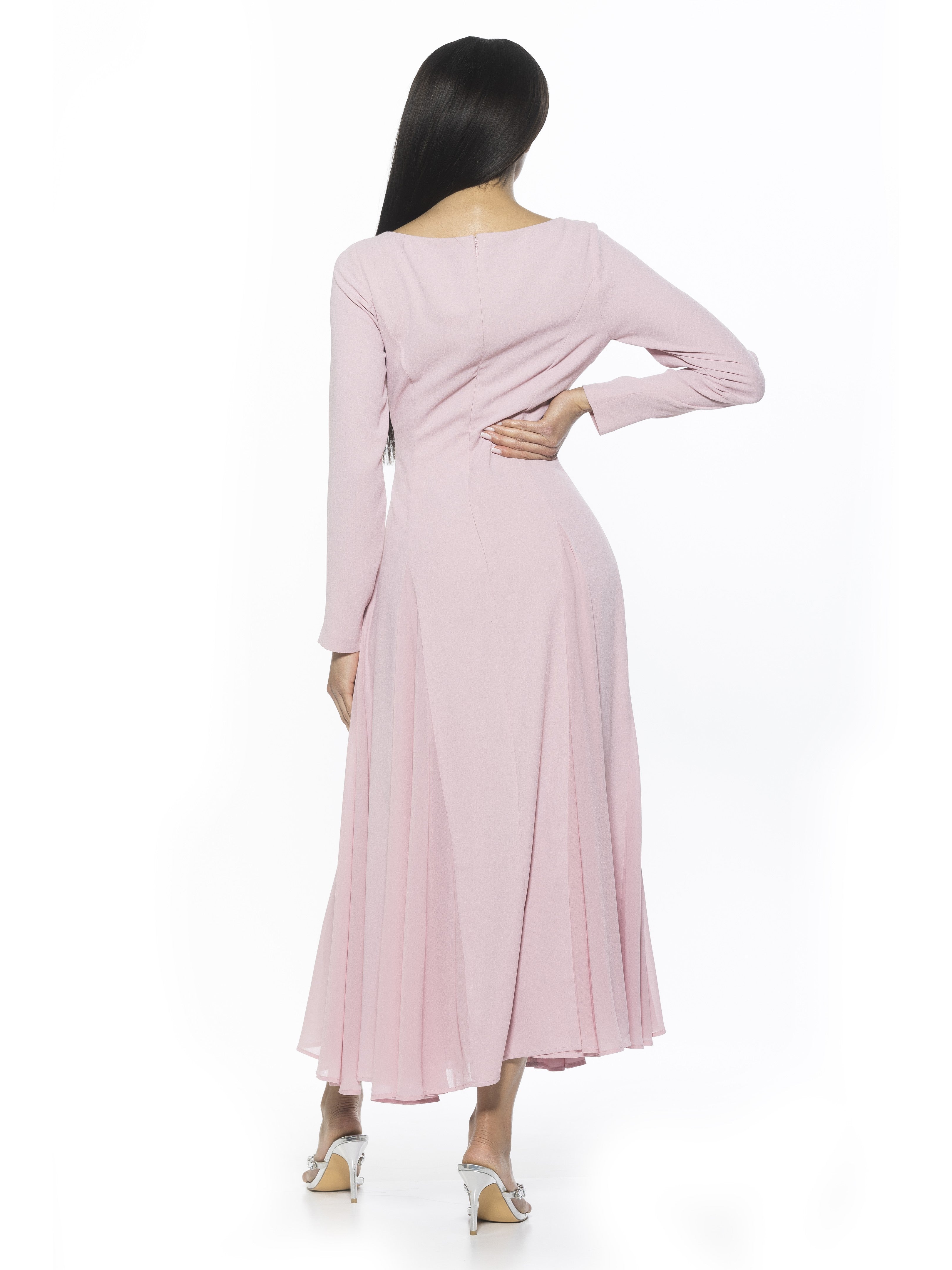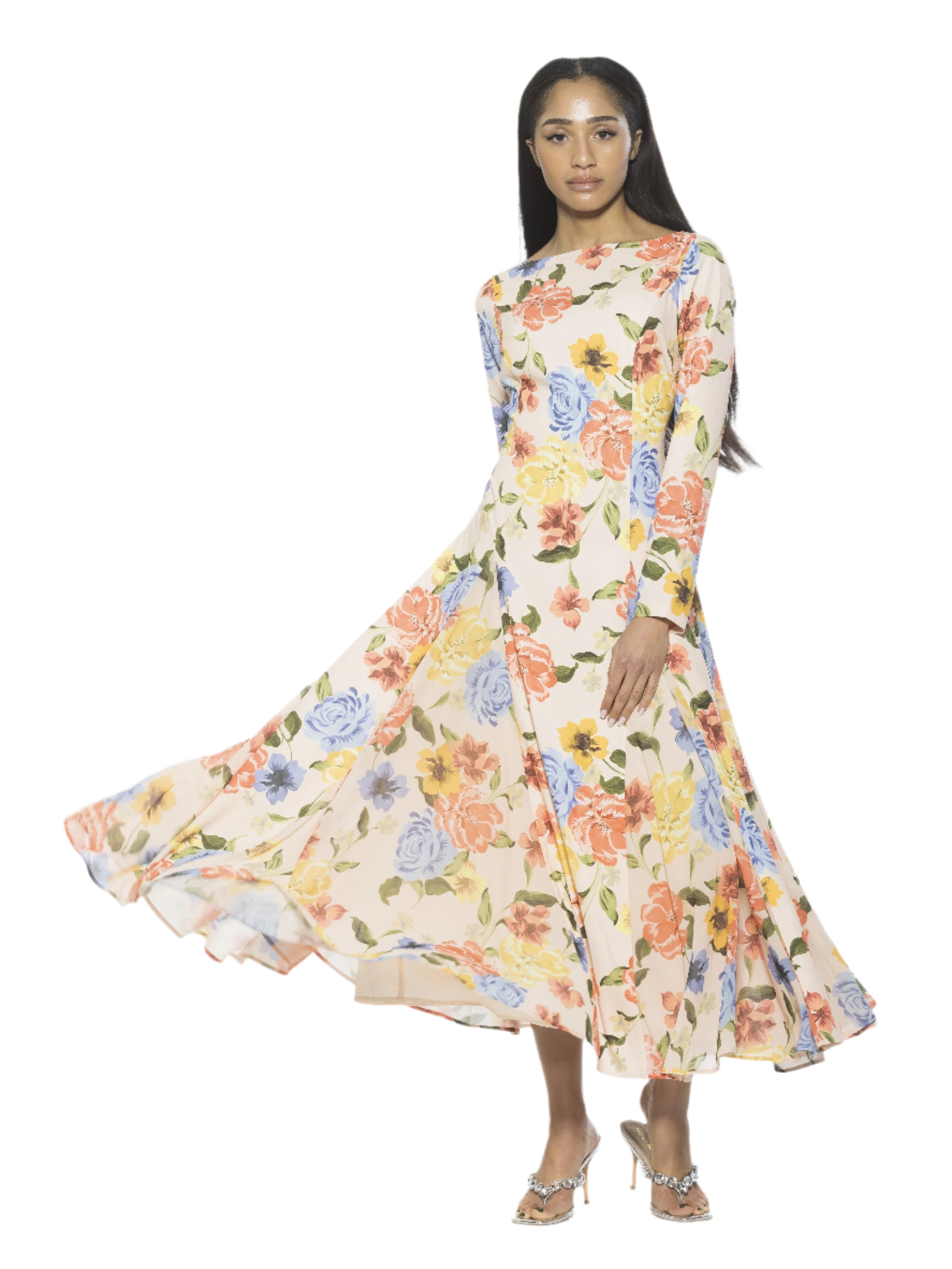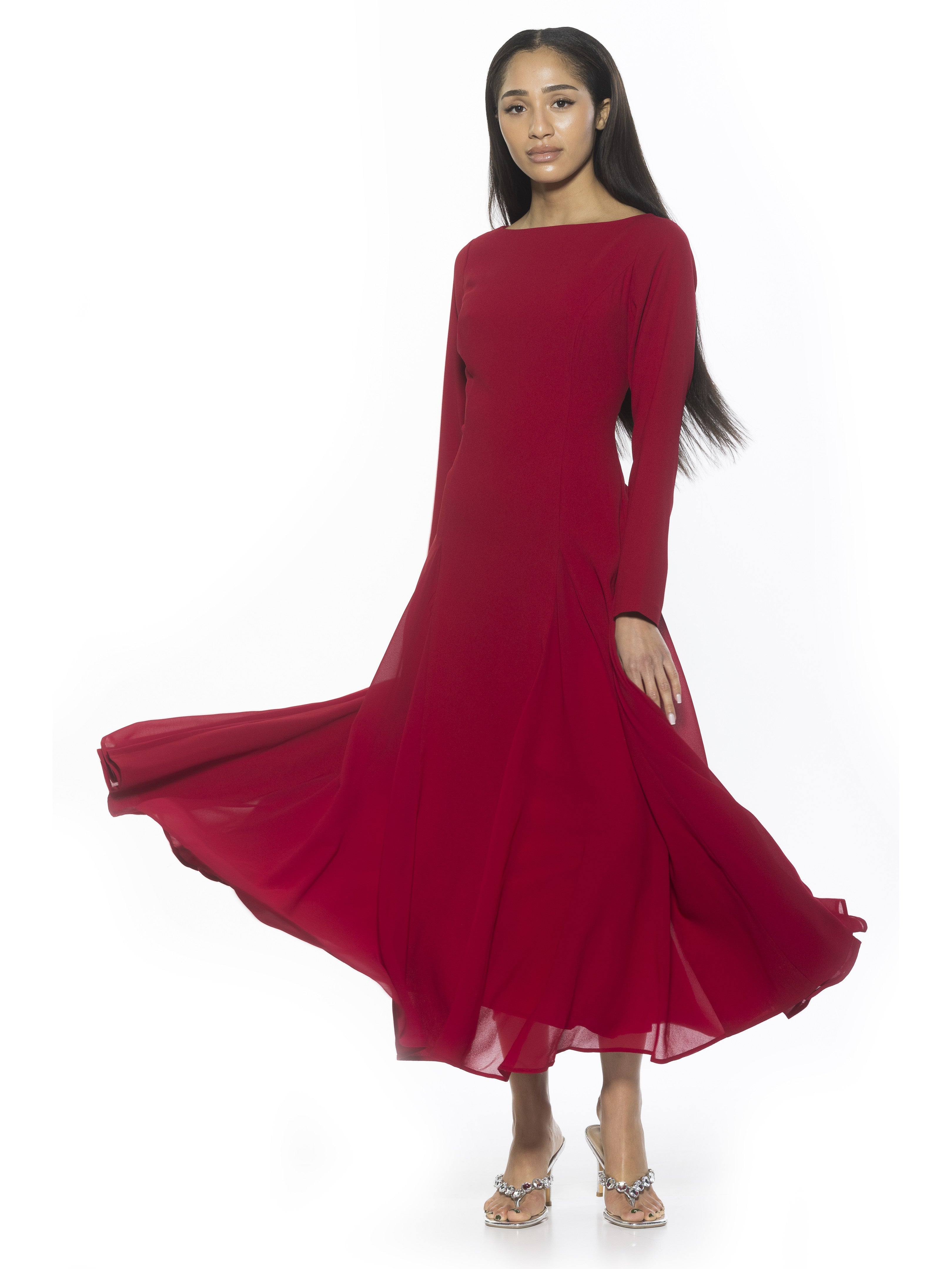 - Sculptural fit-and-flare silhouette with dramatic godets for movement.
