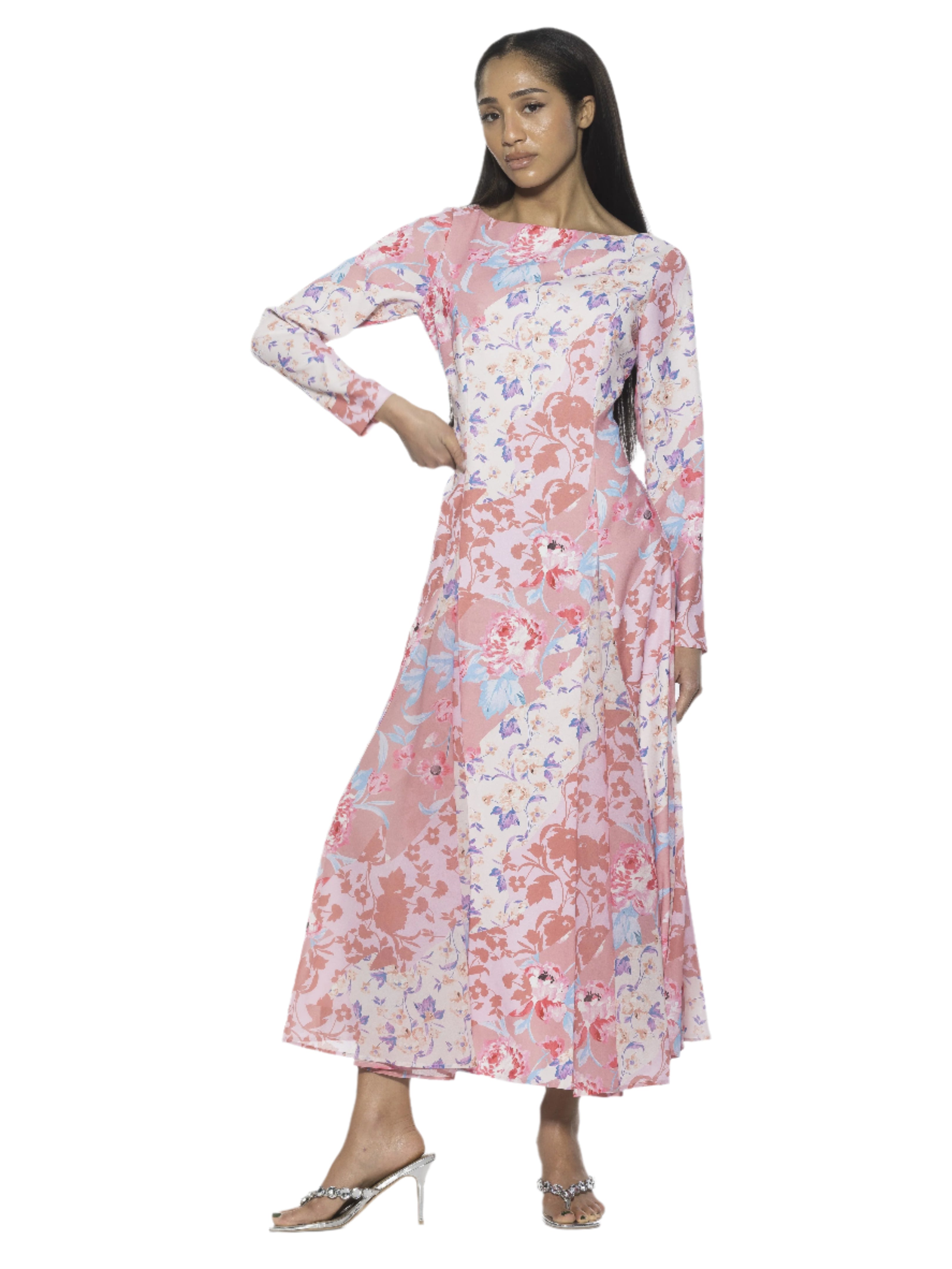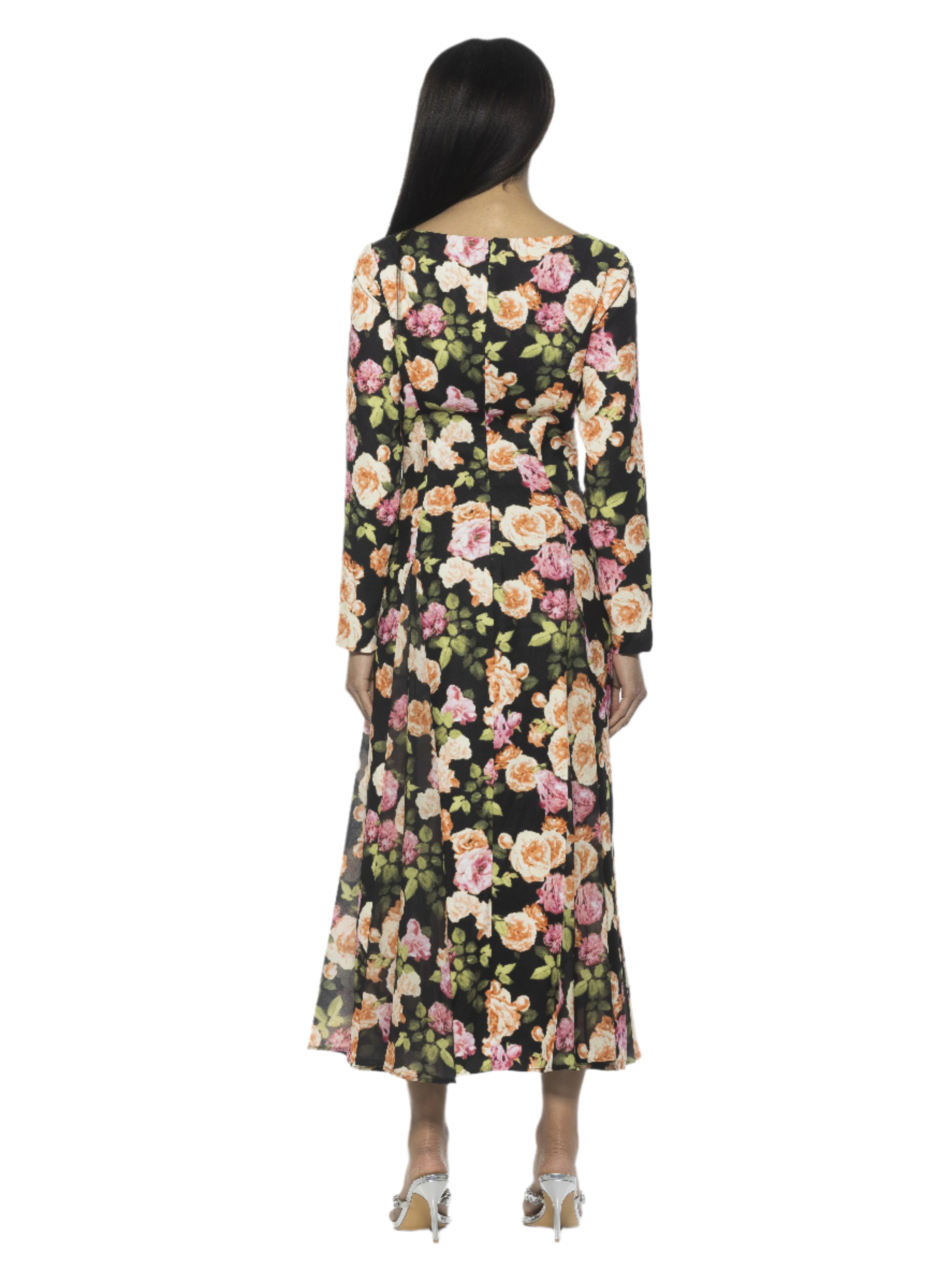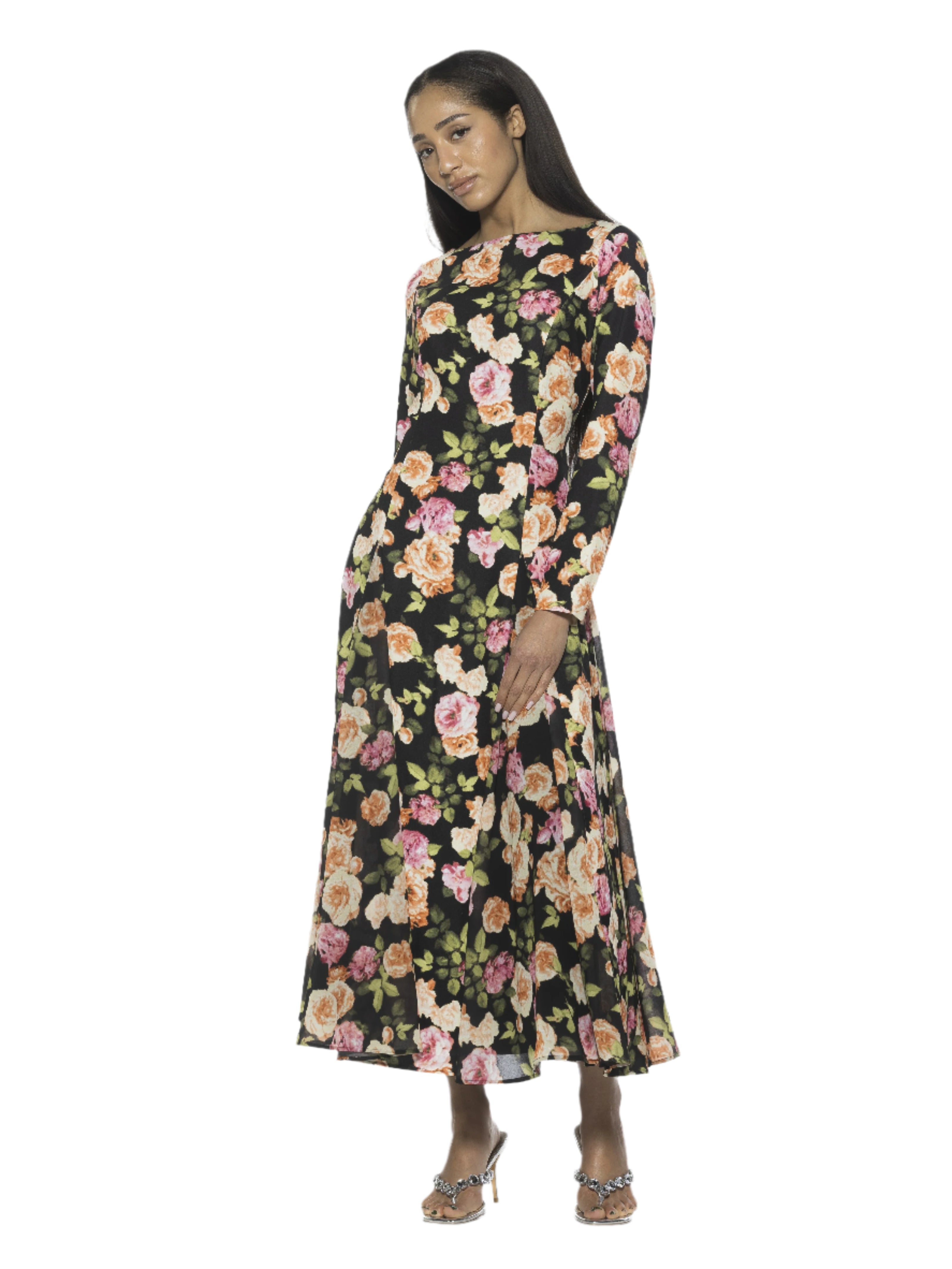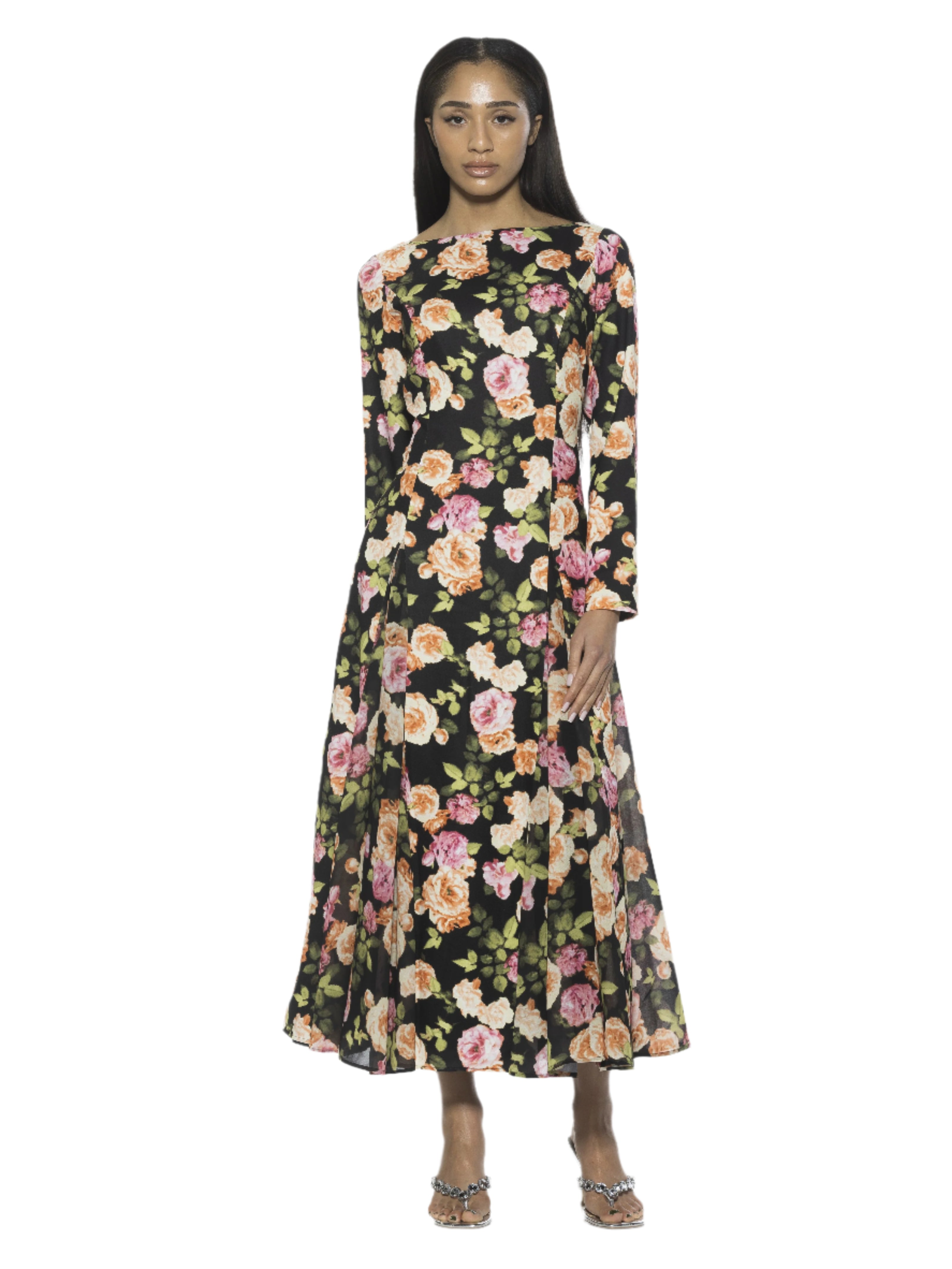 - Sculptural fit-and-flare silhouette with dramatic godets for movement.