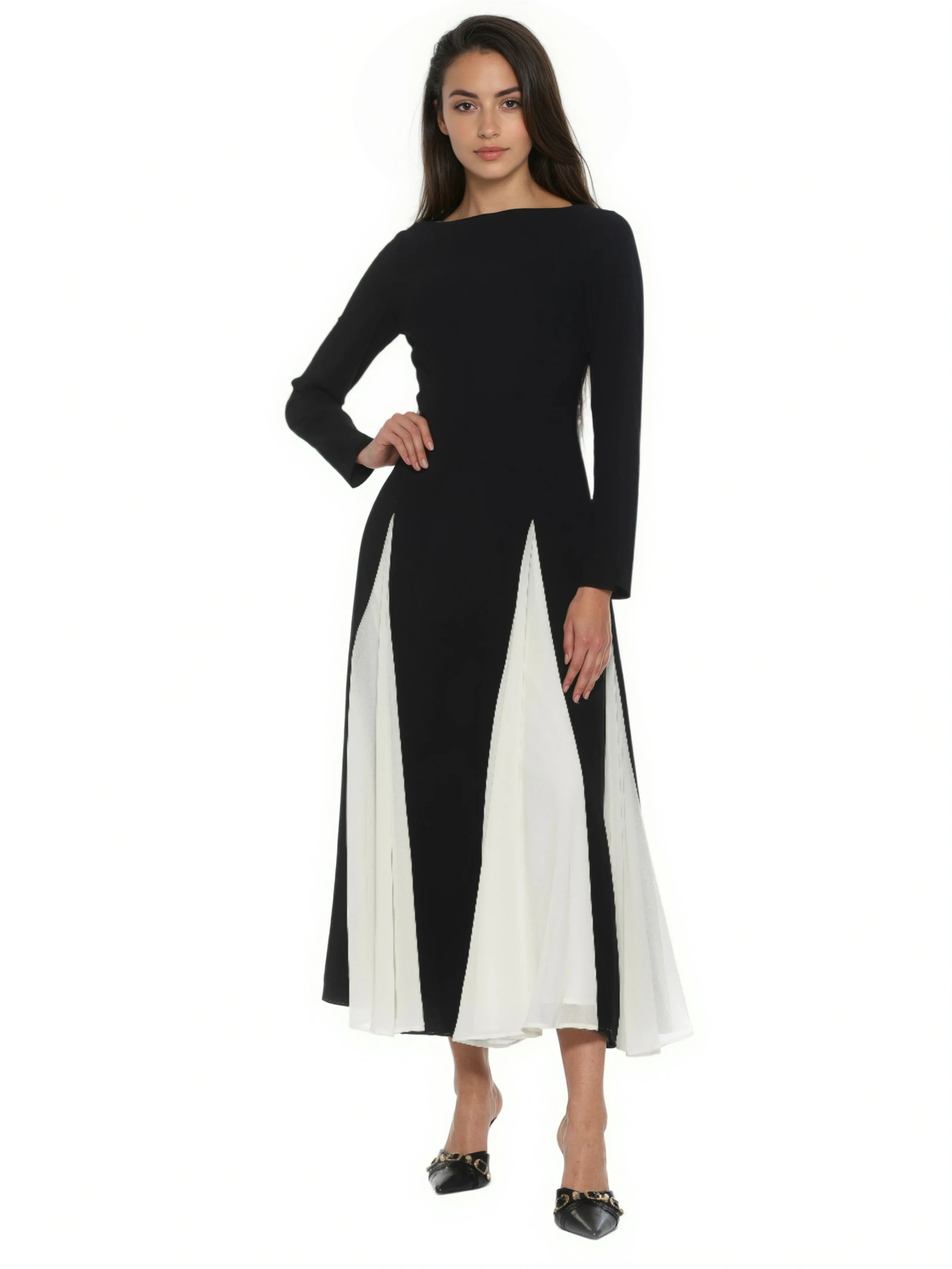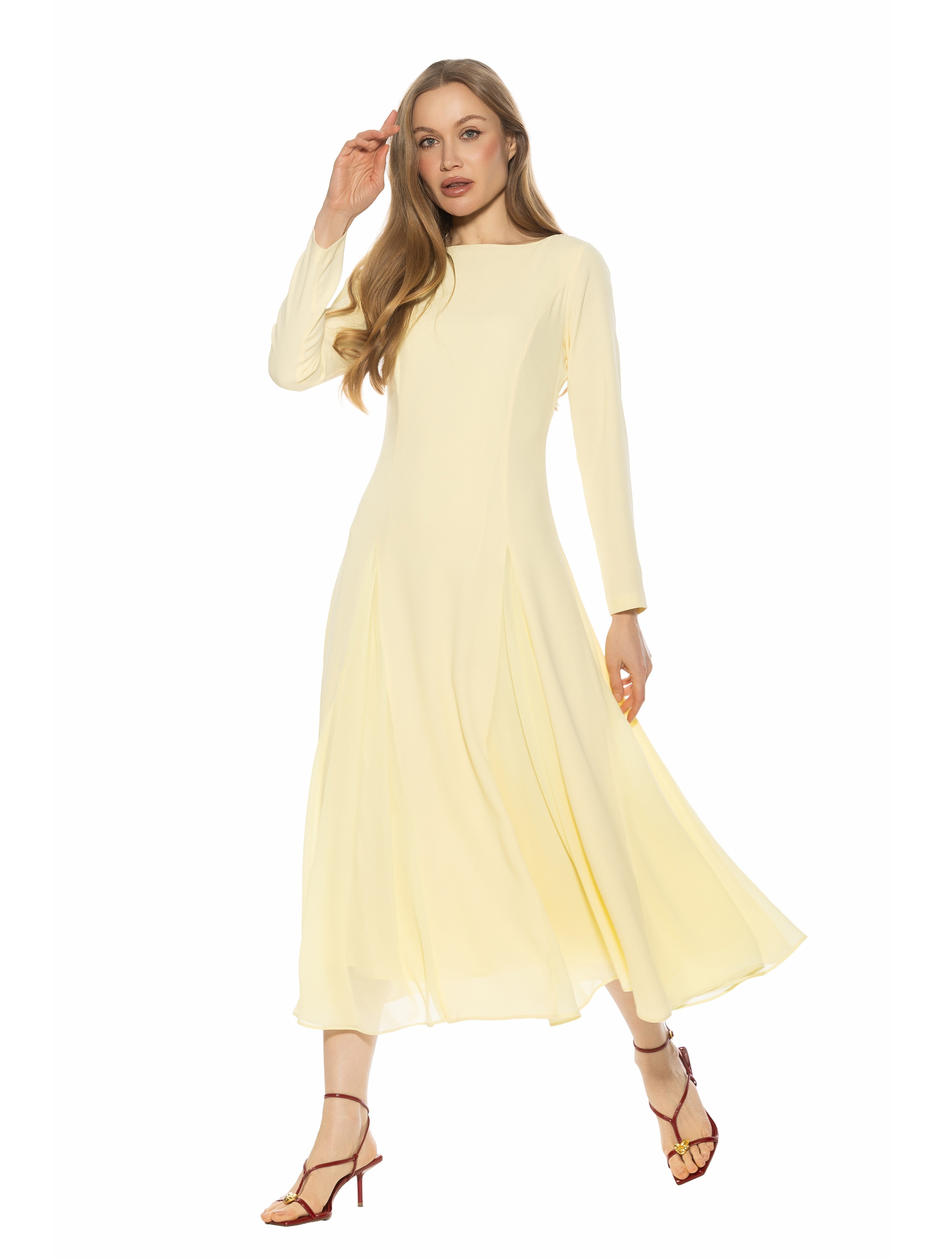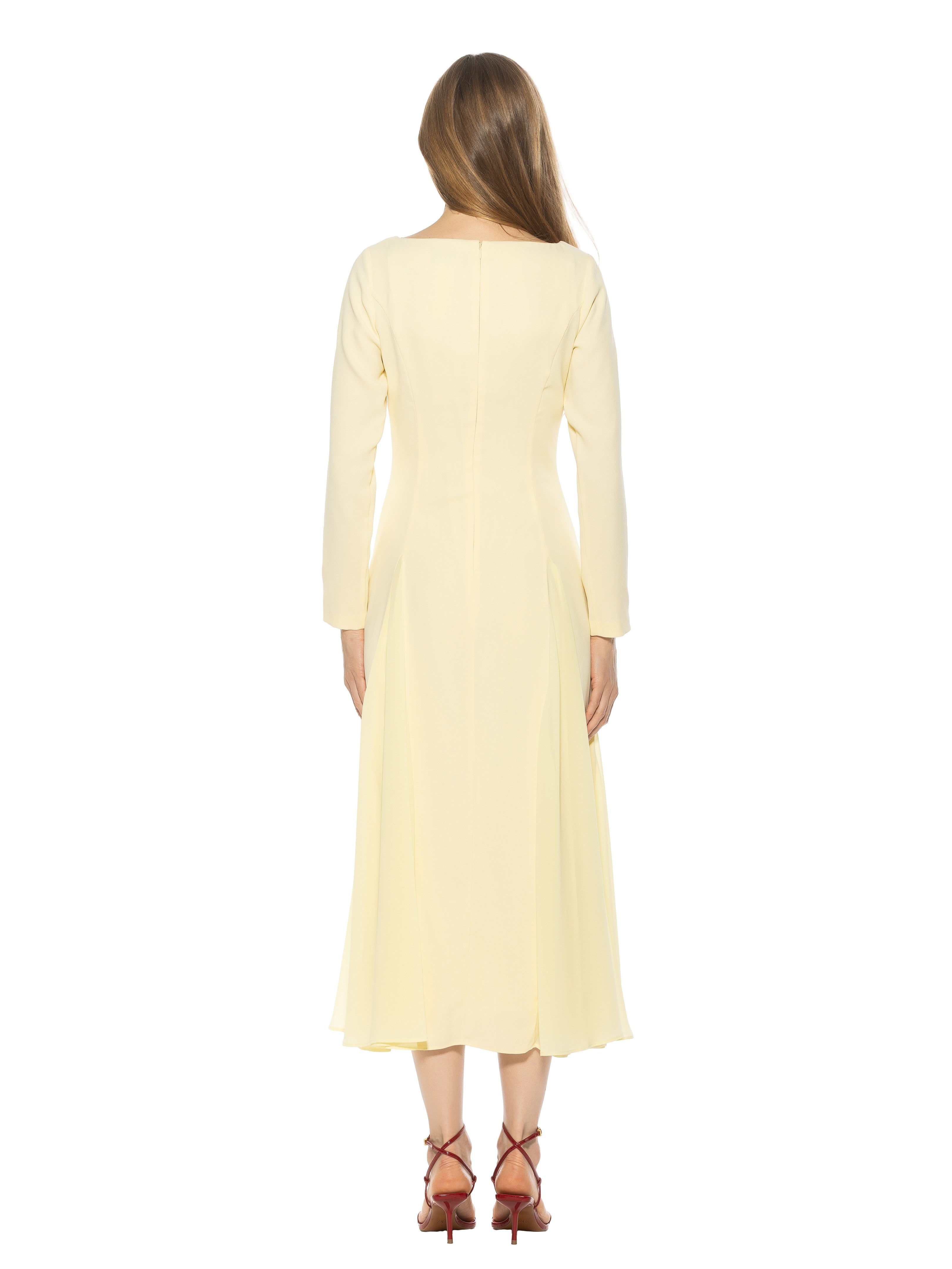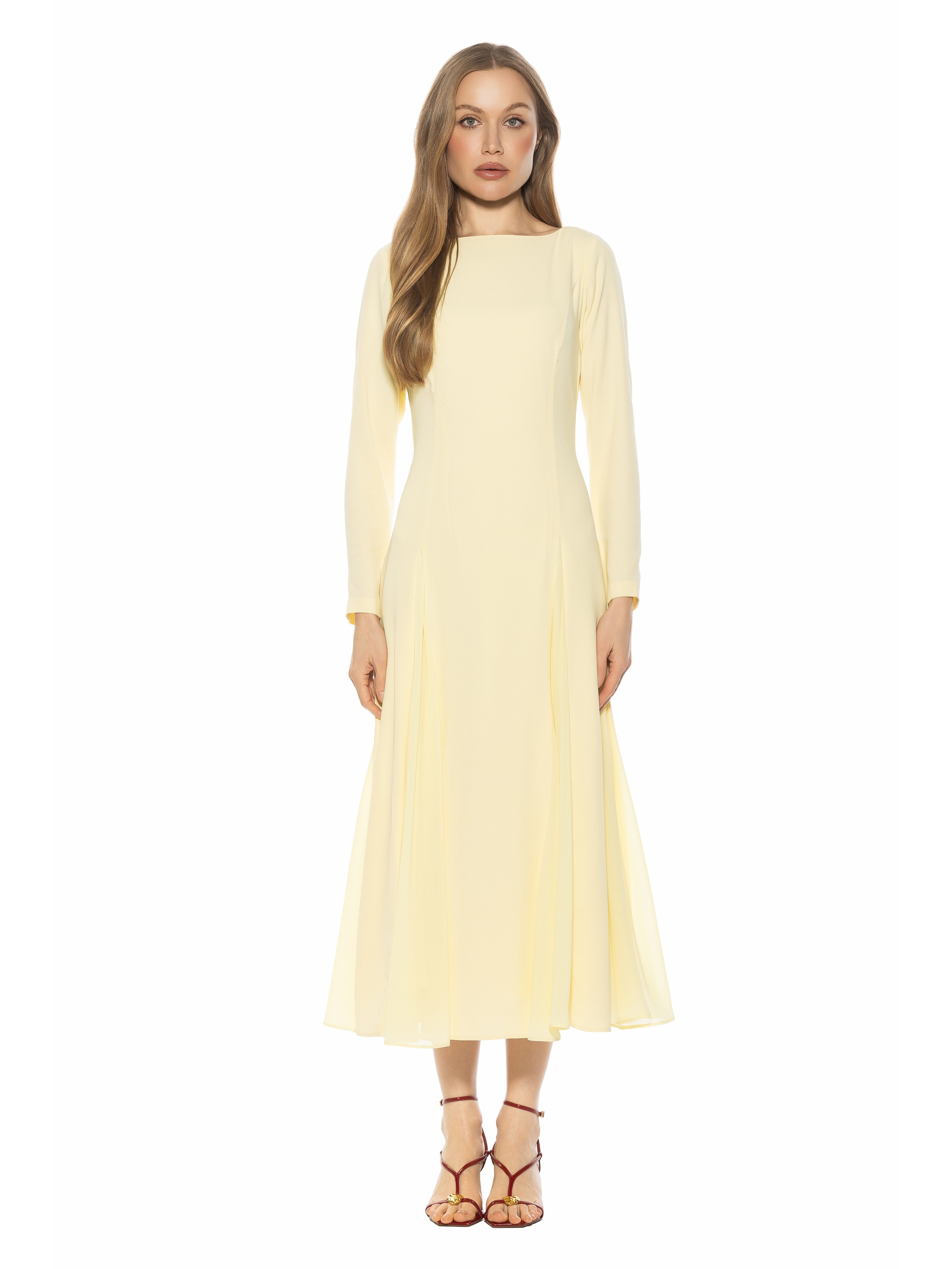 A poetic blend of timeless femininity and modern structure, this midi silhouette is elevated by artfully placed godets that create a sweeping, full skirt. With a refined crewneck and gracefully elongated sleeves, it drapes with a quiet confidence that moves from daytime appointments to candlelit evenings with ease. Crafted in luxe woven crepe that holds shape while flowing with every step, this dress epitomizes cultivated style and lasting allure. This Dress Runs Small.