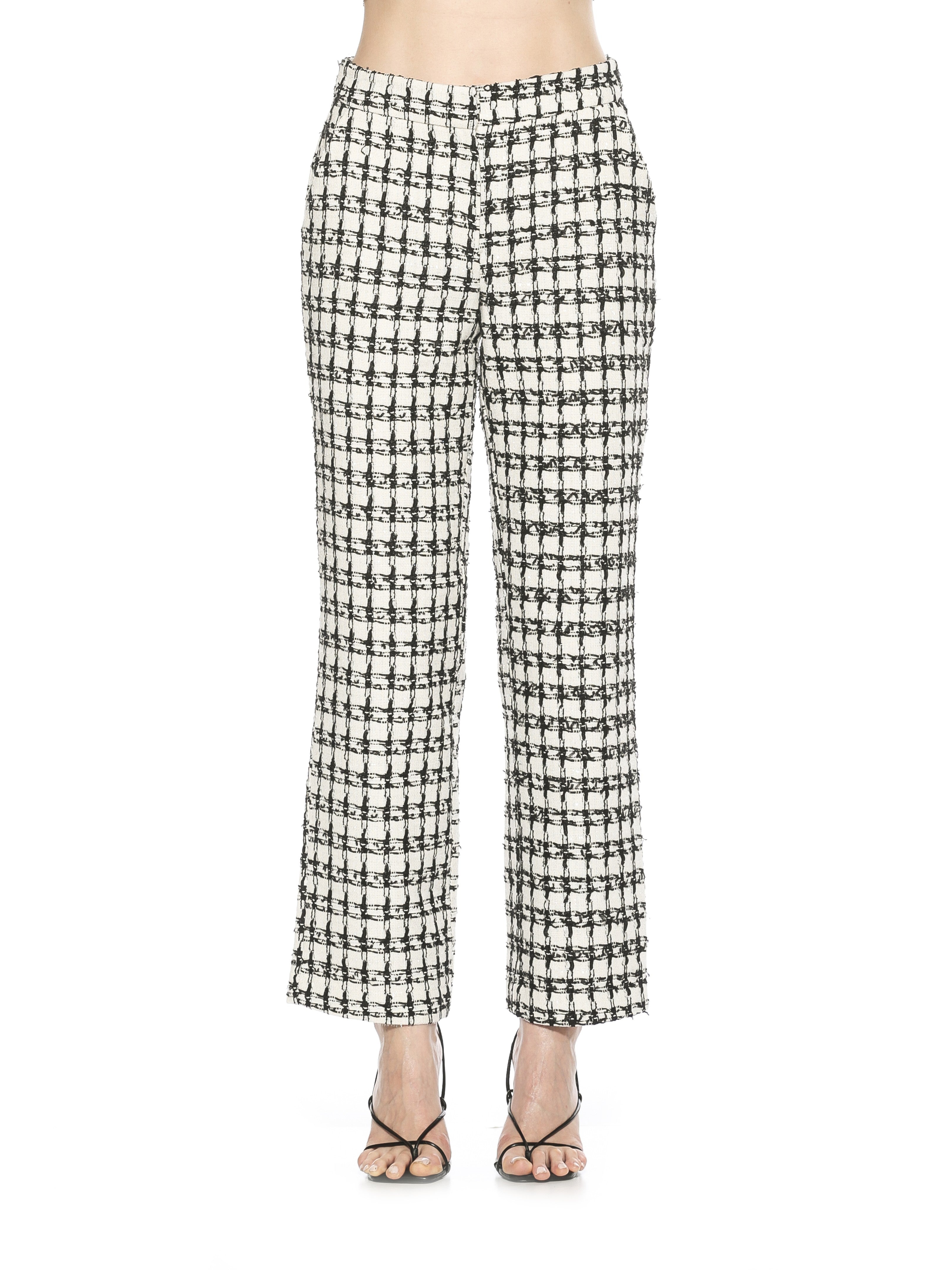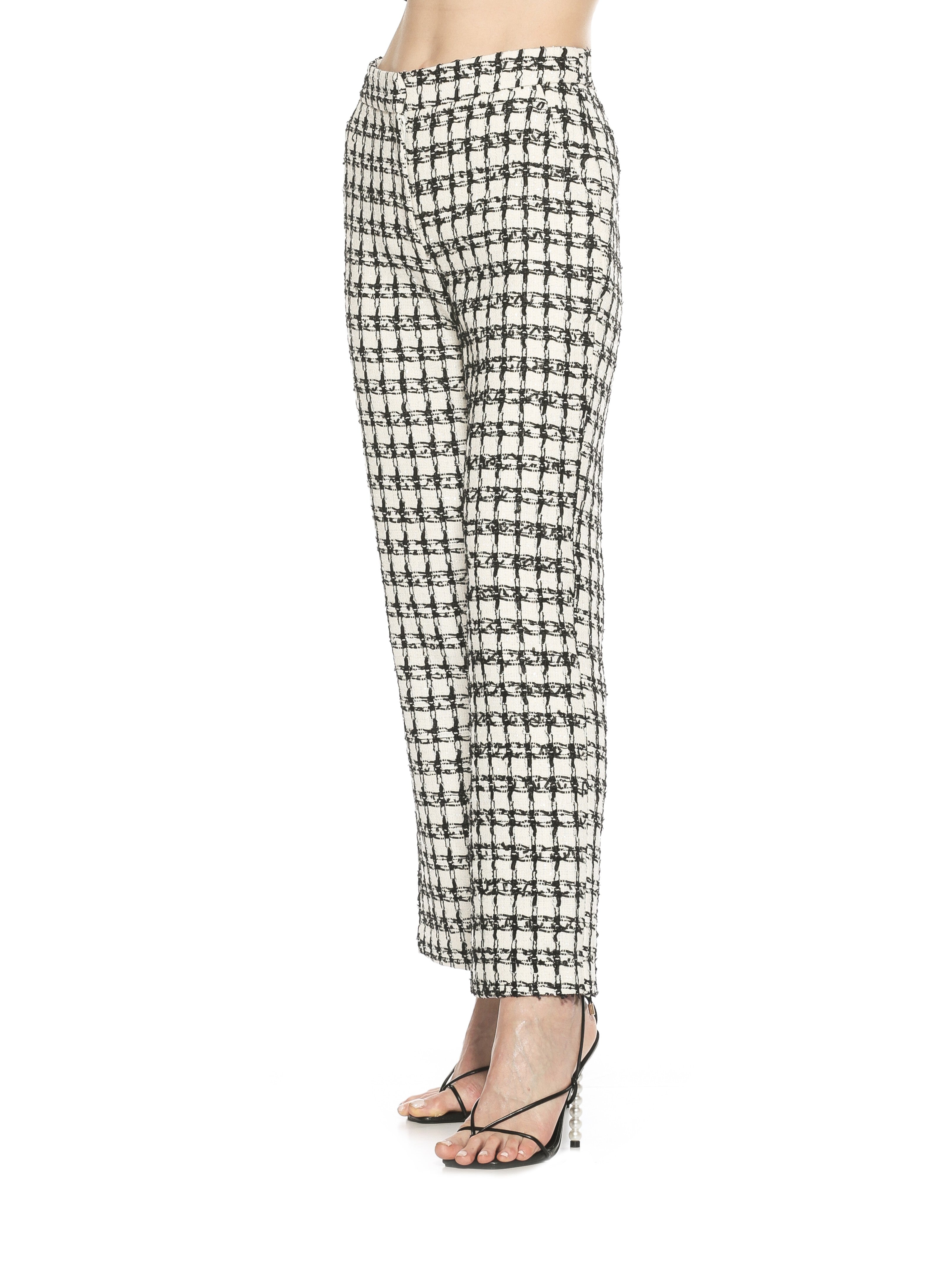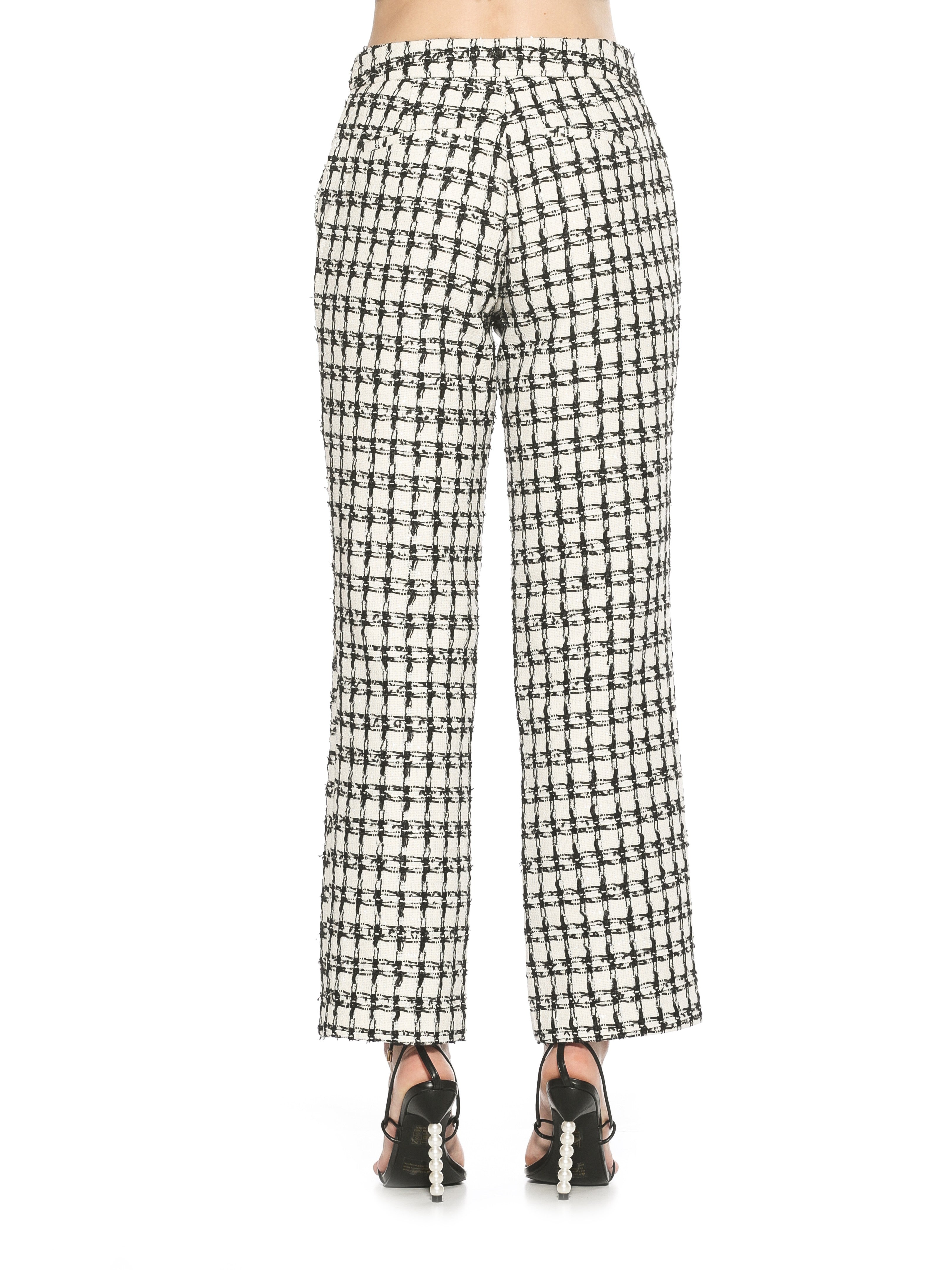 Revel in the high-quality tweed design and sleek silhouette of our wide leg pants. Featuring a zip fly complete with an elegant hook-and-bar closure and four-pocket style, these are the perfect luxurious addition to your wardrobe. With a high rise that hugs your form elegantly, you'll be sure to stand out amongst the crowd.