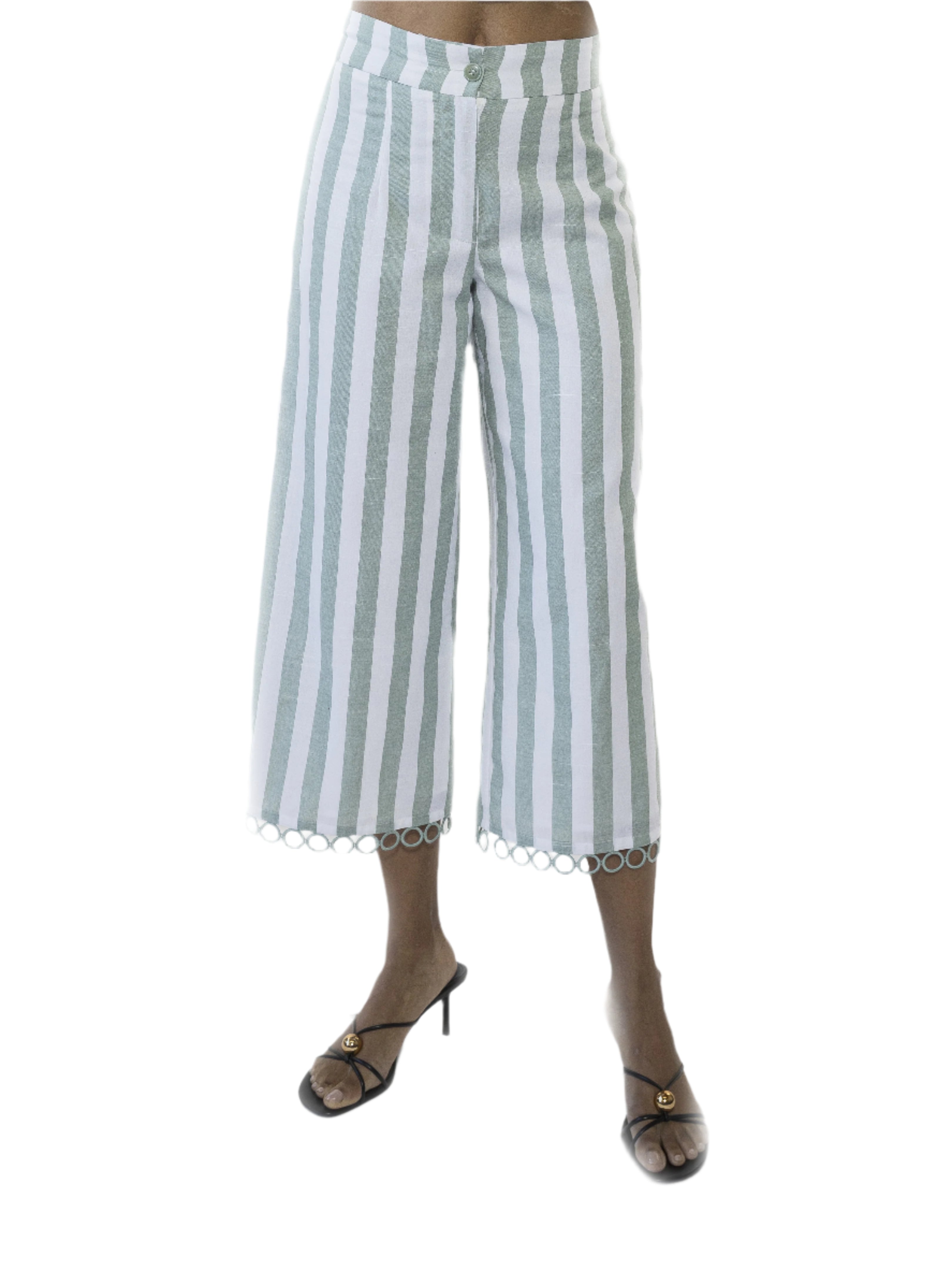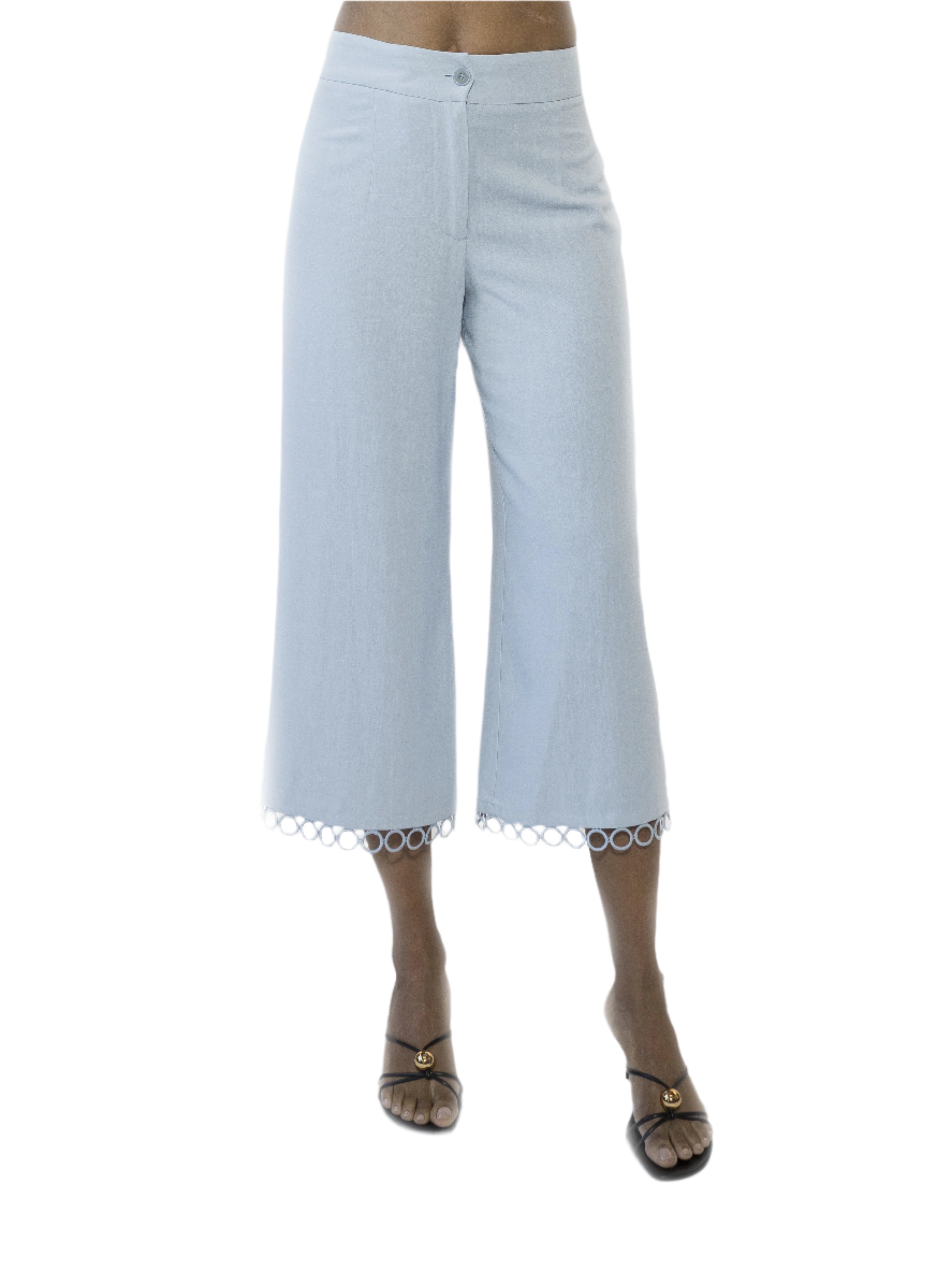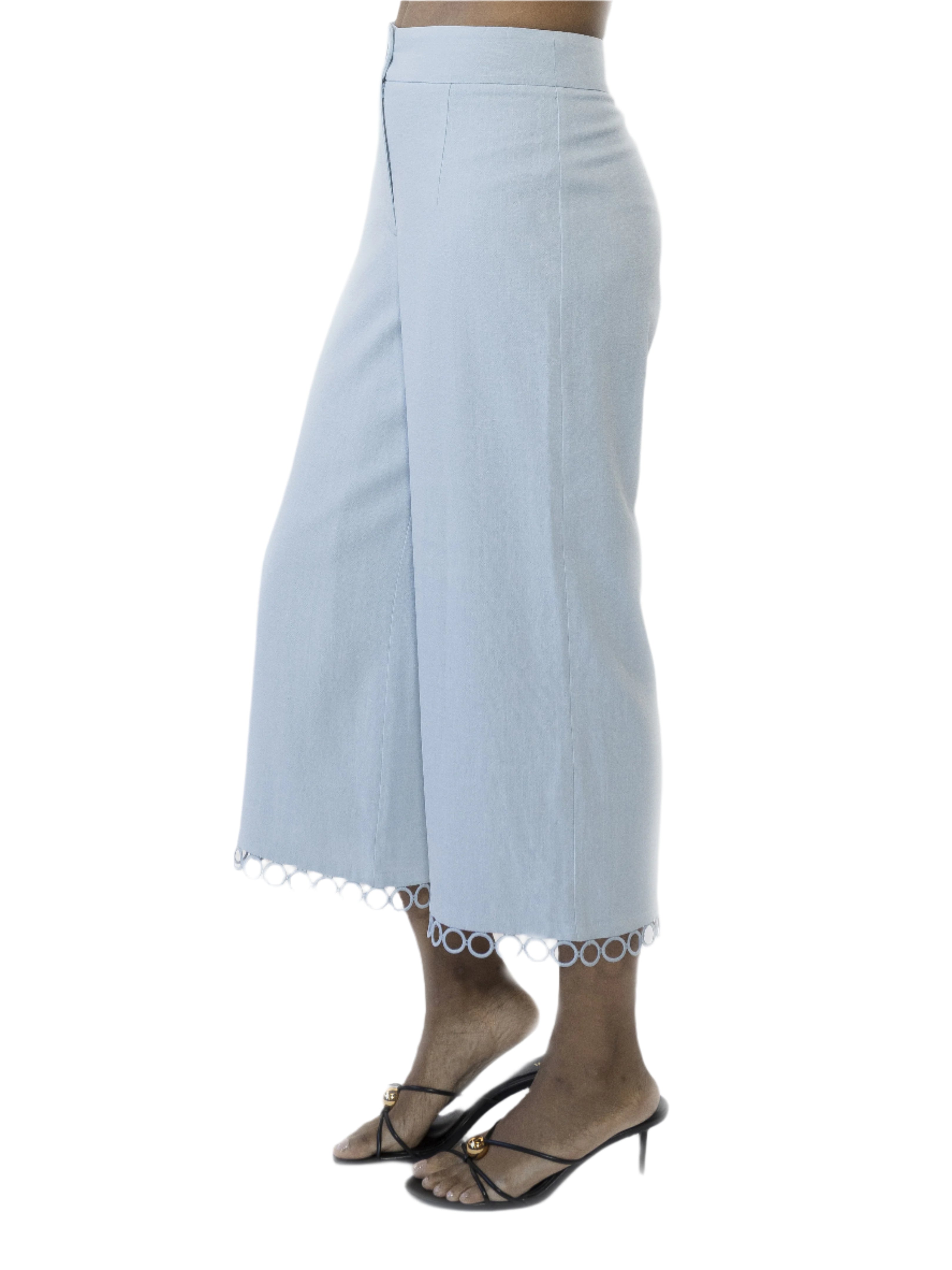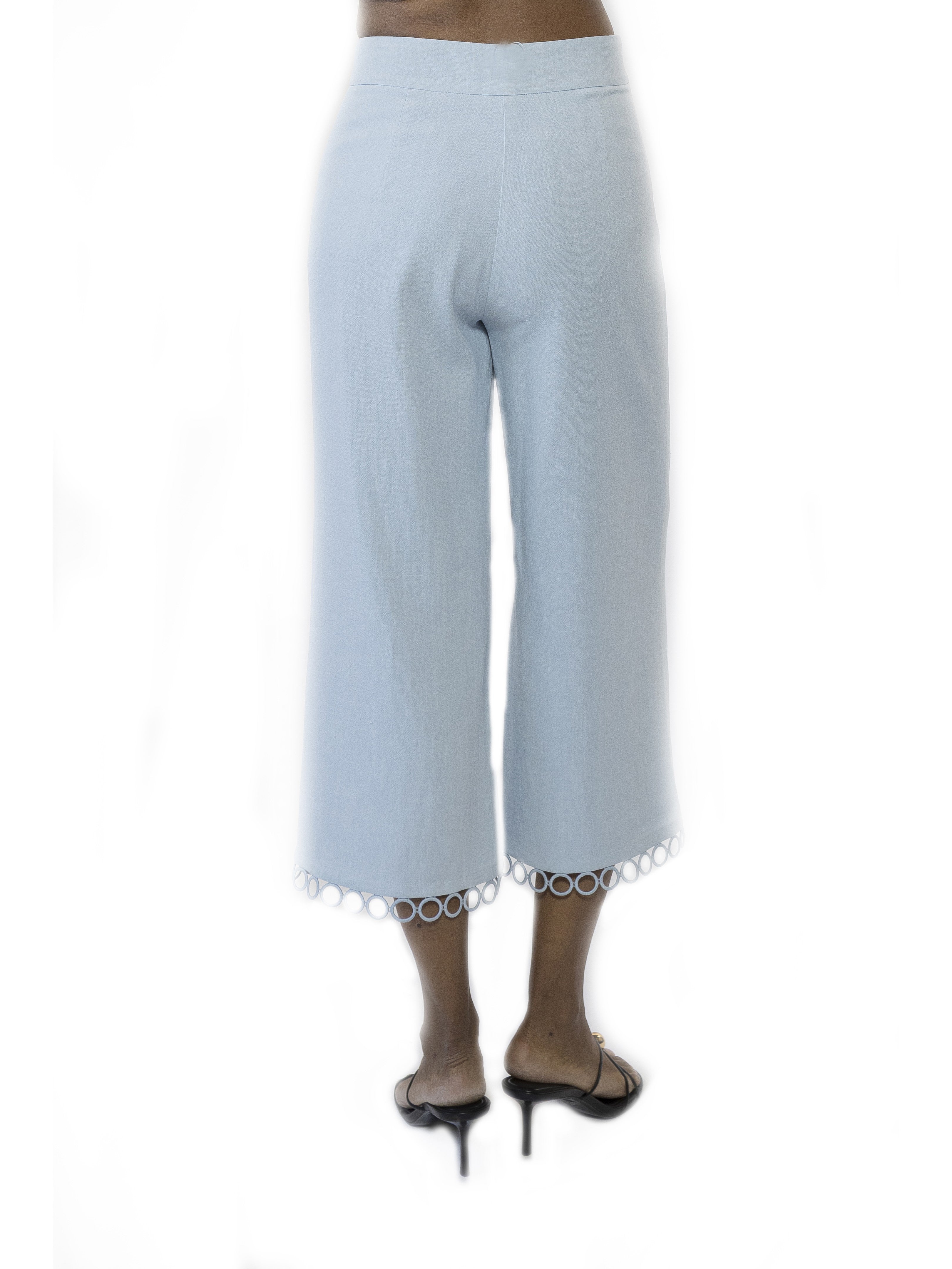 The Lucy Ankle Length Wide Leg Pants With Circle Trim Is A Must Have For Your Wardrobe. This Pant Features Luxe Cotton Or Linen Blend Fabric, Ankle Length, And Unique Trim At Hem. This Item Fits True To Size.
