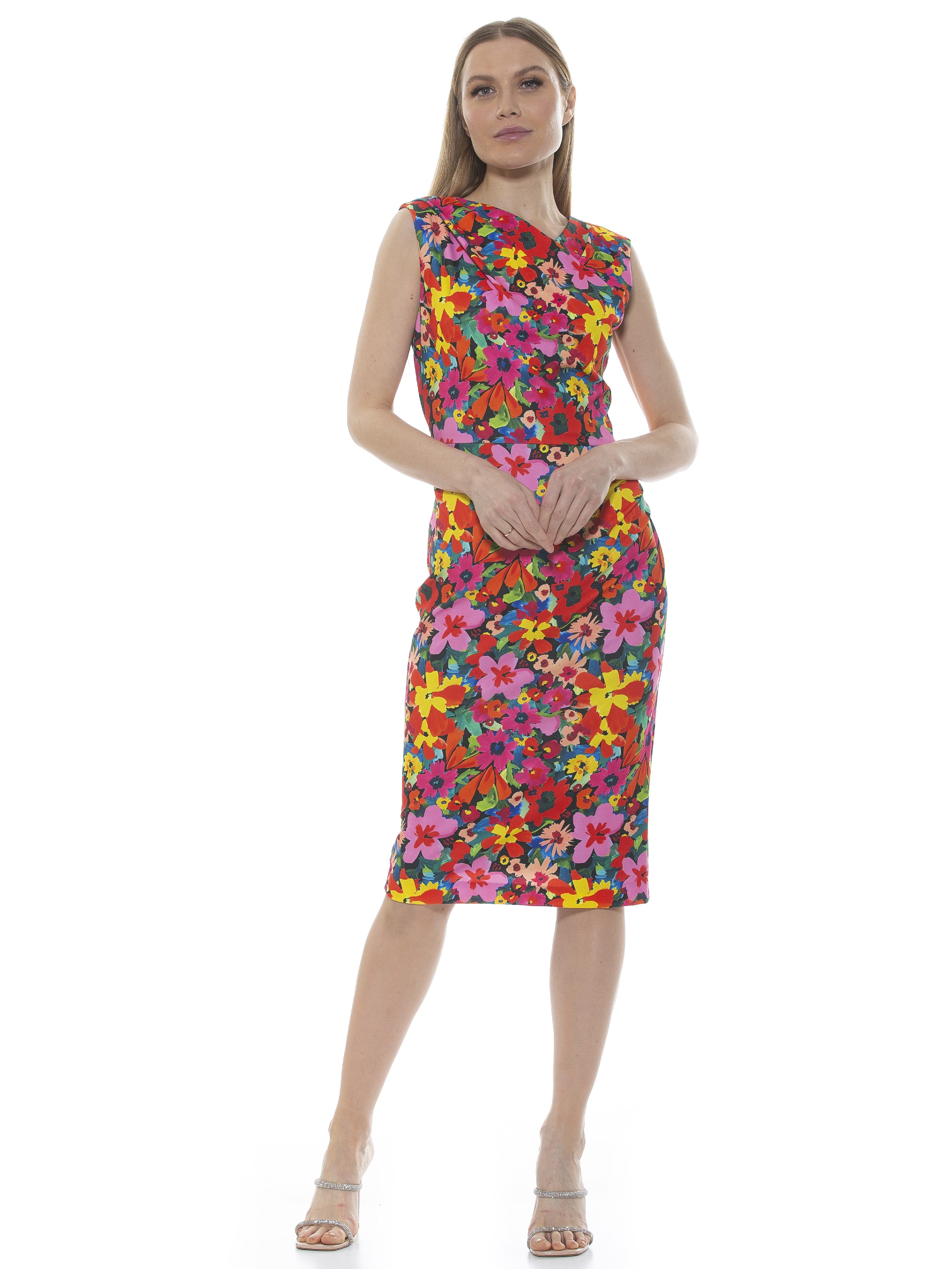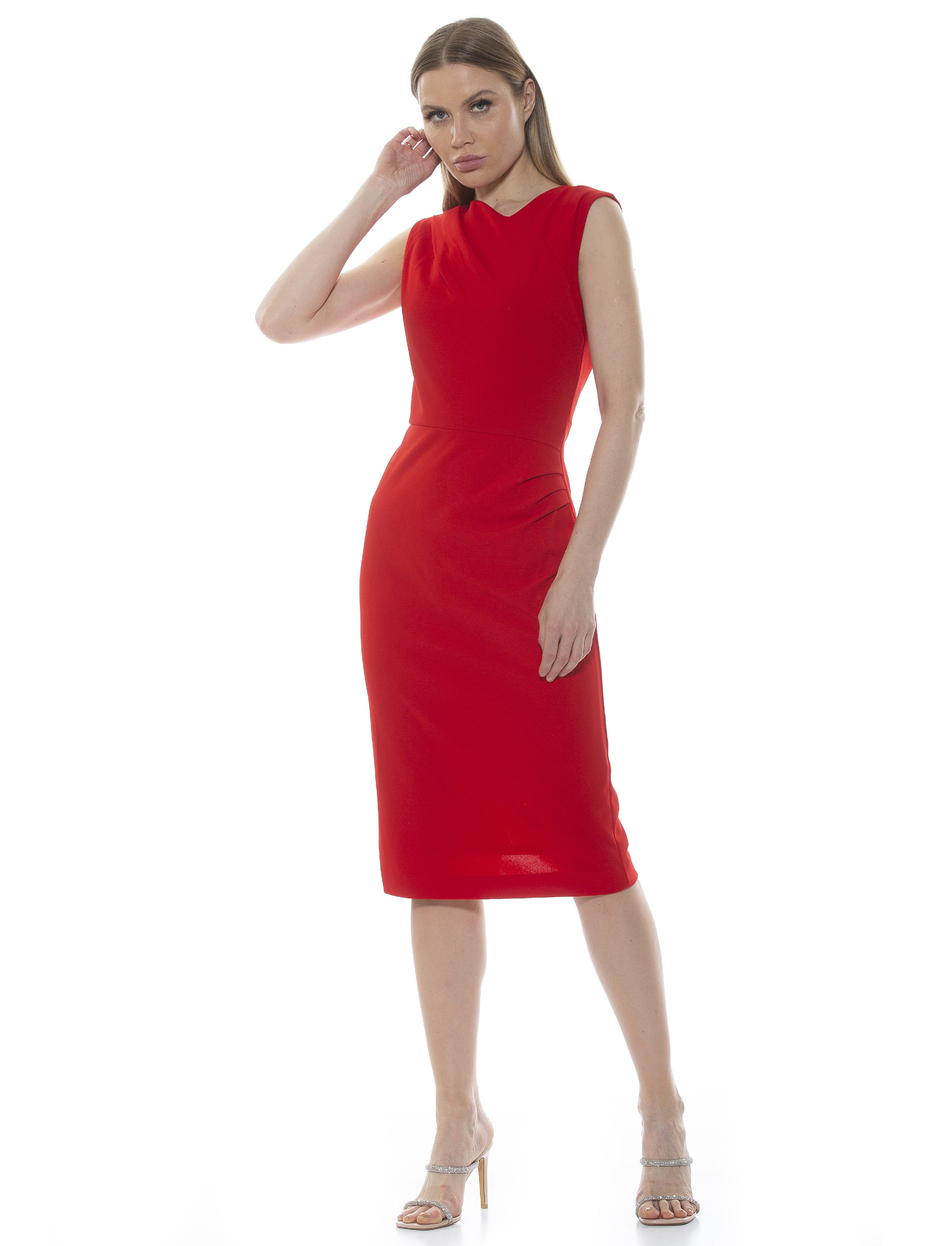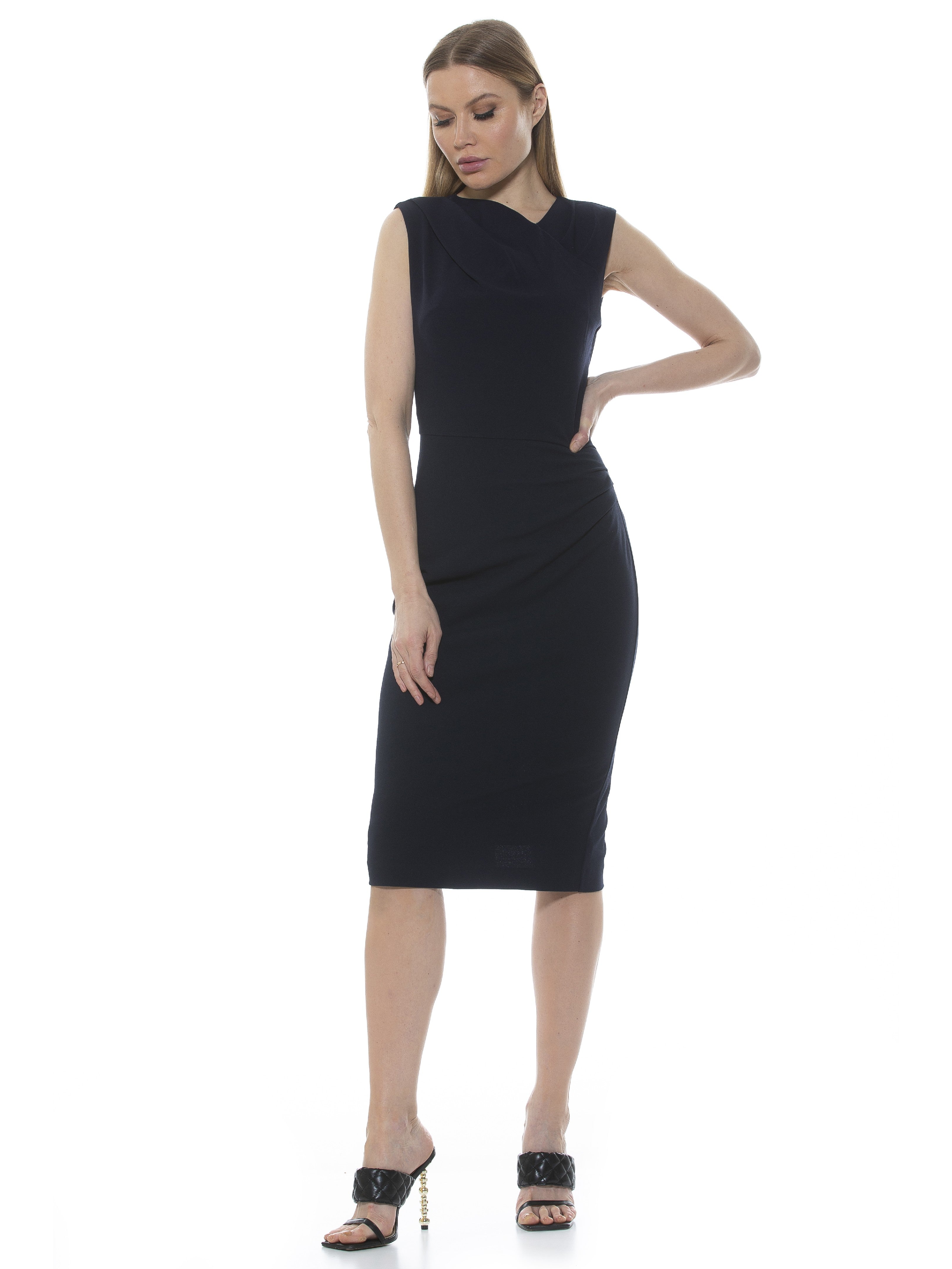 The Diane is a figure hugging cocktail dress, with an asymmetrical neckline and a zipper backing.