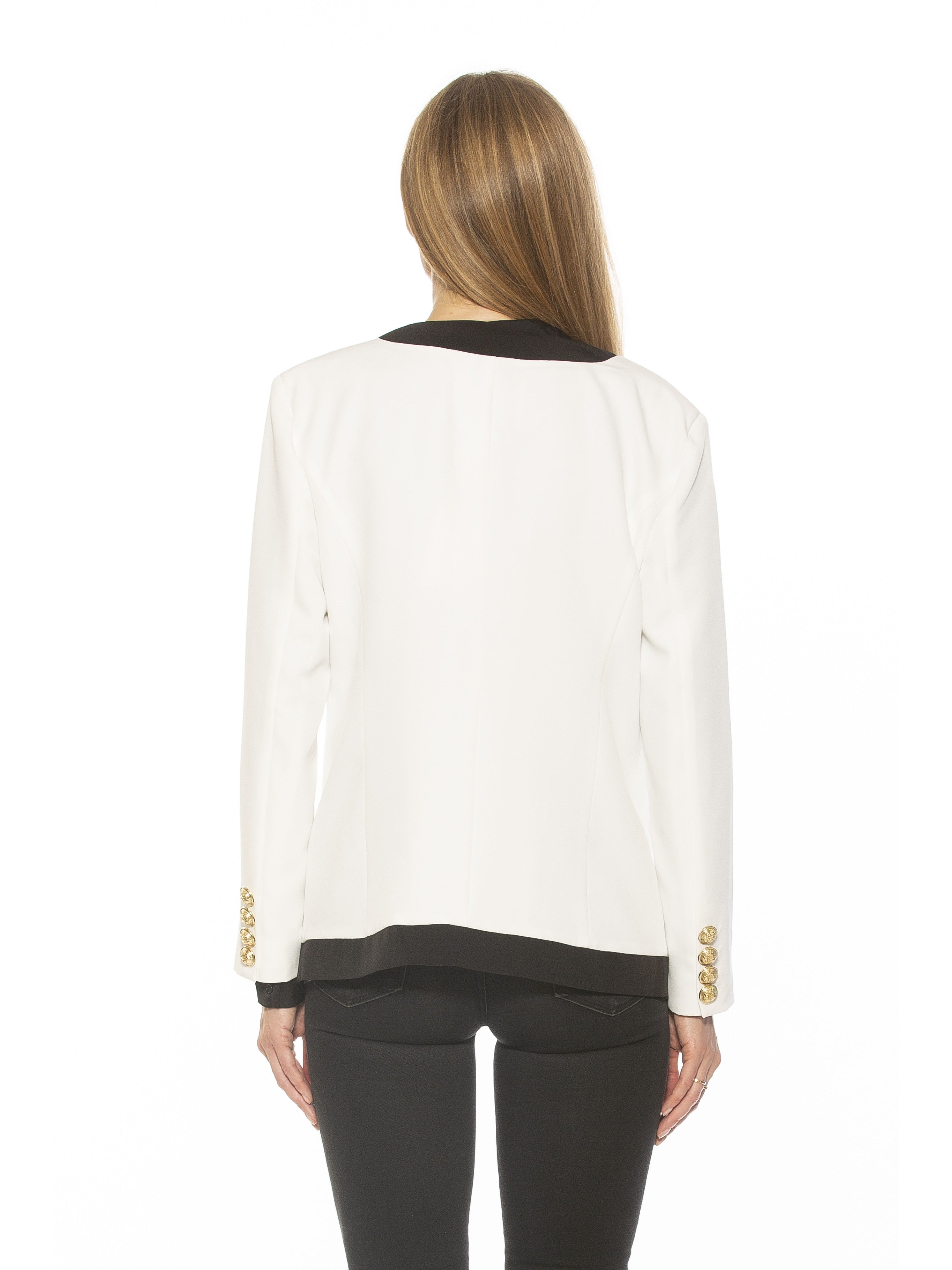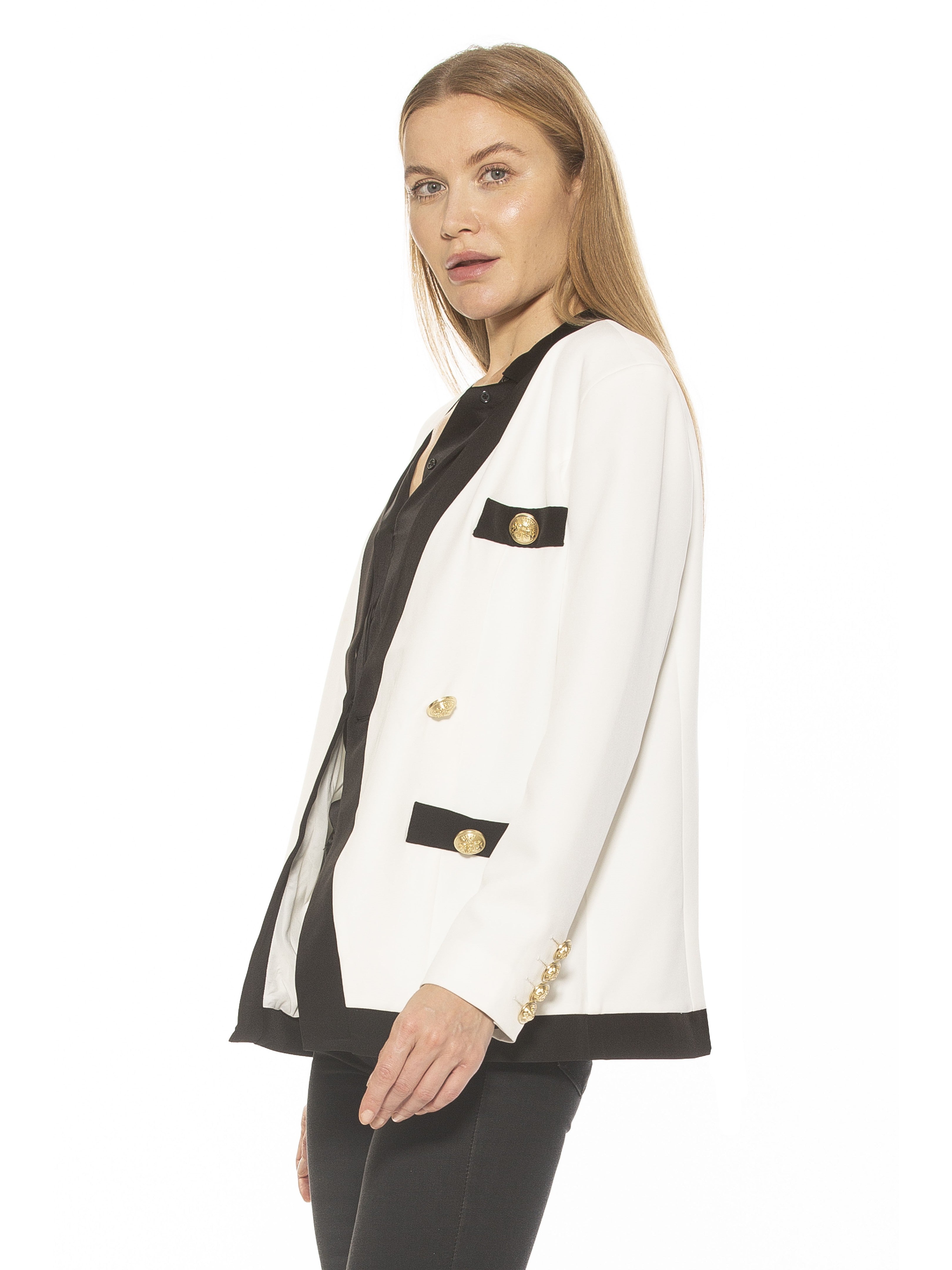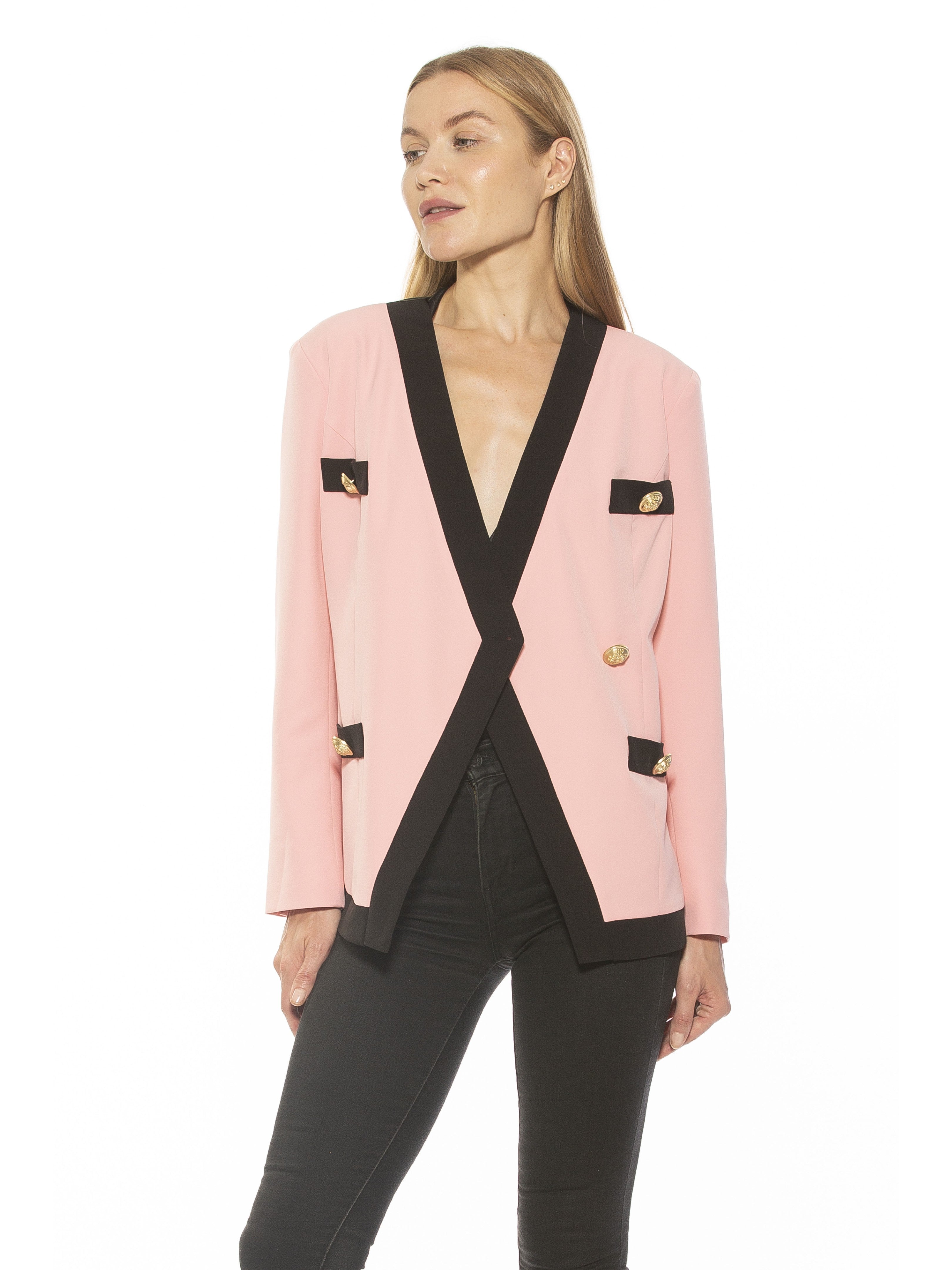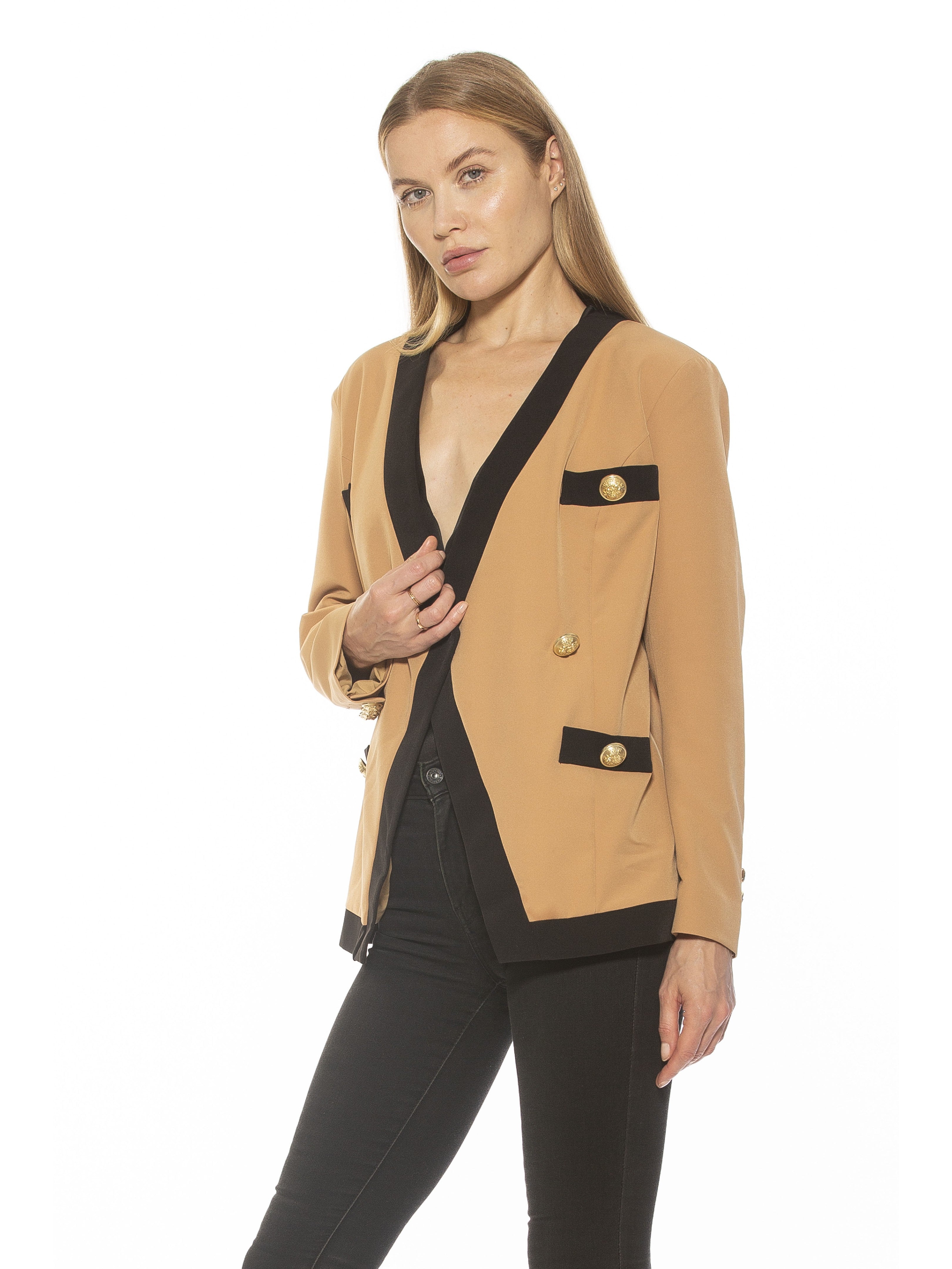 The Emele Blazer is perfect for any classy occasion. It features gold hardware and contrasting trim for a look that's elegant and eye-catching. The unique triangle cut front and oversized shape makes this piece truly special. Make a statement with the Emele Blazer.