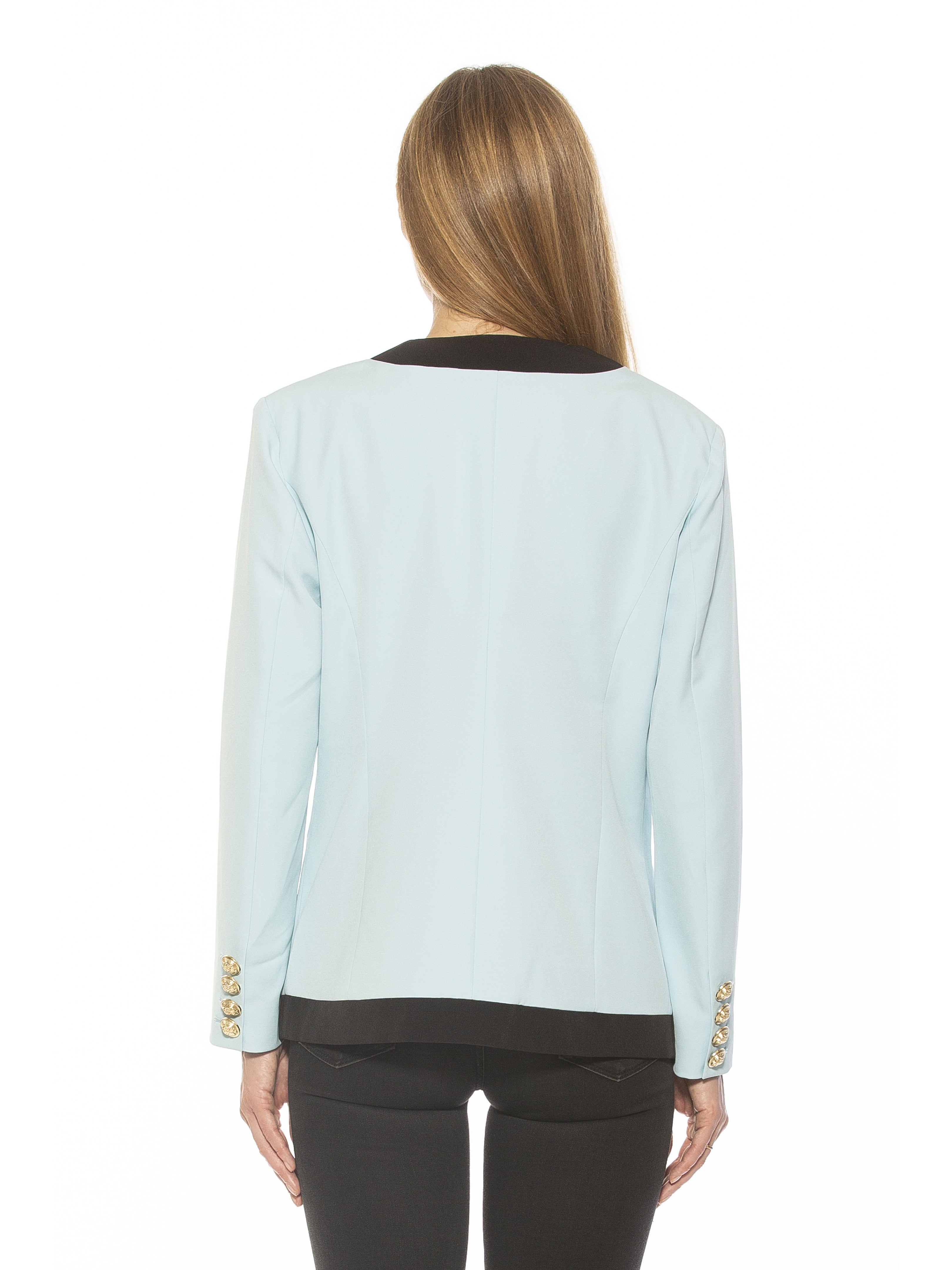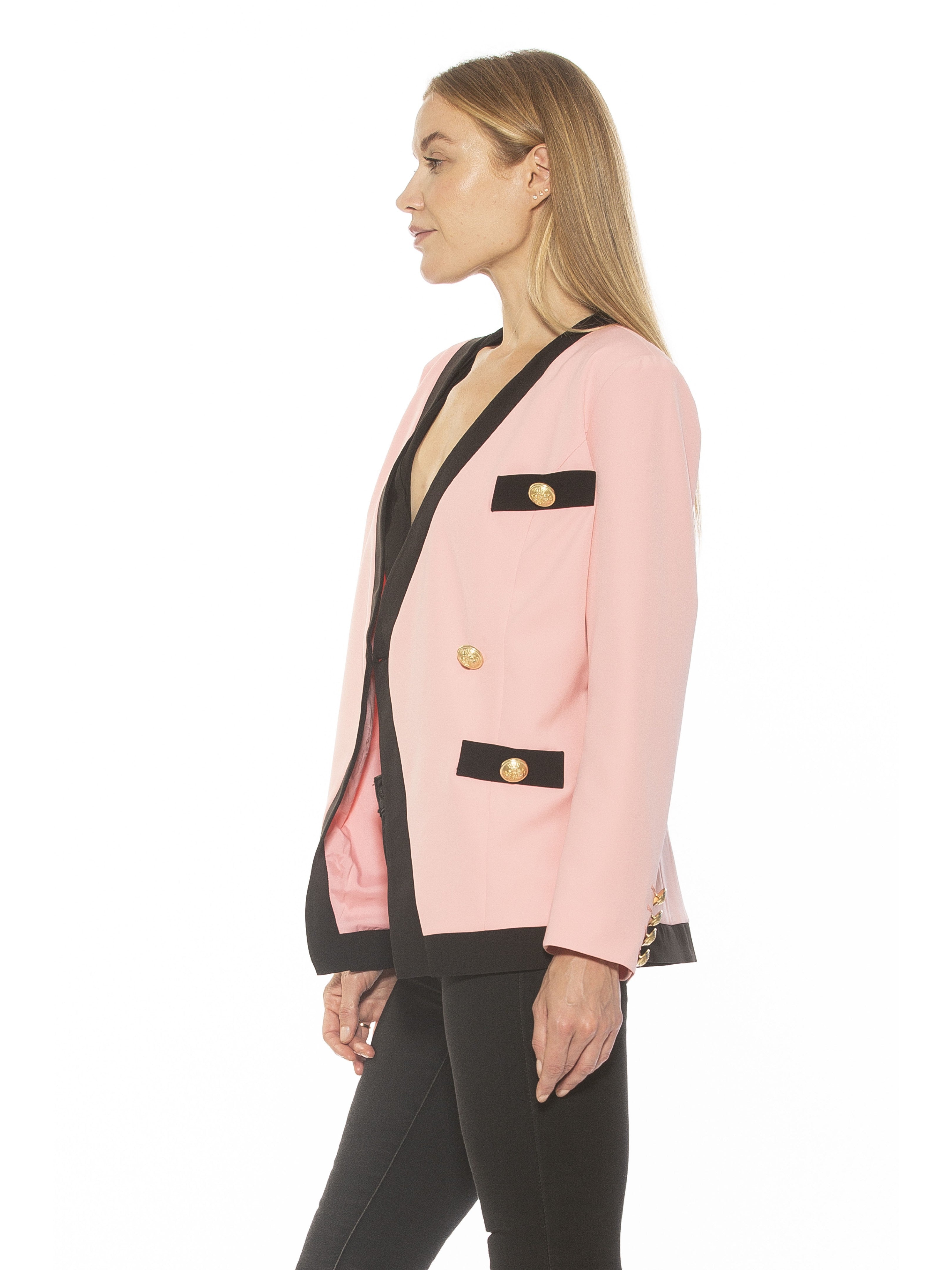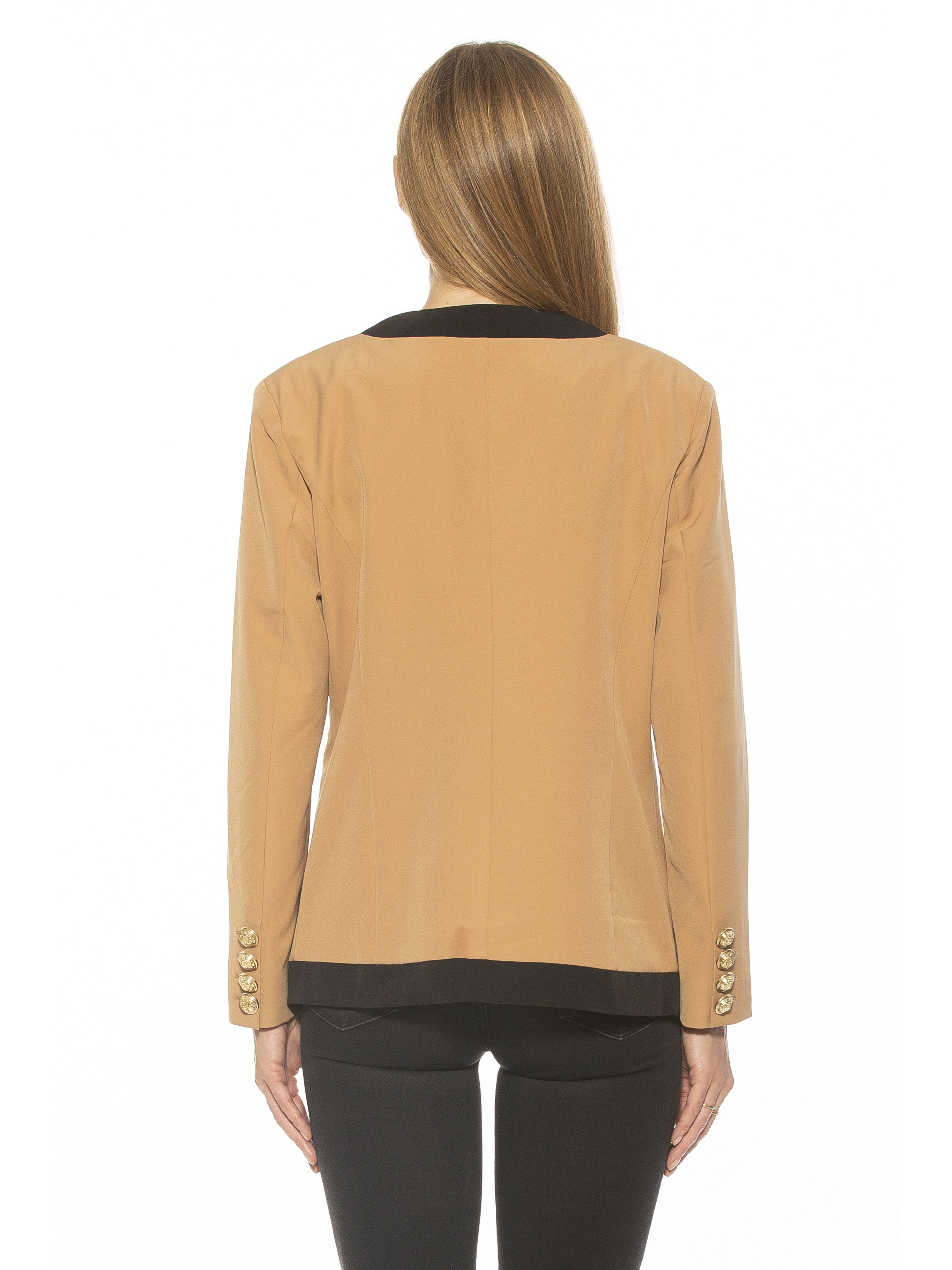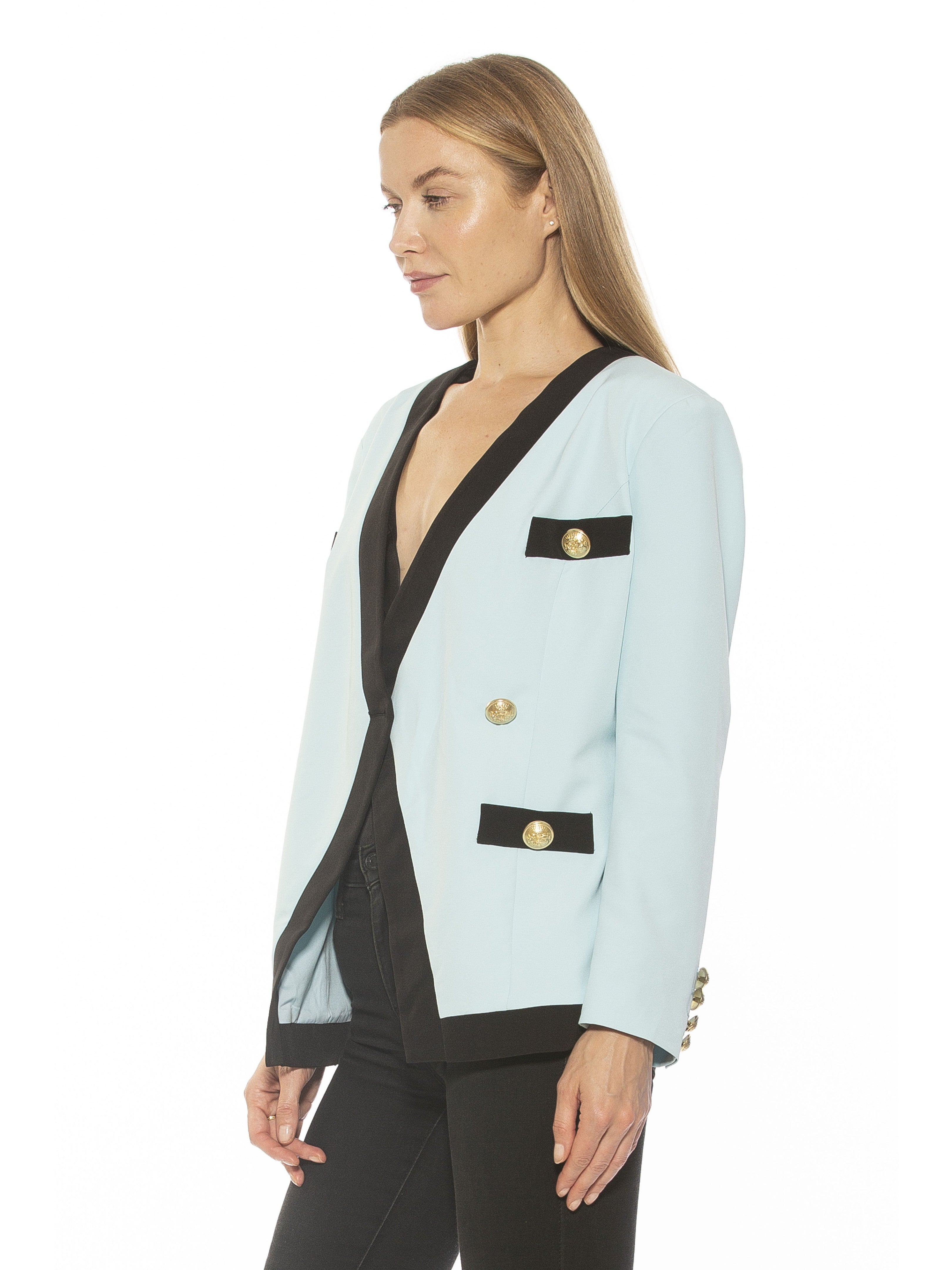 The Emele Blazer is perfect for any classy occasion. It features gold hardware and contrasting trim for a look that's elegant and eye-catching. The unique triangle cut front and oversized shape makes this piece truly special. Make a statement with the Emele Blazer.
