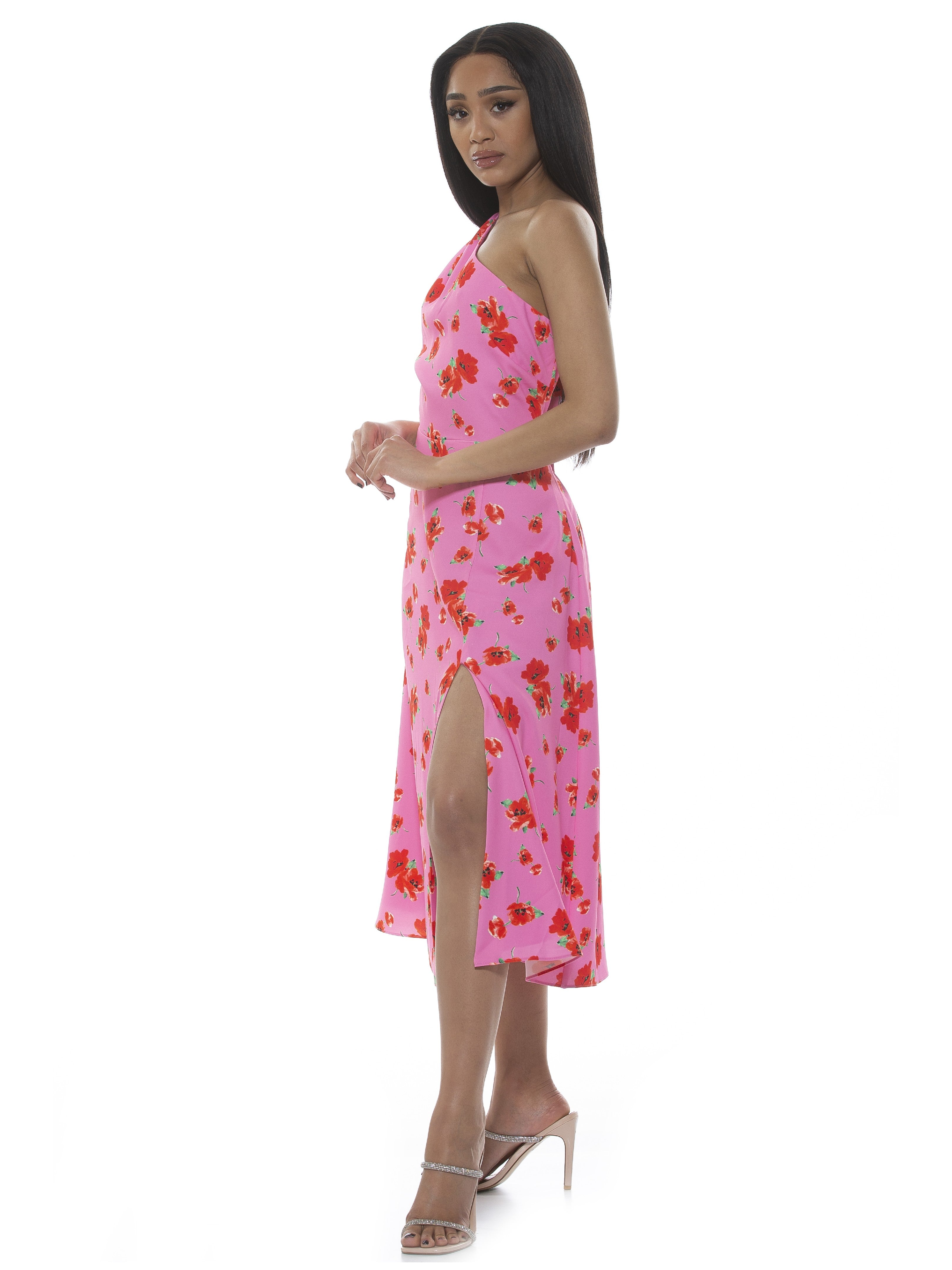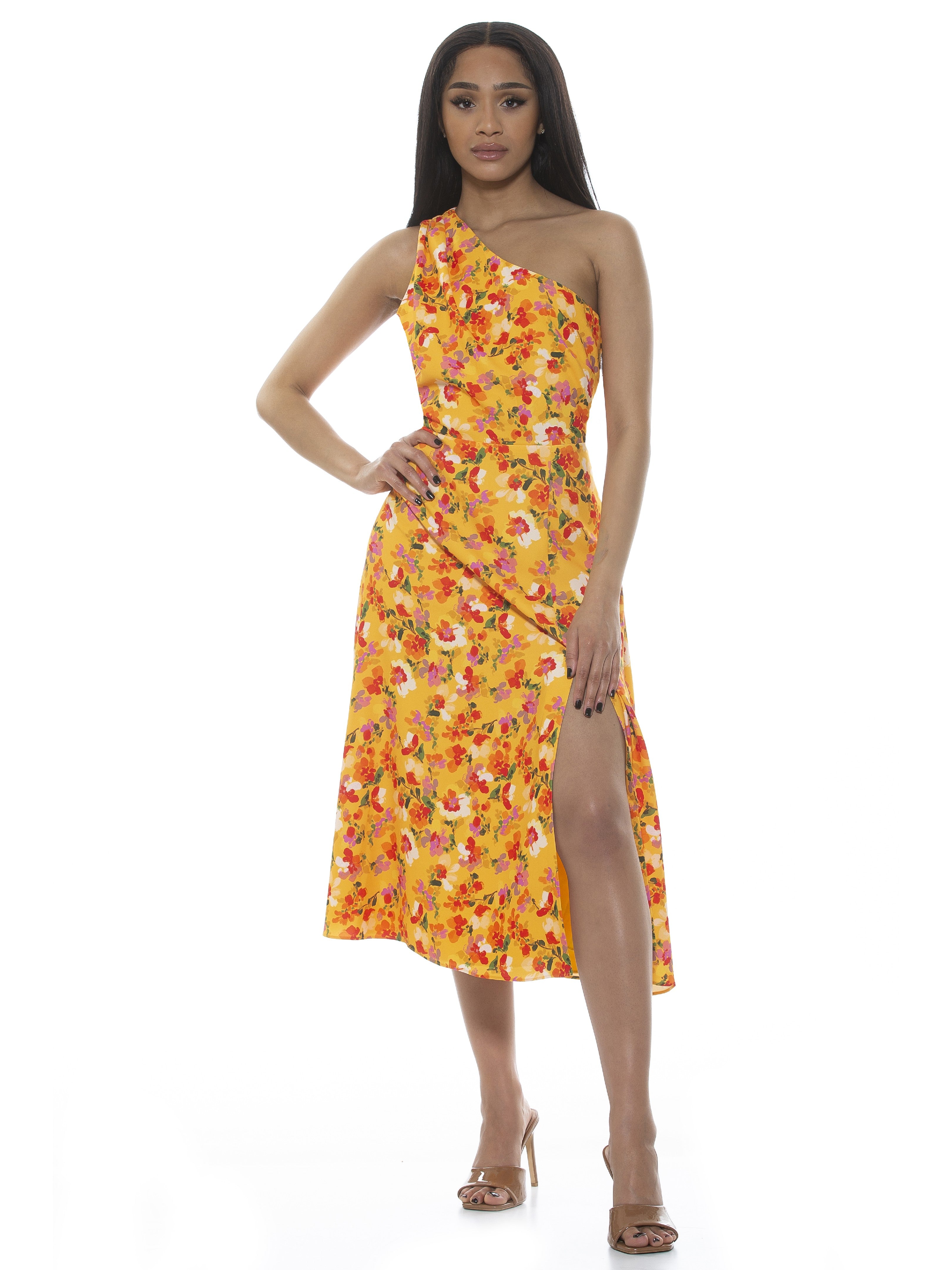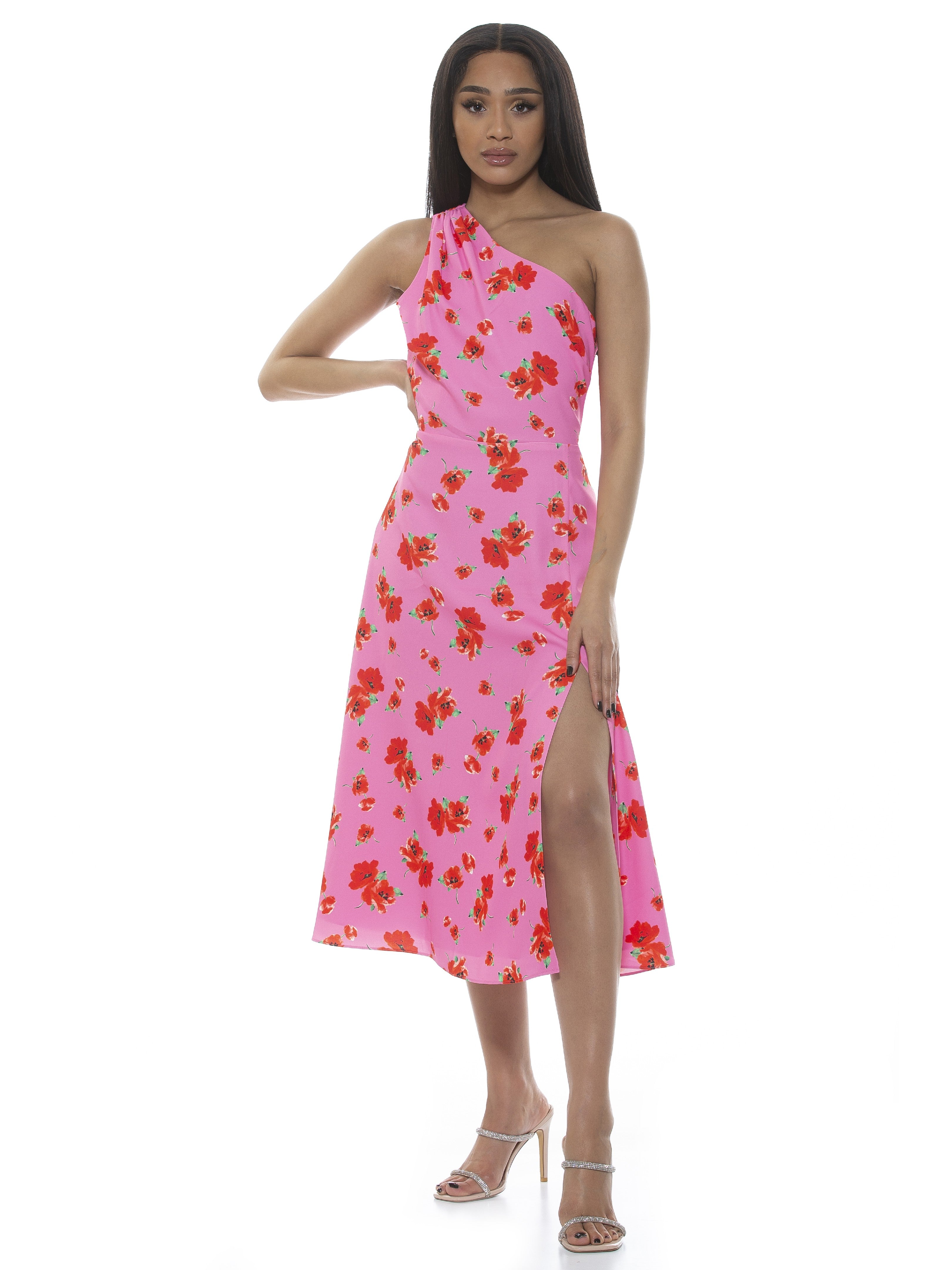 The Fay Dress is a one shoulder design with a side slit and fit and flare silhouette in an elegant midi dress. Make a statement with its unique shape and feel the confidence of a unique and beautiful look.