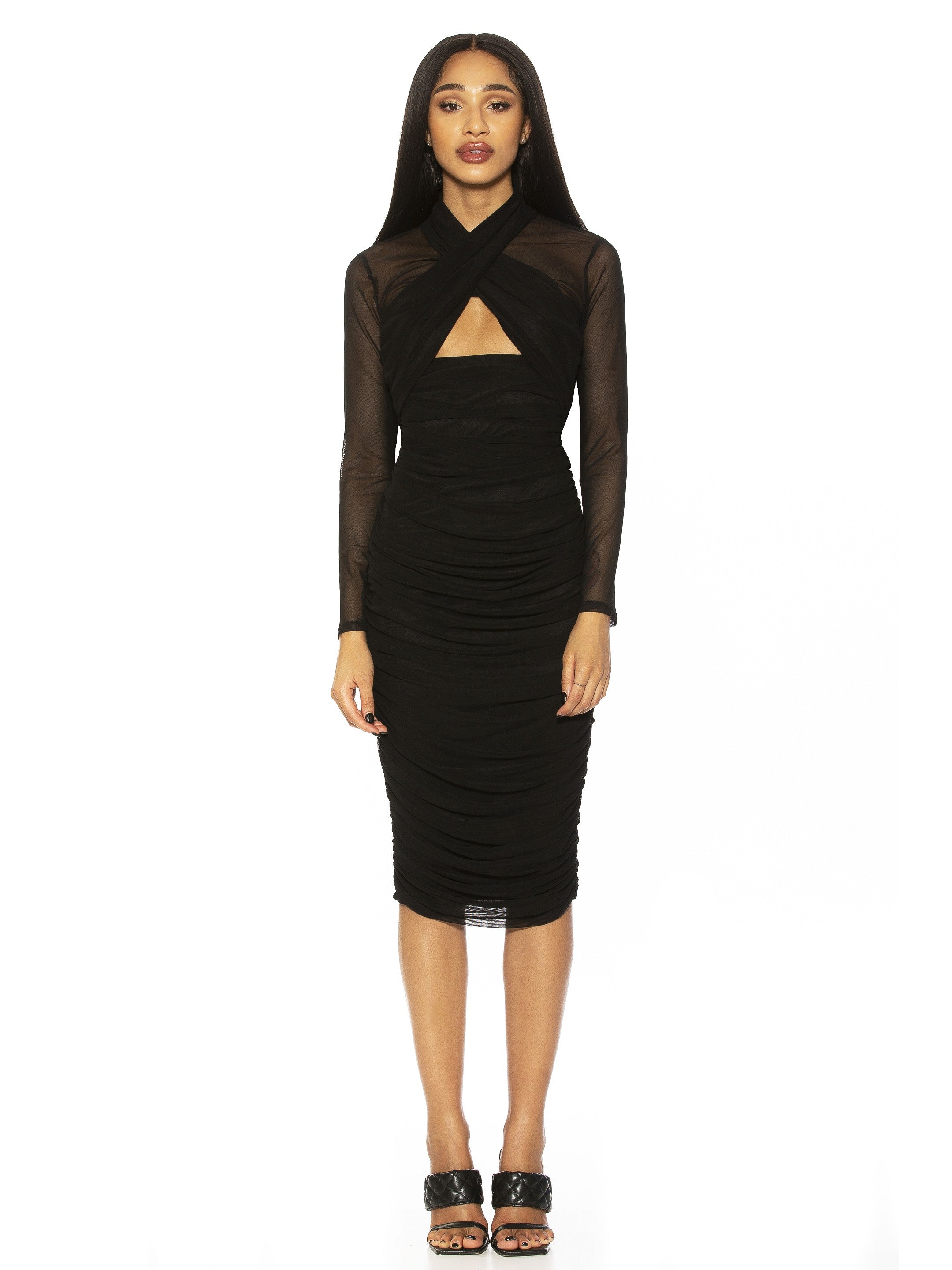You flirt. The Jenna is a long sleeve, midi dress with a high neckline. It features a center front triangle cut-out with rouching, with sheer sleeves and back.