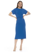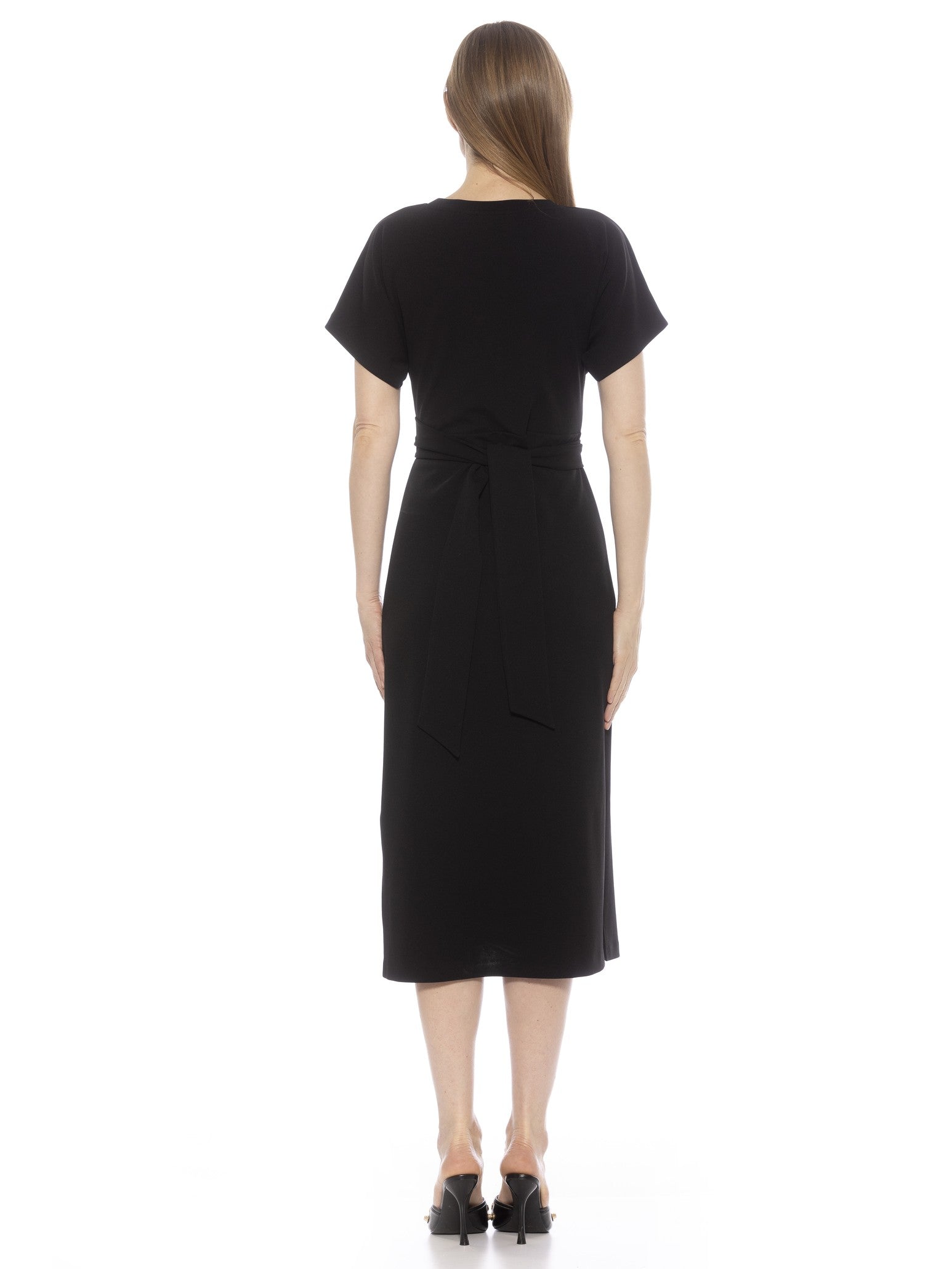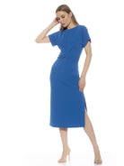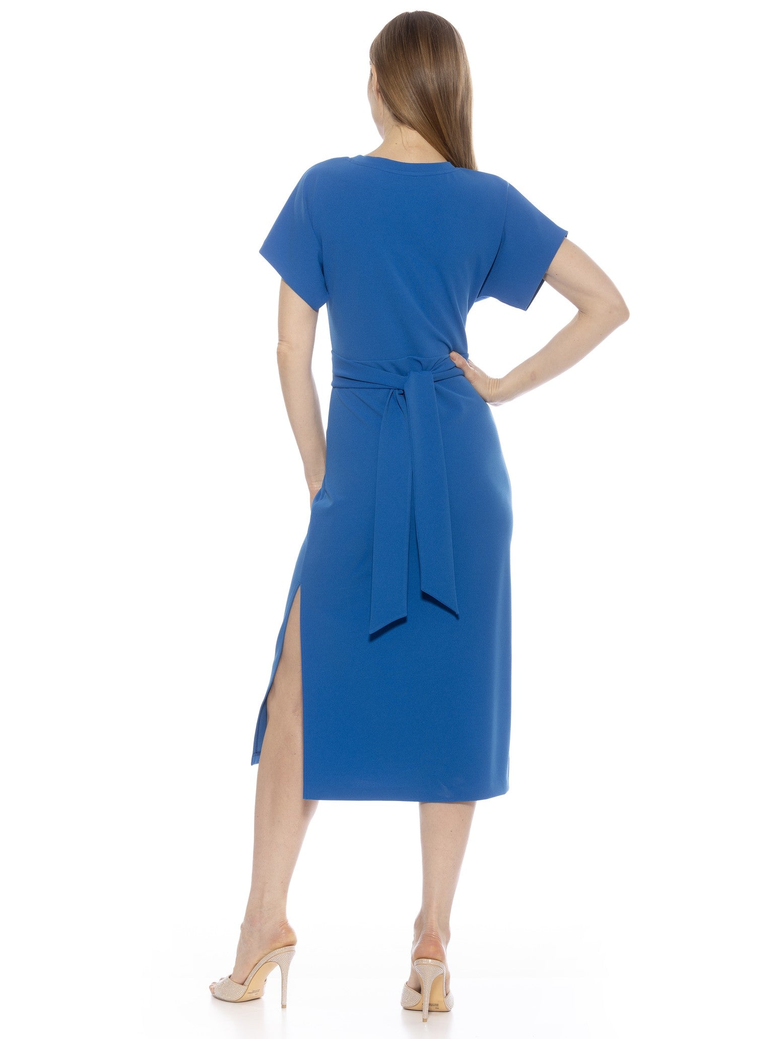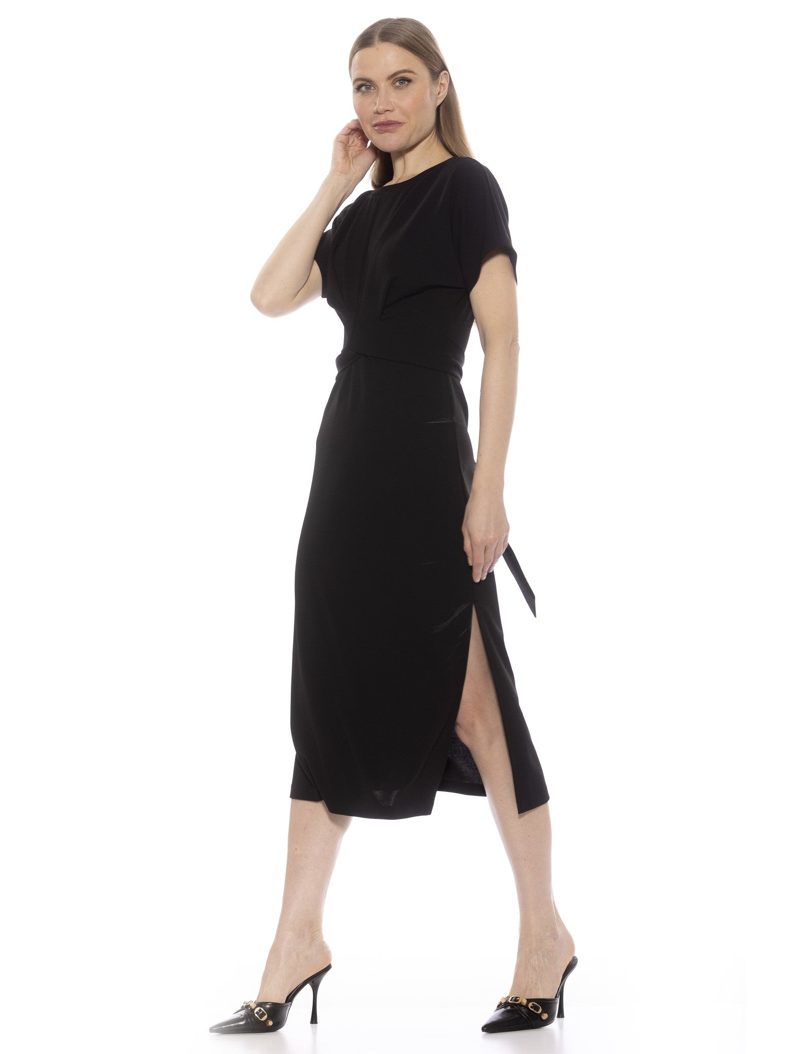 This exquisite sheath dress effortlessly exudes sophistication and elegance. The boatneck style and short sleeves accentuate the neckline and shoulders, while the waist tie cinches at the waist for a flattering silhouette. Perfect for any occasion, this midi dress exudes luxury and refinement.