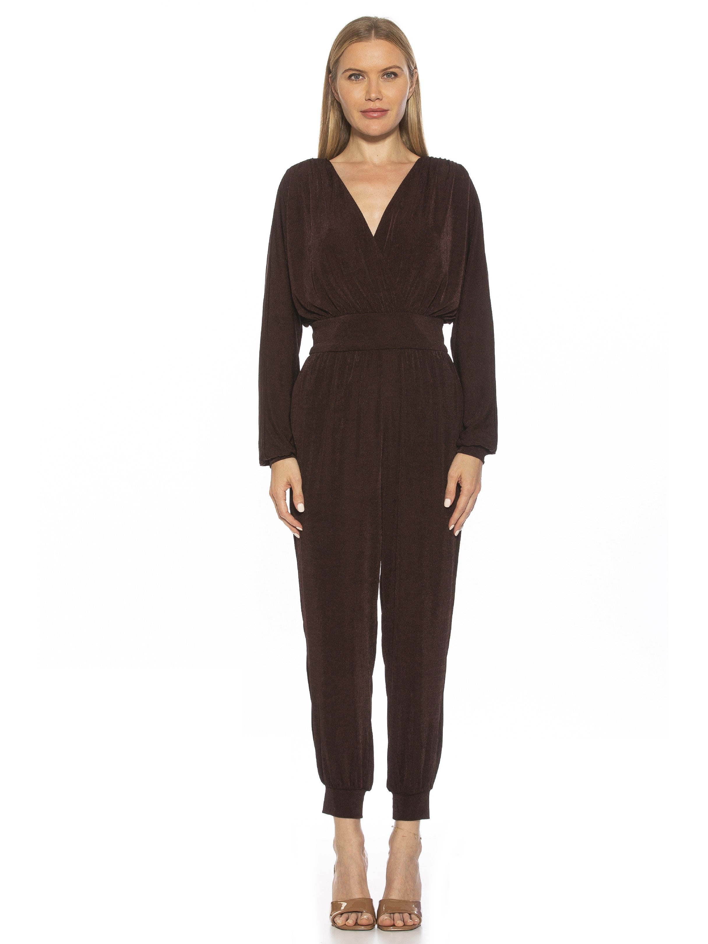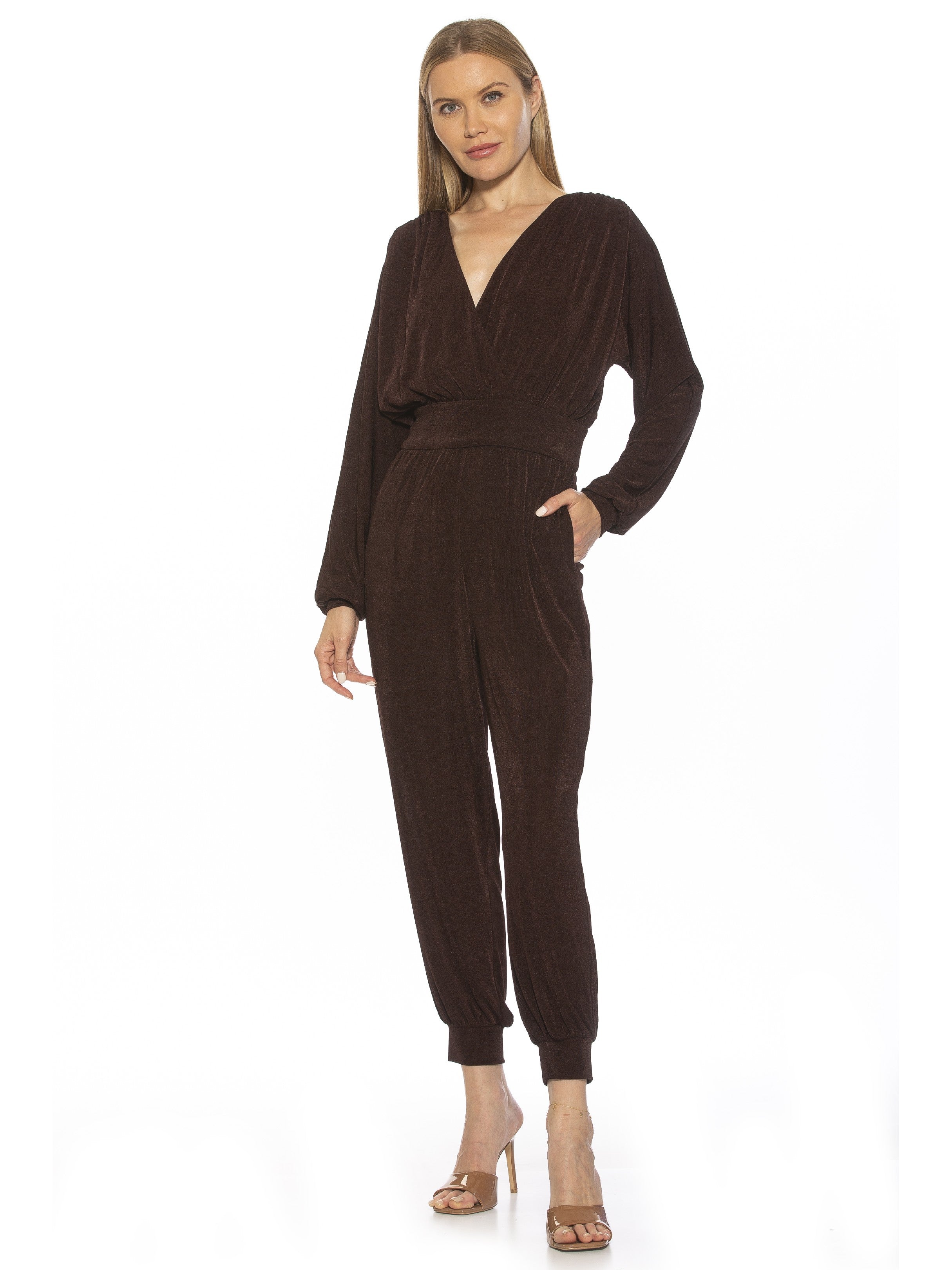 Stay cozy in this Joey Jumpsuit that's made for lounging! With its V-neck for a classic look, long sleeve for full-body warmth, and blouson sleeve for a little extra style, you won't want to miss out on this comfy knit number.