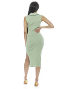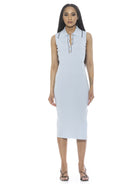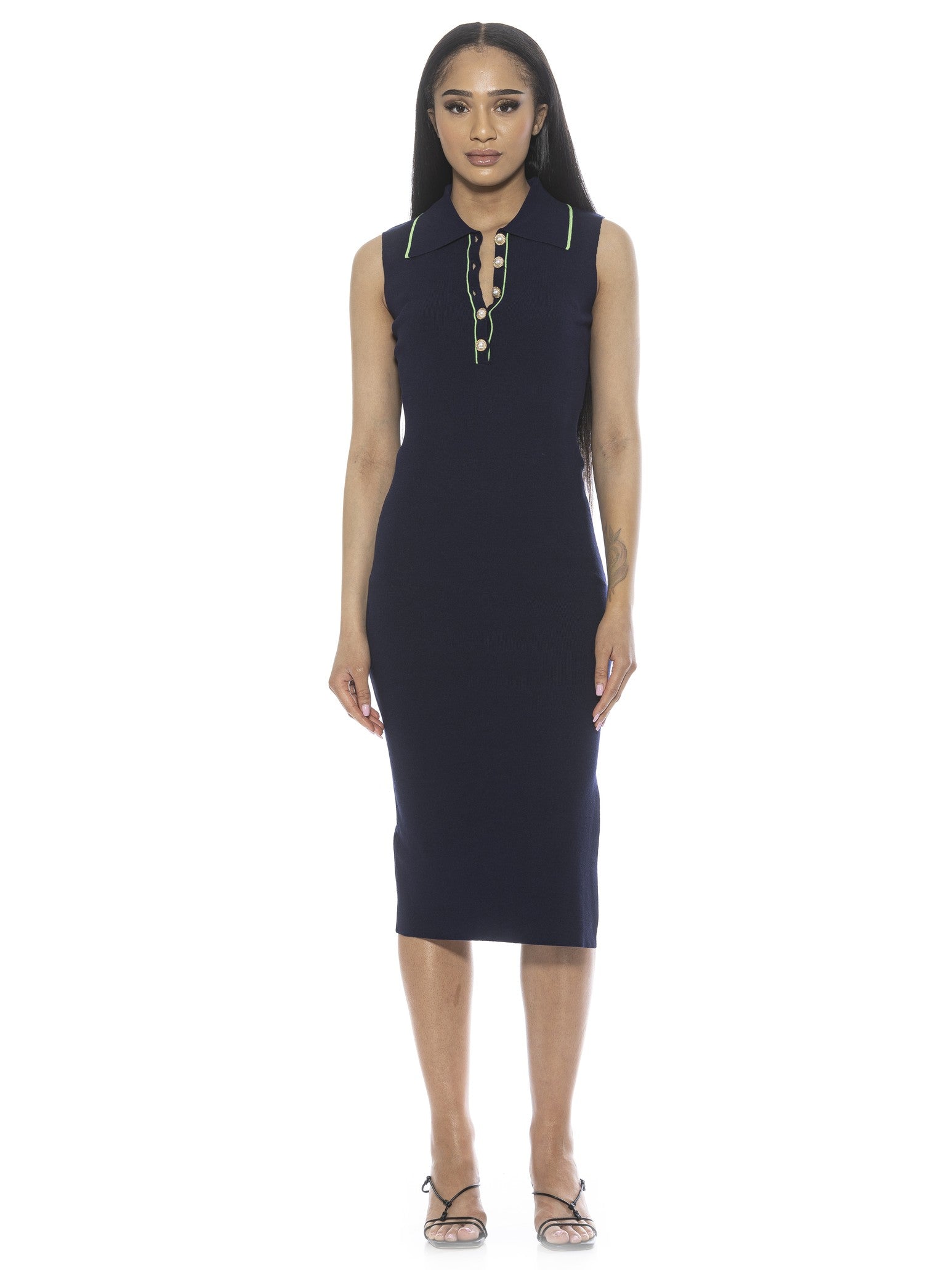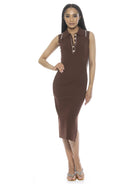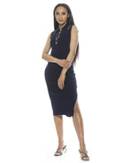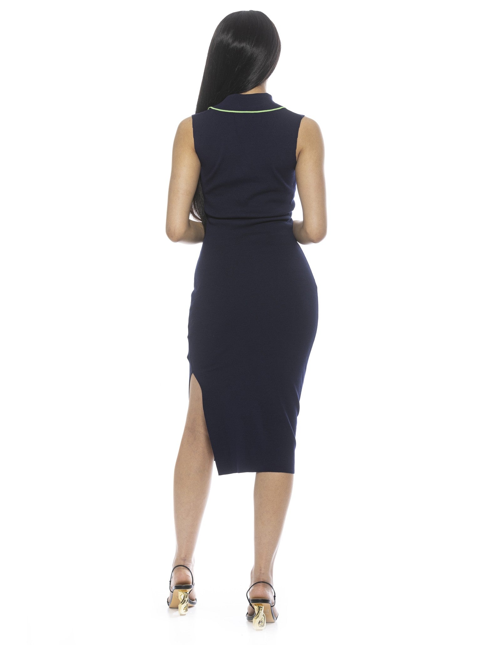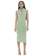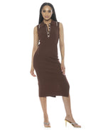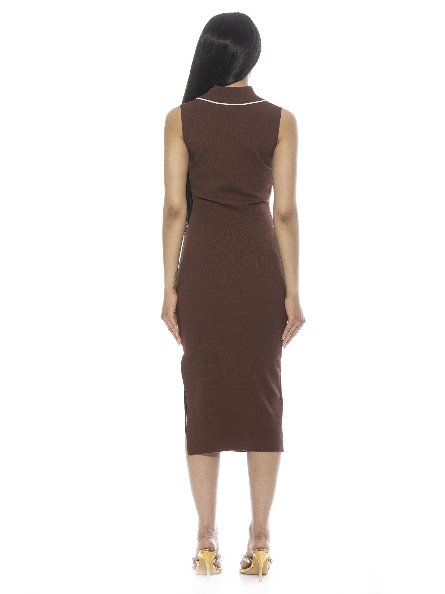 Indulge in luxury with our Myah Dress. This collared and sleeveless ribbed knit dress exudes sophistication. Perfect for any occasion, the midi length adds an elegant touch. Elevate your wardrobe with this exclusive piece.