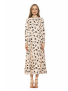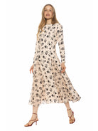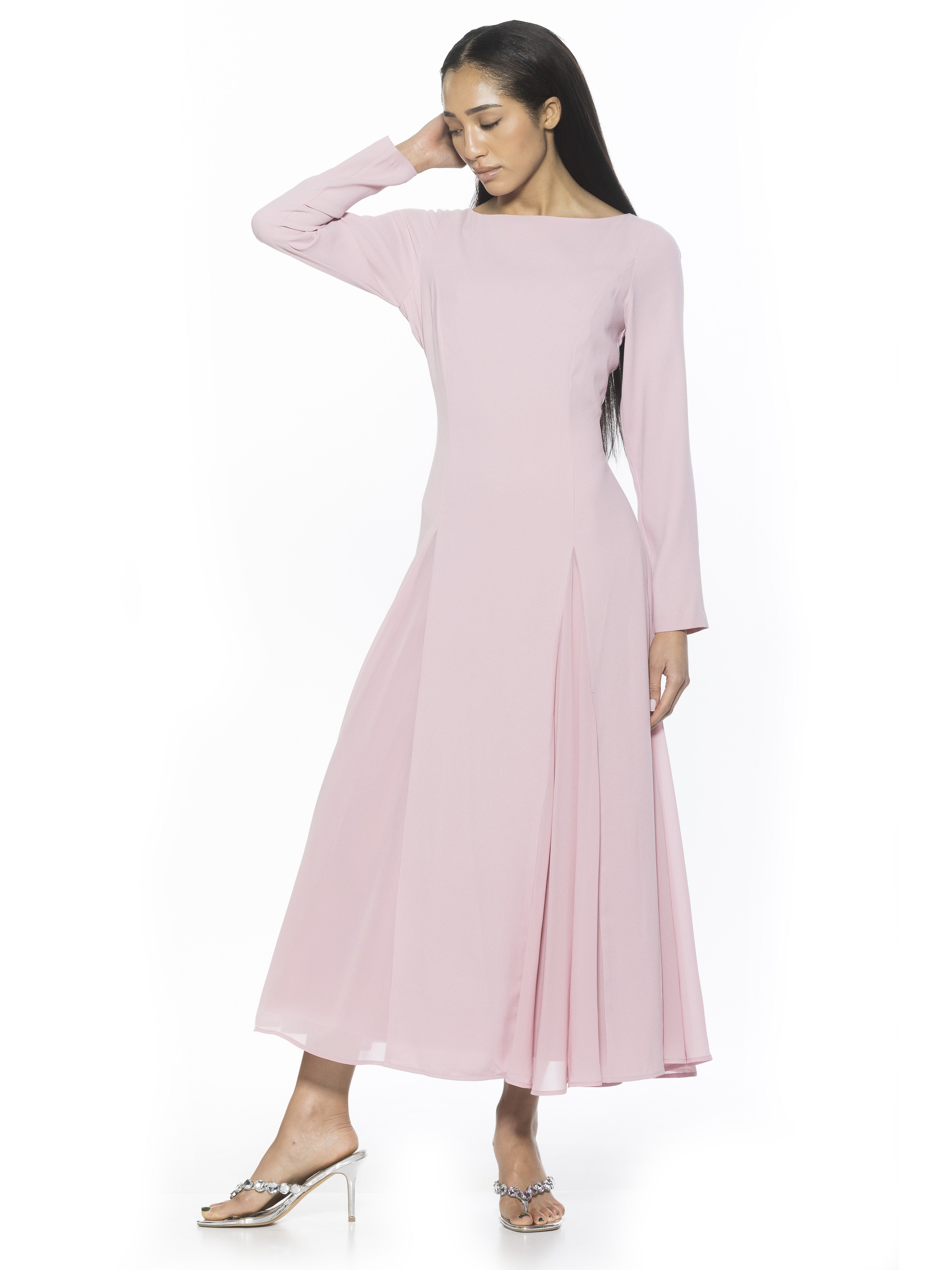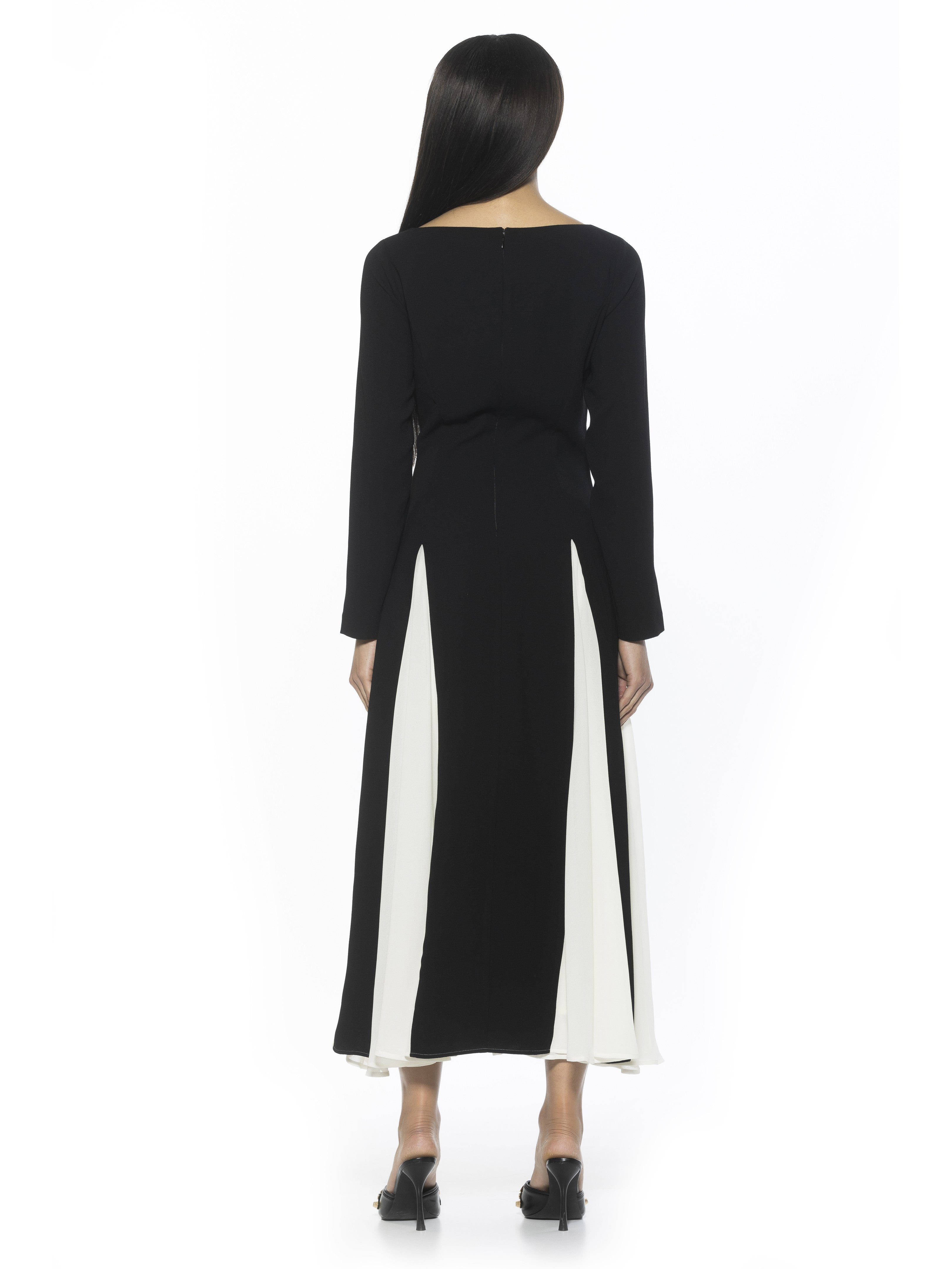 A poetic blend of timeless femininity and modern structure, this midi silhouette is elevated by artfully placed godets that create a sweeping, full skirt. With a refined crewneck and gracefully elongated sleeves, it drapes with a quiet confidence that moves from daytime appointments to candlelit evenings with ease. Crafted in luxe woven crepe that holds shape while flowing with every step, this dress epitomizes cultivated style and lasting allure. This Dress Runs Small.