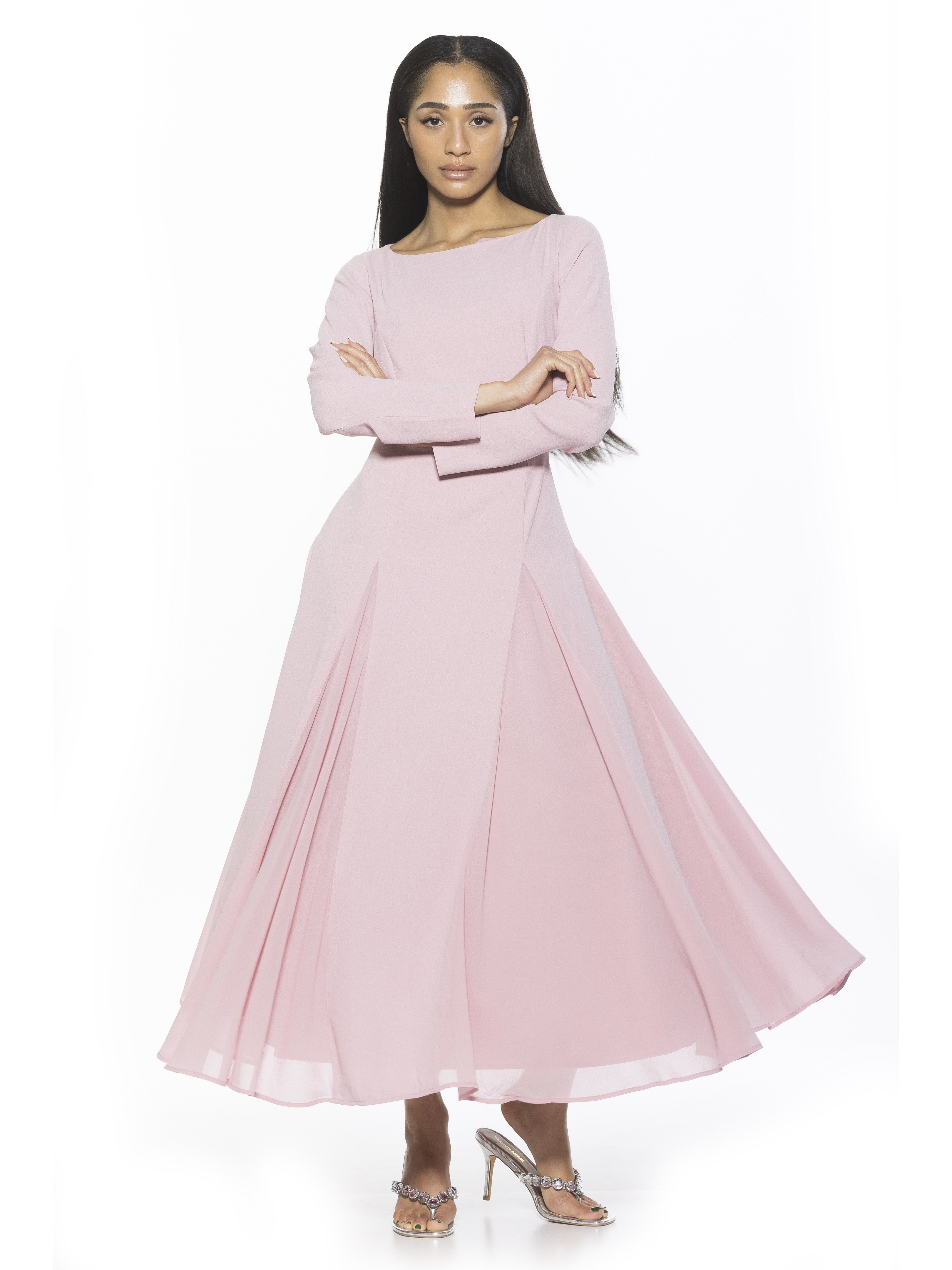 - Sculptural fit-and-flare silhouette with dramatic godets for movement.