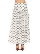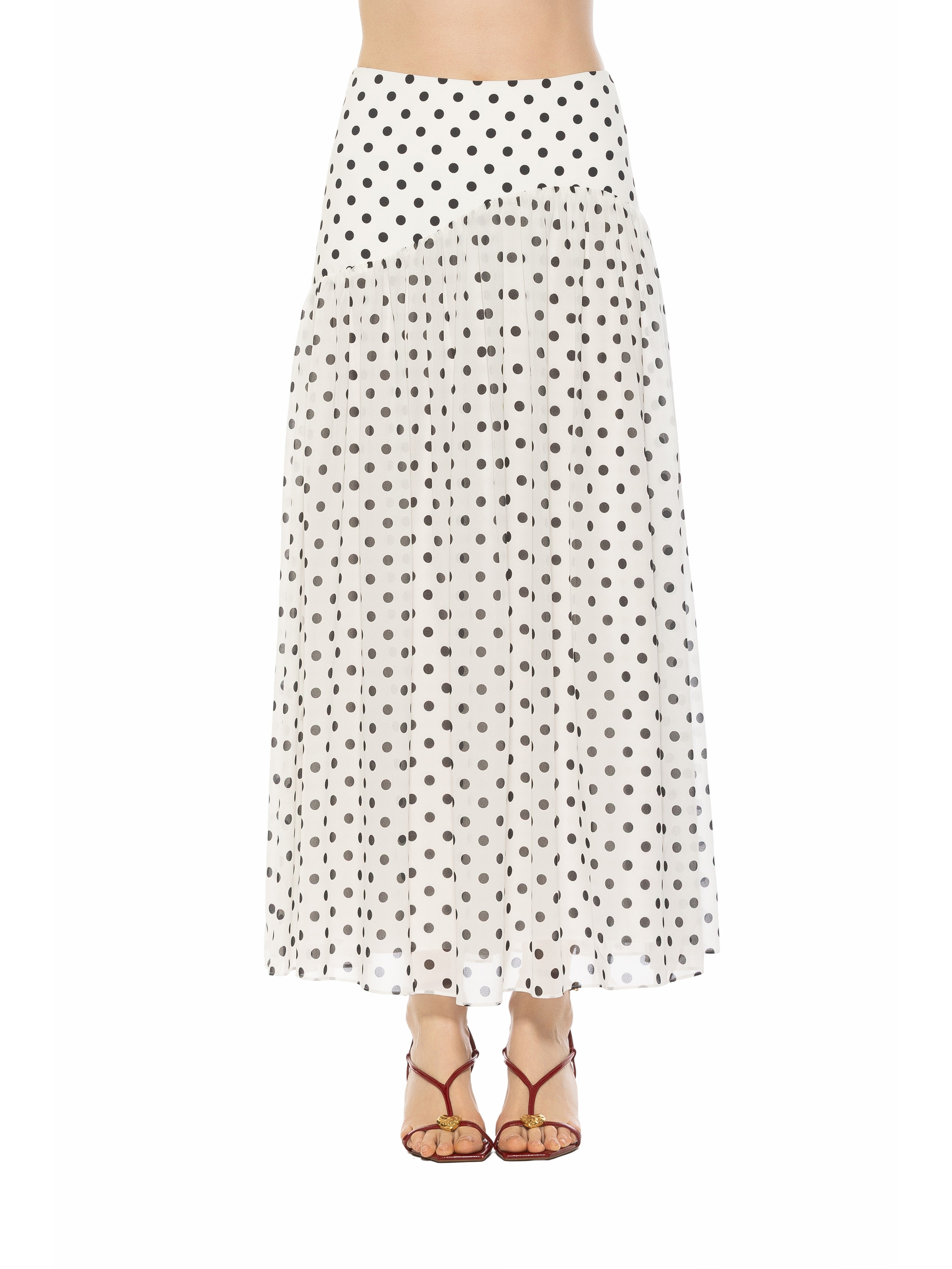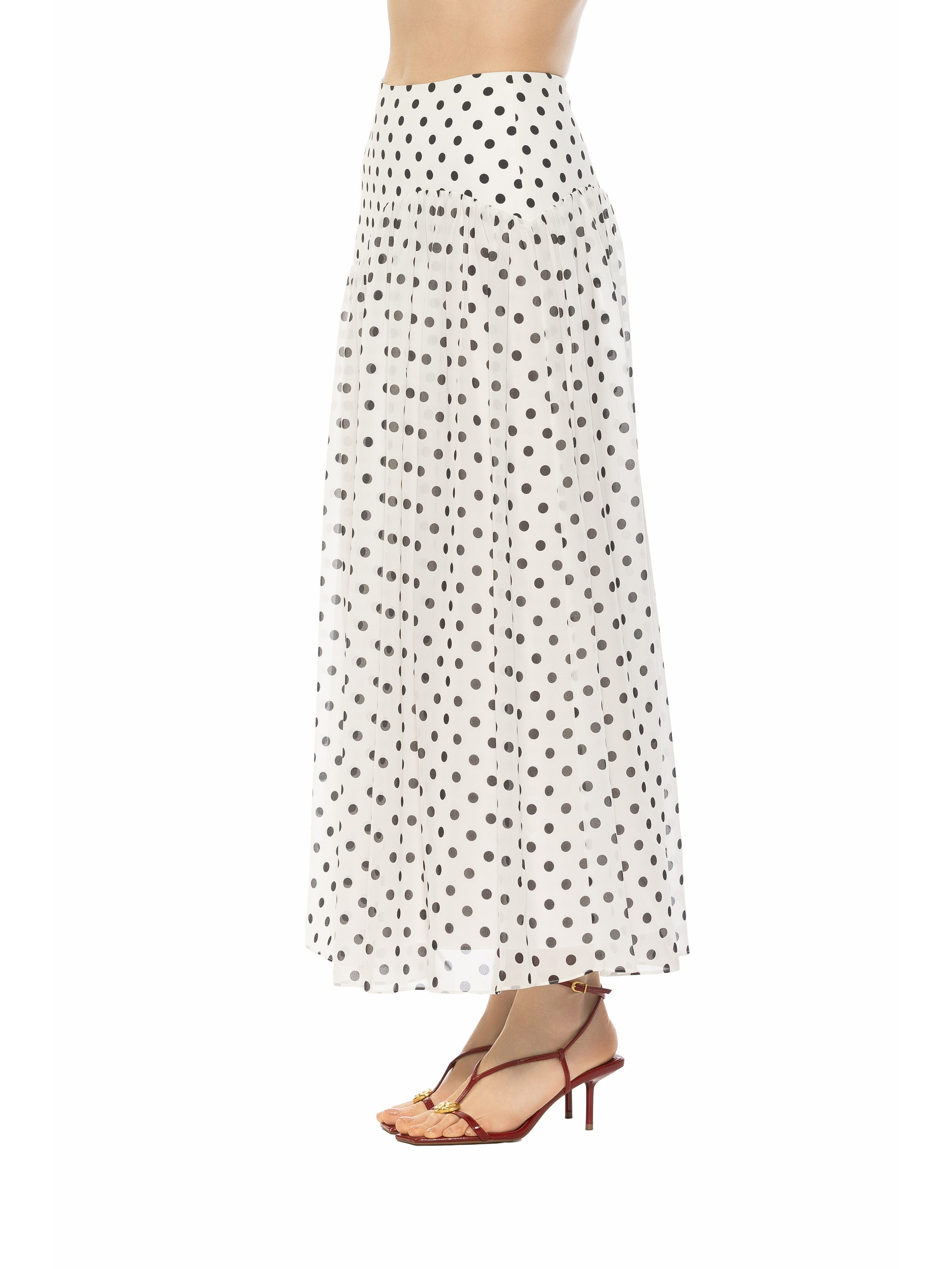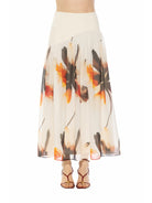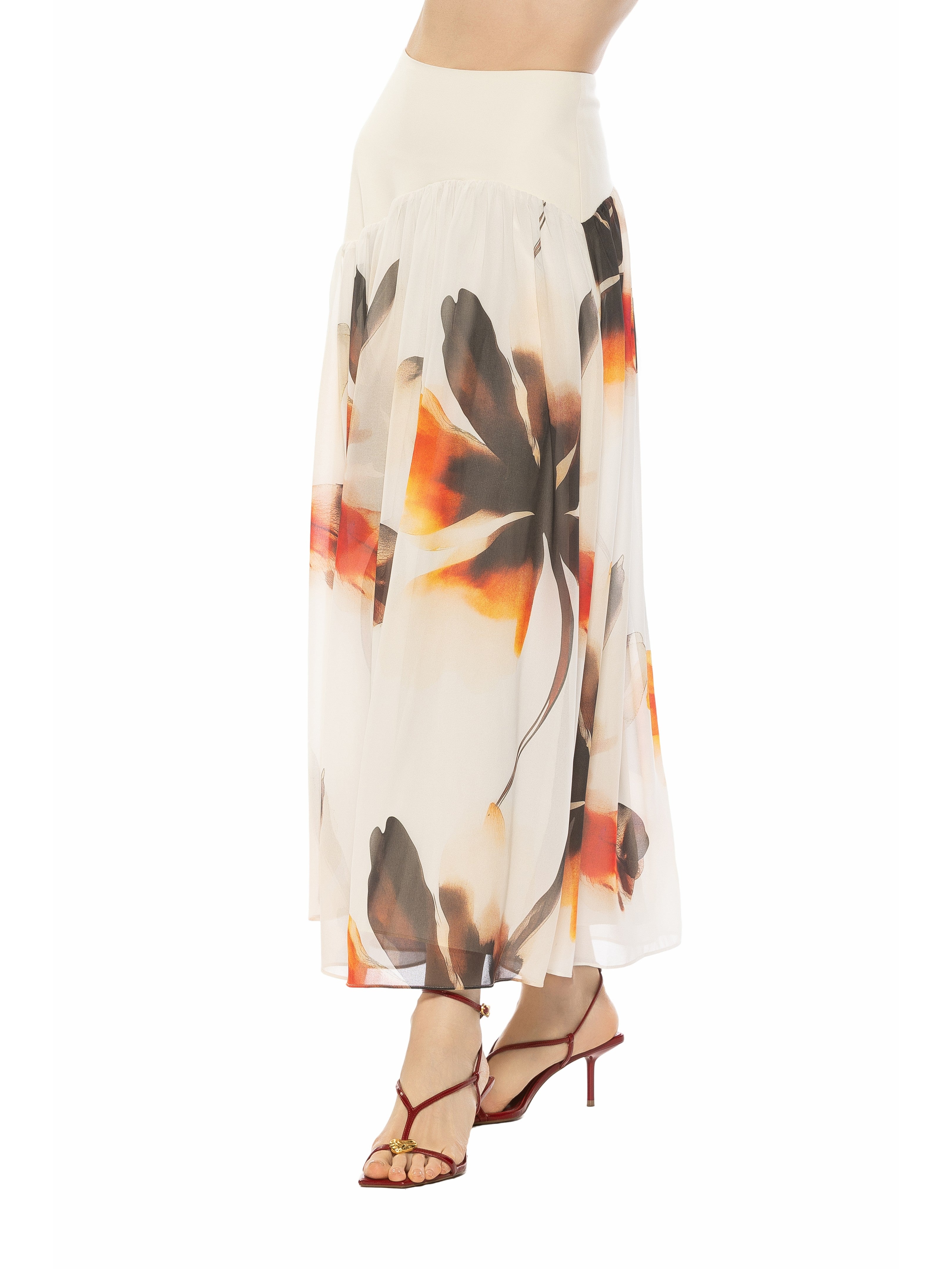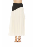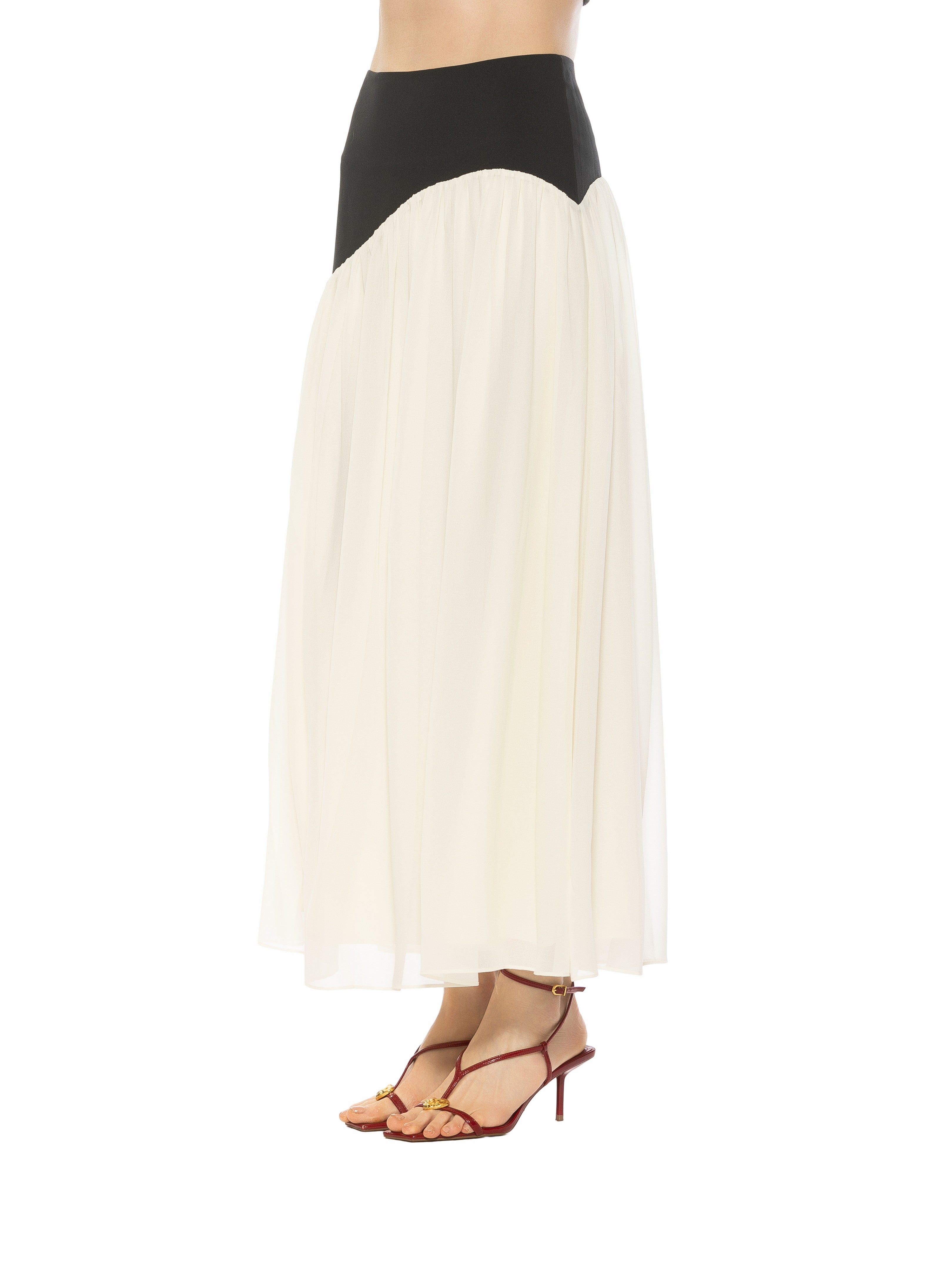 The Eris Asymmetric Maxi Skirt is a striking statement piece designed to command attention. Featuring an asymmetric dropped waist, this silhouette creates dramatic movement and modern edge. Crafted in a luxe twill base with flowing chiffon contrast, Eris blends structure and softness for a uniquely glamorous effect.