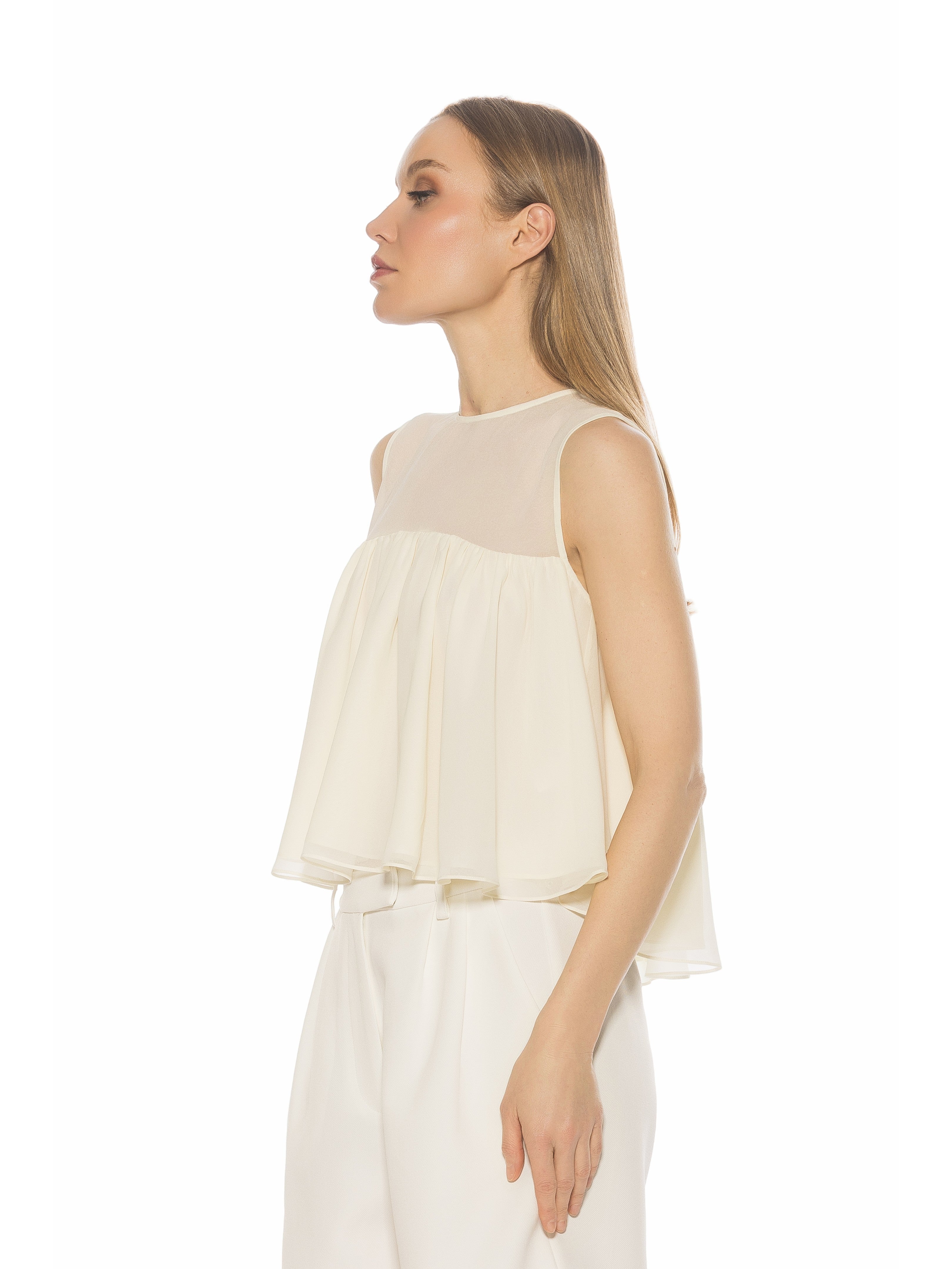 Feminine and elevated with a romantic touch, the Portia Crewneck Ruffle Top is designed to make a statement while remaining effortlessly wearable. Crafted in soft chiffon, this top features a delicate ruffled silhouette that adds movement and airy elegance with a light, fluid drape. The crew neckline balances the flounced shape for a clean, modern finish, making it easy to dress up or down. Perfect paired with tailored bottoms or skirts, the Portia top brings refined sophistication to both daytime and evening looks.