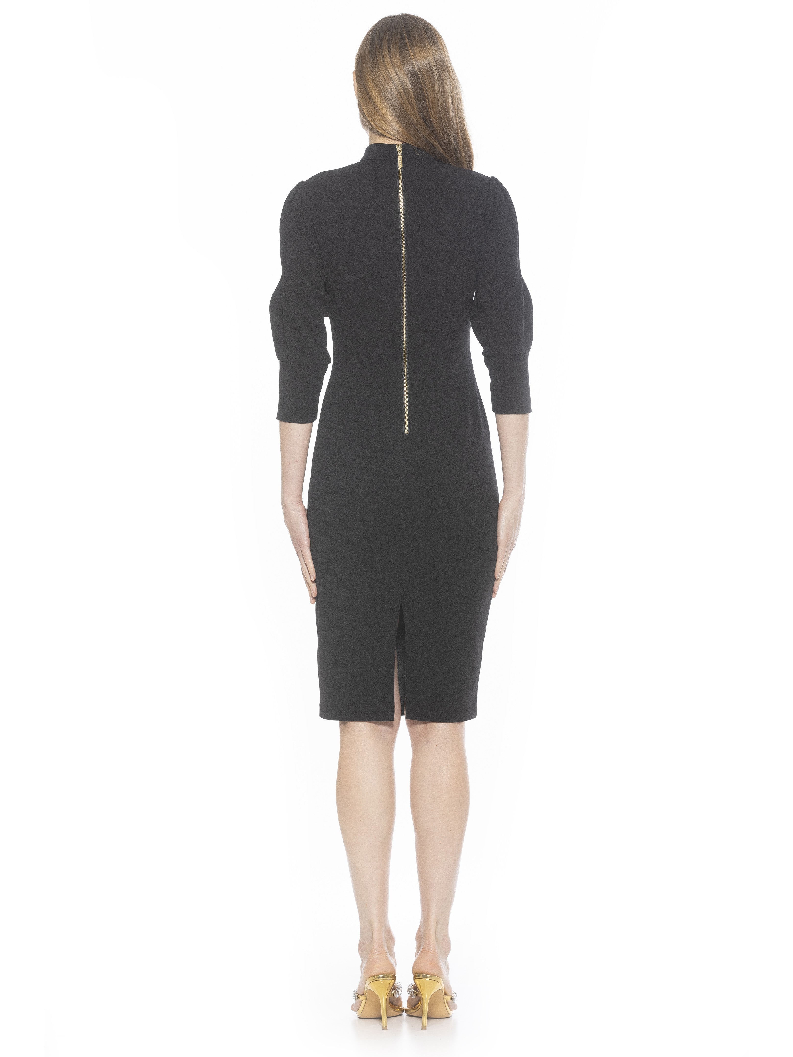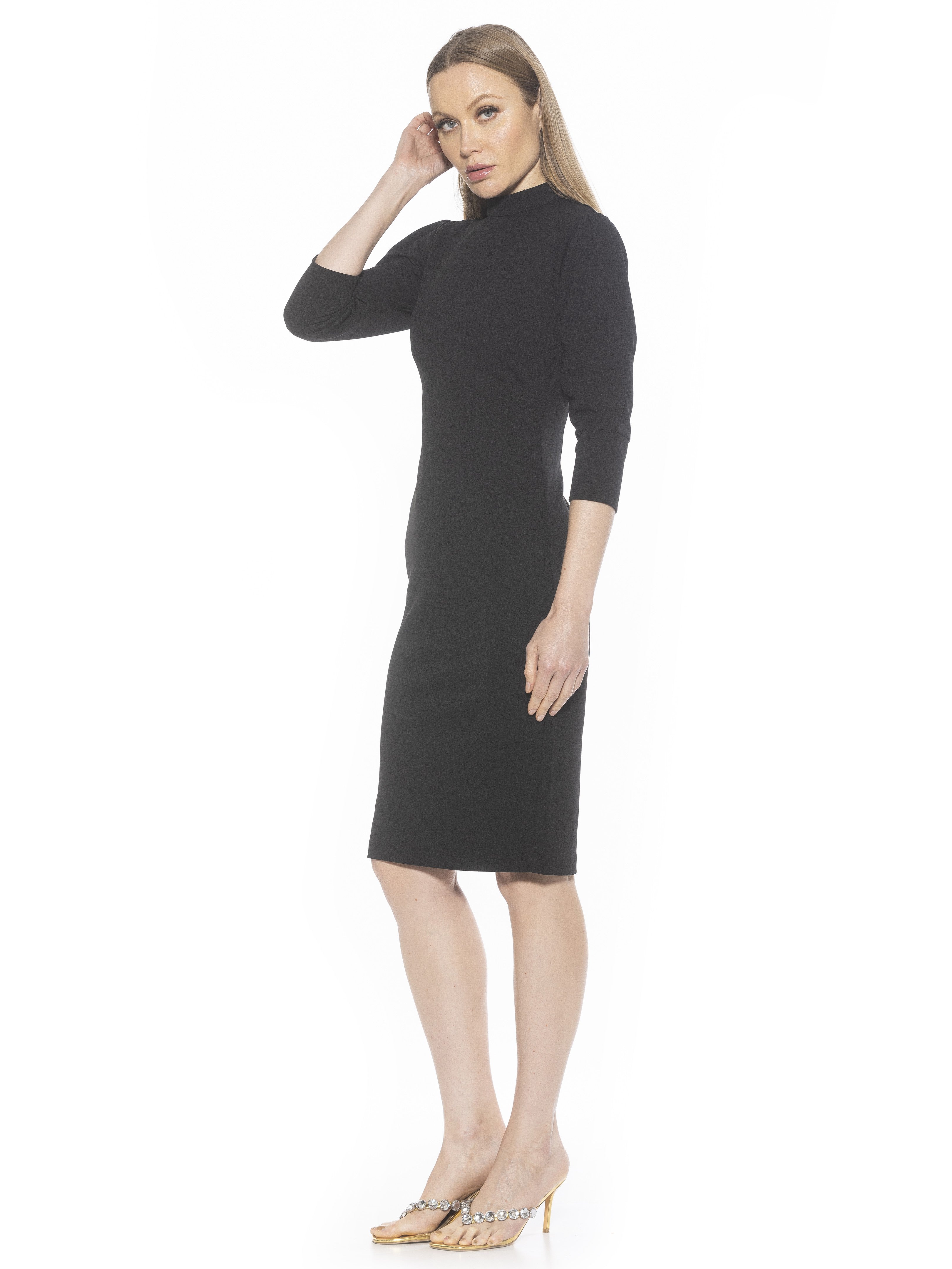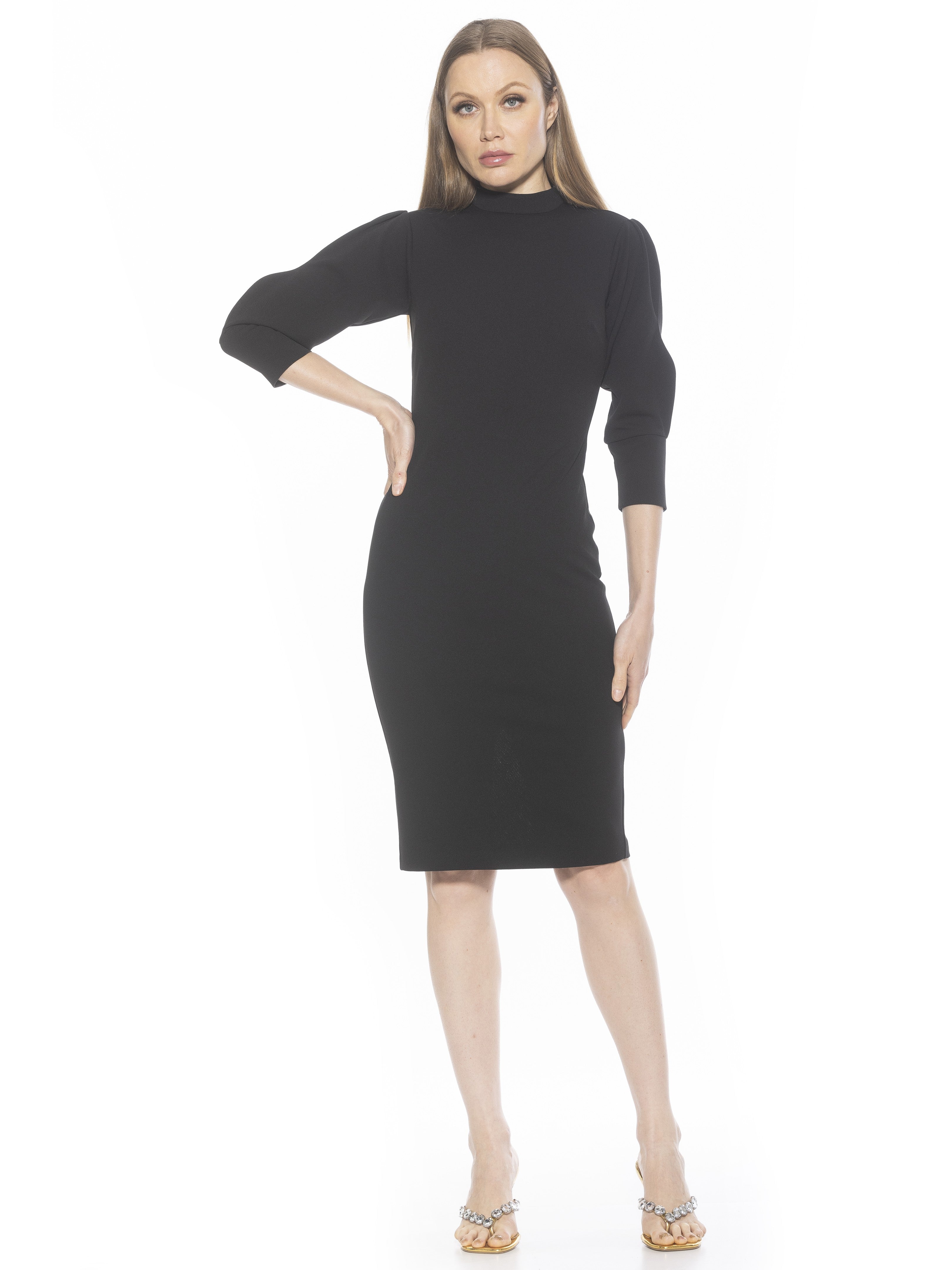 The Logan Mock neck Sheath Dress With Puff Sleeves Is A Must Have For Your Closet. This Dress Features Bold Puff Sleeves, Sheath Midi Length, And Luxe Stretch Fabric. This Dress Fits True To Size.